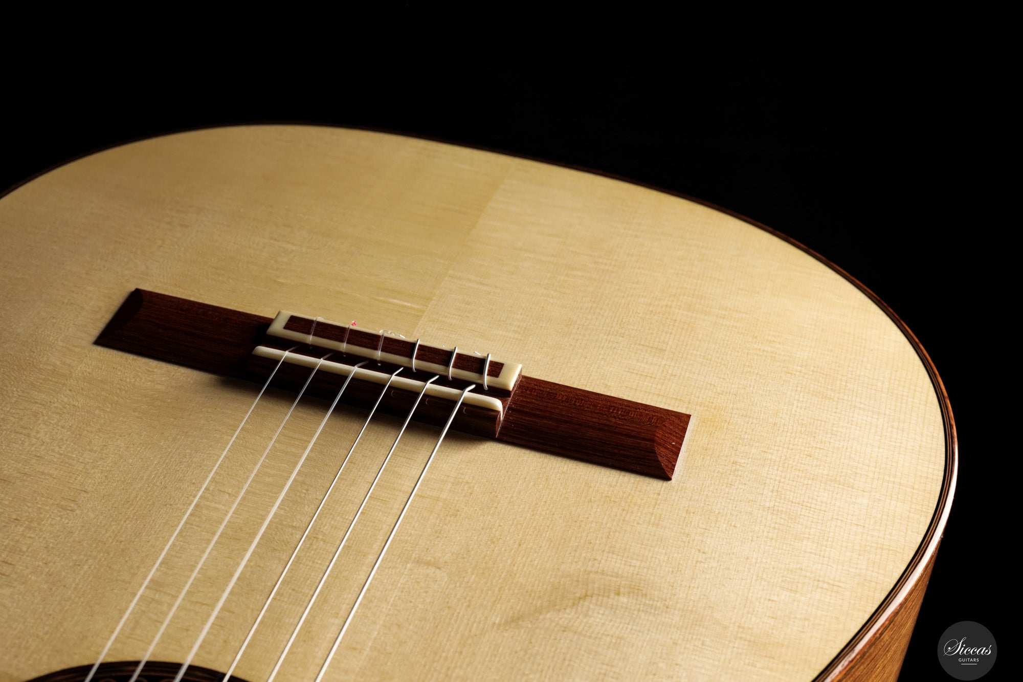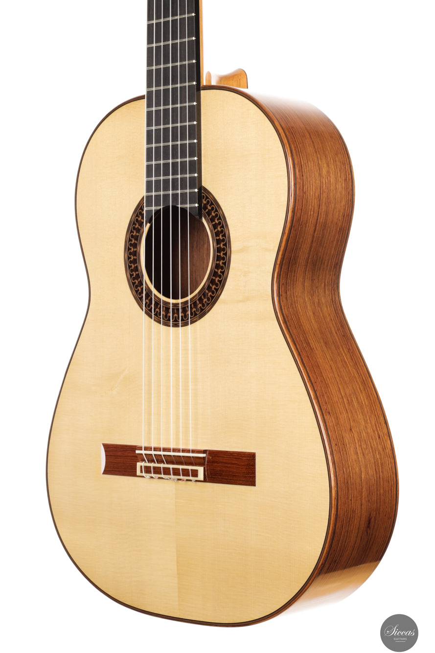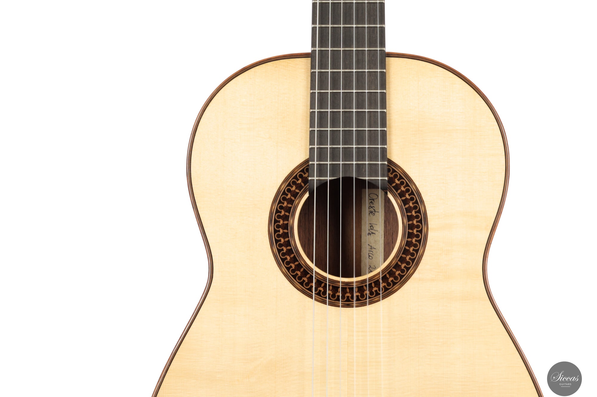 This guitar, numbered 22nd, is built with a red spruce soundboard from Trentino Alto Adige felled in 2006 and Madagascar rosewood for the back and sides seasoned since 2001. All parts of the instrument are assembled with hot hide glue. The soundboard carries seven fan braces, two closing bars and a harmonic bar beneath the fretboard in the upper bout region. The rosette is inspired by Romanillos and executed with precision and clarity. The plantilla remains consistent with Oreste’s overall style, and the headstock is influenced by Torres, slightly narrower than the original outline and shaped with quiet elegance. The guitar is finished entirely in French polish and fitted with Alessi tuners.