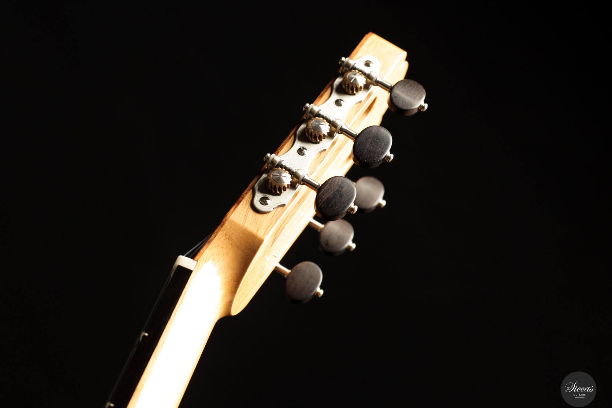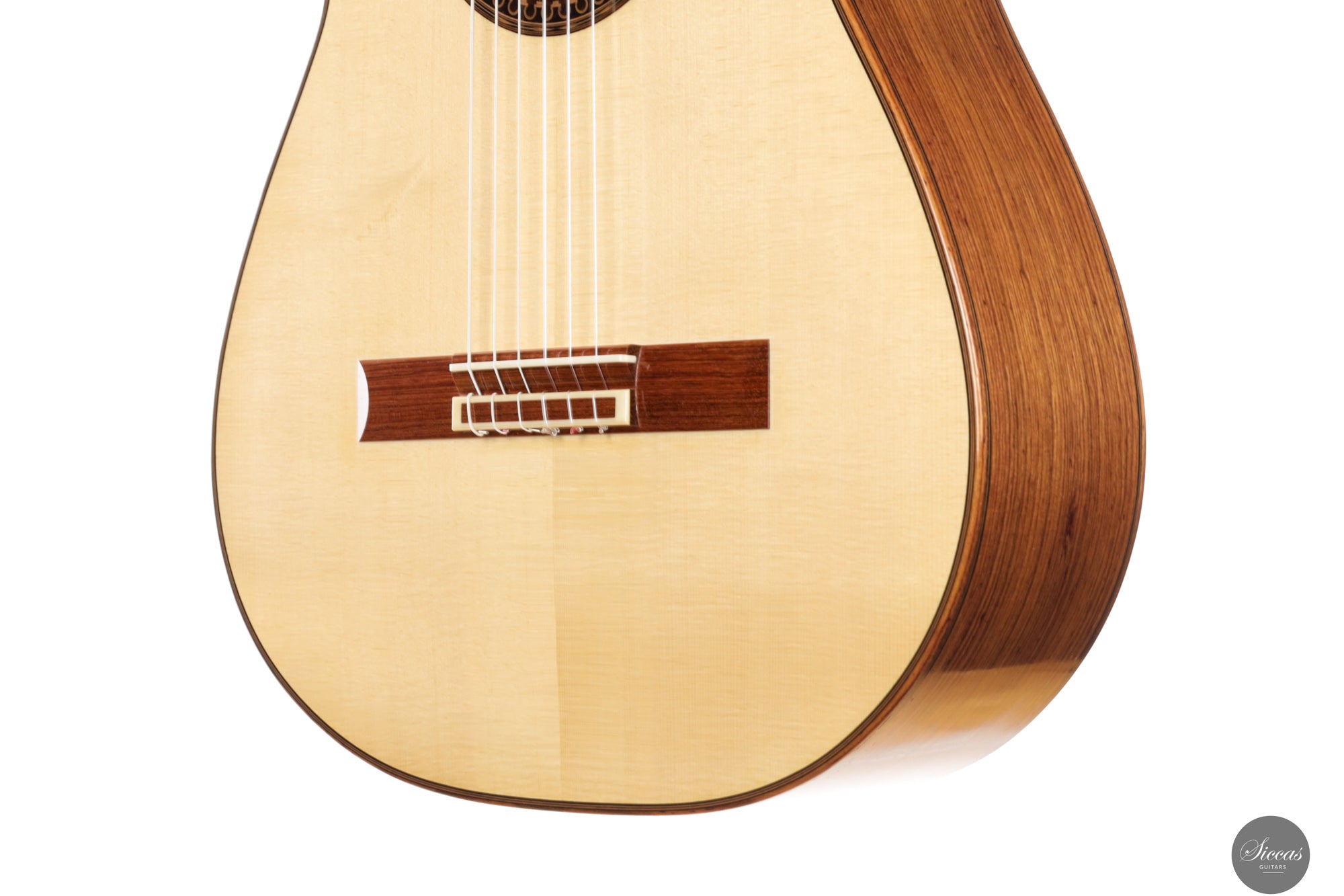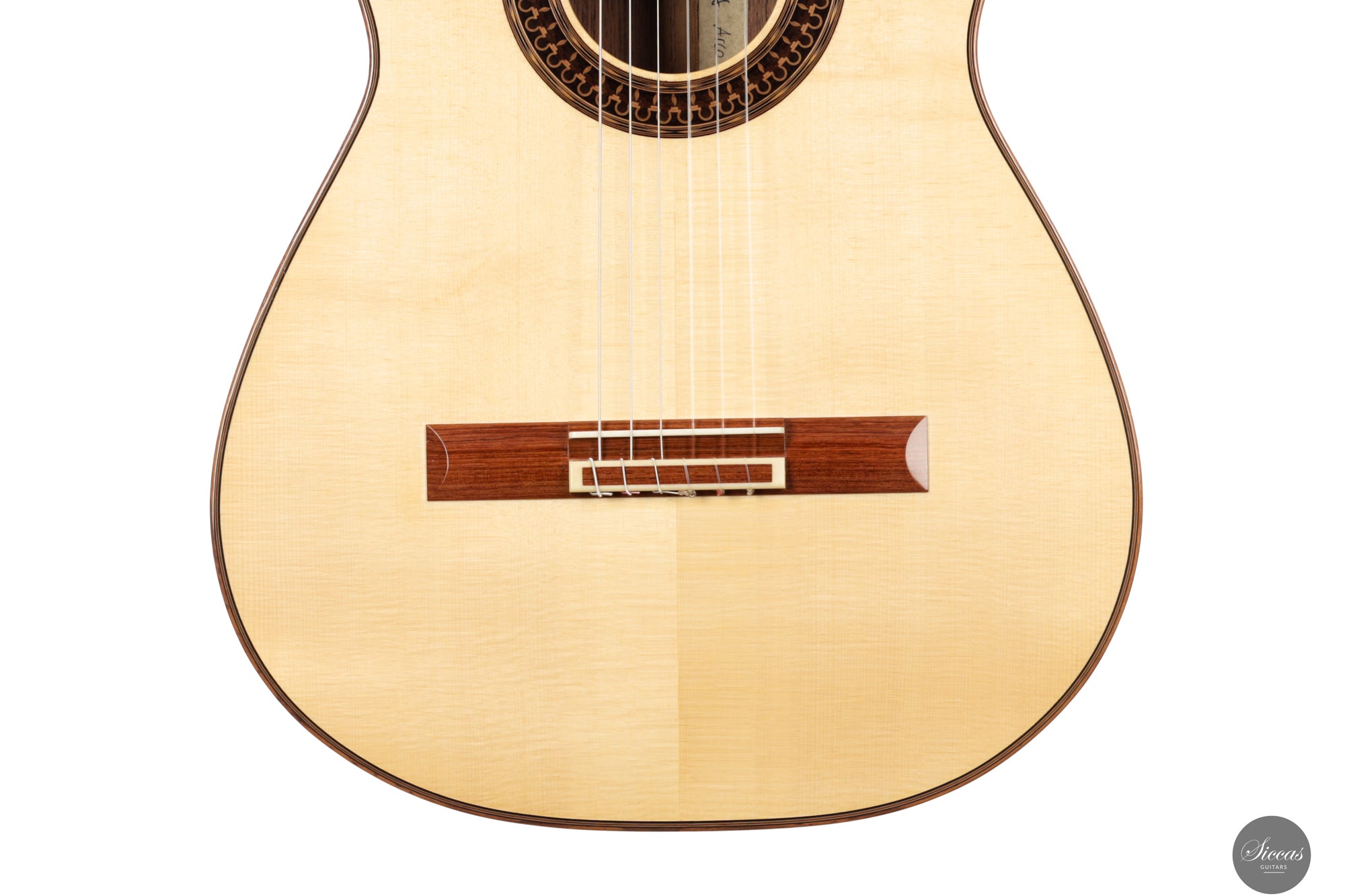 This guitar, numbered 22nd, is built with a red spruce soundboard from Trentino Alto Adige felled in 2006 and Madagascar rosewood for the back and sides seasoned since 2001. All parts of the instrument are assembled with hot hide glue. The soundboard carries seven fan braces, two closing bars and a harmonic bar beneath the fretboard in the upper bout region. The rosette is inspired by Romanillos and executed with precision and clarity. The plantilla remains consistent with Oreste’s overall style, and the headstock is influenced by Torres, slightly narrower than the original outline and shaped with quiet elegance. The guitar is finished entirely in French polish and fitted with Alessi tuners.