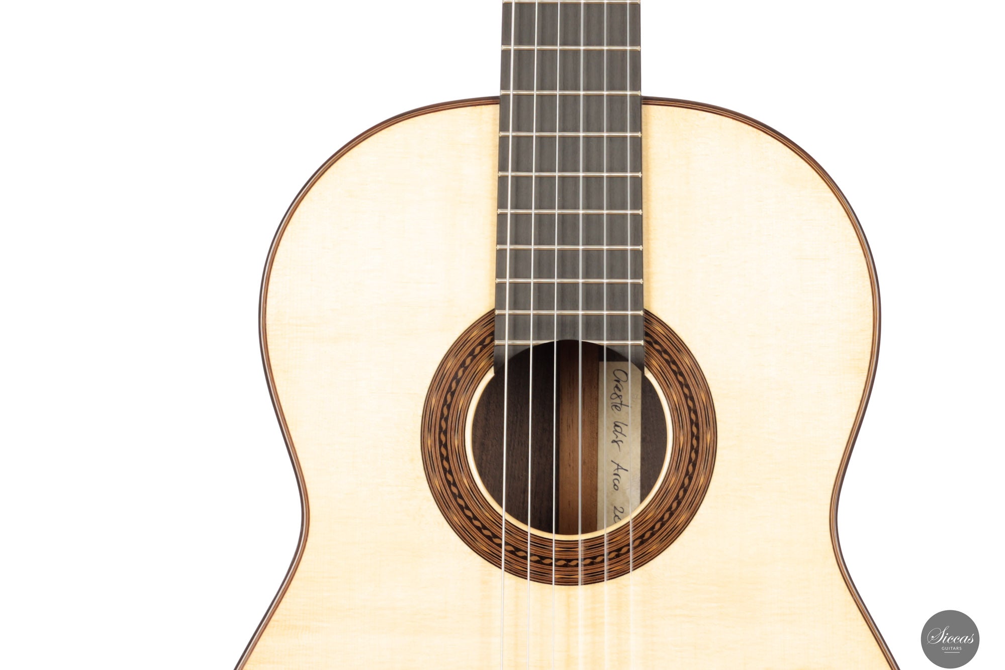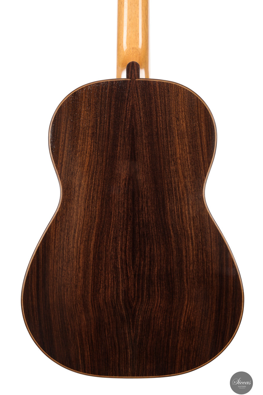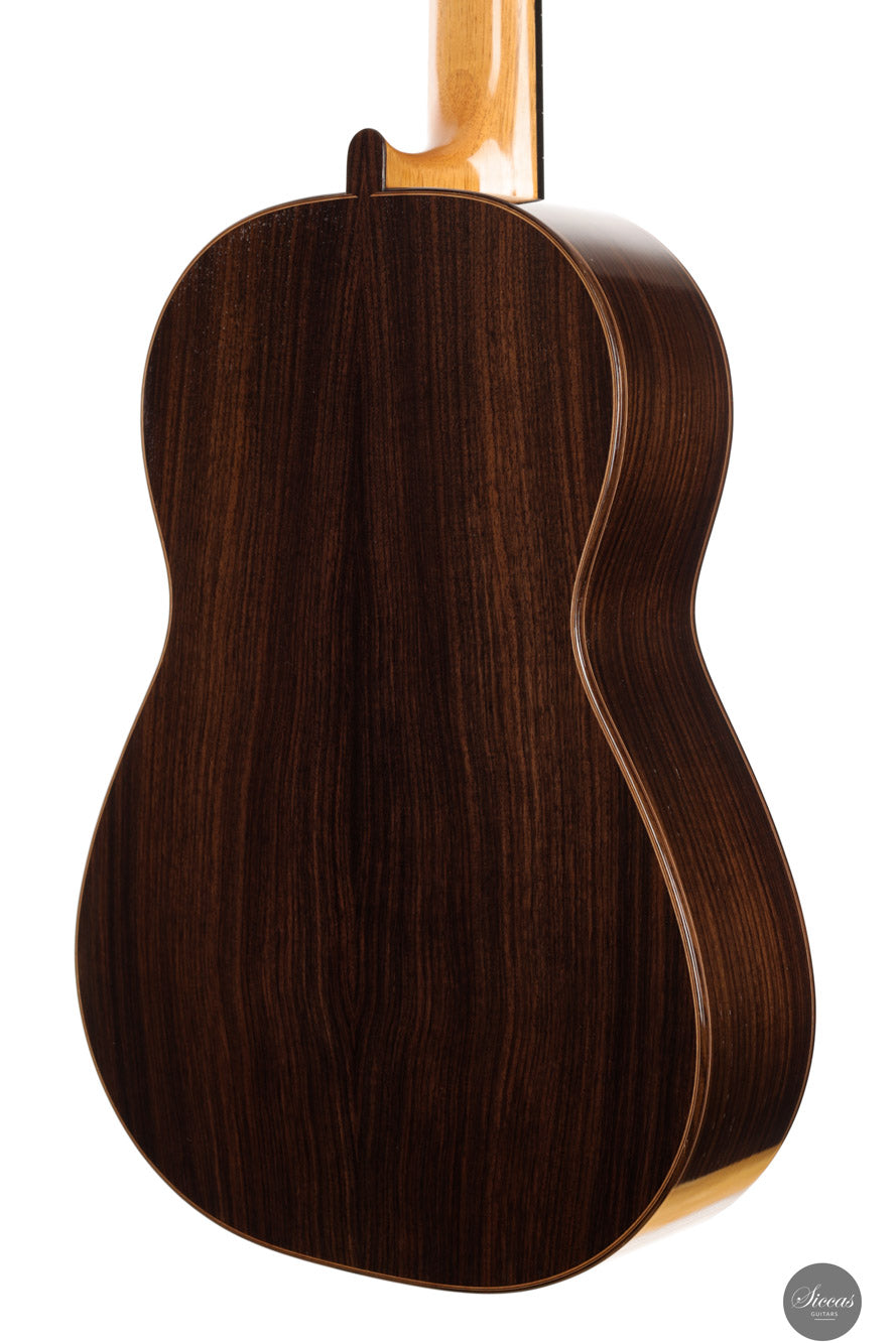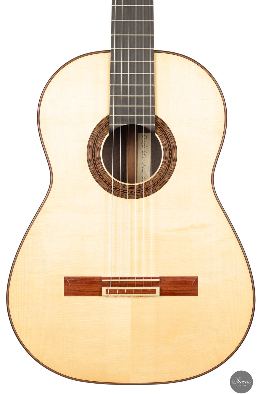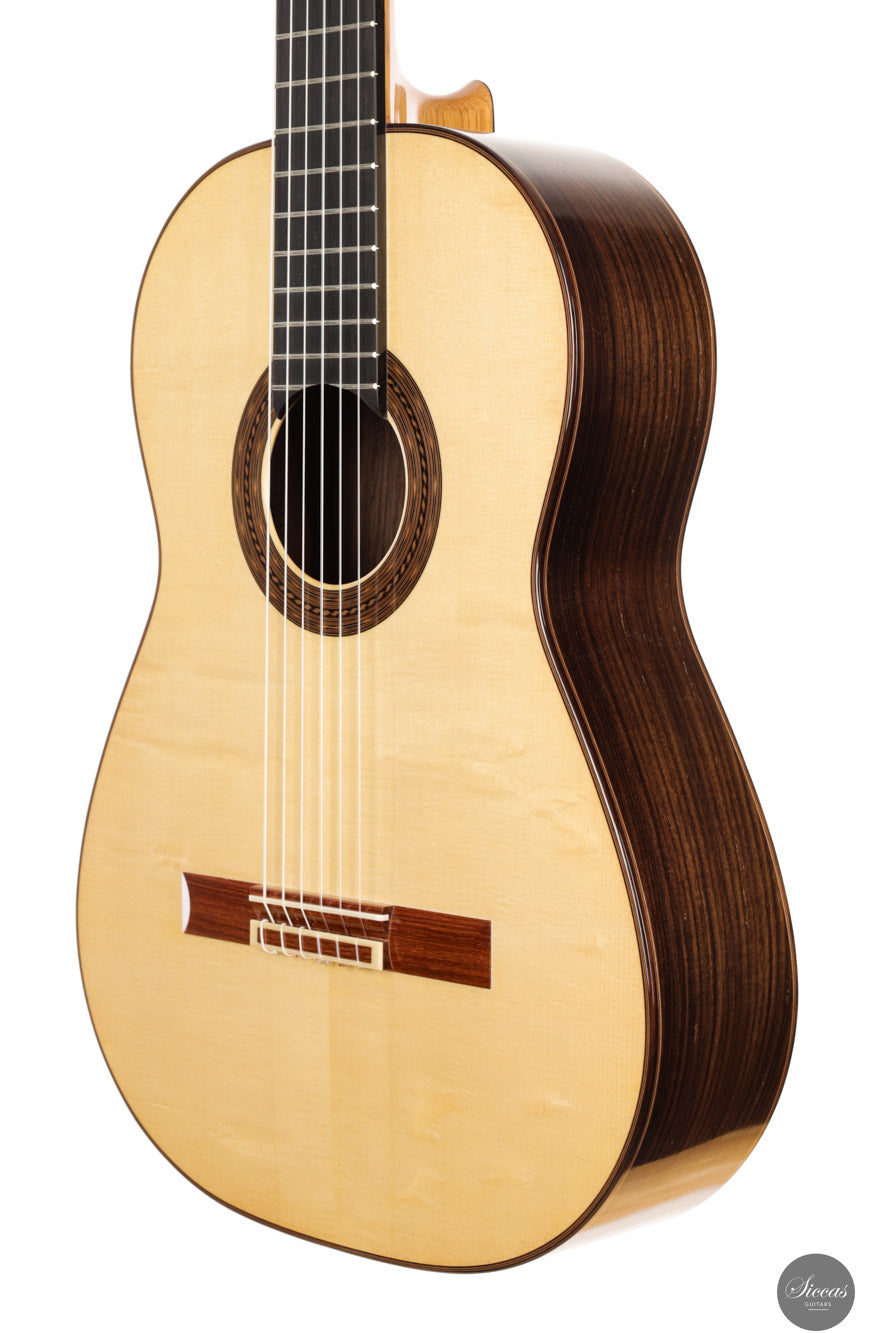 This instrument, No. 21 from 2025, exemplifies Lohs’s dedication to traditional guitar making. Built with a spruce soundboard and Indian rosewood back and sides, it is finished in French polish. At only 1375 grams, it is exceptionally light, echoing the ideals of the Granadan school, where lightness, clarity, and refined detail are paramount. The air resonance lies between G and G#, supporting a balanced and responsive tonal foundation. Alessi tuners complete the elegant setup. The sound is sweet, lyrical, and deeply expressive. Its response is quick and even, offering both projection and subtle color. The instrument is remarkably comfortable to play, supporting the guitarist with ease from the first touch. Visually striking and sonically captivating, this guitar represents an accomplished and personal statement from a young luthier whose work is already marked by refinement and originality. It is an excellent choice for players seeking a traditional, expressive concert guitar at an attractive stage in the maker’s career.Regular care extends the life of the instrument