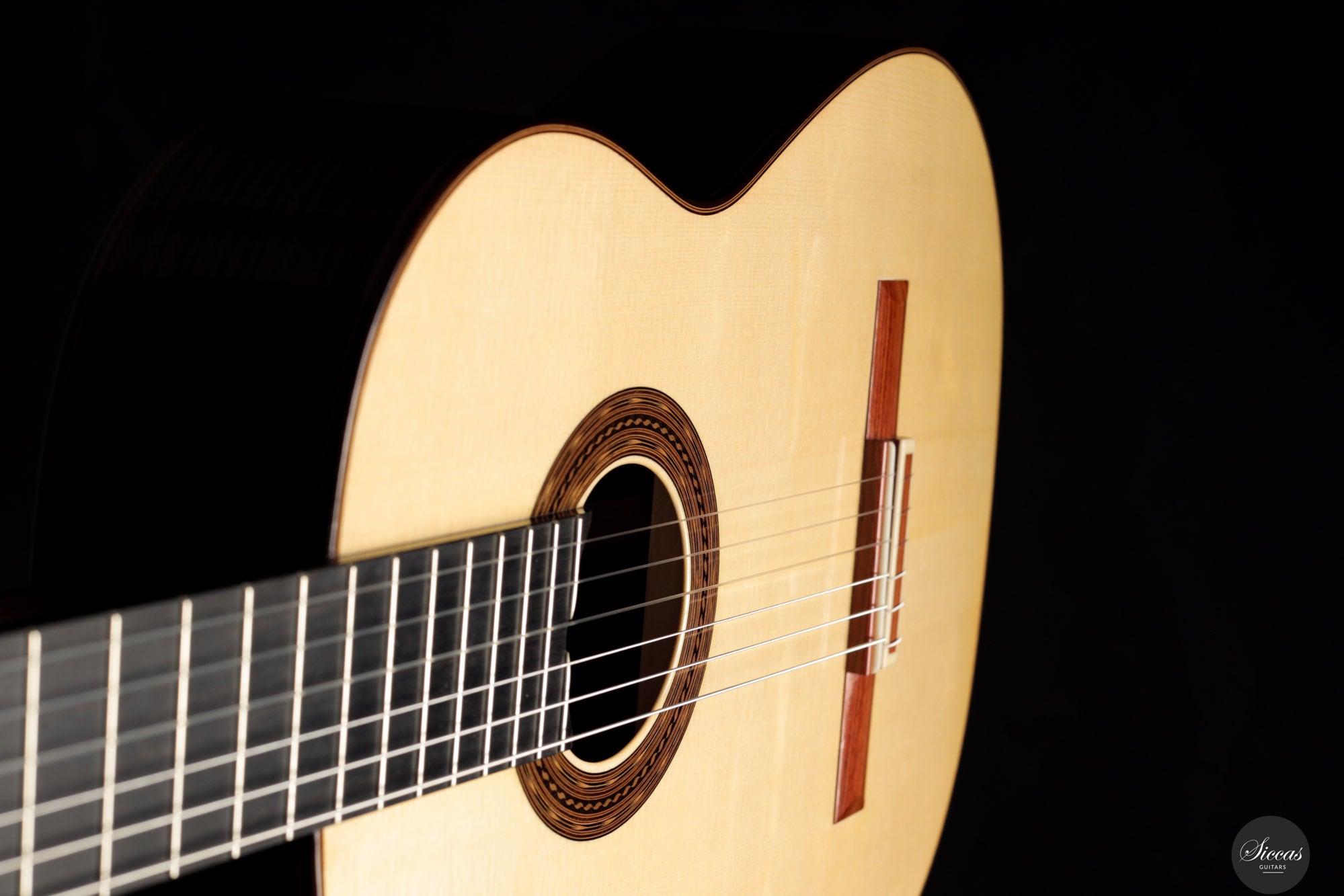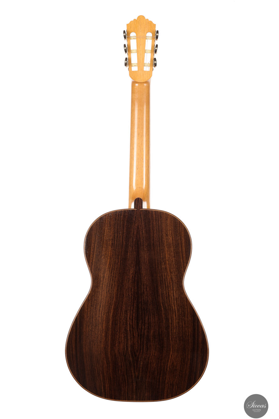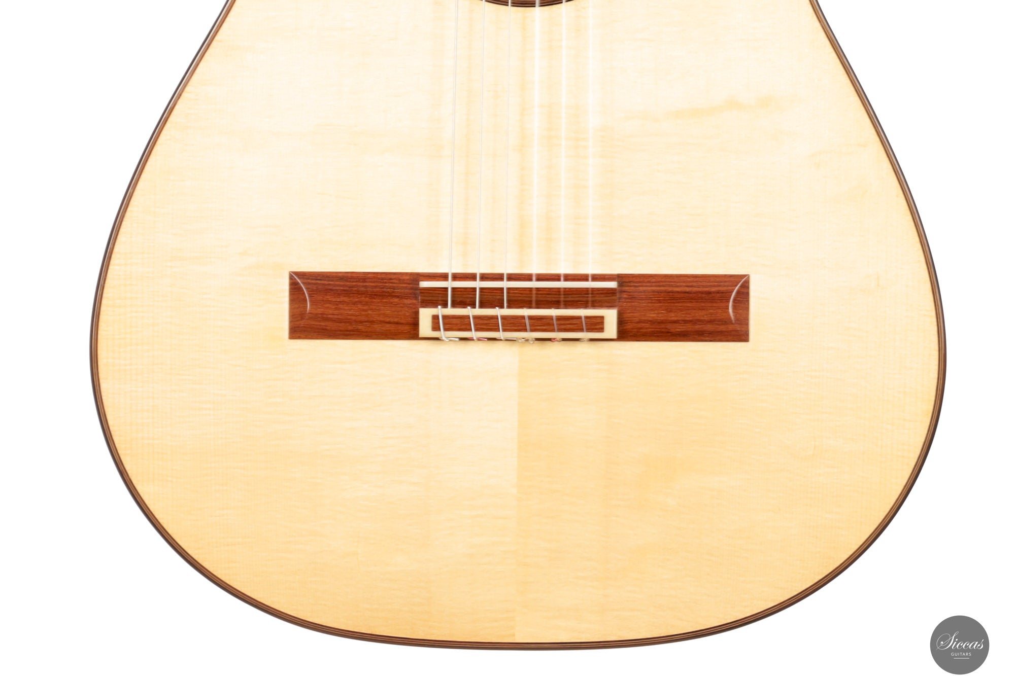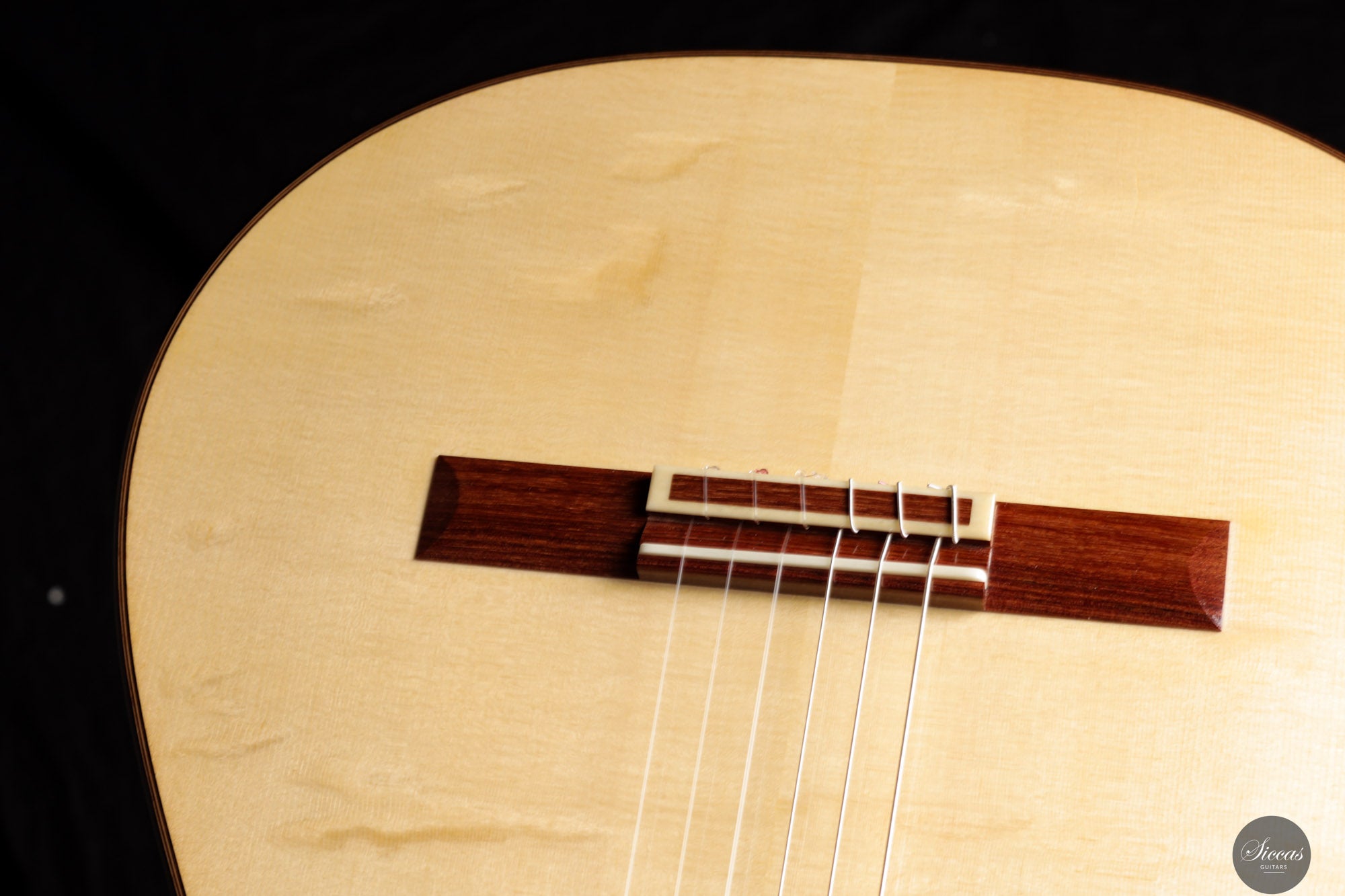 This instrument, No. 21 from 2025, exemplifies Lohs’s dedication to traditional guitar making. Built with a spruce soundboard and Indian rosewood back and sides, it is finished in French polish. At only 1375 grams, it is exceptionally light, echoing the ideals of the Granadan school, where lightness, clarity, and refined detail are paramount. The air resonance lies between G and G#, supporting a balanced and responsive tonal foundation. Alessi tuners complete the elegant setup. The sound is sweet, lyrical, and deeply expressive. Its response is quick and even, offering both projection and subtle color. The instrument is remarkably comfortable to play, supporting the guitarist with ease from the first touch. Visually striking and sonically captivating, this guitar represents an accomplished and personal statement from a young luthier whose work is already marked by refinement and originality. It is an excellent choice for players seeking a traditional, expressive concert guitar at an attractive stage in the maker’s career.Regular care extends the life of the instrument