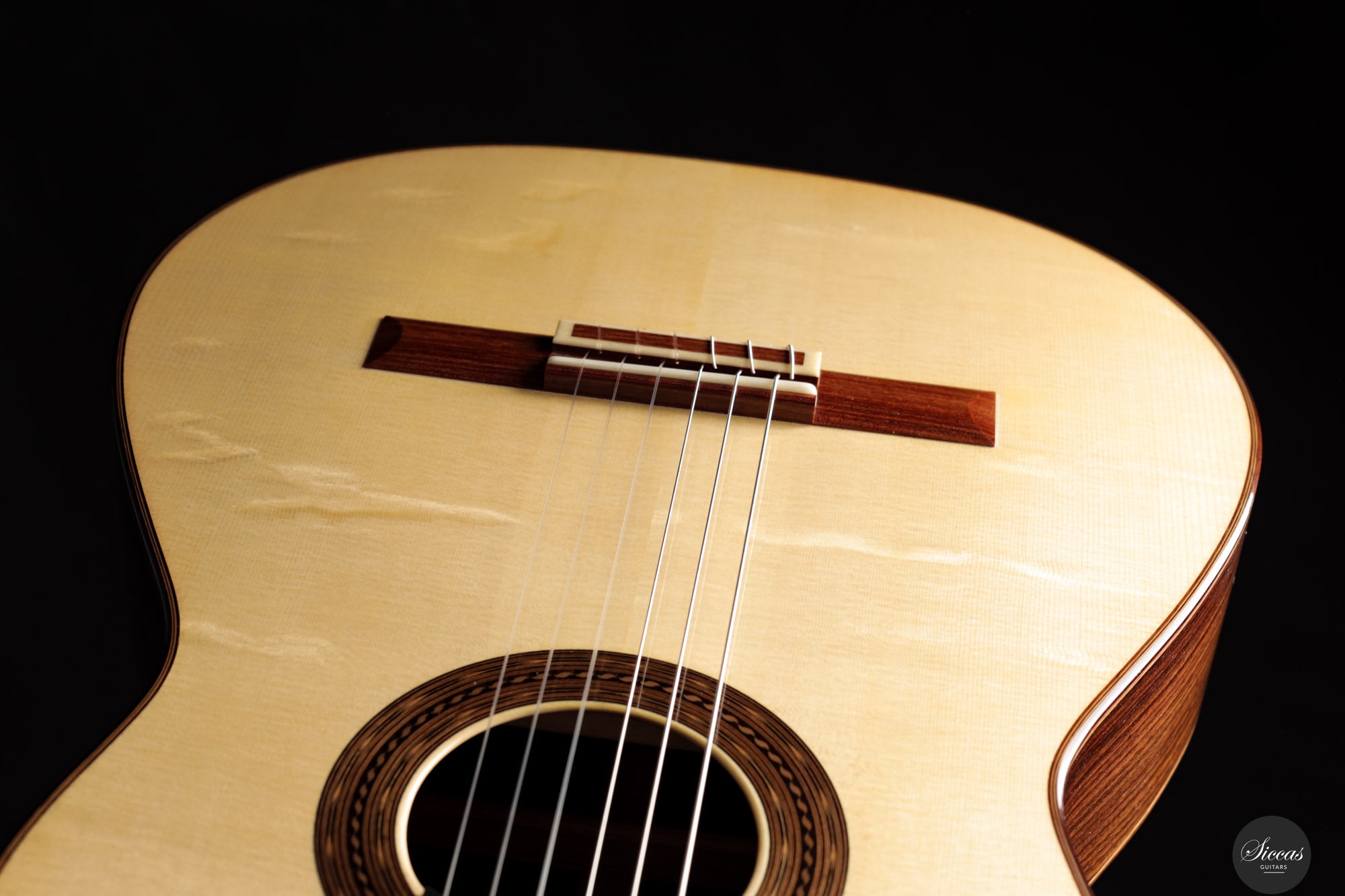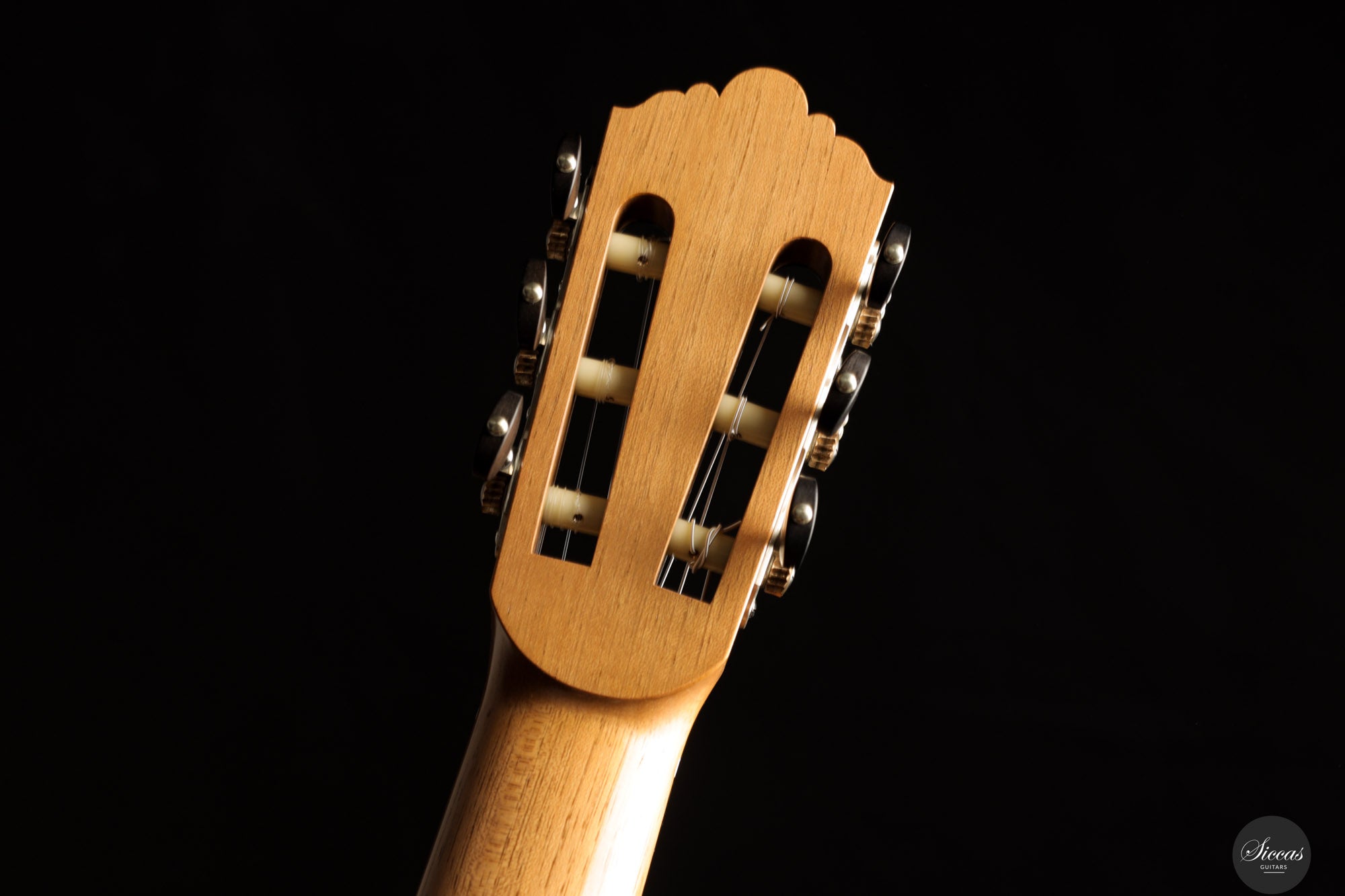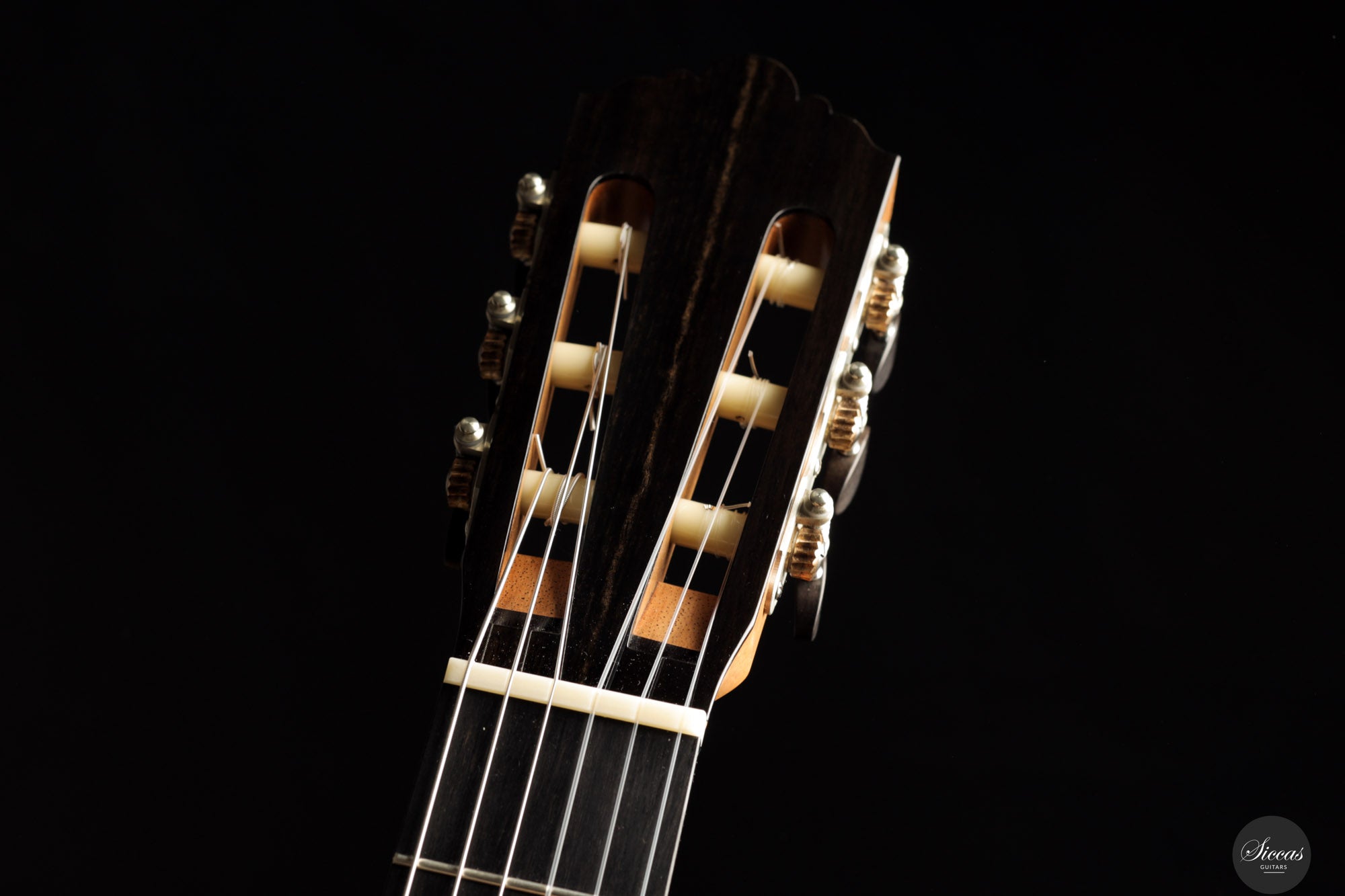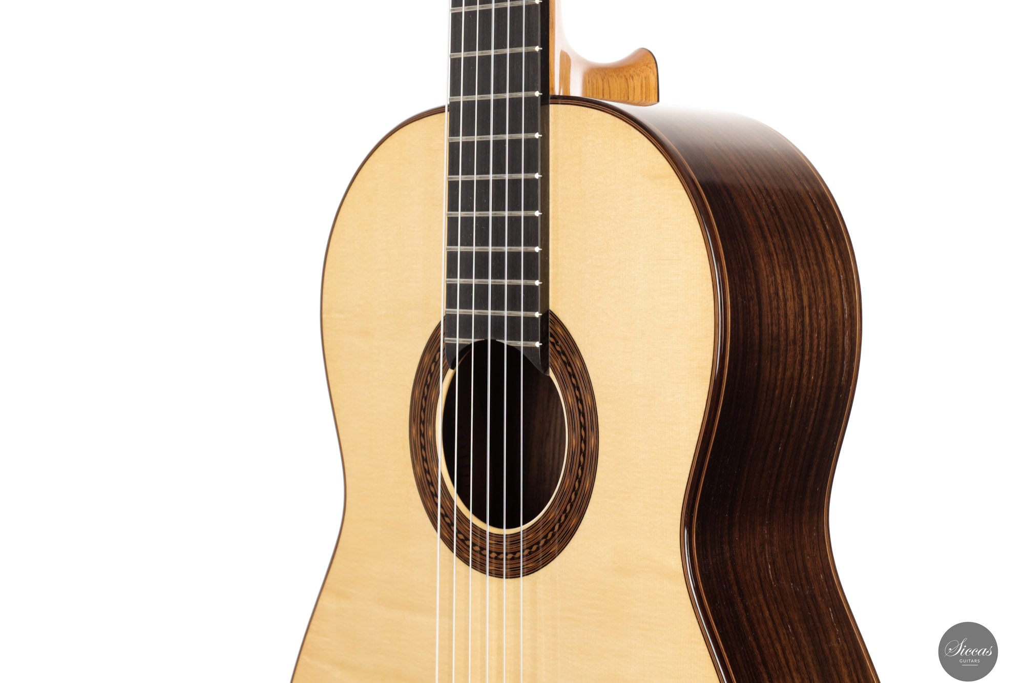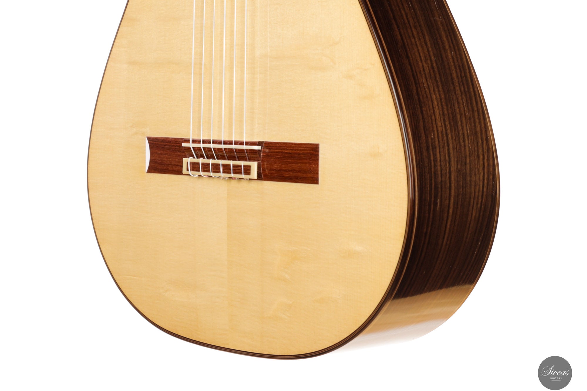 This instrument, No. 21 from 2025, exemplifies Lohs’s dedication to traditional guitar making. Built with a spruce soundboard and Indian rosewood back and sides, it is finished in French polish. At only 1375 grams, it is exceptionally light, echoing the ideals of the Granadan school, where lightness, clarity, and refined detail are paramount. The air resonance lies between G and G#, supporting a balanced and responsive tonal foundation. Alessi tuners complete the elegant setup. The sound is sweet, lyrical, and deeply expressive. Its response is quick and even, offering both projection and subtle color. The instrument is remarkably comfortable to play, supporting the guitarist with ease from the first touch. Visually striking and sonically captivating, this guitar represents an accomplished and personal statement from a young luthier whose work is already marked by refinement and originality. It is an excellent choice for players seeking a traditional, expressive concert guitar at an attractive stage in the maker’s career.Regular care extends the life of the instrument
