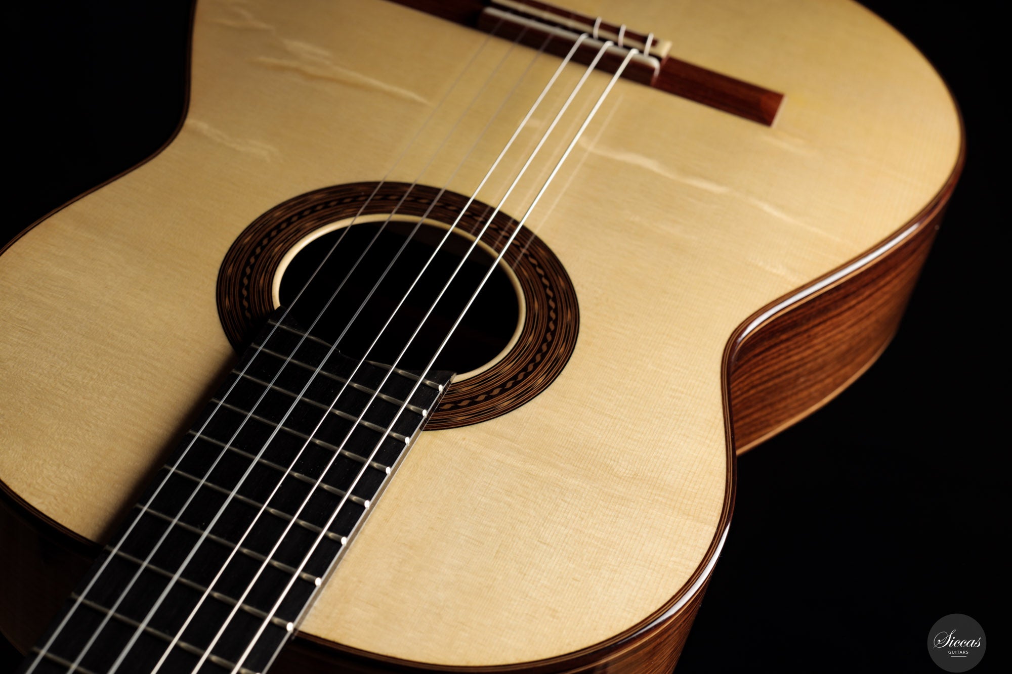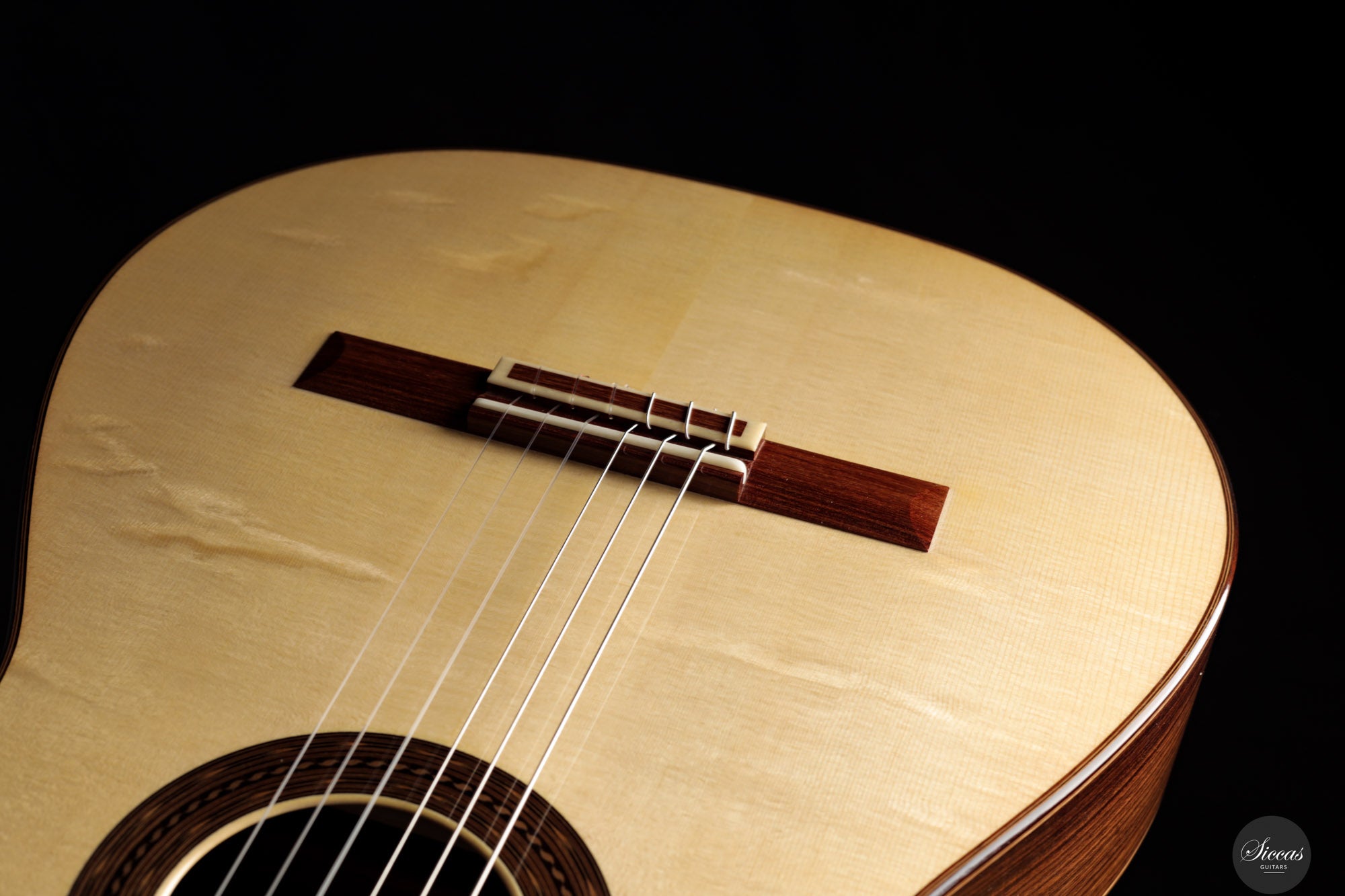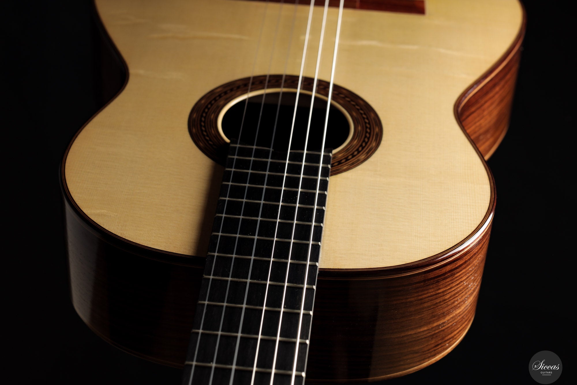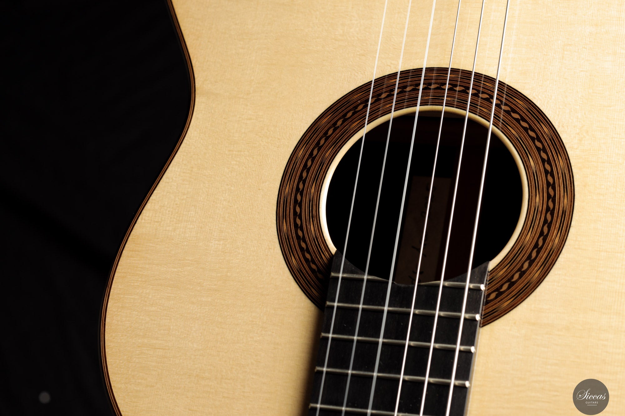 This instrument, No. 21 from 2025, exemplifies Lohs’s dedication to traditional guitar making. Built with a spruce soundboard and Indian rosewood back and sides, it is finished in French polish. At only 1375 grams, it is exceptionally light, echoing the ideals of the Granadan school, where lightness, clarity, and refined detail are paramount. The air resonance lies between G and G#, supporting a balanced and responsive tonal foundation. Alessi tuners complete the elegant setup. The sound is sweet, lyrical, and deeply expressive. Its response is quick and even, offering both projection and subtle color. The instrument is remarkably comfortable to play, supporting the guitarist with ease from the first touch. Visually striking and sonically captivating, this guitar represents an accomplished and personal statement from a young luthier whose work is already marked by refinement and originality. It is an excellent choice for players seeking a traditional, expressive concert guitar at an attractive stage in the maker’s career.Regular care extends the life of the instrument