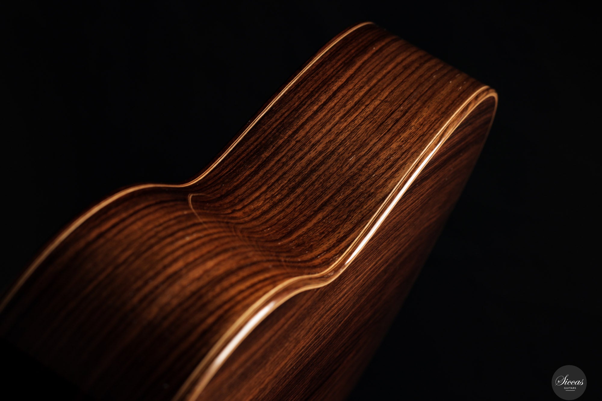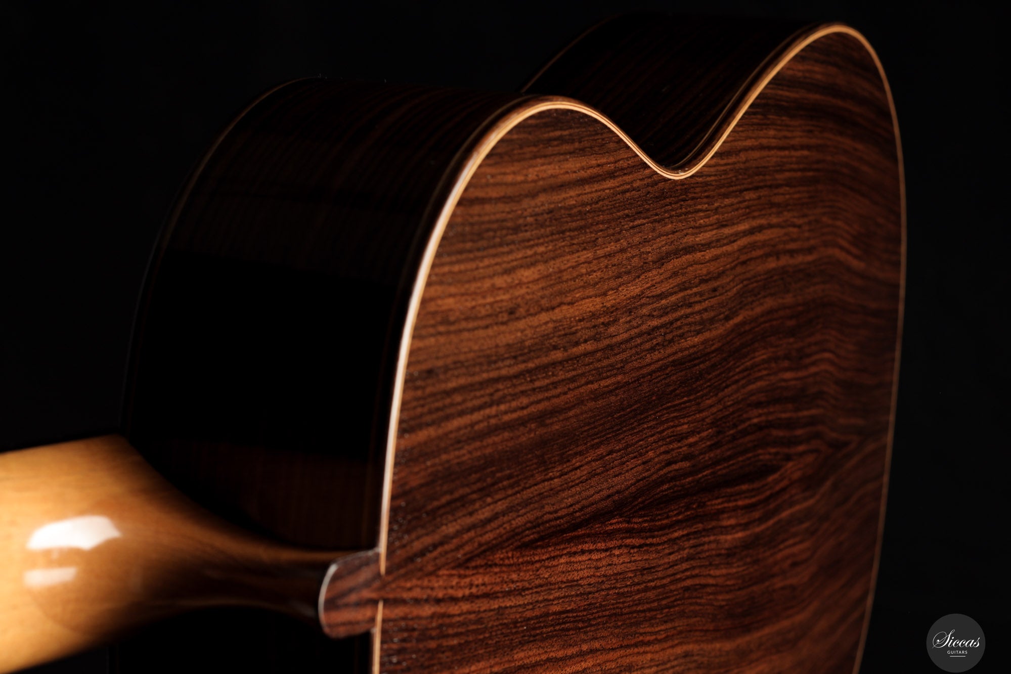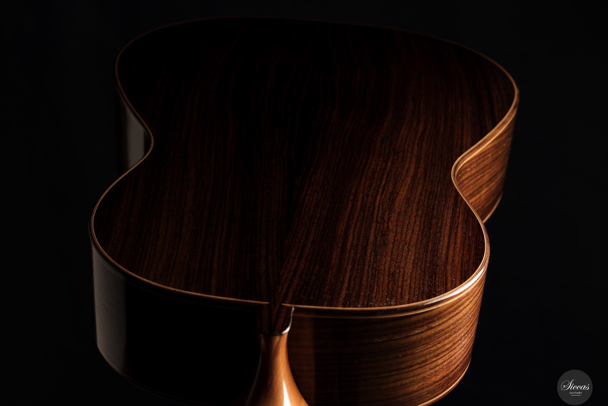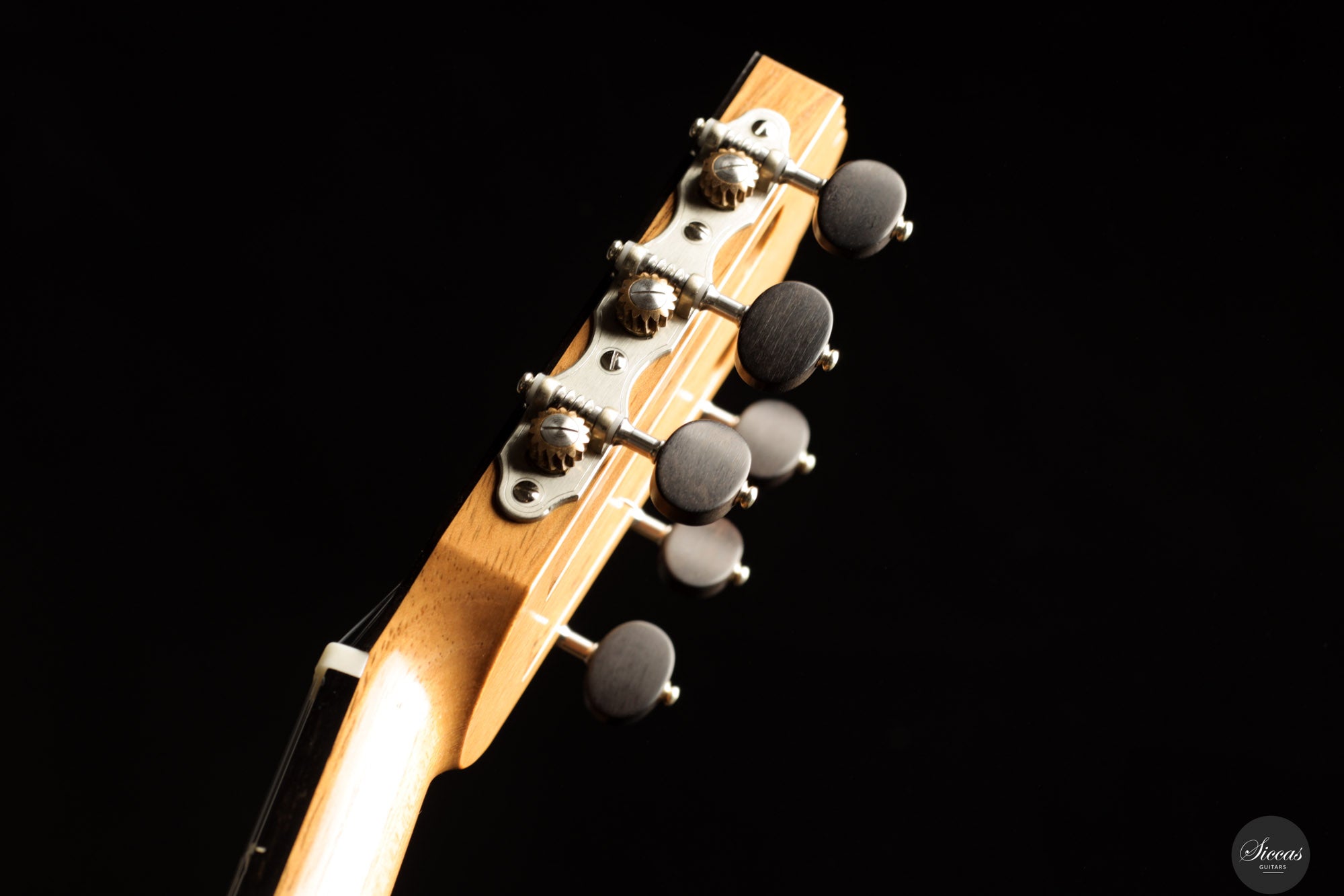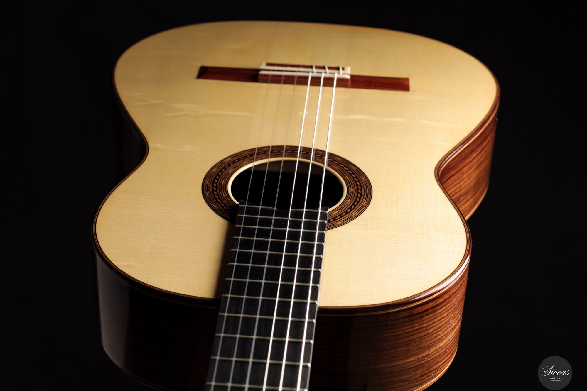 This instrument, No. 21 from 2025, exemplifies Lohs’s dedication to traditional guitar making. Built with a spruce soundboard and Indian rosewood back and sides, it is finished in French polish. At only 1375 grams, it is exceptionally light, echoing the ideals of the Granadan school, where lightness, clarity, and refined detail are paramount. The air resonance lies between G and G#, supporting a balanced and responsive tonal foundation. Alessi tuners complete the elegant setup. The sound is sweet, lyrical, and deeply expressive. Its response is quick and even, offering both projection and subtle color. The instrument is remarkably comfortable to play, supporting the guitarist with ease from the first touch. Visually striking and sonically captivating, this guitar represents an accomplished and personal statement from a young luthier whose work is already marked by refinement and originality. It is an excellent choice for players seeking a traditional, expressive concert guitar at an attractive stage in the maker’s career.Regular care extends the life of the instrument