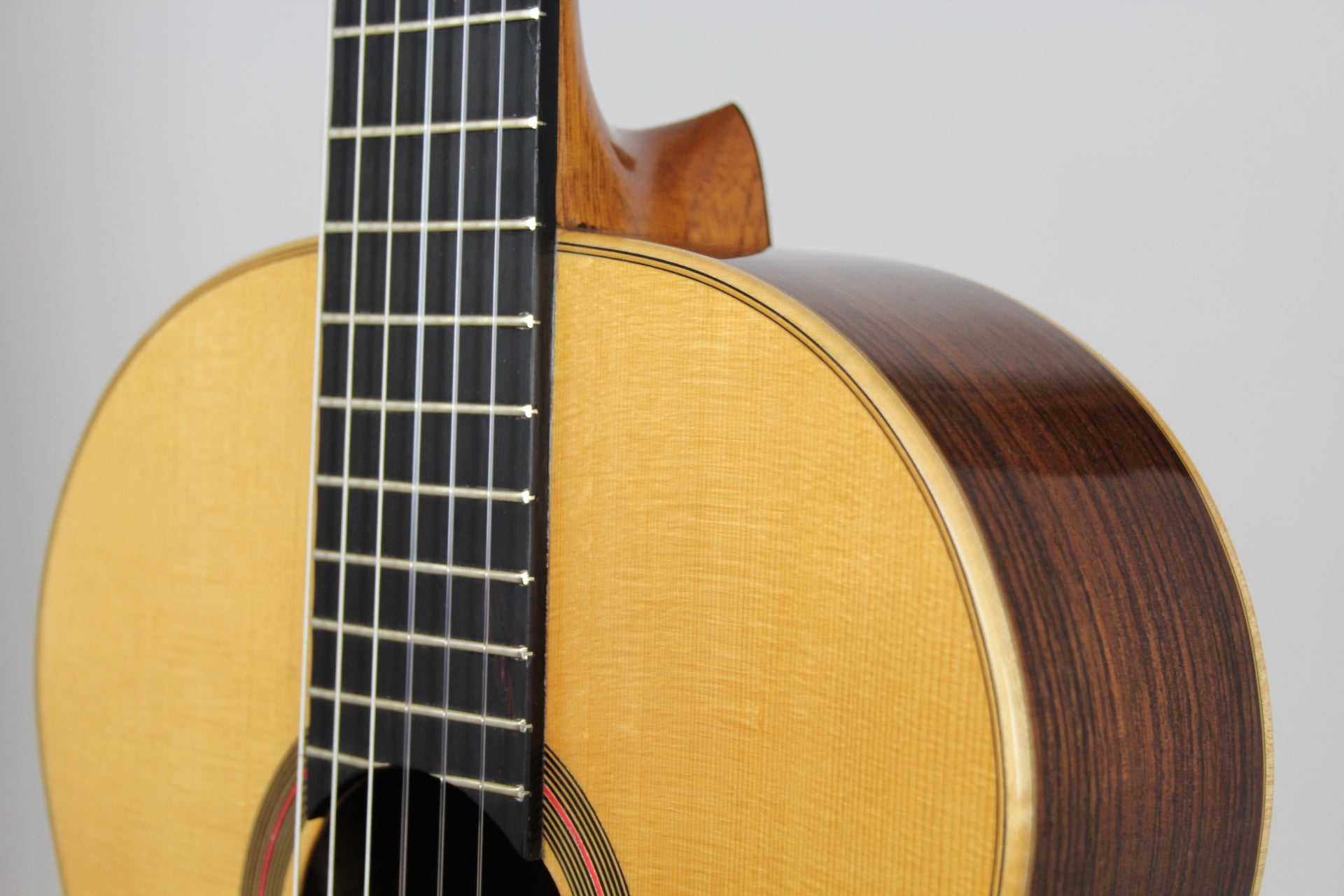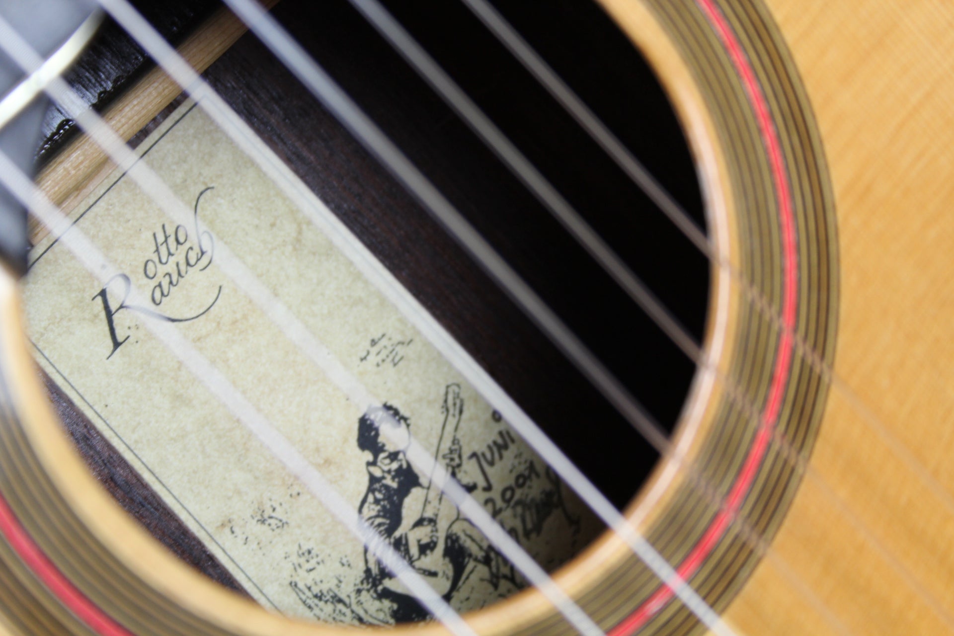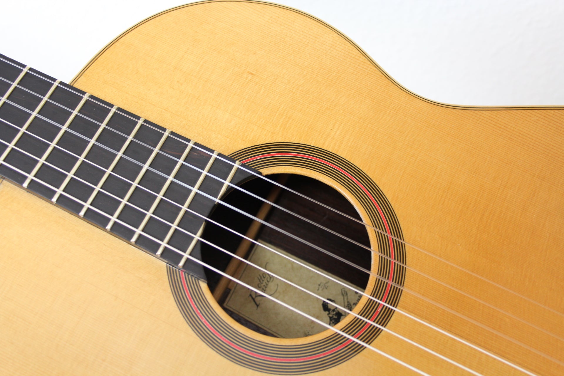 This guitar was build by Otto Rauch in 2001 based on a guitar made by Robert Bouchet. The sides and the back are made of selected Indian rosewood and he top is made of spruce wood from the Dolomites. The guitar has a French-polish finish. Below the bridge there are two repairs that were done by Otto Rauch. A used Hiscox Pro II case included.