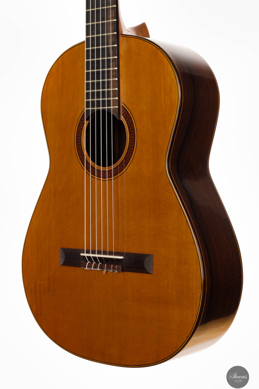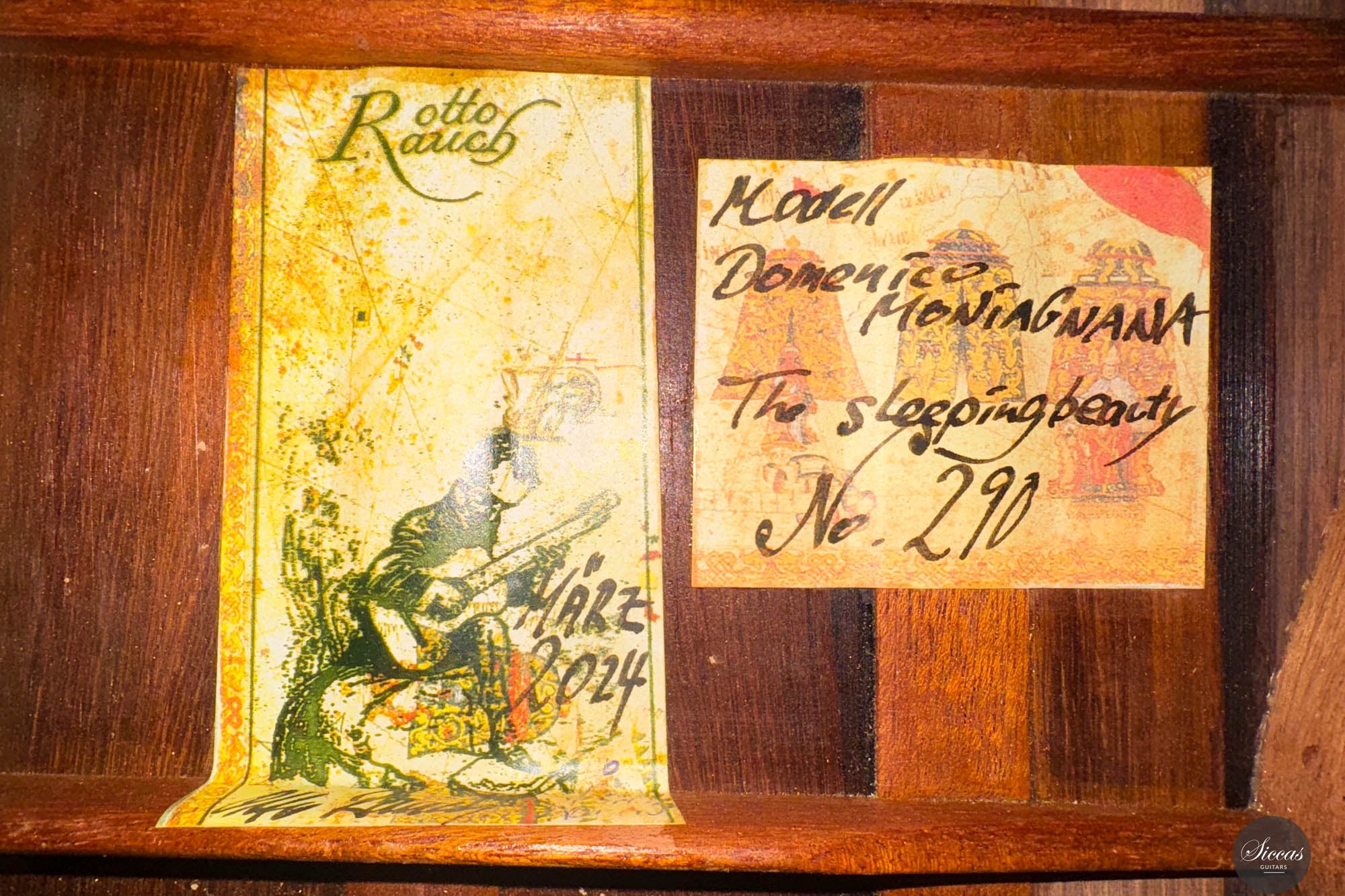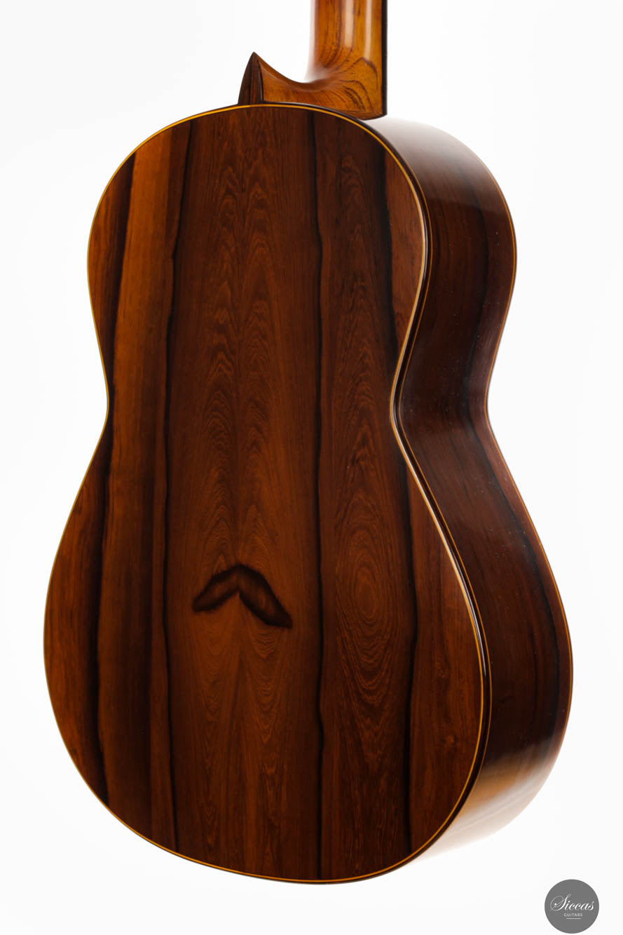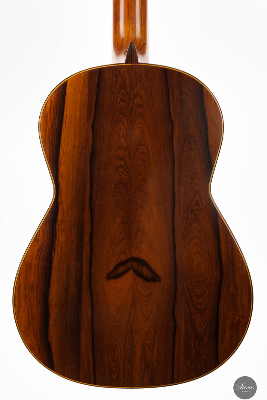 The Otto Rauch 2024 No. 290 “Domenico Montagnana” guitar is a sophisticated model inspired by the esteemed “Sleeping Beauty” cello, crafted by Domenico Montagnana in 1739. This guitar, a part of Rauch’s exclusive “Sleeping Beauty” series, features Madagascar rosewood back and sides, selected for their distinctive two-tone grain that enhances both the instrument’s visual and acoustic qualities. The use of a cedar balsa core double top in its construction underscores Rauch’s commitment to integrating carefully chosen materials that contribute to the guitar’s resonant qualities. This model showcases a meticulous approach to lutherie, with an emphasis on achieving a dark, expressive, and complex sound characterized by an F main resonance. Such a sound profile not only draws from historical craftsmanship but also elevates the instrument's performance capabilities, making it a significant addition to the collections of musicians and enthusiasts who appreciate a fusion of historical homage and contemporary craftsmanship.