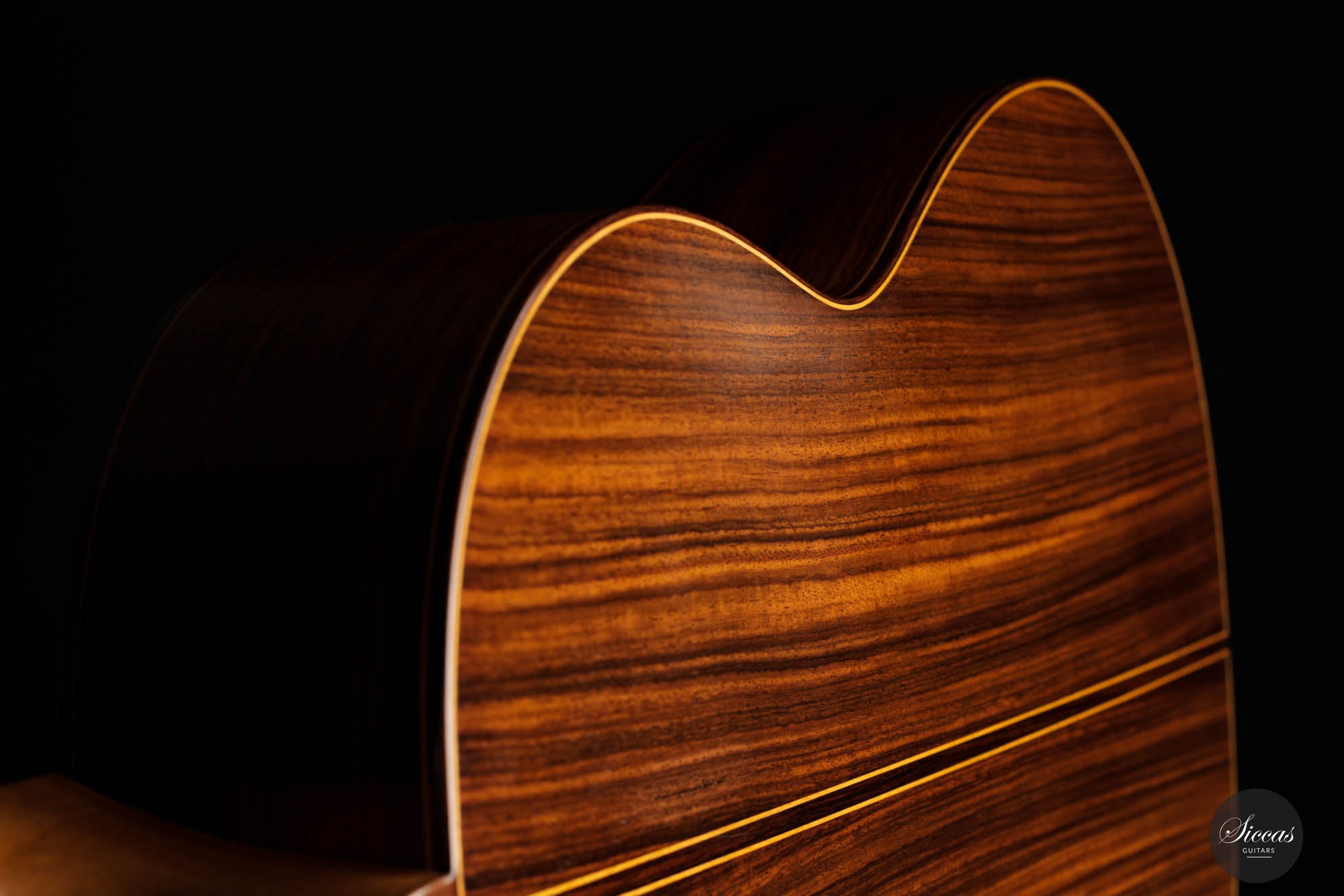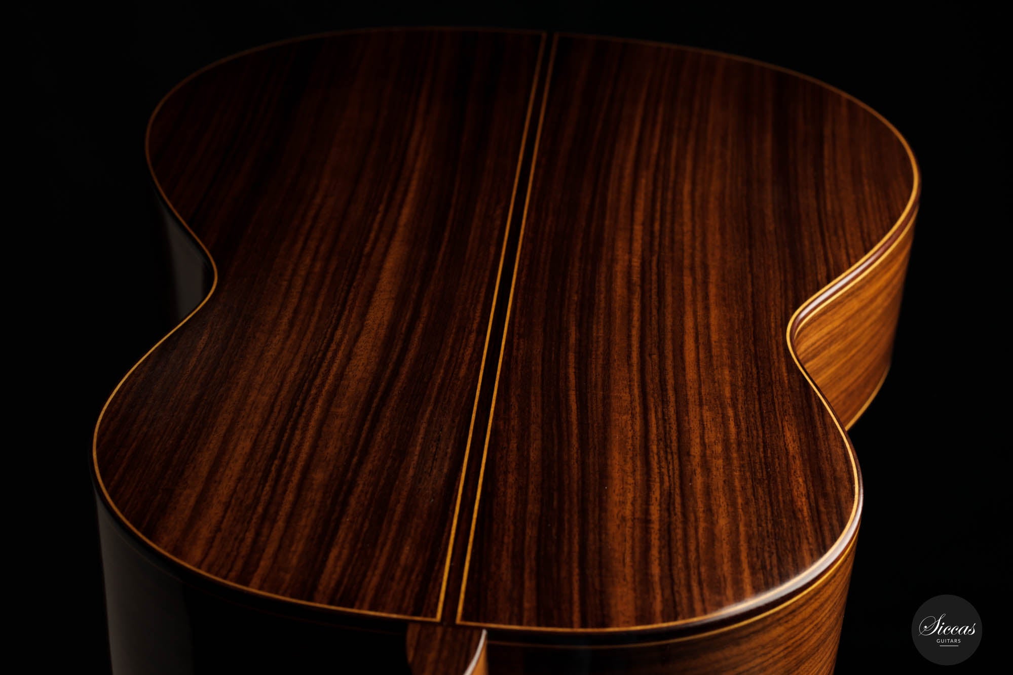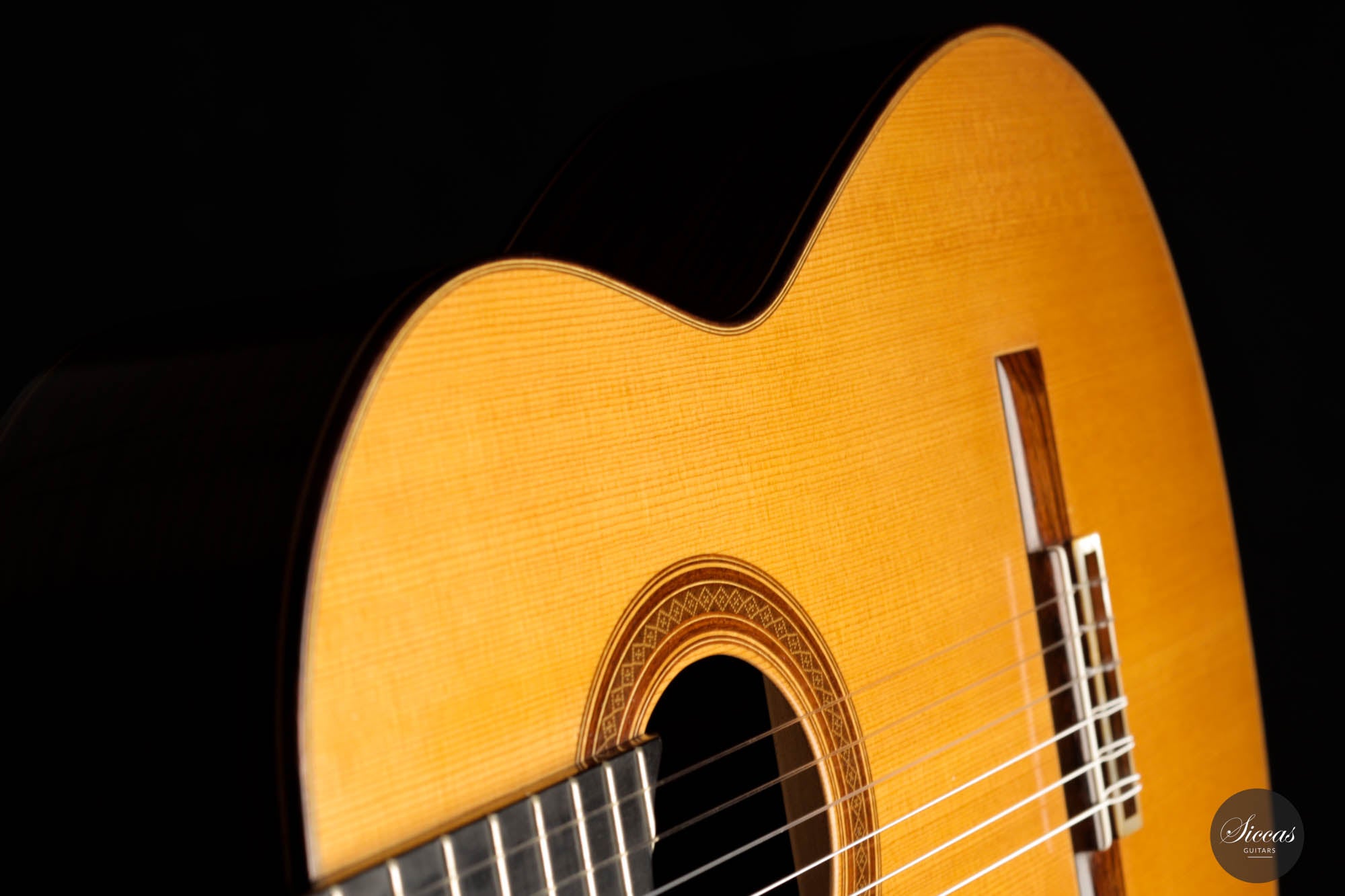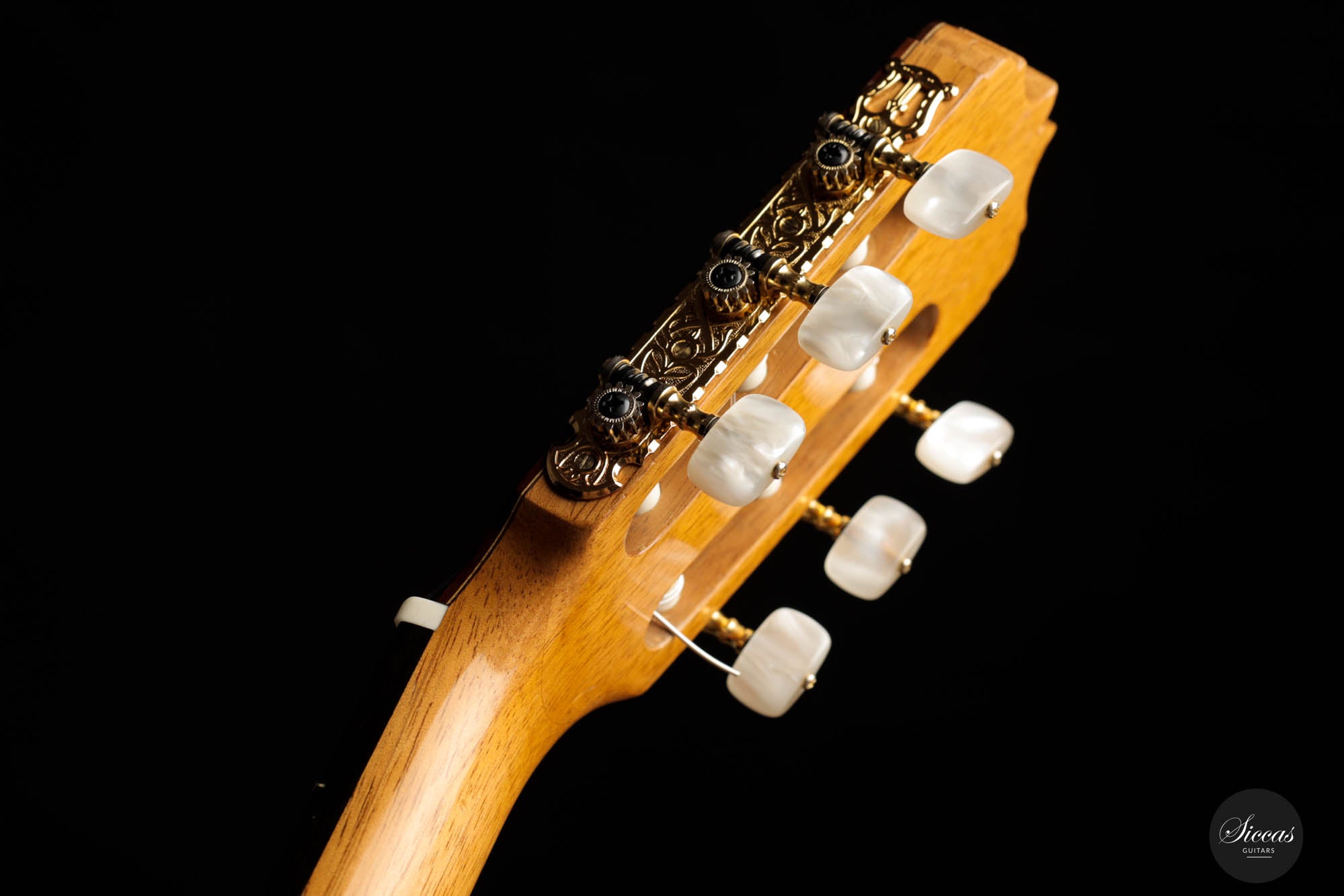 Paco Santiago’s guitars are highly sought after for their strong projection, balance, and tone color. The list of professional guitarists who play his instruments is as long as one can imagine, for example, Ricardo Gallen, Leo Brouwer, Manuel Gonzalez & Iliana Matos, to name a few. The Aniversario models are the most prestigious and sought-after models from this immensely accomplished guitar maker. Only the best and finest materials are used for these works of art. An abundance of tonal strength and projection characterizes these guitars. The quality of tone and the variety of design possibilities these guitars offer are almost unparalleled.
