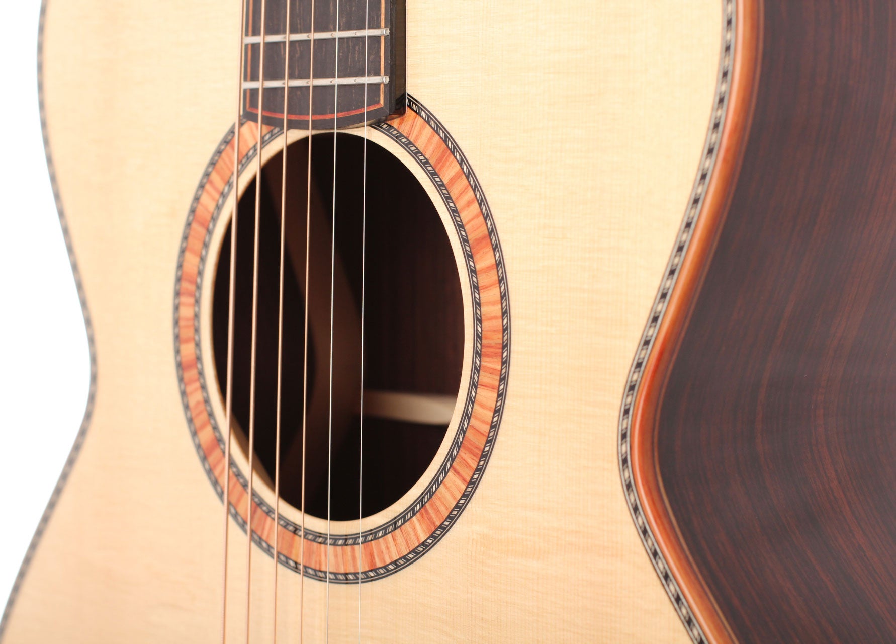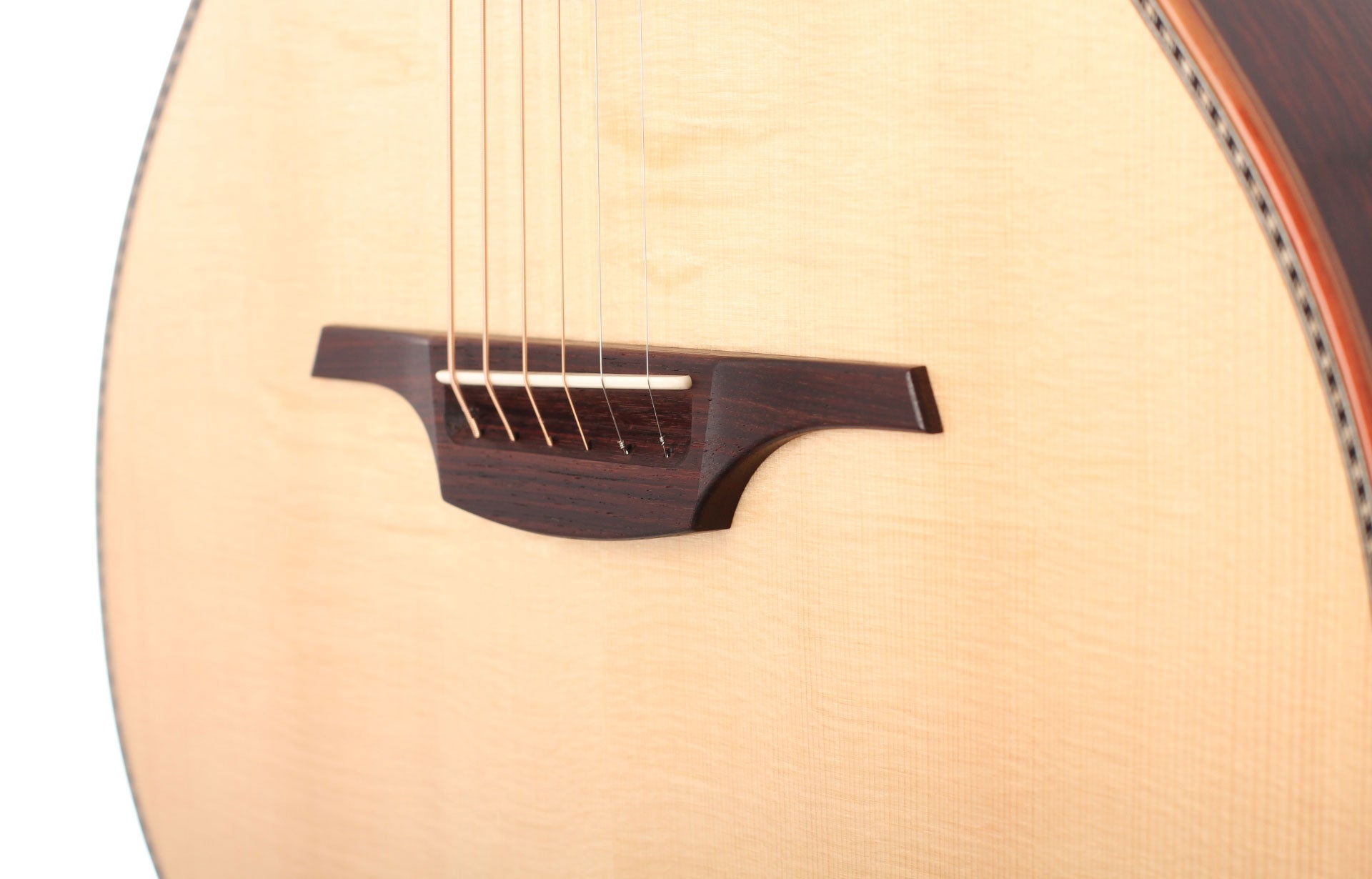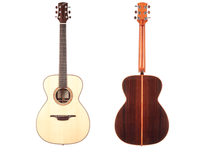 This OM-model has a very differentiated sound, caused by the shape and the wood selection. The Indian Rosewood gives a classical modest look and a very balanced color of sound. The top is made of fine Alpine Spruce and provided with a scalloped x-bracing. Though relatively small and handy, this guitar still has a powerful sound due to the fastidious elaboration of the top. The mahogany neck is very comfortable to play.