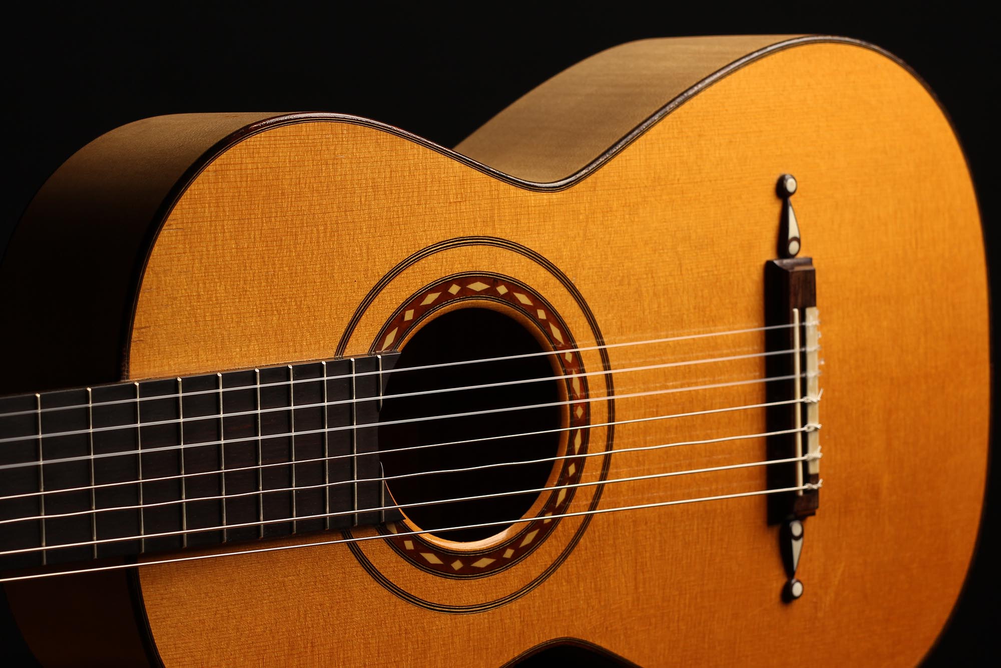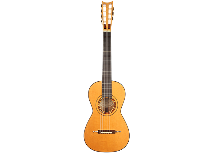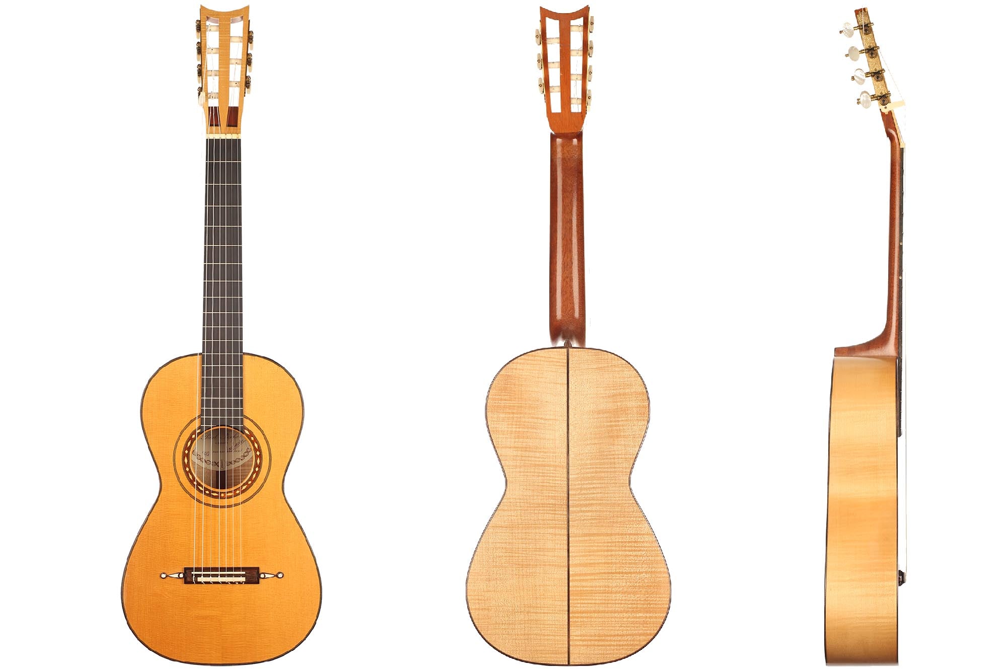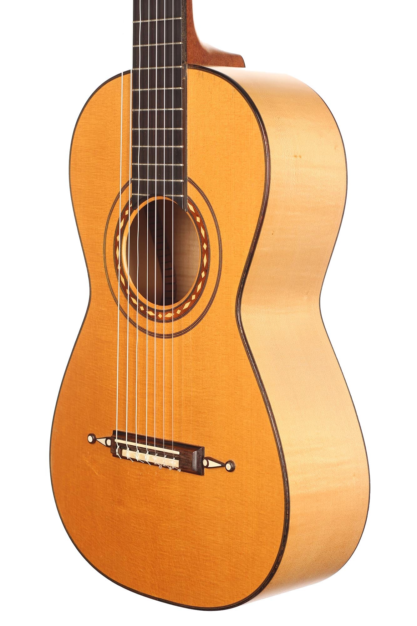 This guitar was built after the famous instruments by the Londonian workshop of Joseph and Louis Panormo. This instantly recognisable design was inspired by the Spanish luthier Pages whose instruments were brought to England by Fernando Sor. Panormo guitars are a very interesting link between the romantic and the classical guitars. It features characteristics of the first (small body, pin bridge, mother of pearl decoration) and of the latter (tuners, height of the ribs, fan bracing, use of rosewood and Spanish cedar), making it an ideal guitar for classical players wishing to wander on the romantic repertoire with the appropriate instrument.