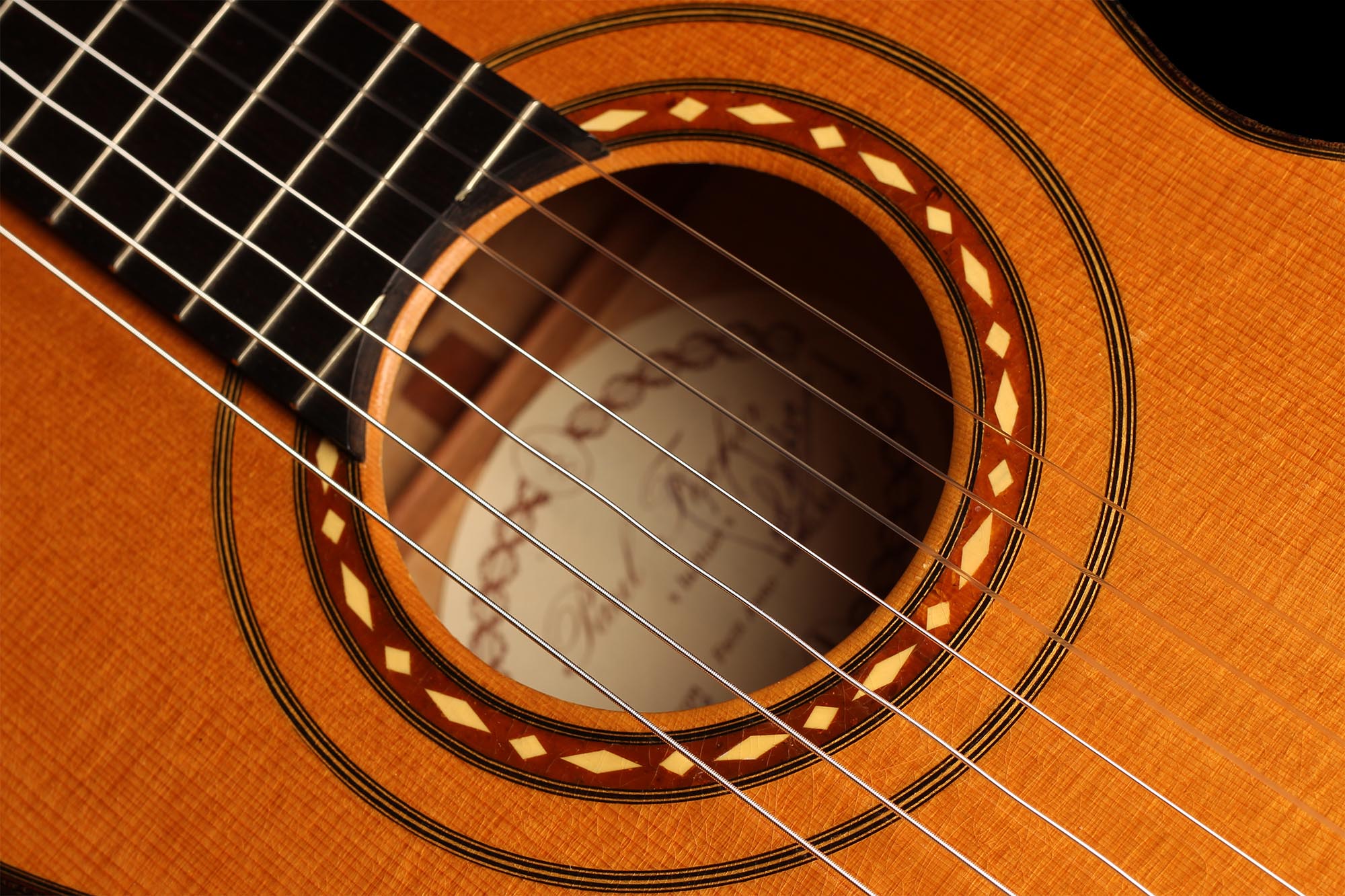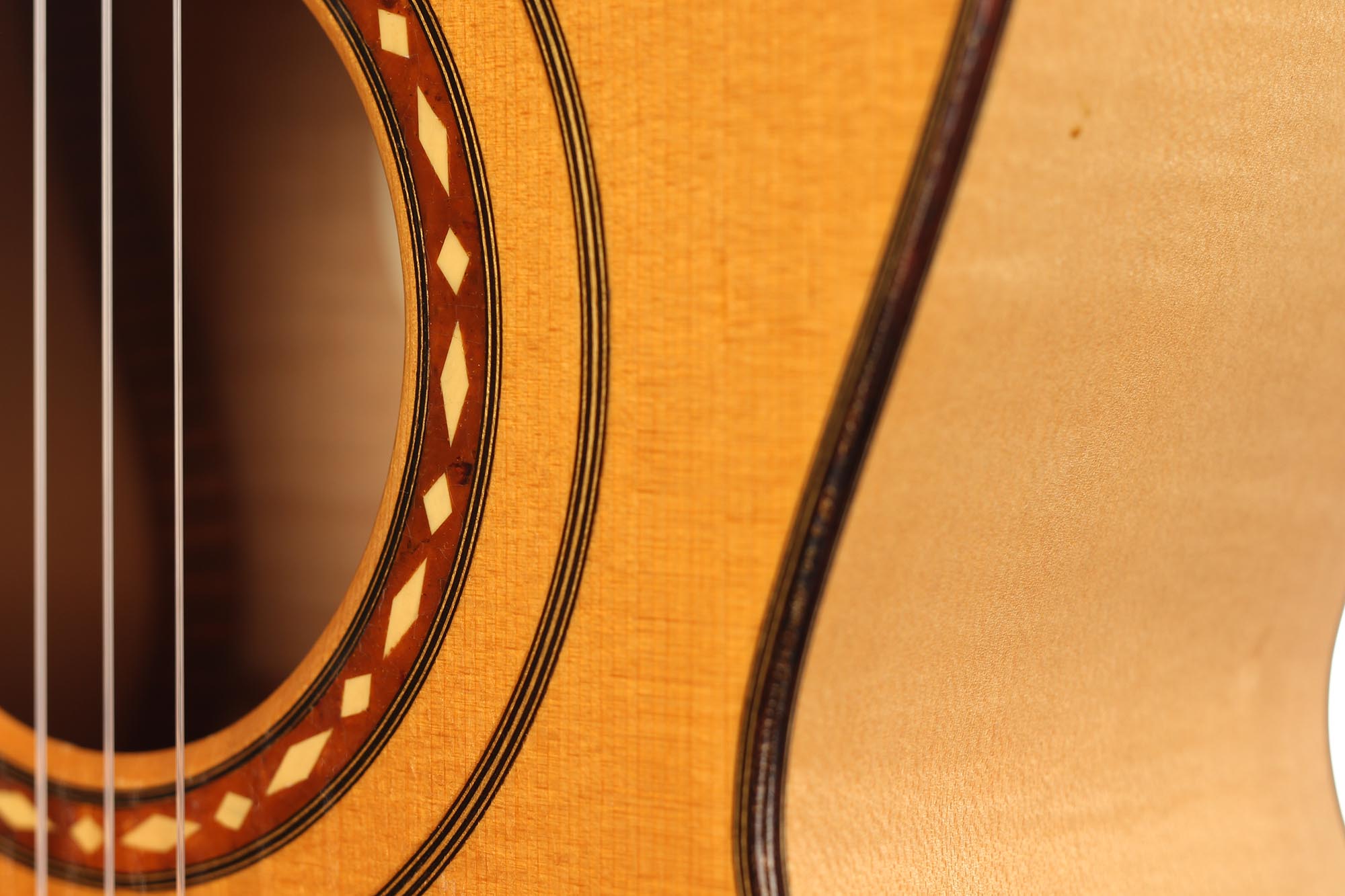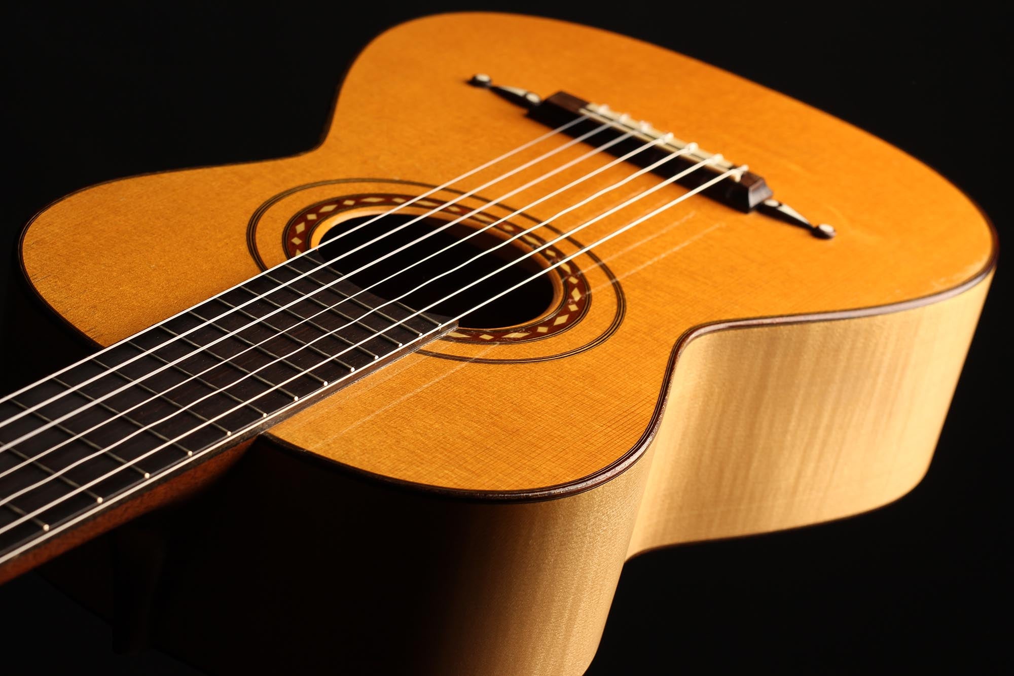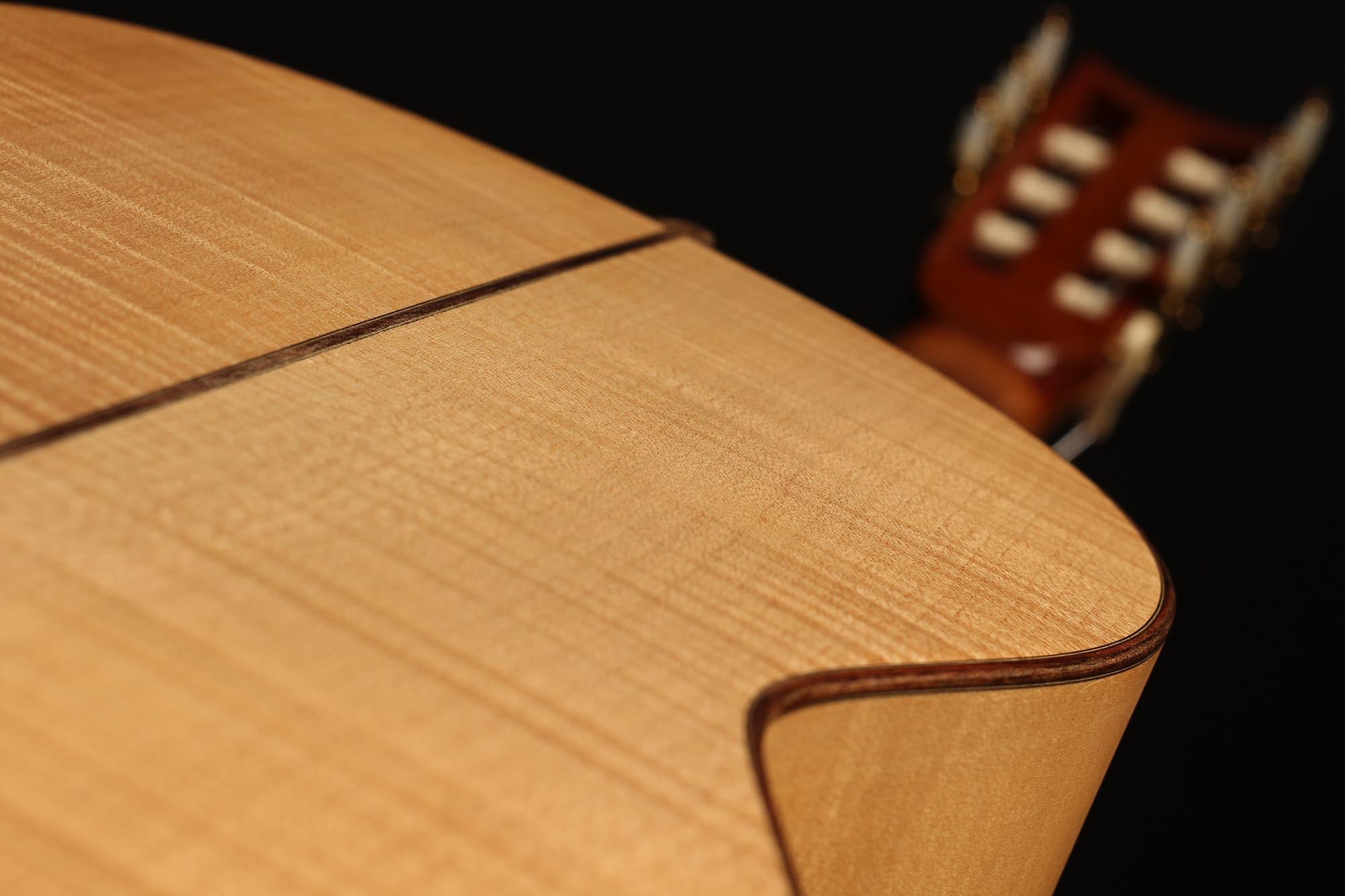 This guitar was built after the famous instruments by the Londonian workshop of Joseph and Louis Panormo. This instantly recognisable design was inspired by the Spanish luthier Pages whose instruments were brought to England by Fernando Sor. Panormo guitars are a very interesting link between the romantic and the classical guitars. It features characteristics of the first (small body, pin bridge, mother of pearl decoration) and of the latter (tuners, height of the ribs, fan bracing, use of rosewood and Spanish cedar), making it an ideal guitar for classical players wishing to wander on the romantic repertoire with the appropriate instrument.