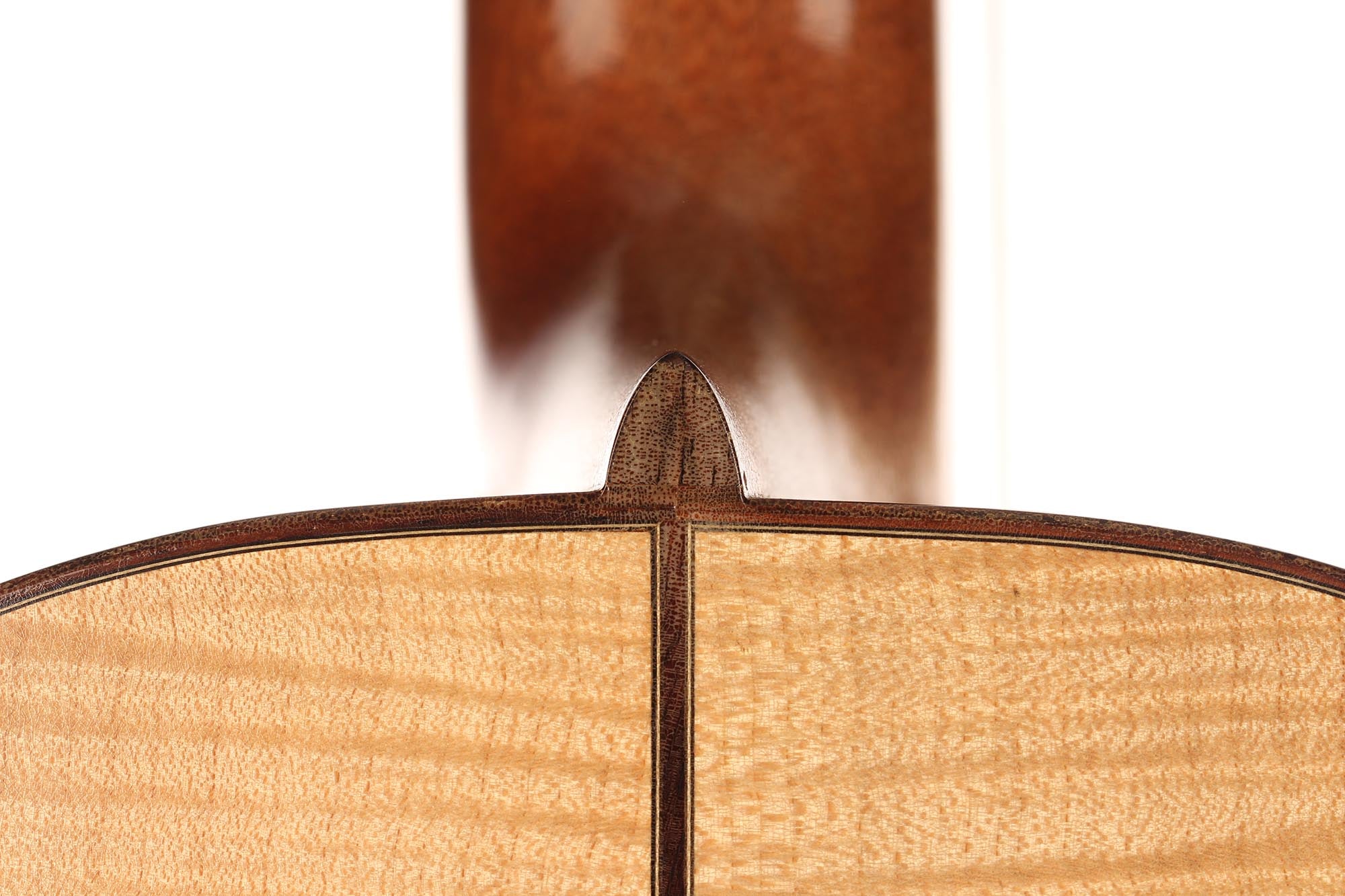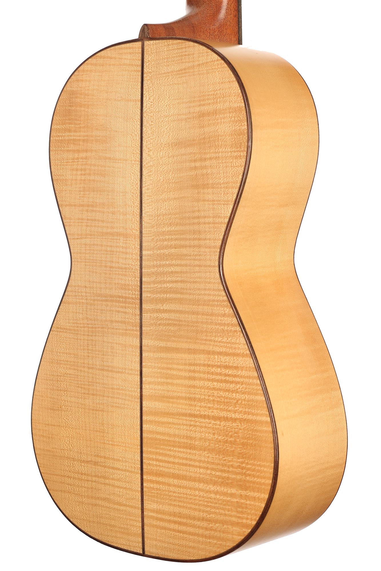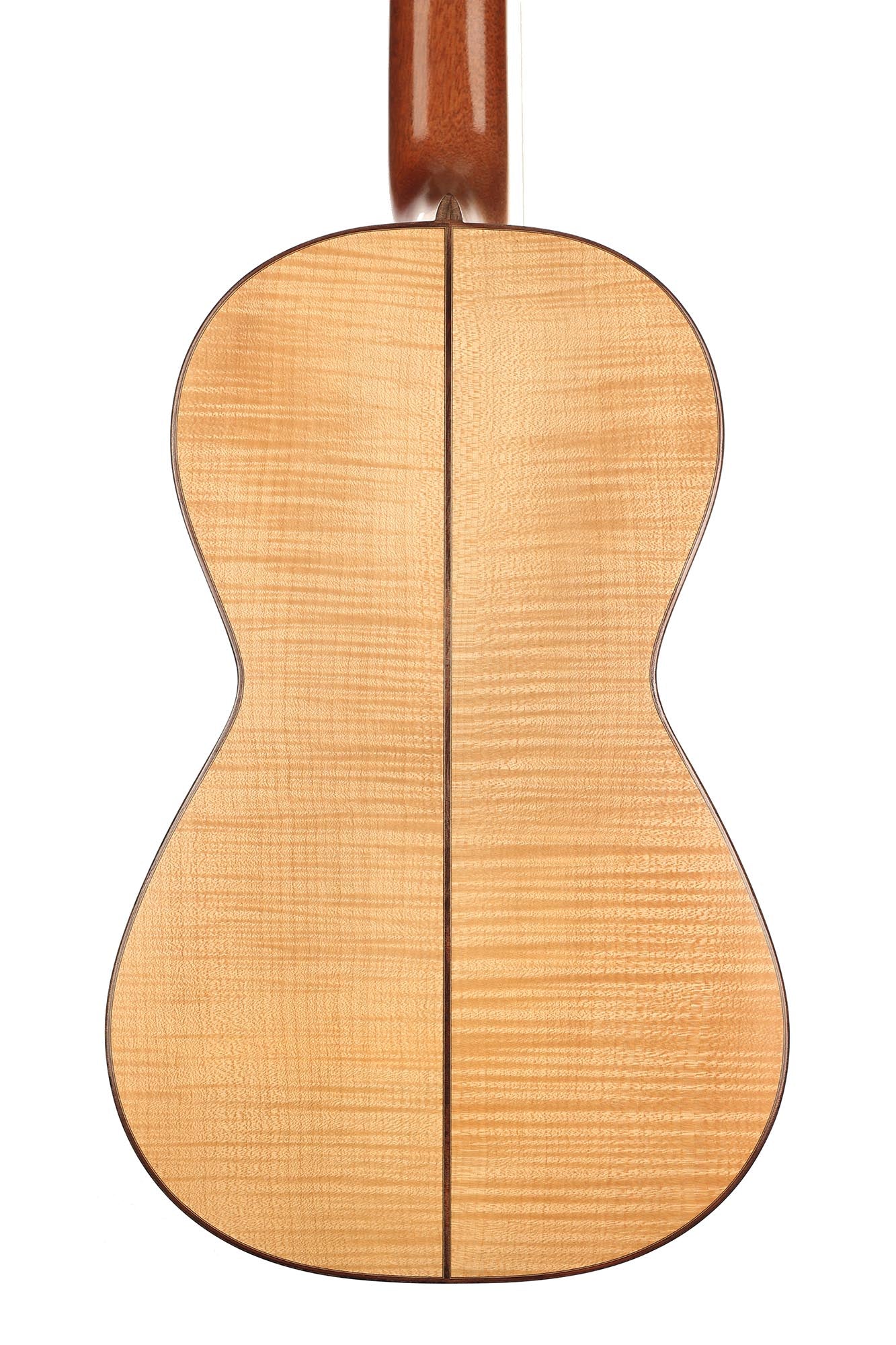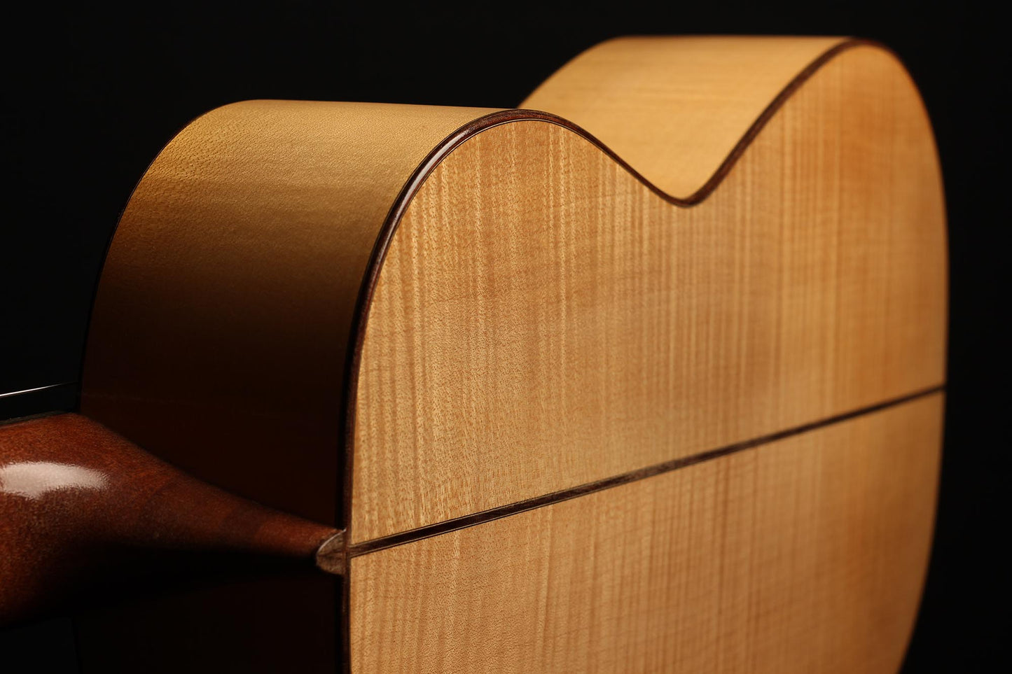 This guitar was built after the famous instruments by the Londonian workshop of Joseph and Louis Panormo. This instantly recognisable design was inspired by the Spanish luthier Pages whose instruments were brought to England by Fernando Sor. Panormo guitars are a very interesting link between the romantic and the classical guitars. It features characteristics of the first (small body, pin bridge, mother of pearl decoration) and of the latter (tuners, height of the ribs, fan bracing, use of rosewood and Spanish cedar), making it an ideal guitar for classical players wishing to wander on the romantic repertoire with the appropriate instrument.