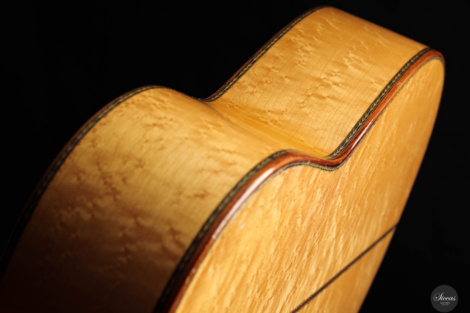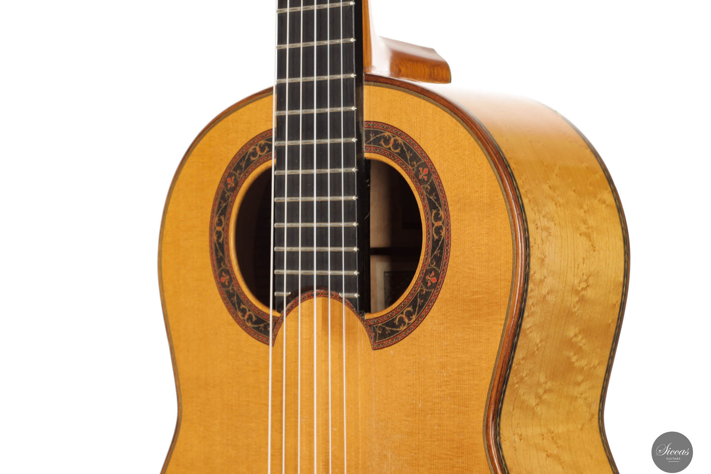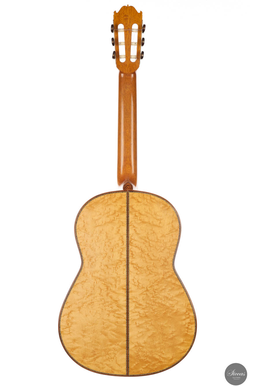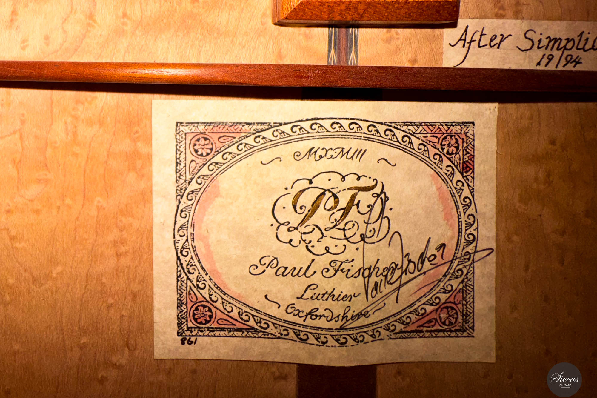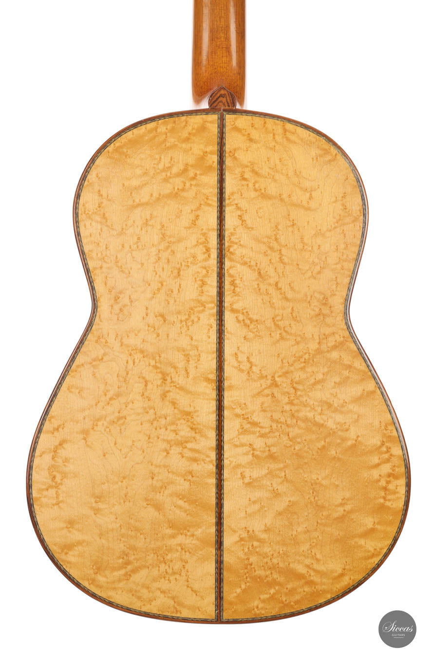 This 1994 Paul Fischer guitar is a meticulously crafted copy of a Francisco Simplicio design, known for its innovative divided sound hole. Simplicio, who created at least nine guitars featuring this unique design, aimed to enhance the instrument's acoustic properties by allowing more room for the top to vibrate. This design also facilitated longer bracing, which in turn produced deeper bass resonances. The top of this guitar is constructed from spruce, paired with strikingly figured birdseye maple for the back and sides, combining aesthetic beauty with exceptional sound quality. Despite some playing wear, the guitar remains in very good condition without any structural issues. It comes equipped with high-quality Rodgers tuning machines and includes a hard-shell case for protection.