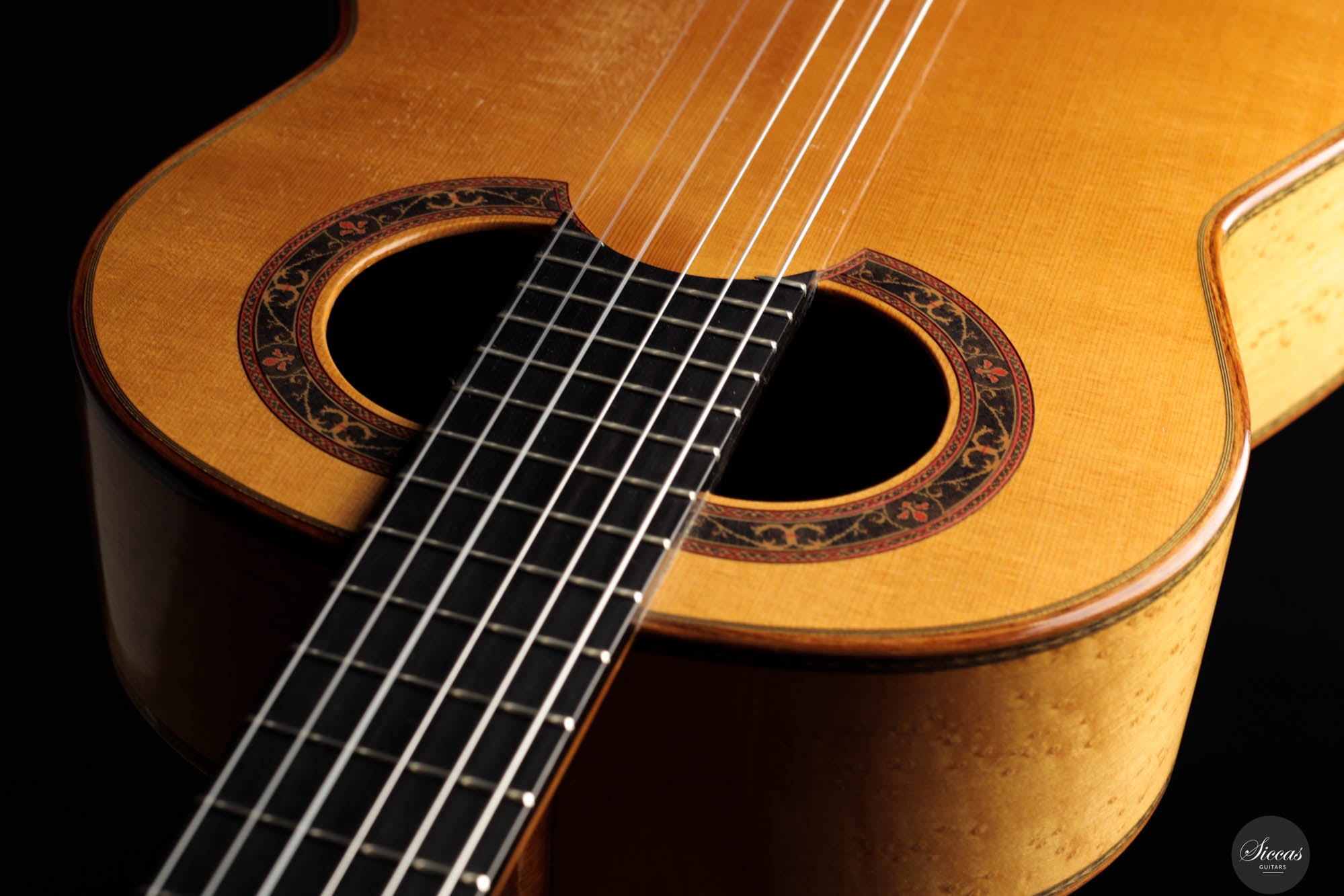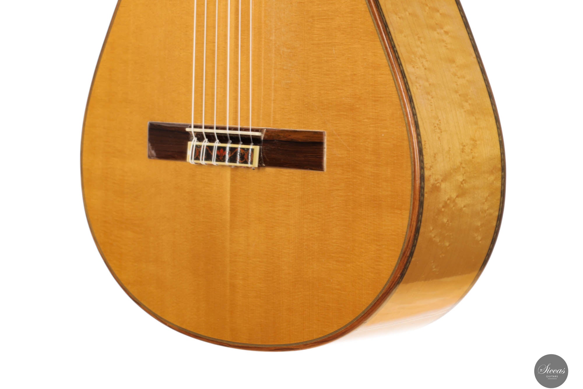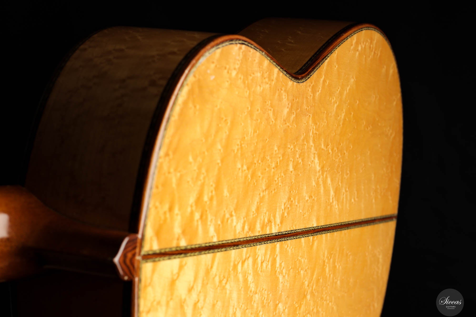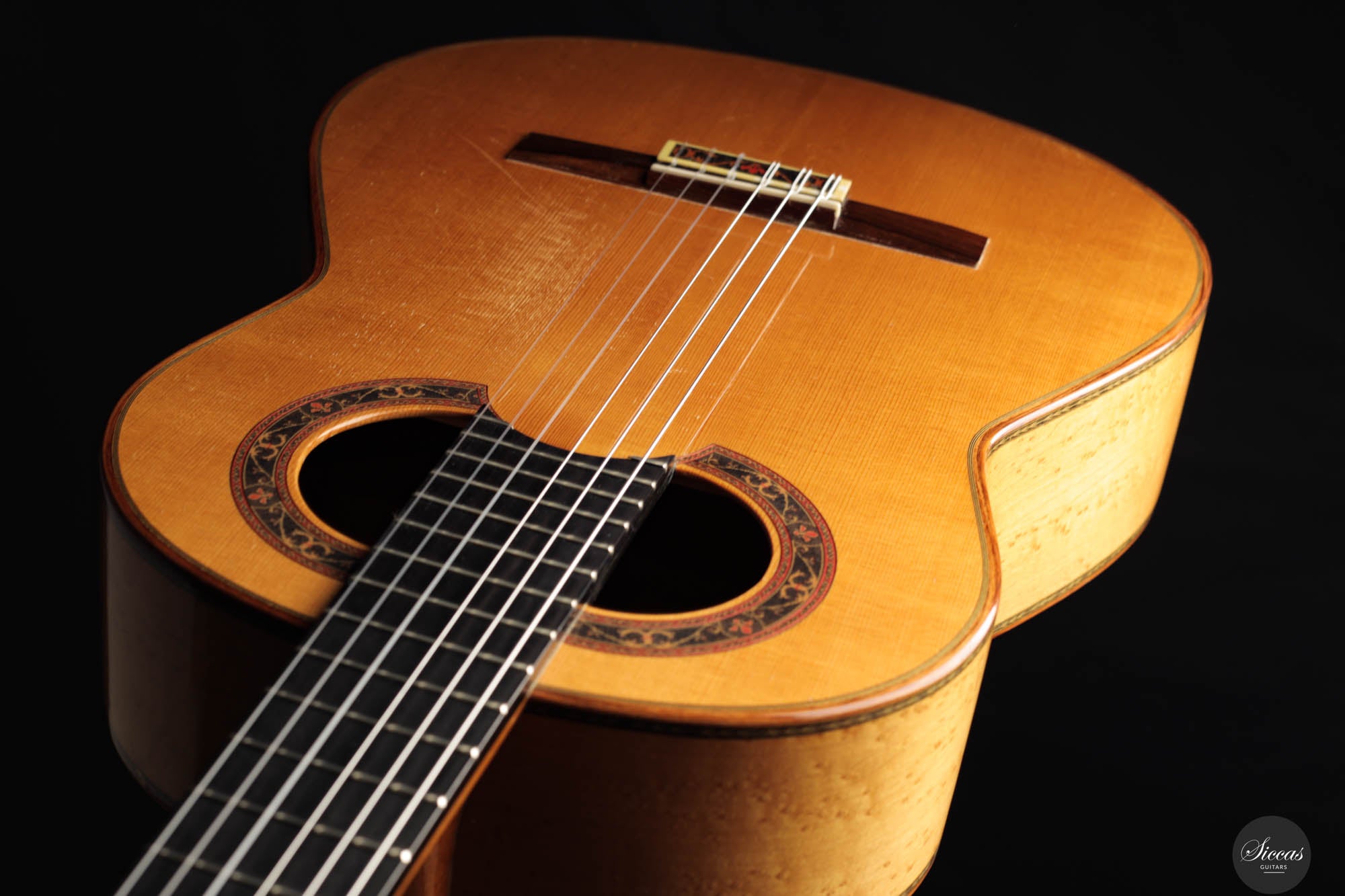This 1994 Paul Fischer guitar is a meticulously crafted copy of a Francisco Simplicio design, known for its innovative divided sound hole. Simplicio, who created at least nine guitars featuring this unique design, aimed to enhance the instrument's acoustic properties by allowing more room for the top to vibrate. This design also facilitated longer bracing, which in turn produced deeper bass resonances. The top of this guitar is constructed from spruce, paired with strikingly figured birdseye maple for the back and sides, combining aesthetic beauty with exceptional sound quality. Despite some playing wear, the guitar remains in very good condition without any structural issues. It comes equipped with high-quality Rodgers tuning machines and includes a hard-shell case for protection.