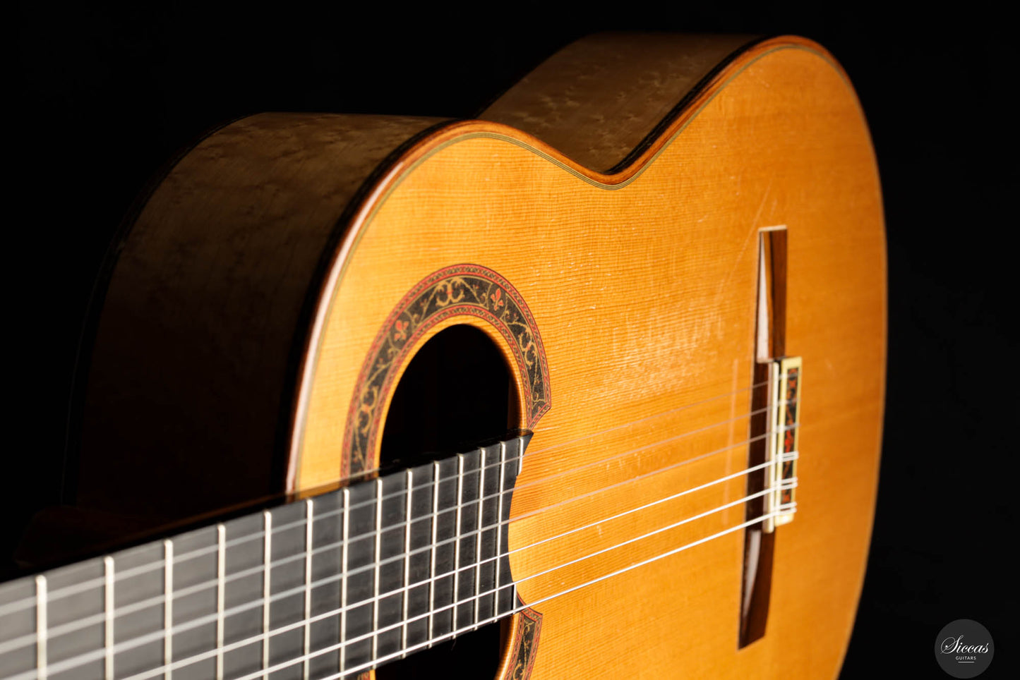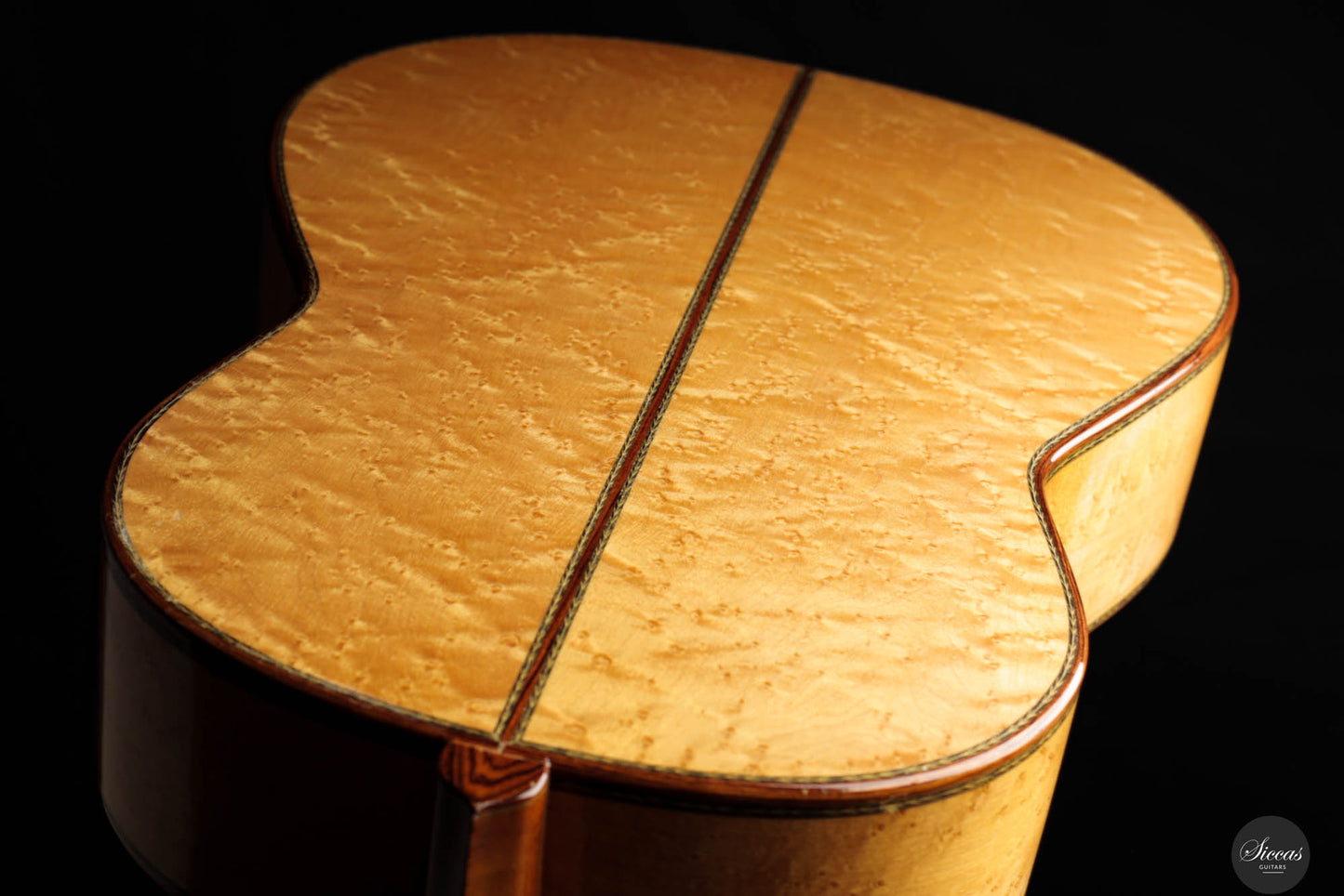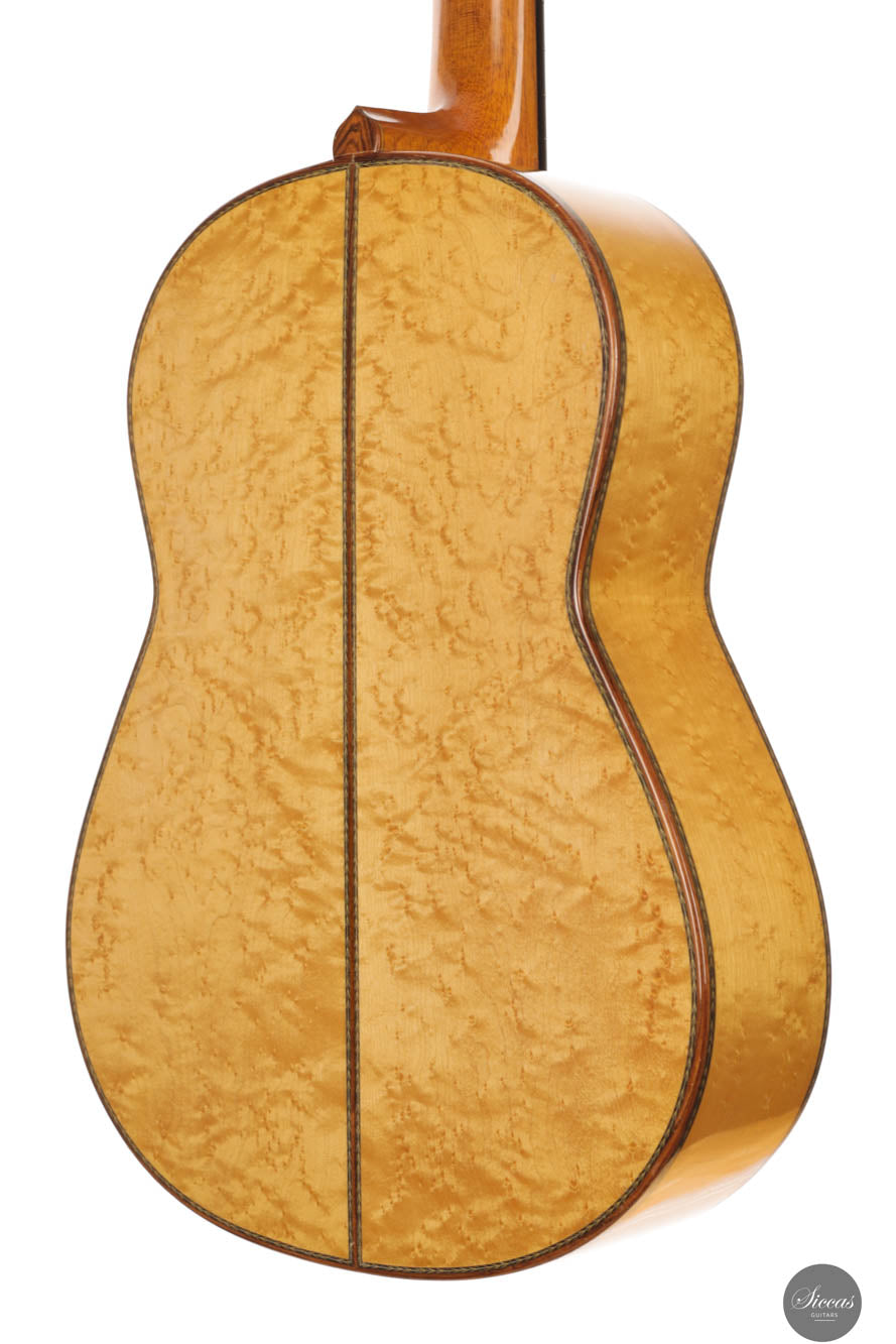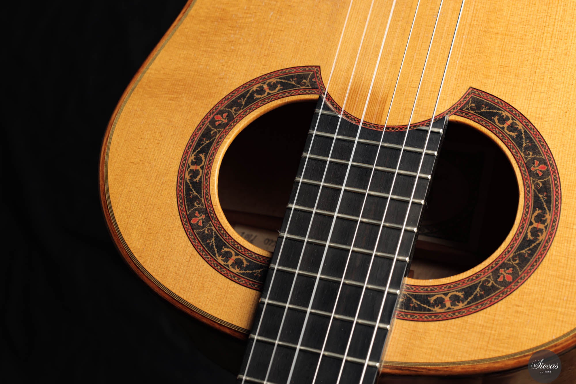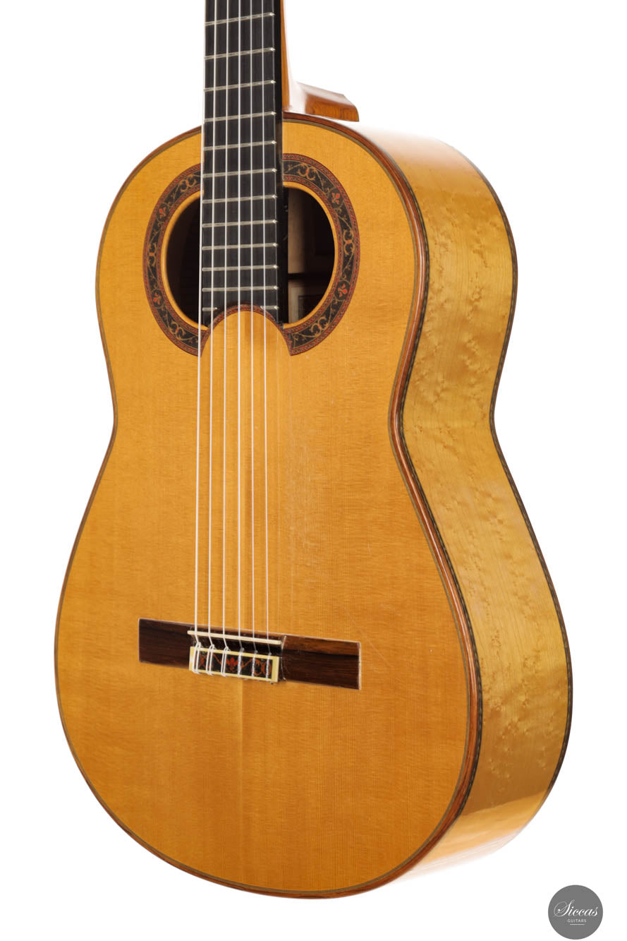 This 1994 Paul Fischer guitar is a meticulously crafted copy of a Francisco Simplicio design, known for its innovative divided sound hole. Simplicio, who created at least nine guitars featuring this unique design, aimed to enhance the instrument's acoustic properties by allowing more room for the top to vibrate. This design also facilitated longer bracing, which in turn produced deeper bass resonances. The top of this guitar is constructed from spruce, paired with strikingly figured birdseye maple for the back and sides, combining aesthetic beauty with exceptional sound quality. Despite some playing wear, the guitar remains in very good condition without any structural issues. It comes equipped with high-quality Rodgers tuning machines and includes a hard-shell case for protection.