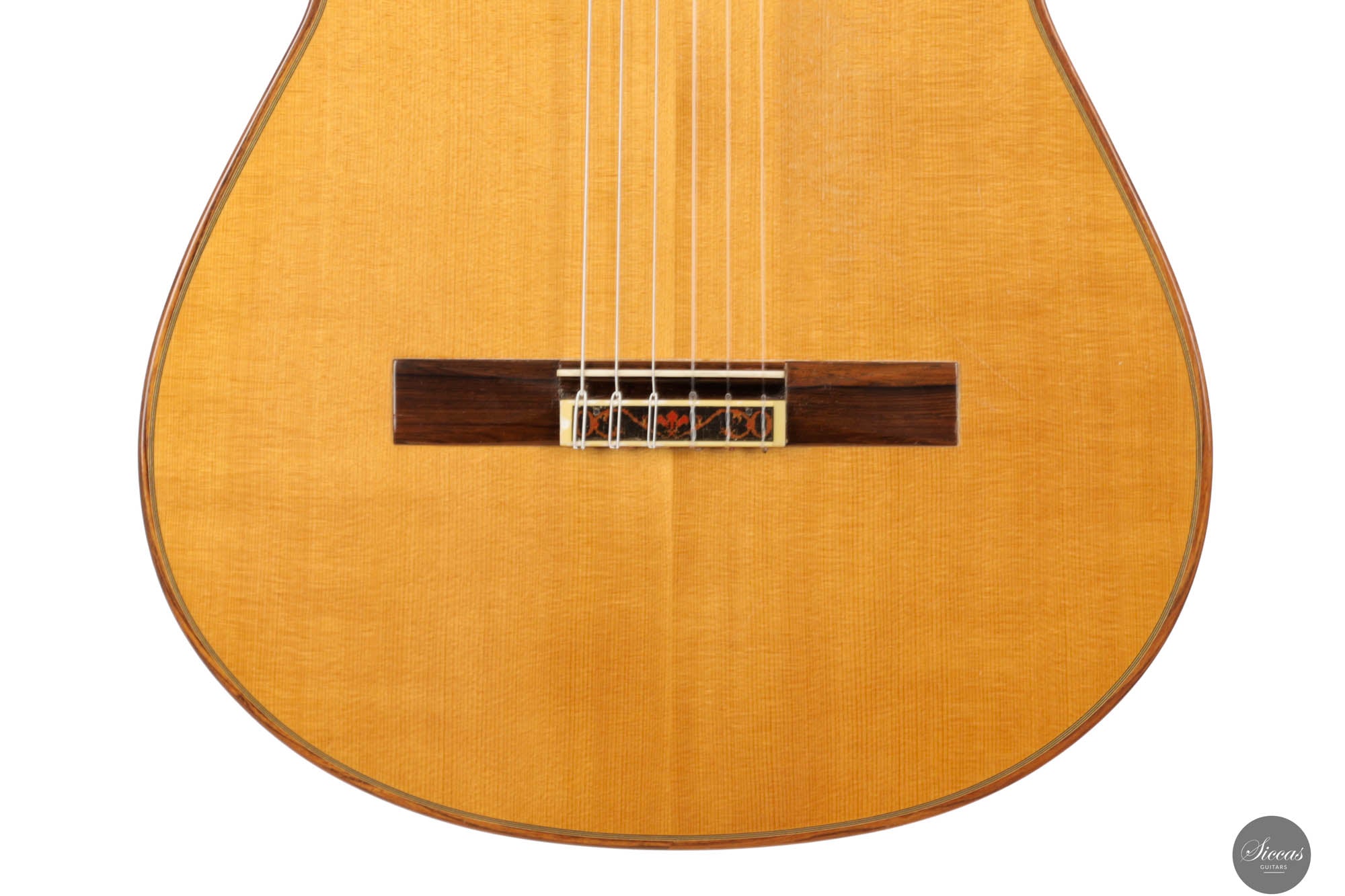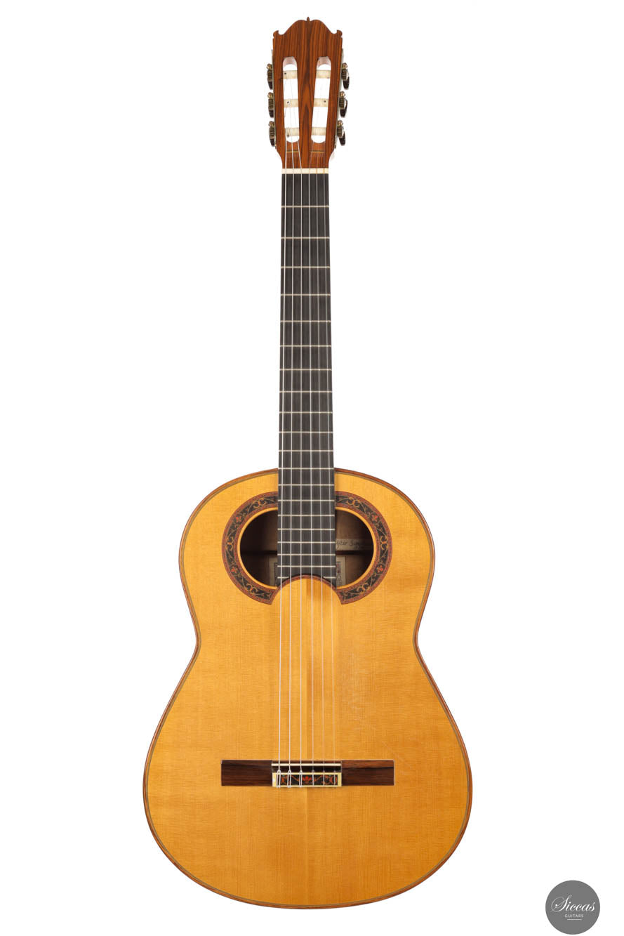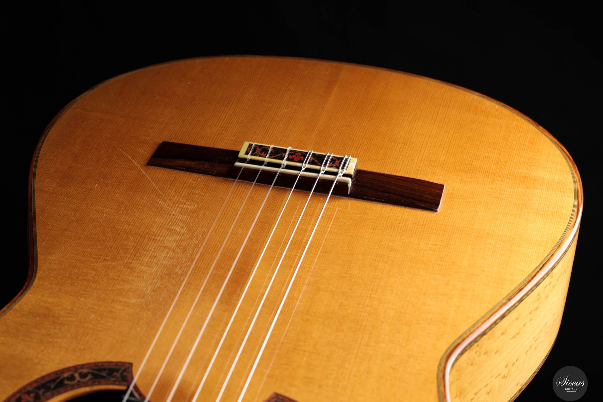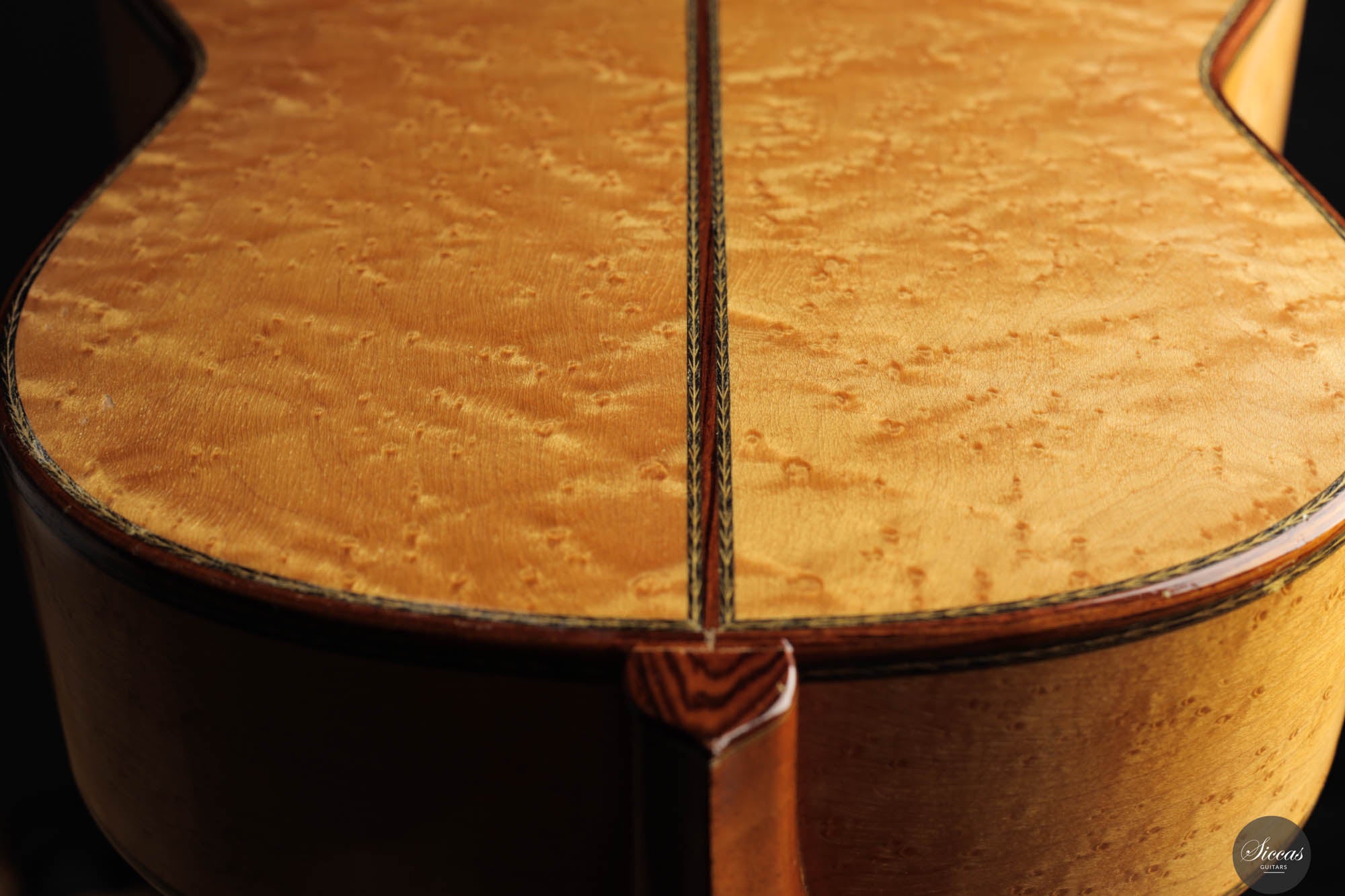 This 1994 Paul Fischer guitar is a meticulously crafted copy of a Francisco Simplicio design, known for its innovative divided sound hole. Simplicio, who created at least nine guitars featuring this unique design, aimed to enhance the instrument's acoustic properties by allowing more room for the top to vibrate. This design also facilitated longer bracing, which in turn produced deeper bass resonances. The top of this guitar is constructed from spruce, paired with strikingly figured birdseye maple for the back and sides, combining aesthetic beauty with exceptional sound quality. Despite some playing wear, the guitar remains in very good condition without any structural issues. It comes equipped with high-quality Rodgers tuning machines and includes a hard-shell case for protection.