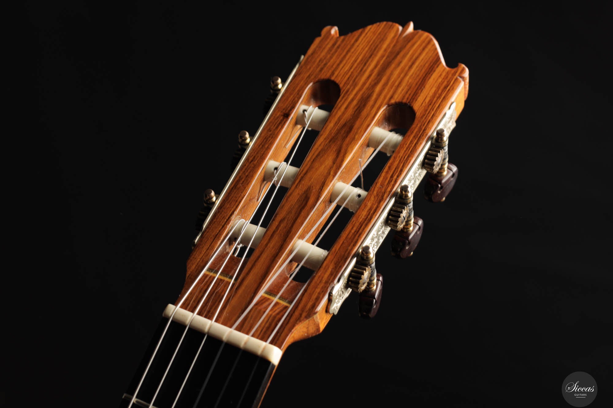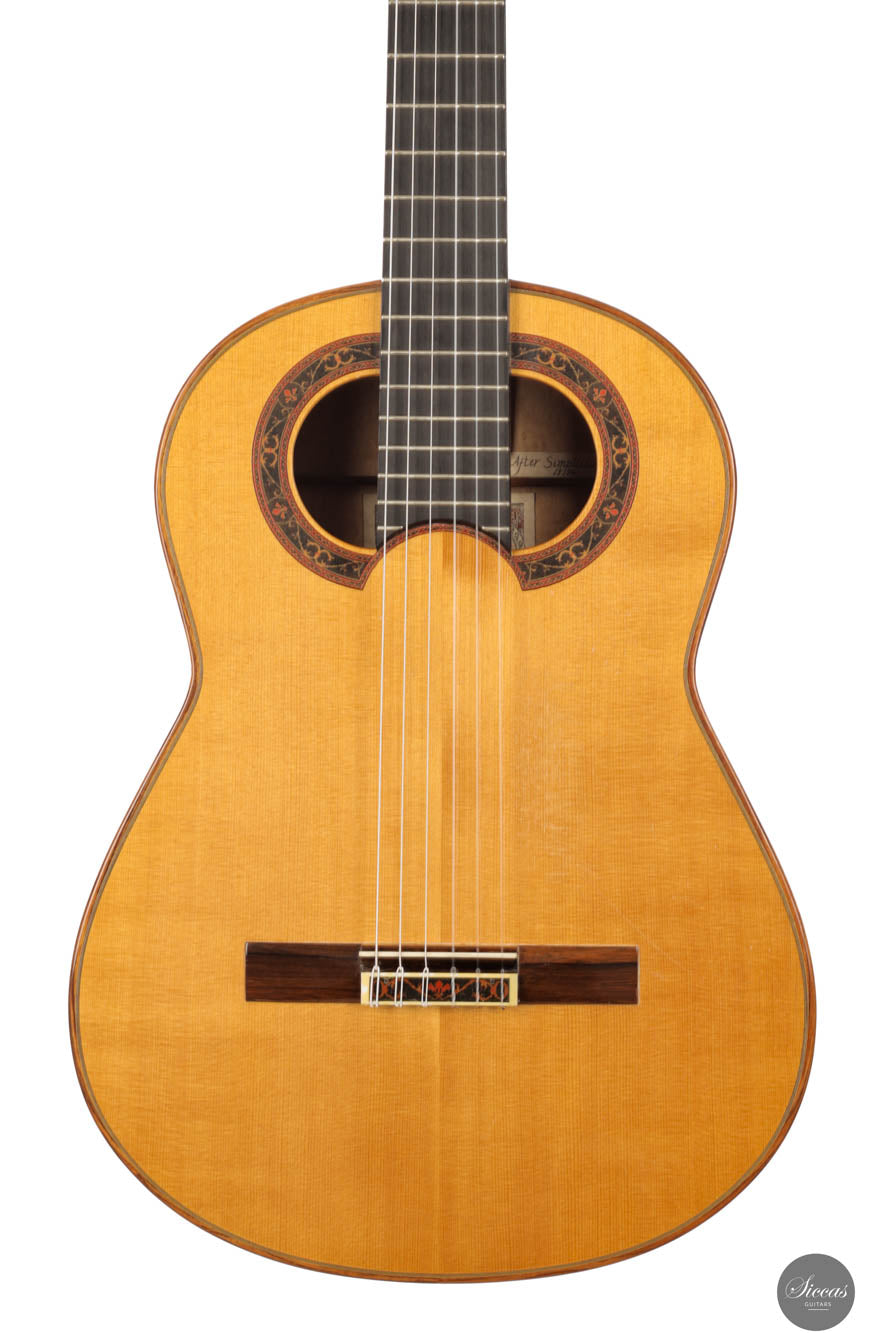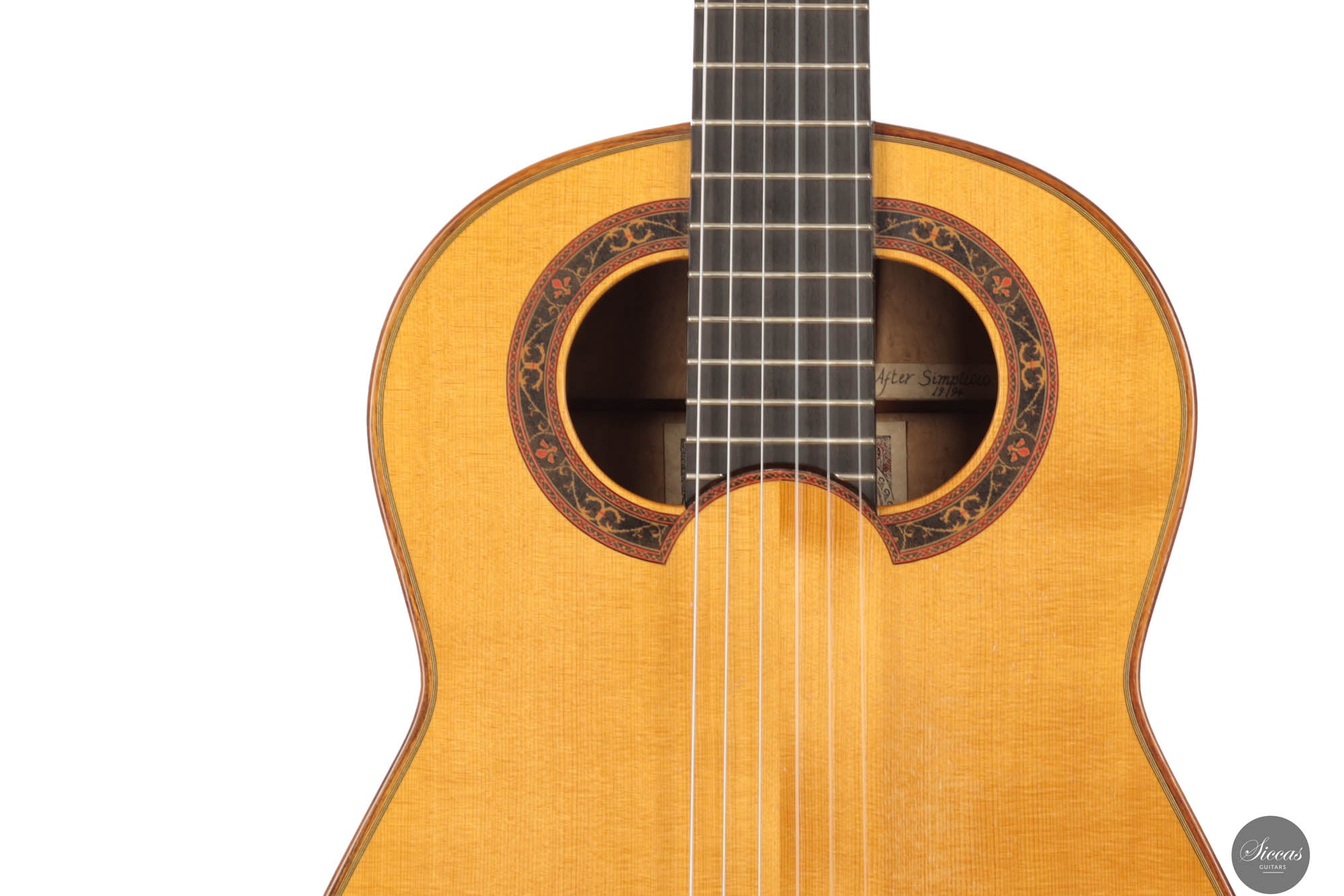 Sonically, the guitar offers significant volume with velvety trebles and rich, dark basses, making it a robust instrument suitable for a variety of musical styles. This particular model is notable not only for its sound and build quality but also for its historical significance—it is the exact guitar featured in the "Francisco Simplicio Luthier" book by Diego Milanese and Umberto Piazza. This feature underscores its importance and collectibility, making it a prized possession for enthusiasts of classical guitar history and craftsmanship.