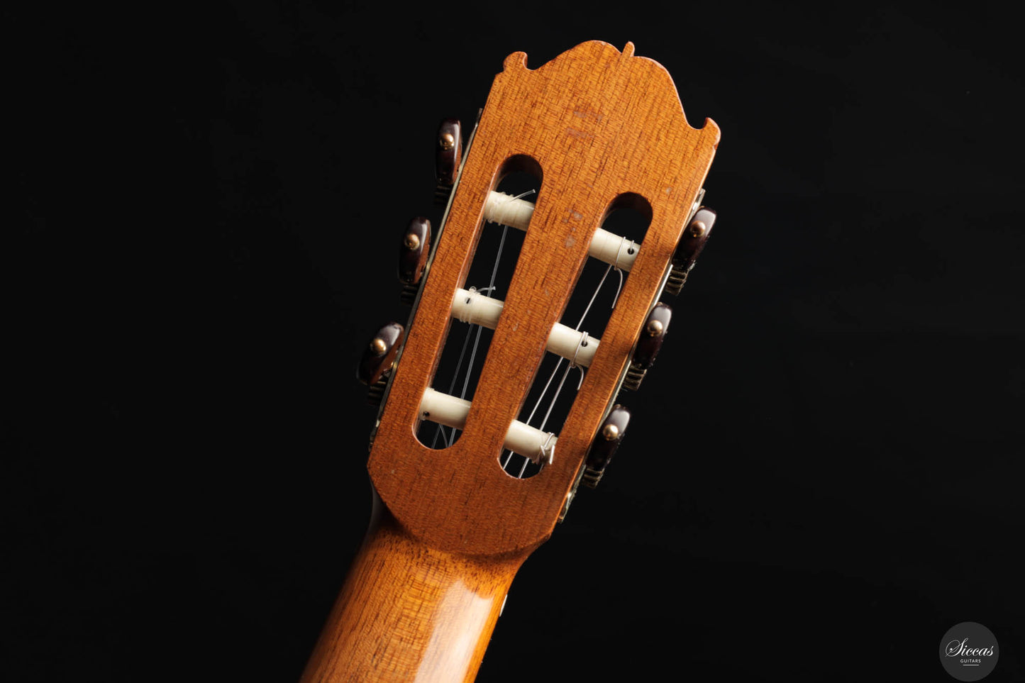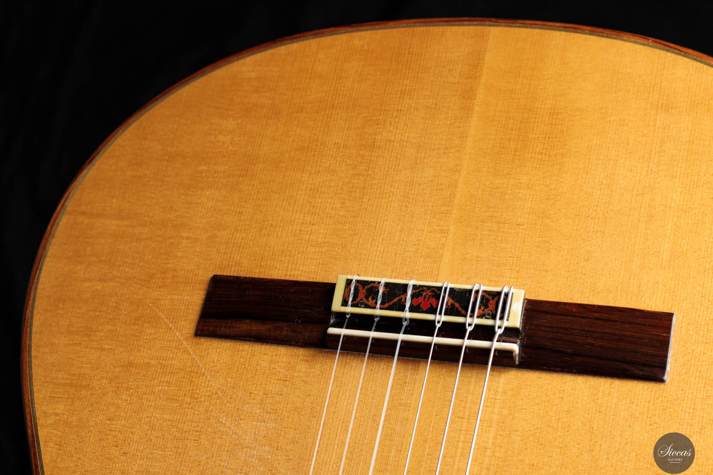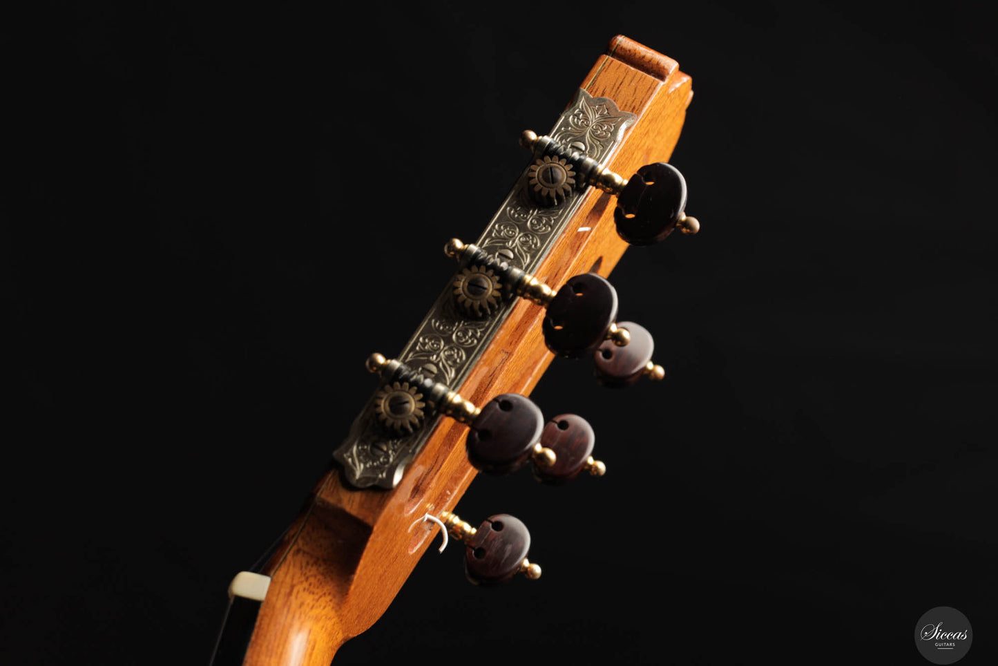 Sonically, the guitar offers significant volume with velvety trebles and rich, dark basses, making it a robust instrument suitable for a variety of musical styles. This particular model is notable not only for its sound and build quality but also for its historical significance—it is the exact guitar featured in the "Francisco Simplicio Luthier" book by Diego Milanese and Umberto Piazza. This feature underscores its importance and collectibility, making it a prized possession for enthusiasts of classical guitar history and craftsmanship.