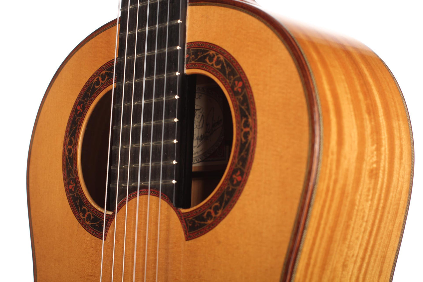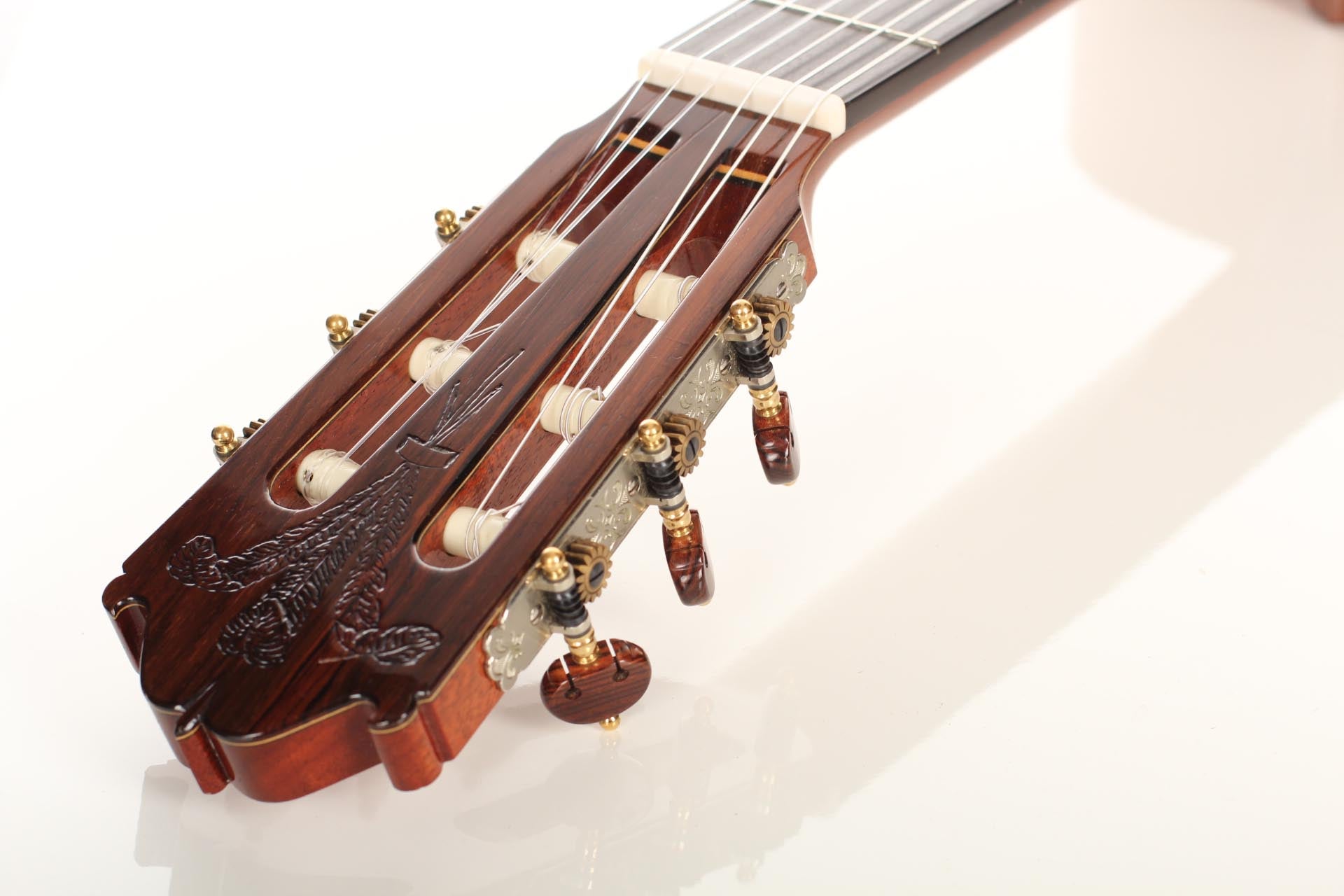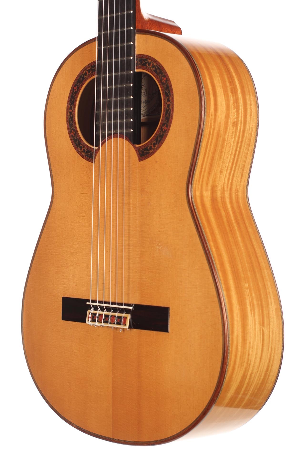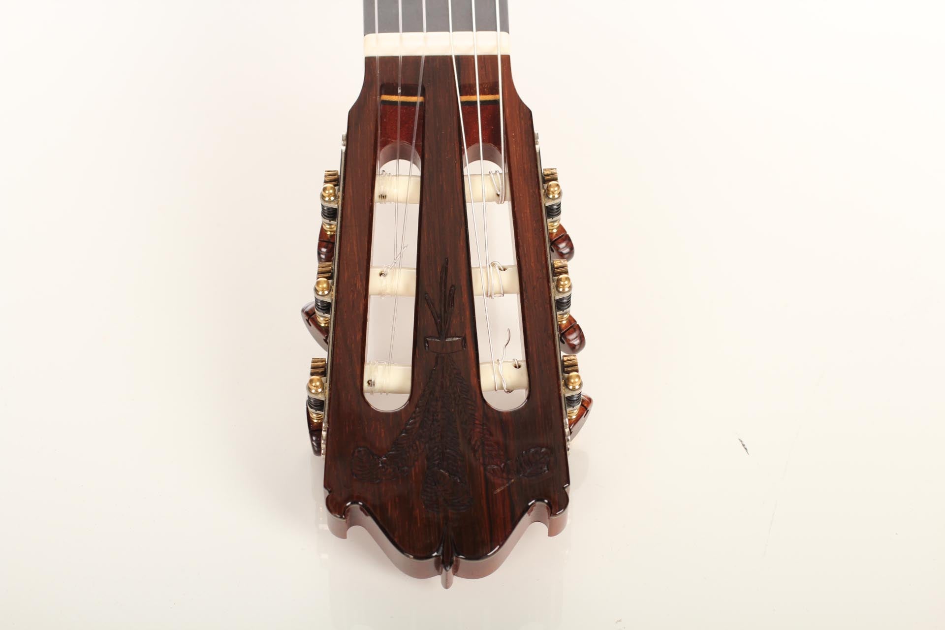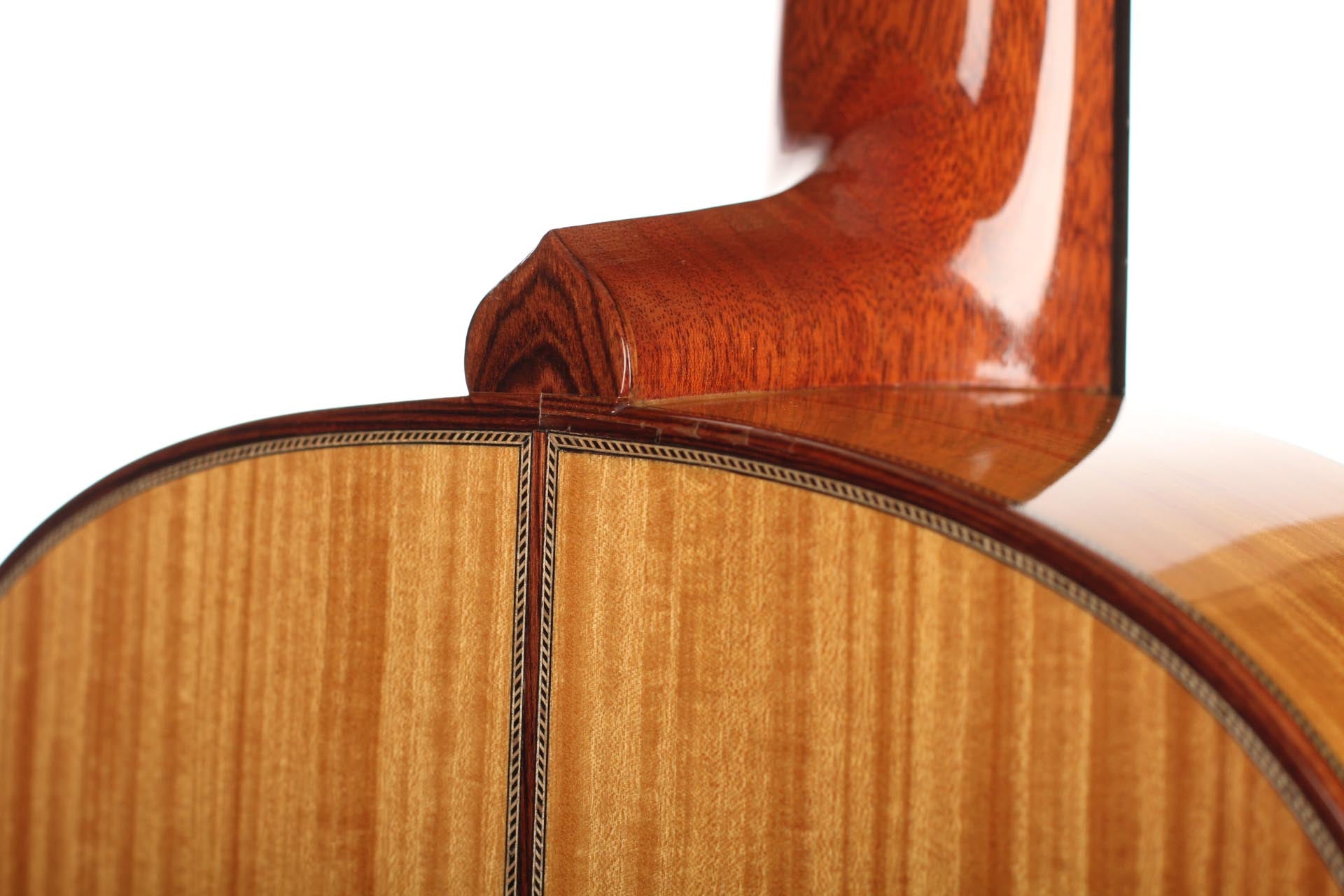 Born on the Isle of Man but brought up in the city of Oxford, it was here that he began his career under the tutelage of the renowned harpsichord maker Robert Goble, making instruments within the finest European tradition. Further study at the Oxford College of Art and Technology completed his training. Paul is rare in having this skill with different instruments but his love of the guitar led him to a chance meeting with the late David Rubio, at Duns Tew, Oxfordshire, a renowned place visited by Julian Bream and John Williams. As chief instrument maker and manager he remained with Rubio for a number of years. Success with his own instruments during this period under the Rubio label and stamped P.F (which can still be seen in use today), led him to establish his own studio in 1975. In 1983 he was awarded a Winston Churchill Travelling Fellowship to extend his research into the forest of Brazil. Paul Fischer has served as an advisor to the crafts Panel for the Southern Arts Association, and also as a Technical Advisor and Panel Member of the Crafts Council of Great Britain. He still dedicates his life to making fine instruments with a panoramic view of the Cotswold Hills from his workbench. As the classical guitar has joined the mainstream in the second half of the 20th century, he has been one of the figures in the vanguard and at the cutting edge of the evolution of the modern concert guitar. His instruments have been featured in many publications including the best seller 'The Complete Guitarist' by Richard Chapman (Dorling Kindersley 1993), and 'The Classical Guitar: A Complete History' by John Morrish et al (Balafon 1997). This is a 1999 Paul Fischer Simplicio copy. Francisco Simplicio made at least nine guitars with divided sound hole. If you ask yourself what was the idea behind this kind of sound hole: By dividing the sound hole on either side of the fret board there would be more room for the top to vibrate and also the the longer braces would produce more base resonance. The top is made of spruce - back and sides are made of beautiful Satinwood. The condition is very good and has only a very thin crack on the side near the heel. Only on one top you can see some sings but nothing serious. The tuning machines are made by Rodgers. A hard-shell case is included.