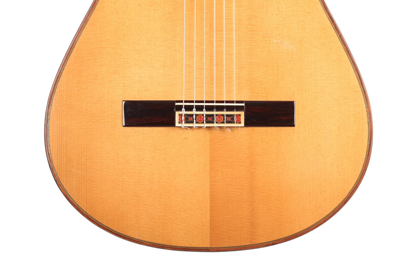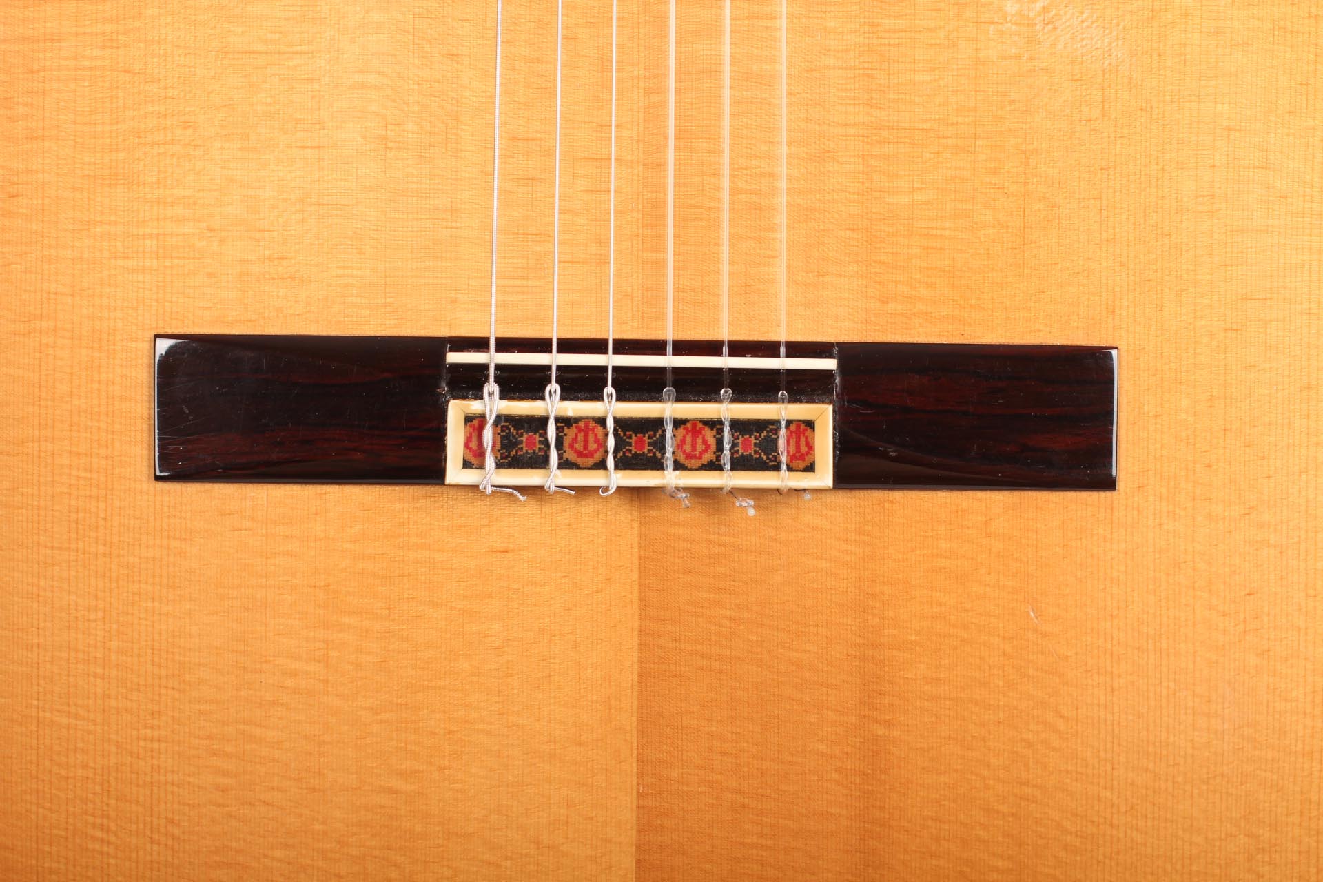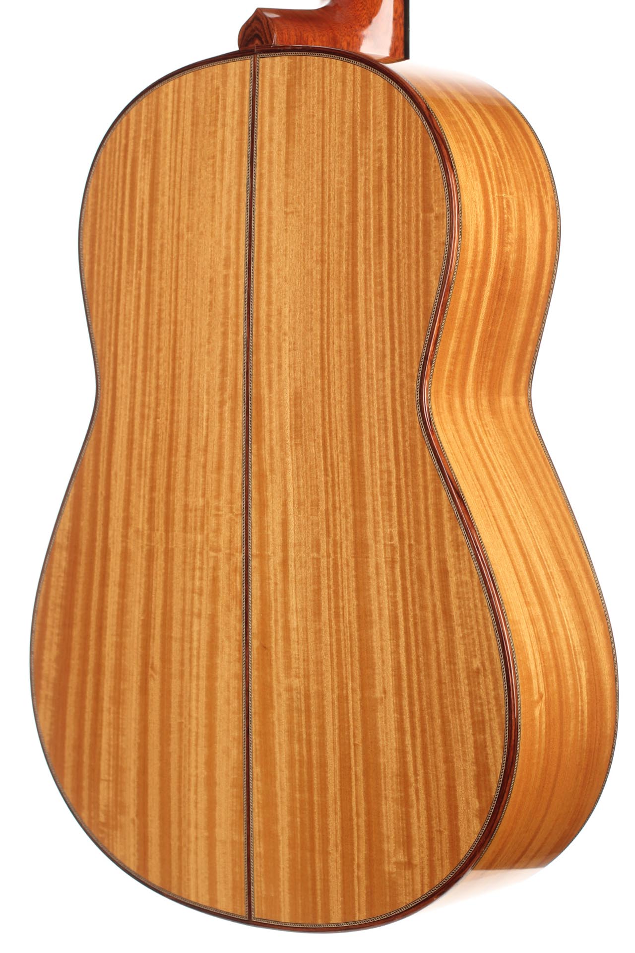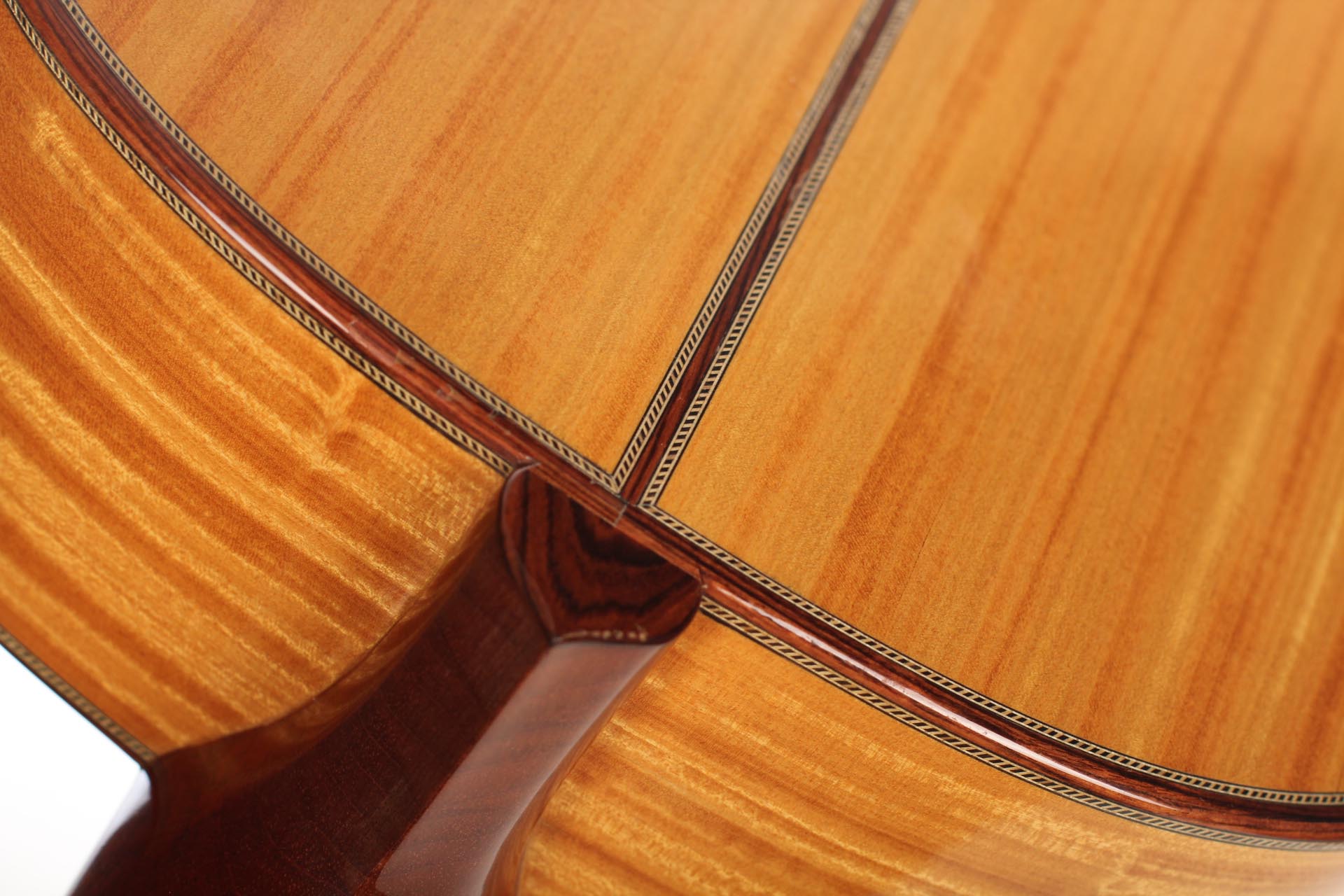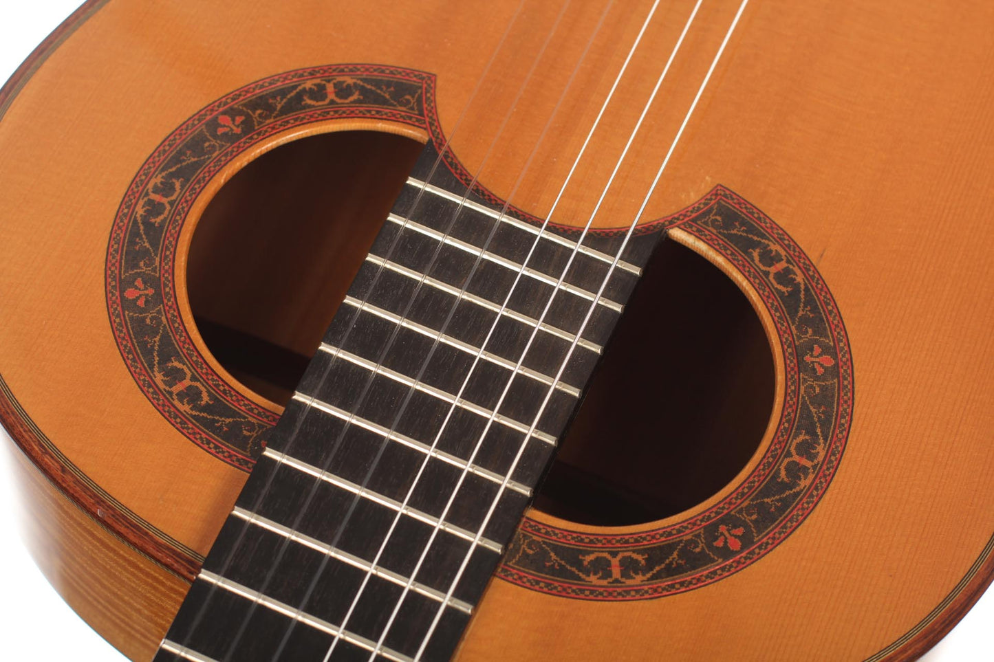 Born on the Isle of Man but brought up in the city of Oxford, it was here that he began his career under the tutelage of the renowned harpsichord maker Robert Goble, making instruments within the finest European tradition. Further study at the Oxford College of Art and Technology completed his training. Paul is rare in having this skill with different instruments but his love of the guitar led him to a chance meeting with the late David Rubio, at Duns Tew, Oxfordshire, a renowned place visited by Julian Bream and John Williams. As chief instrument maker and manager he remained with Rubio for a number of years. Success with his own instruments during this period under the Rubio label and stamped P.F (which can still be seen in use today), led him to establish his own studio in 1975. In 1983 he was awarded a Winston Churchill Travelling Fellowship to extend his research into the forest of Brazil. Paul Fischer has served as an advisor to the crafts Panel for the Southern Arts Association, and also as a Technical Advisor and Panel Member of the Crafts Council of Great Britain. He still dedicates his life to making fine instruments with a panoramic view of the Cotswold Hills from his workbench. As the classical guitar has joined the mainstream in the second half of the 20th century, he has been one of the figures in the vanguard and at the cutting edge of the evolution of the modern concert guitar. His instruments have been featured in many publications including the best seller 'The Complete Guitarist' by Richard Chapman (Dorling Kindersley 1993), and 'The Classical Guitar: A Complete History' by John Morrish et al (Balafon 1997). This is a 1999 Paul Fischer Simplicio copy. Francisco Simplicio made at least nine guitars with divided sound hole. If you ask yourself what was the idea behind this kind of sound hole: By dividing the sound hole on either side of the fret board there would be more room for the top to vibrate and also the the longer braces would produce more base resonance. The top is made of spruce - back and sides are made of beautiful Satinwood. The condition is very good and has only a very thin crack on the side near the heel. Only on one top you can see some sings but nothing serious. The tuning machines are made by Rodgers. A hard-shell case is included.