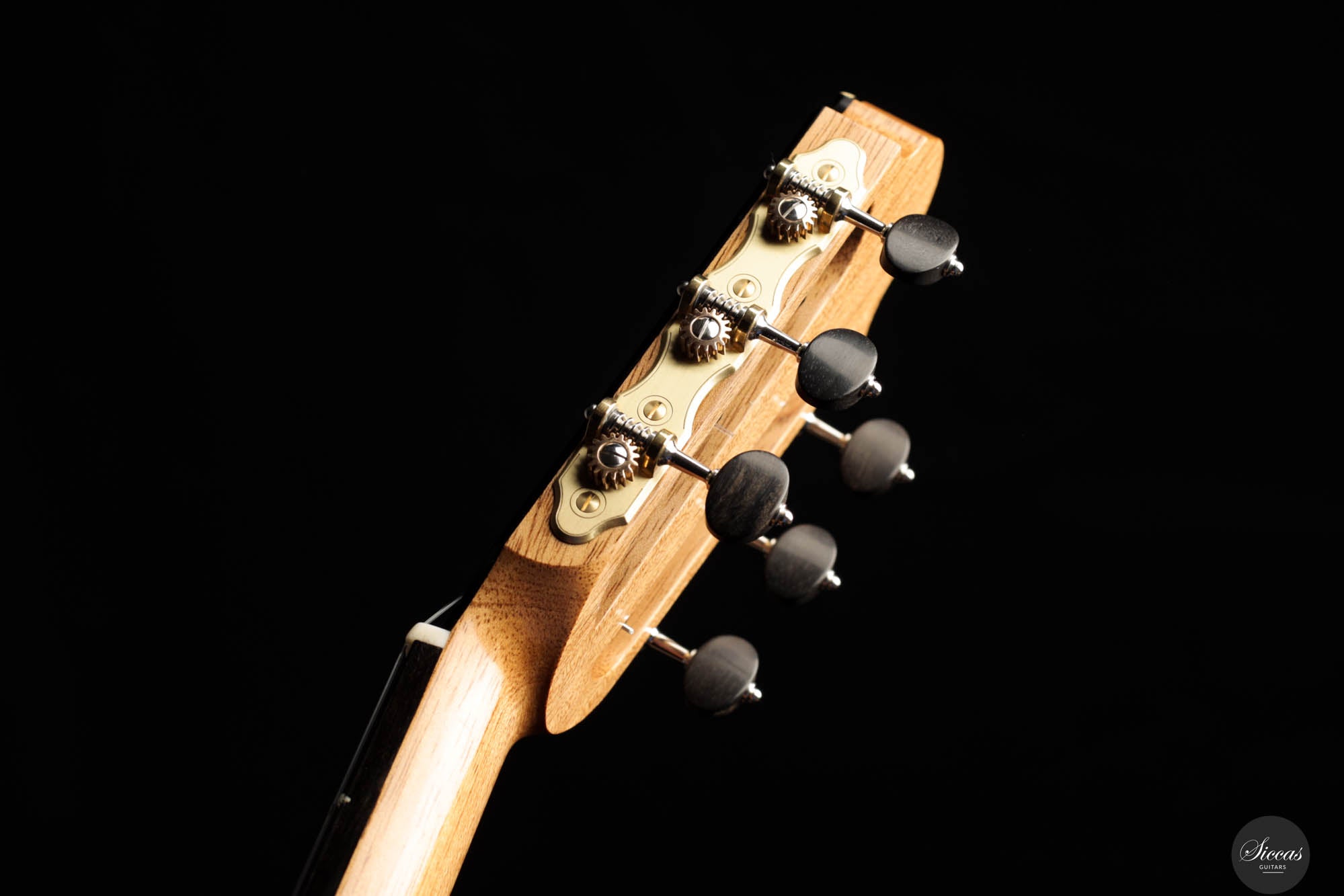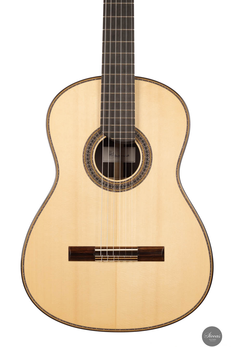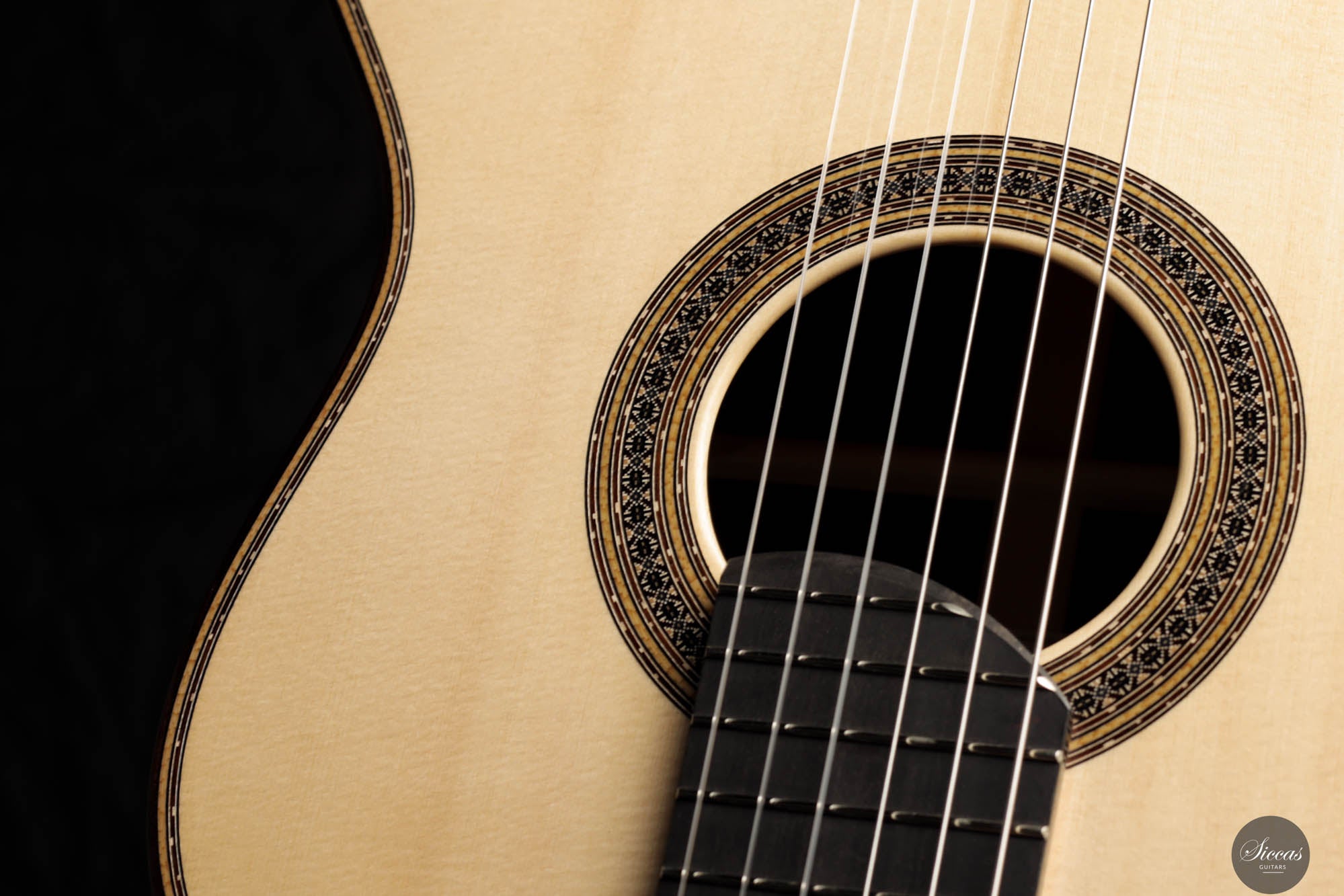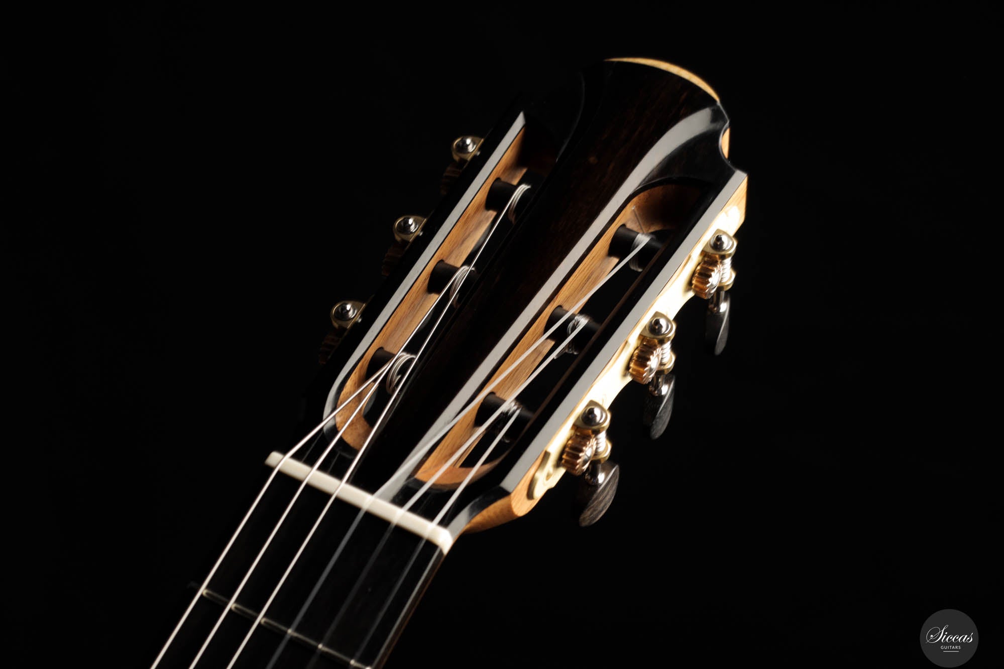 Guitar No. 13, the sister instrument to No. 14, shares a nearly identical aesthetic with its counterpart, beautifully crafted to mirror each other in every visible aspect. The true distinction lies beneath the surface, where luthier Paul has varied the thickness of the top, an experimental touch designed to subtly influence the acoustic properties of each guitar. This meticulous attention to detail is part of a broader commitment to achieving the highest level of craftsmanship, with every element finely tuned to perfection. For those interested in the specifics of these variations, an interview with Paul provides a deeper insight into his innovative approach, highlighting the subtle yet impactful differences between these two exceptional instruments.Both guitars stand out as masterpieces of lutherie, boasting clean and precise acoustic qualities that make them suitable for a wide range of musical styles. The clarity of sound produced by these instruments is particularly remarkable, facilitating the performance of complex polyphonic works with ease. This clarity ensures that every note is articulated distinctly, supporting musicians in their expression of intricate musical passages. Whether used in a solo performance or within an ensemble, guitars No. 13 and No. 14 offer musicians the ability to convey their musical vision with precision, making them not just tools, but true partners in the artistic process.