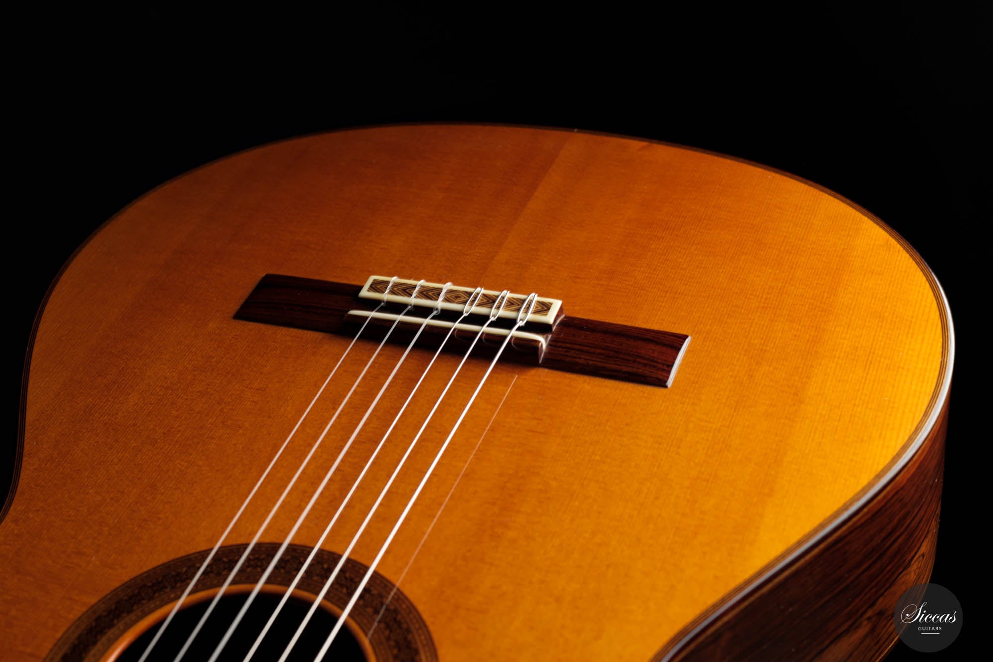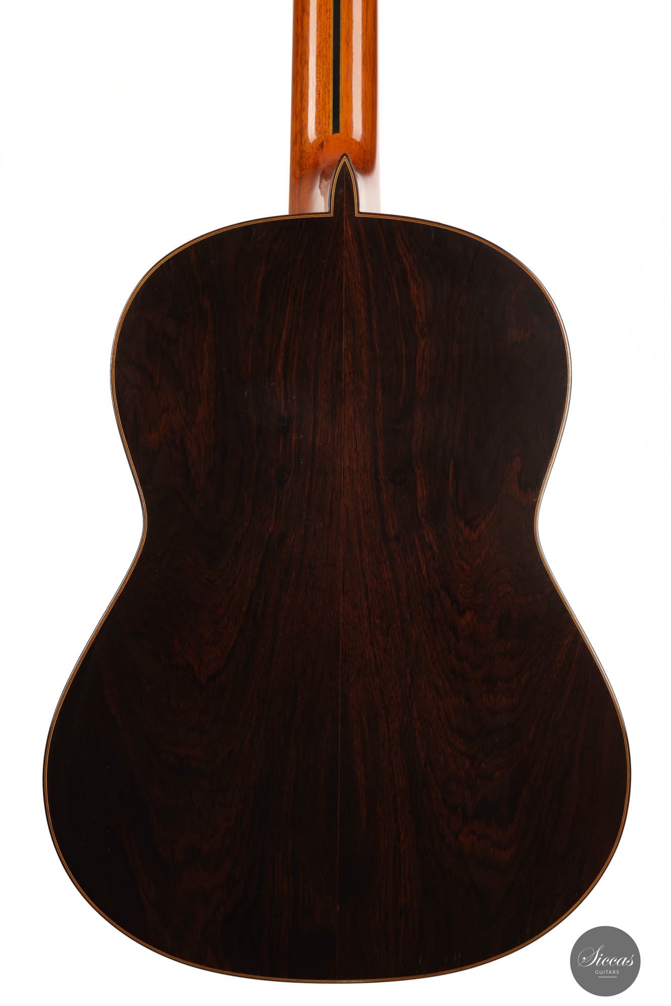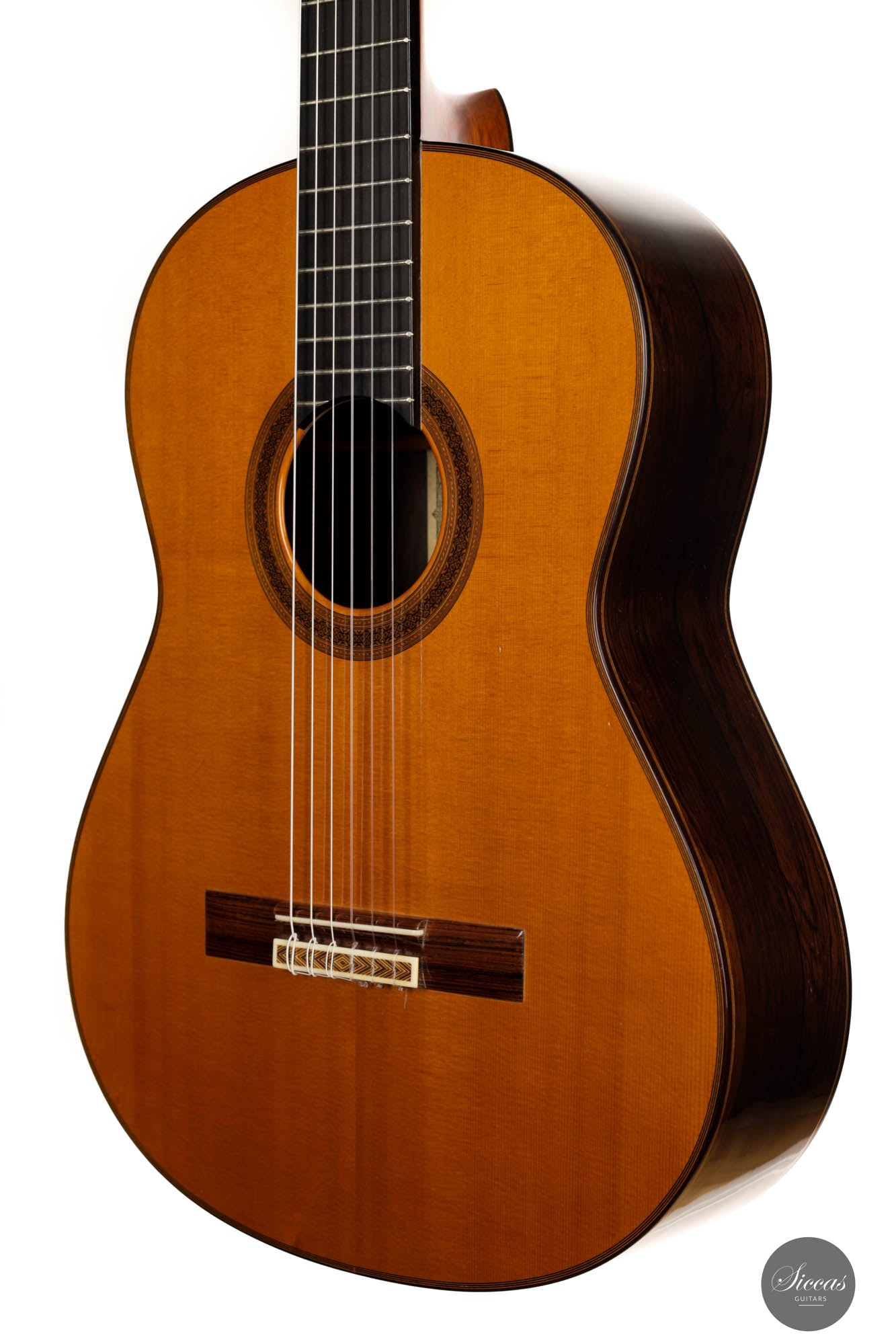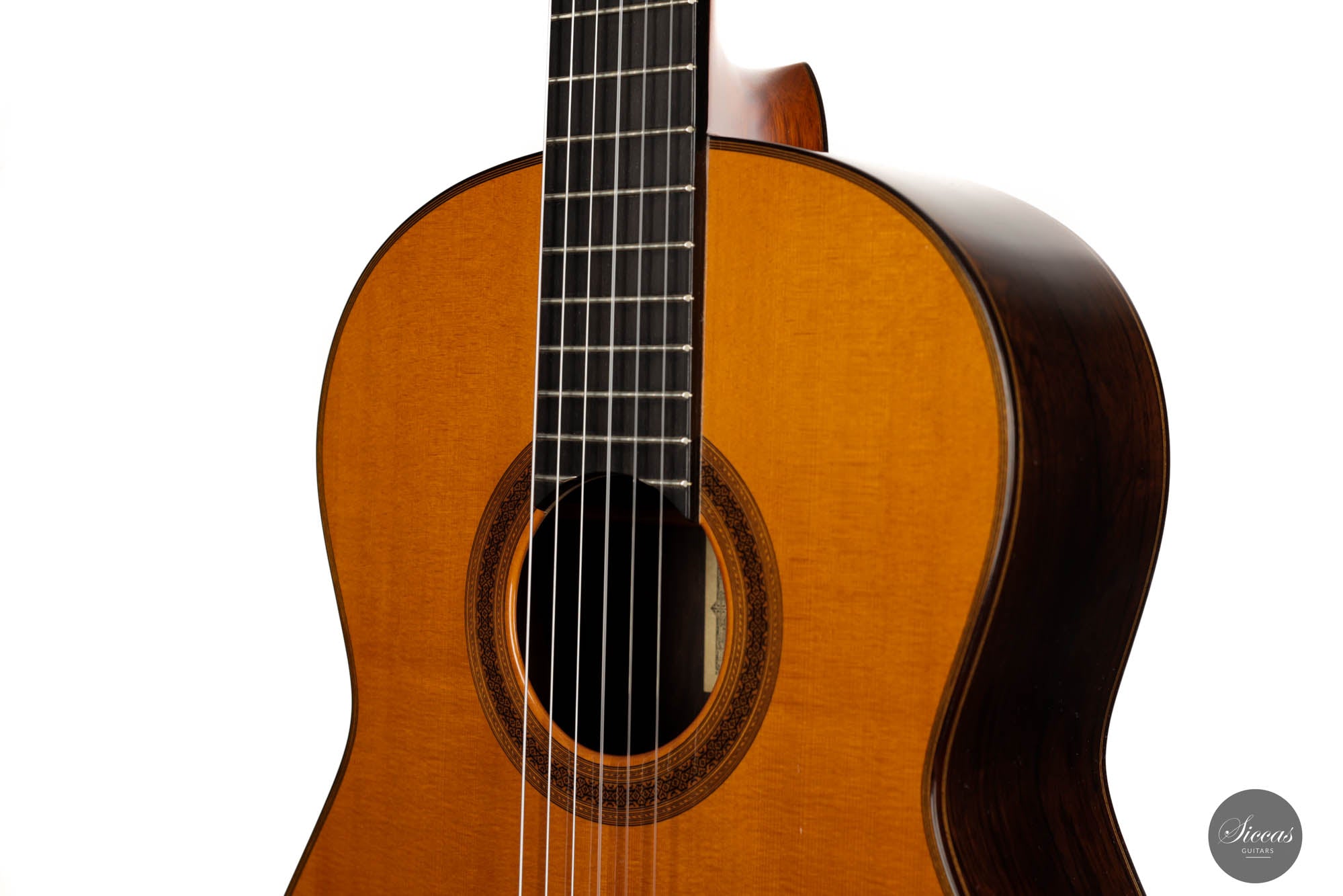 Introducing the exquisite 1984 Paulino Bernabe guitar, a true testament to the mastery of the renowned luthier, Paulino Bernabé Sr. Crafted during a time when Bernabé Sr. worked independently in his workshop, this guitar is both an extraordinary musical instrument and an intriguing work of art. In good condition despite some playing marks on the top, this guitar bears the signs of being a well-loved and cherished instrument. The back and sides are constructed from stunning Brazilian rosewood, CITES certified, and showcase an intricate pattern of parallel orange-black veins that add to its visual appeal. While there is one glued crack on the back and another on the side, both have been stabilized and do not detract from the instrument's remarkable sound quality. As a prime example of the Madrid guitar-making school, this 1984 Paulino Bernabe guitar boasts a powerful and distinct character. Its romantic trebles harmoniously blend with the dark and haunting basses, creating a captivating and unforgettable auditory experience. This exceptional guitar is an embodiment of fine craftsmanship, tradition, and the passion of its creator.