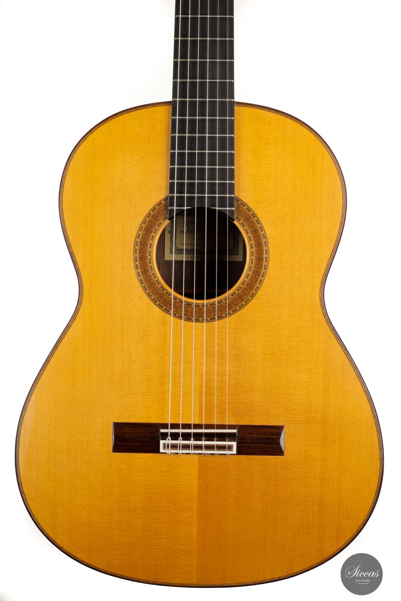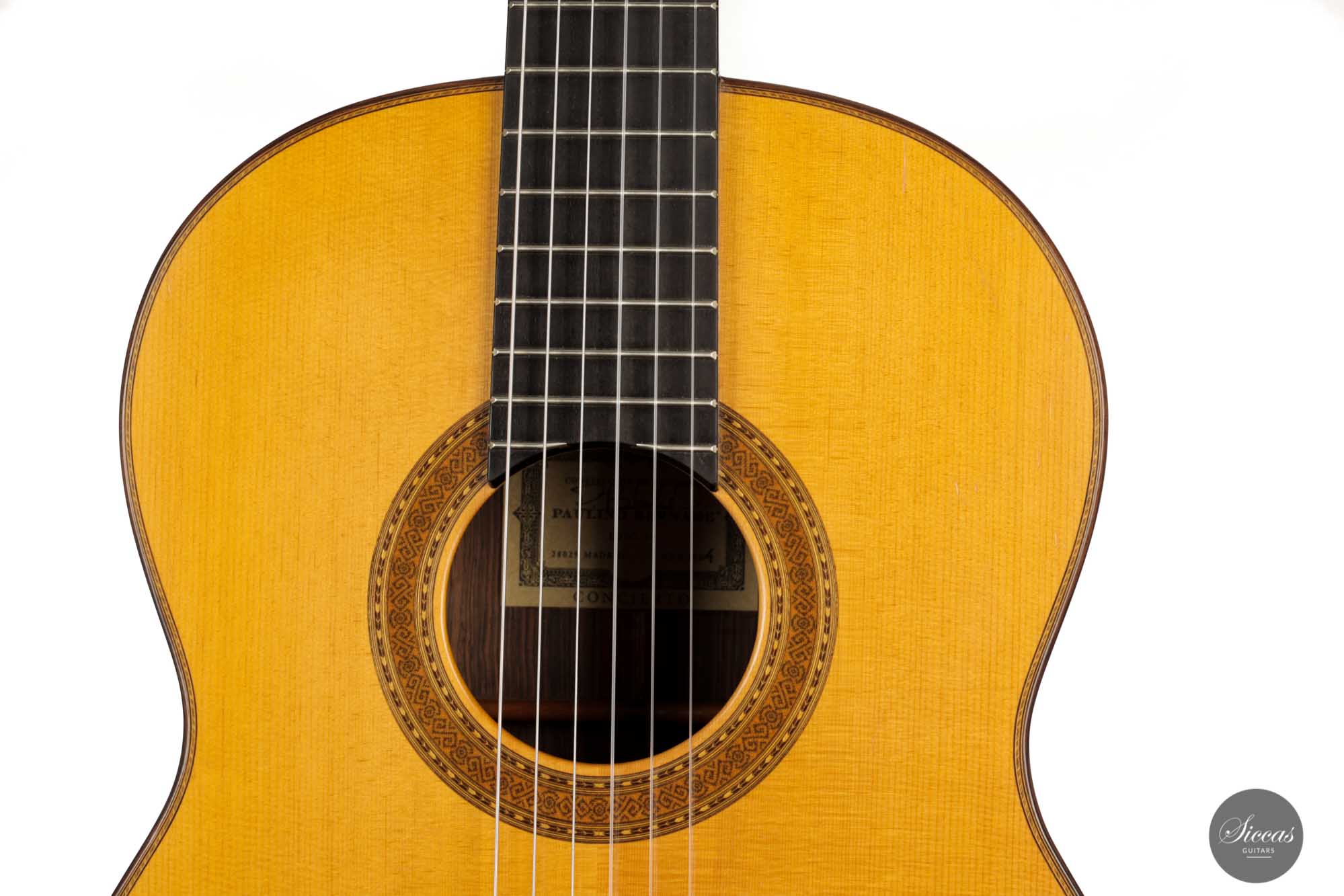 This wonderful 2004 Paulino Bernabé Sr. Concierto model is a great example of a very well maintained and matured guitar with spruce top. Besides its very attractive appearance with the honey-colored soundboard, its tone is also very developed, open, and full of resonance. A homogeneous, rich, and projecting voice is inherent in this guitar. Its condition is also very good, showing only superficial signs of playing and no cracks or repairs. Such well-preserved Paulino Bernabé Sr. guitars are rare, especially from the end of his career, and this example, hand-signed by the maestro on the label, is a real gem.