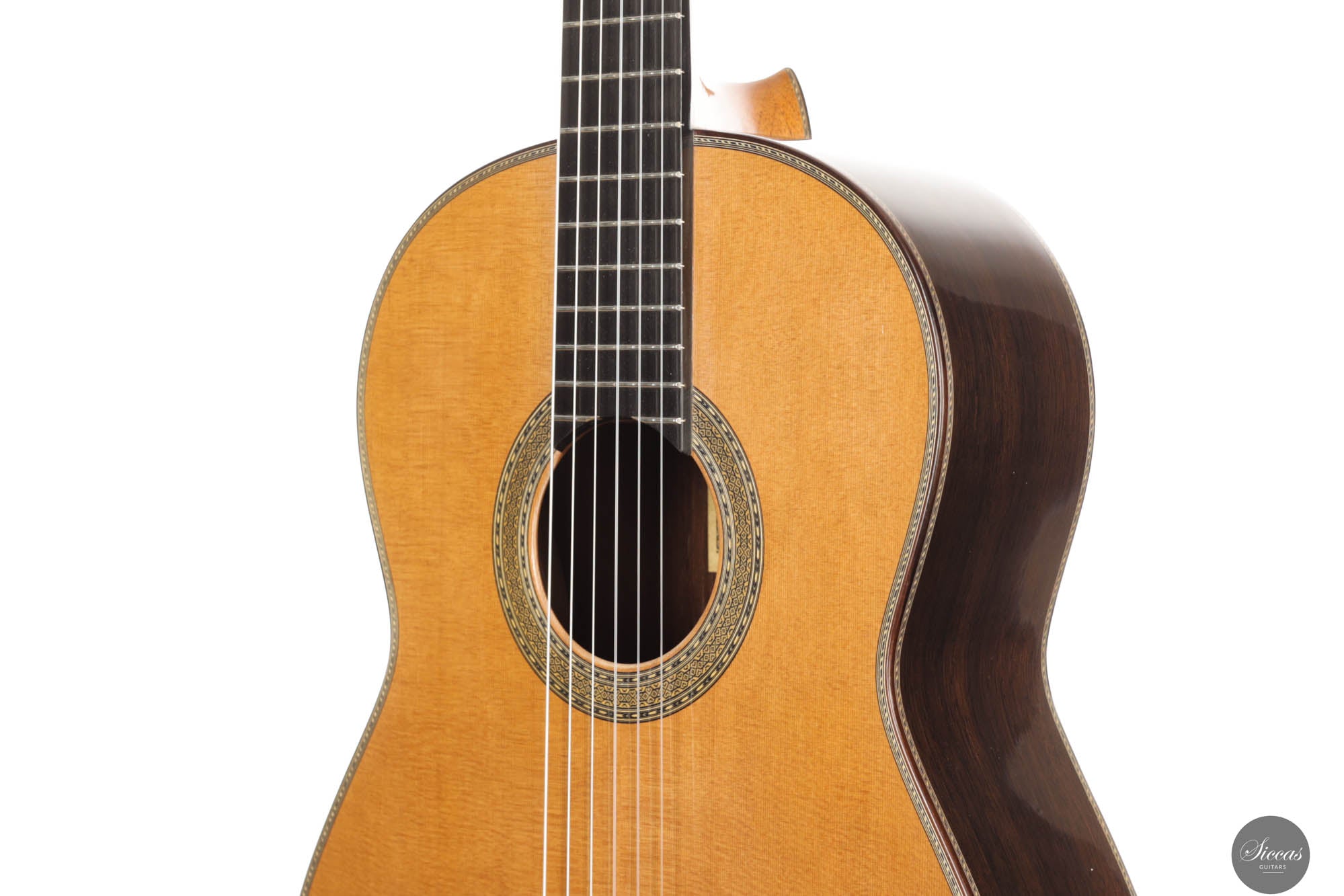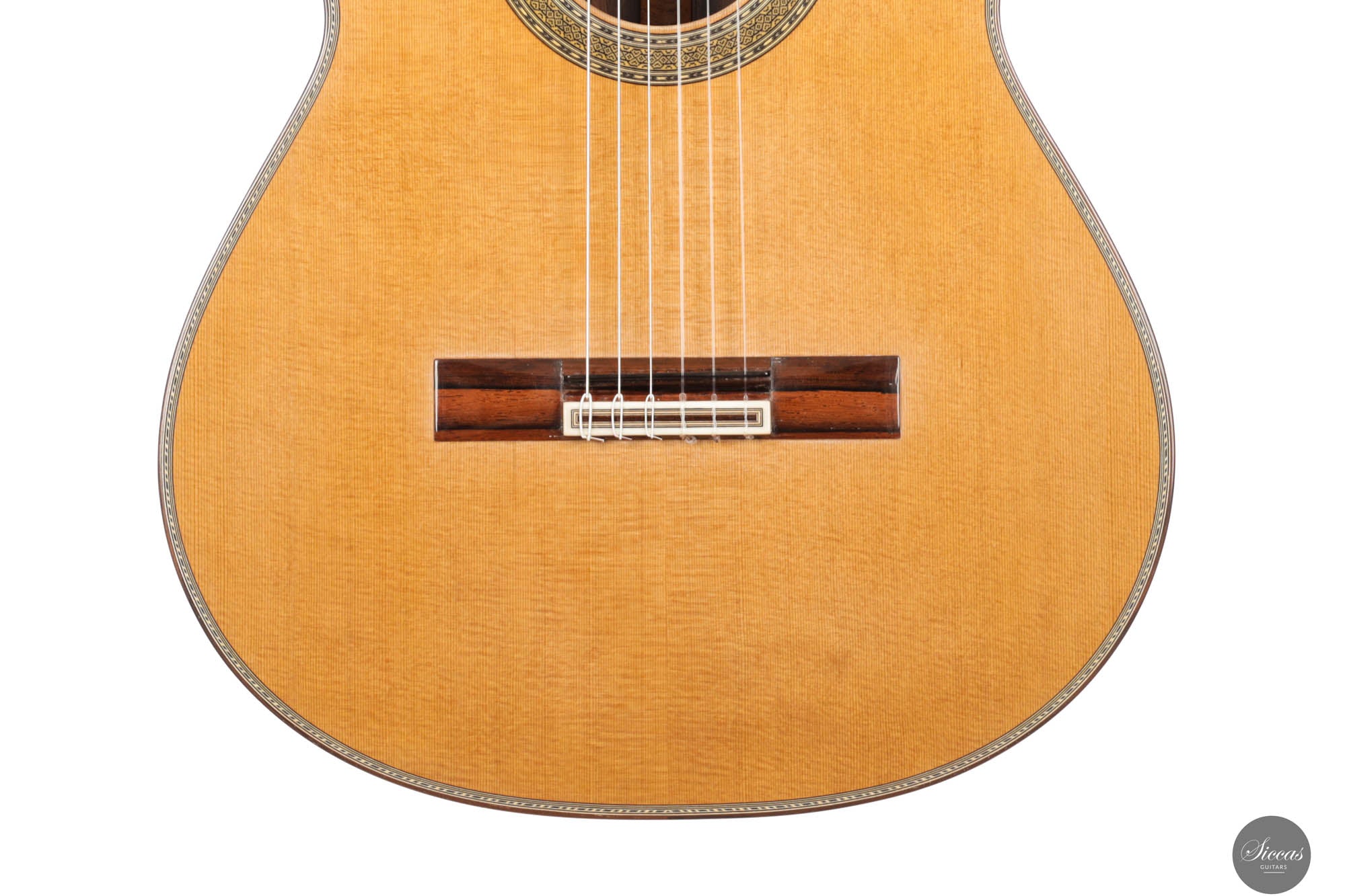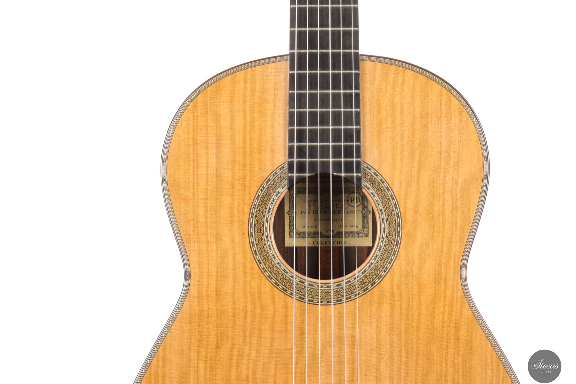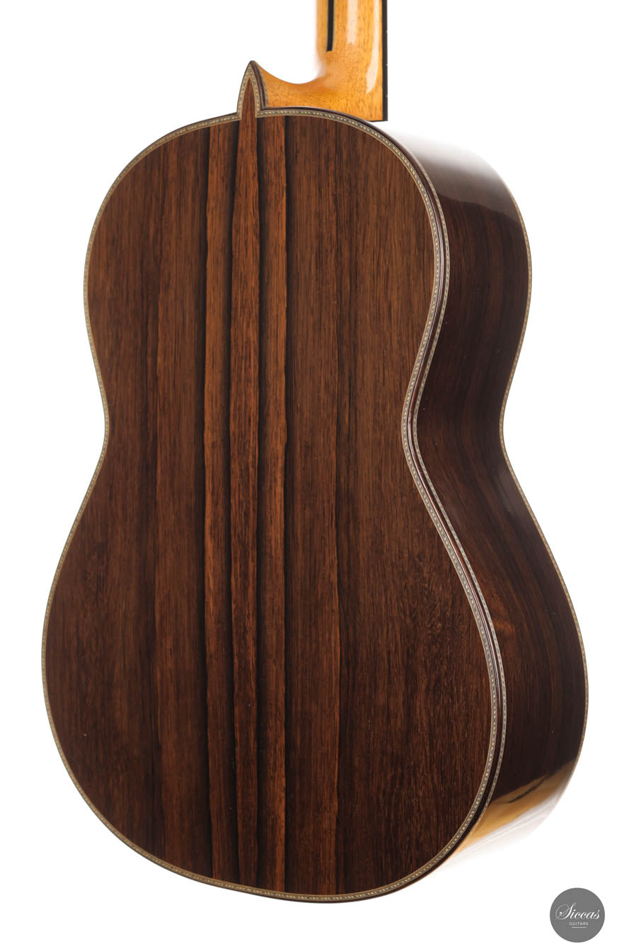 This Colección is a new beautiful, and unique model by Paulino Bernabé Jr. Only a handful of these limited-edition guitars will be built, using Paulino’s best and rarest wood stock, combining his decades of experience and fantastic craftsmanship skills. Each of the guitars in the Colección series is unique, and we are delighted to present the number 8, built in 2023. This guitar features a stunning Madagascar rosewood back and sides with fabulous patterns. It is an absolute dream to look at and the dark, reddish cedar top not only gives this guitar an outstanding artful appearance, but also complements its highly responsive and well-projected tone. The guitar is in excellent condition with very minimal playing wear and displaying a common small string mark behind the bridge. The basses are deep and dark, while the trebles are live and bright. As a modern Spanish guitar, it fulfils all the requirements of a fine concert instrument, such as a great sound volume and easy playability.