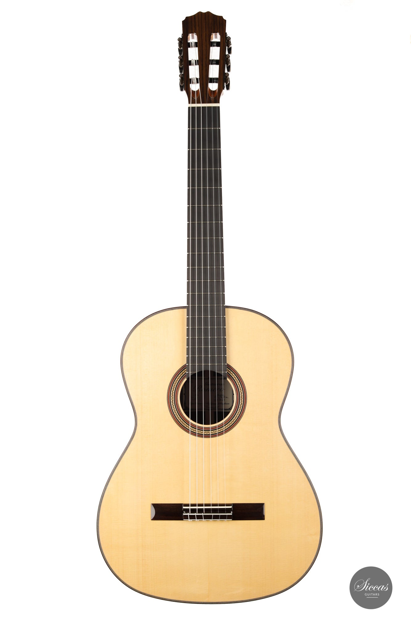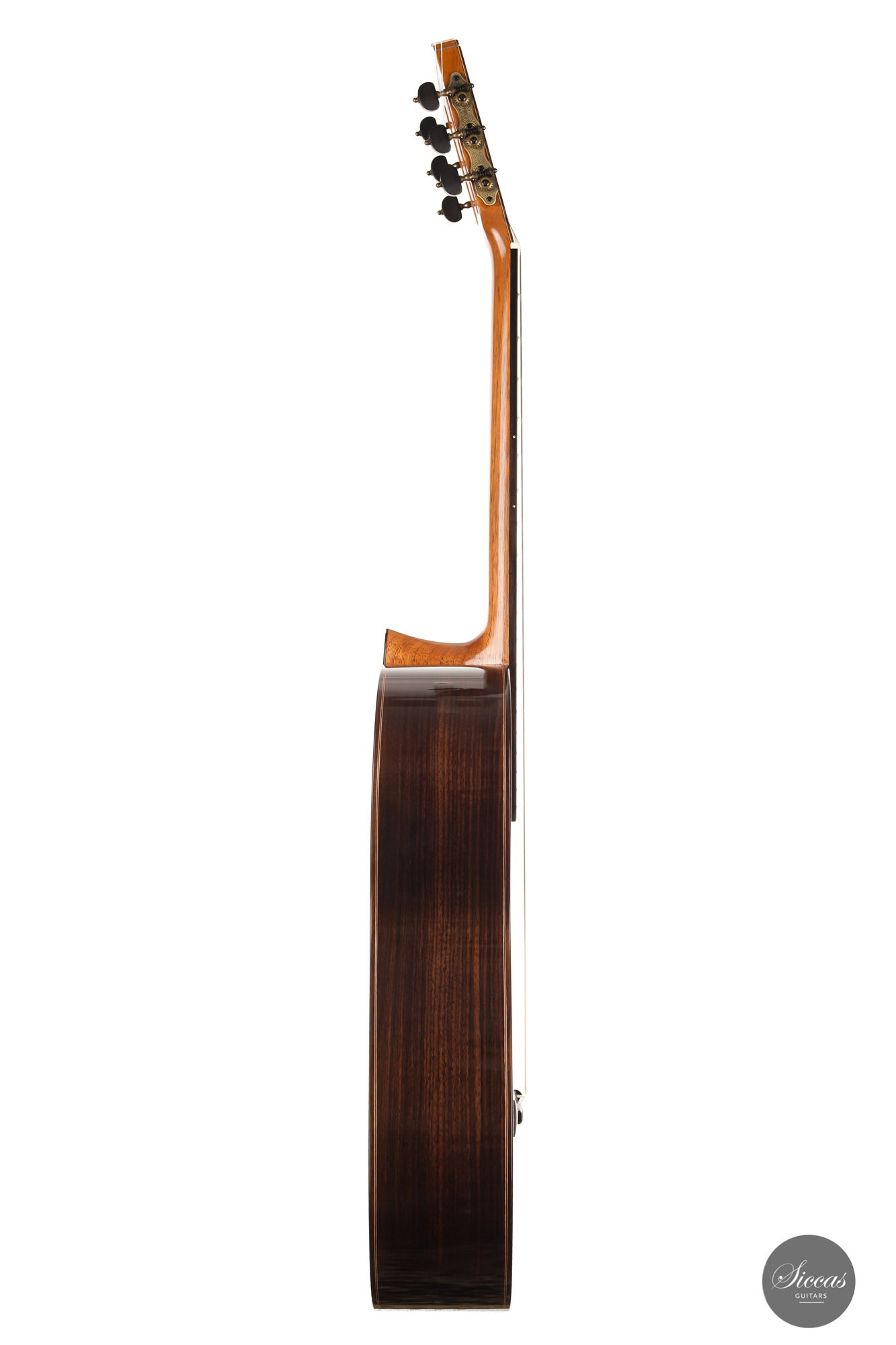 The España model is a traditional Spanish design inspired by the renowned guitars of Miguel Rodriguez, Santos Hernandez and Romero's own custom builds. These guitars have tremendous power, sustain, and clarity. They are available with premium German spruce or Western red cedar tops and have traditional five-fan bracing. Interestingly, the bracing is fine-tuned with two V-shaped braces and a crossbar to favor treble resonance.