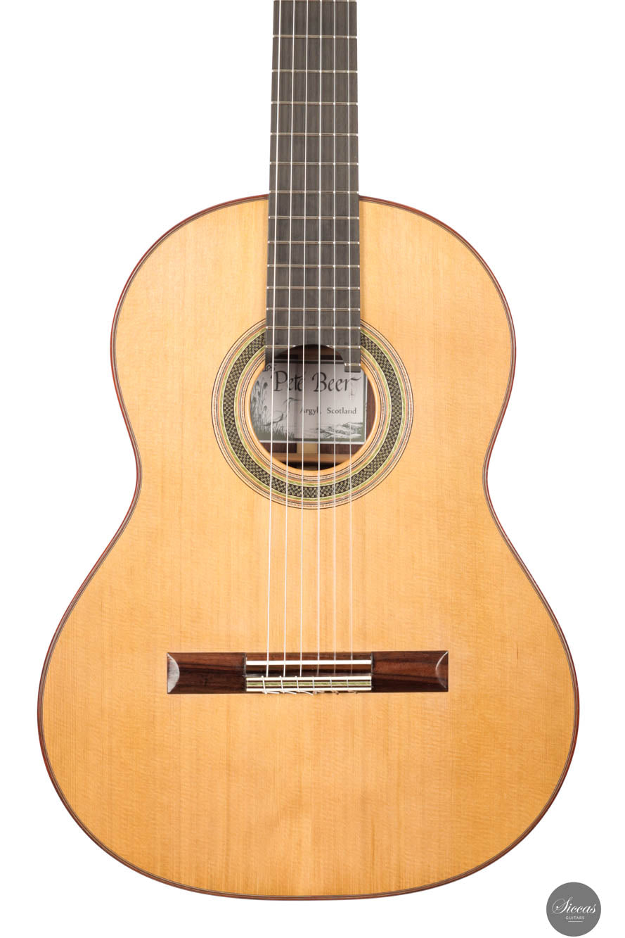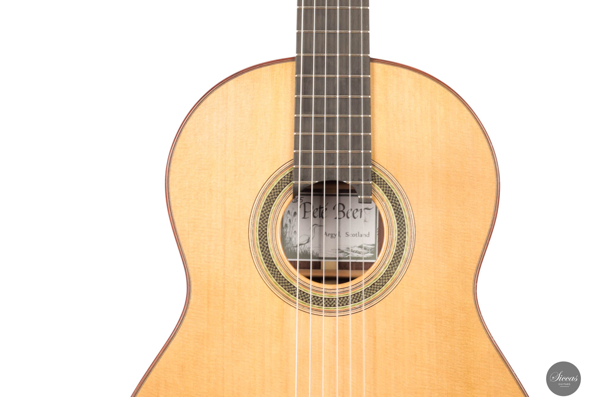 Pete Beer is a distinguished guitar maker and educator based in Argyll, Scotland, who began his luthiery journey in 2001 at Clyde College, Glasgow, where he now imparts his expertise part-time. Crafting guitars from his workshop, Beer is dedicated to producing instruments that excel in musicality, offering a rich palette of tonal colors and dynamic expressions. His designs are notably influenced by Daniel Freiderich, incorporating unique features like doubled sides and a specific top thickness pattern for enhanced volume and projection. Beer’s Concert model is renowned for its powerful sound and extensive headroom, characterized by a soundboard with asymmetric bracing and a continuous neck design that extends to the soundhole, ensuring robust support for the upper frets. Committed to playability, Beer equips his guitars with features like a double action titanium truss rod and offers customizable saddle heights, making his instruments not only sonorous but also exceptionally player-friendly.