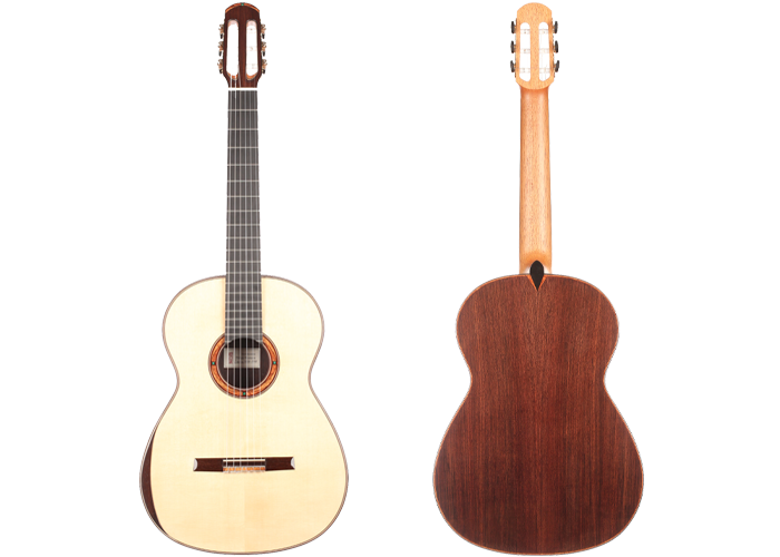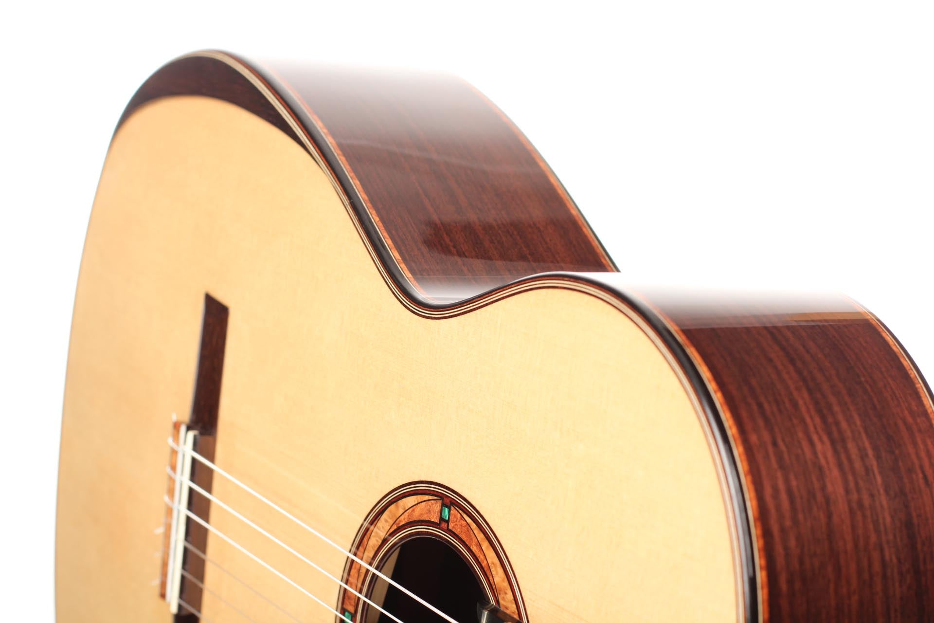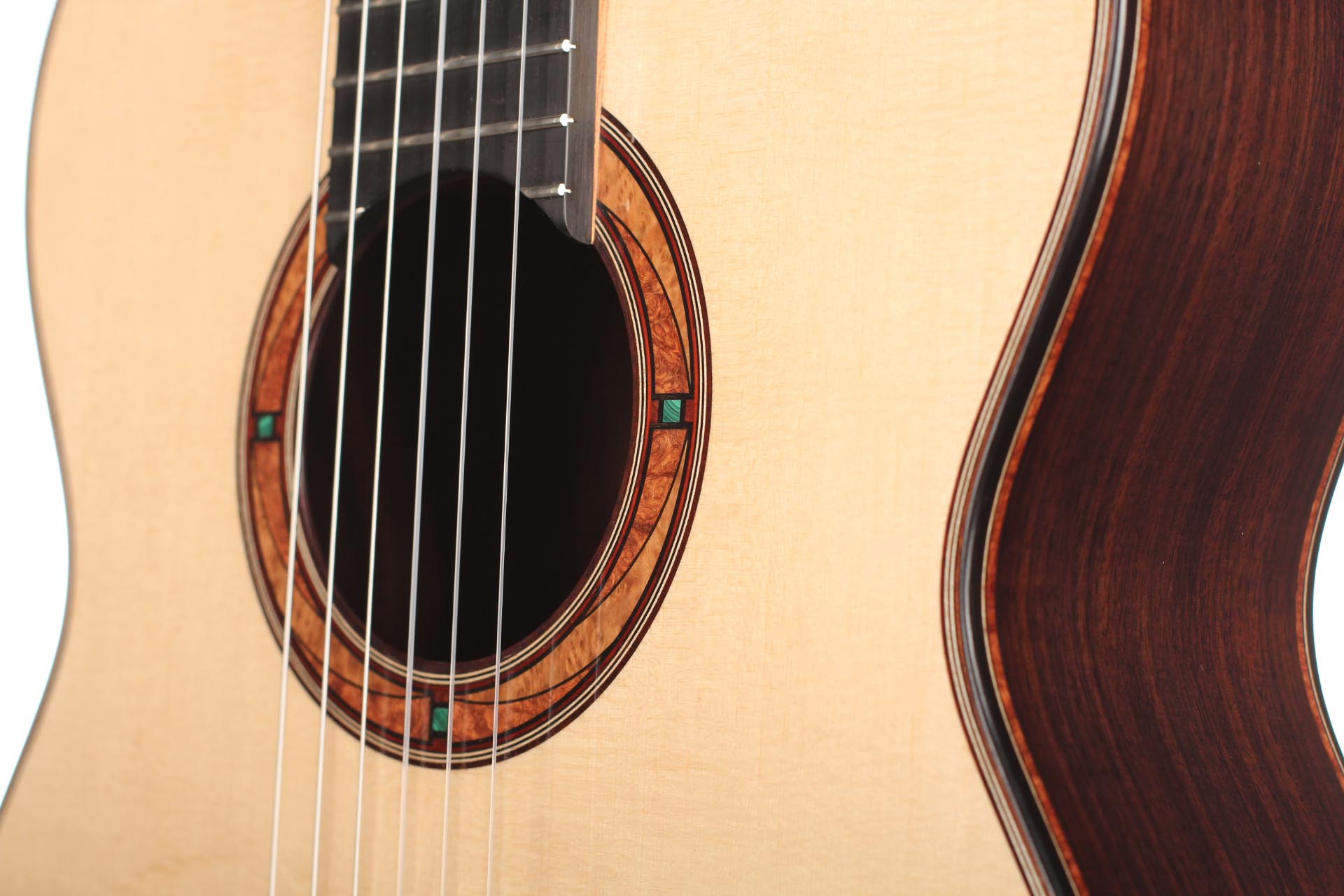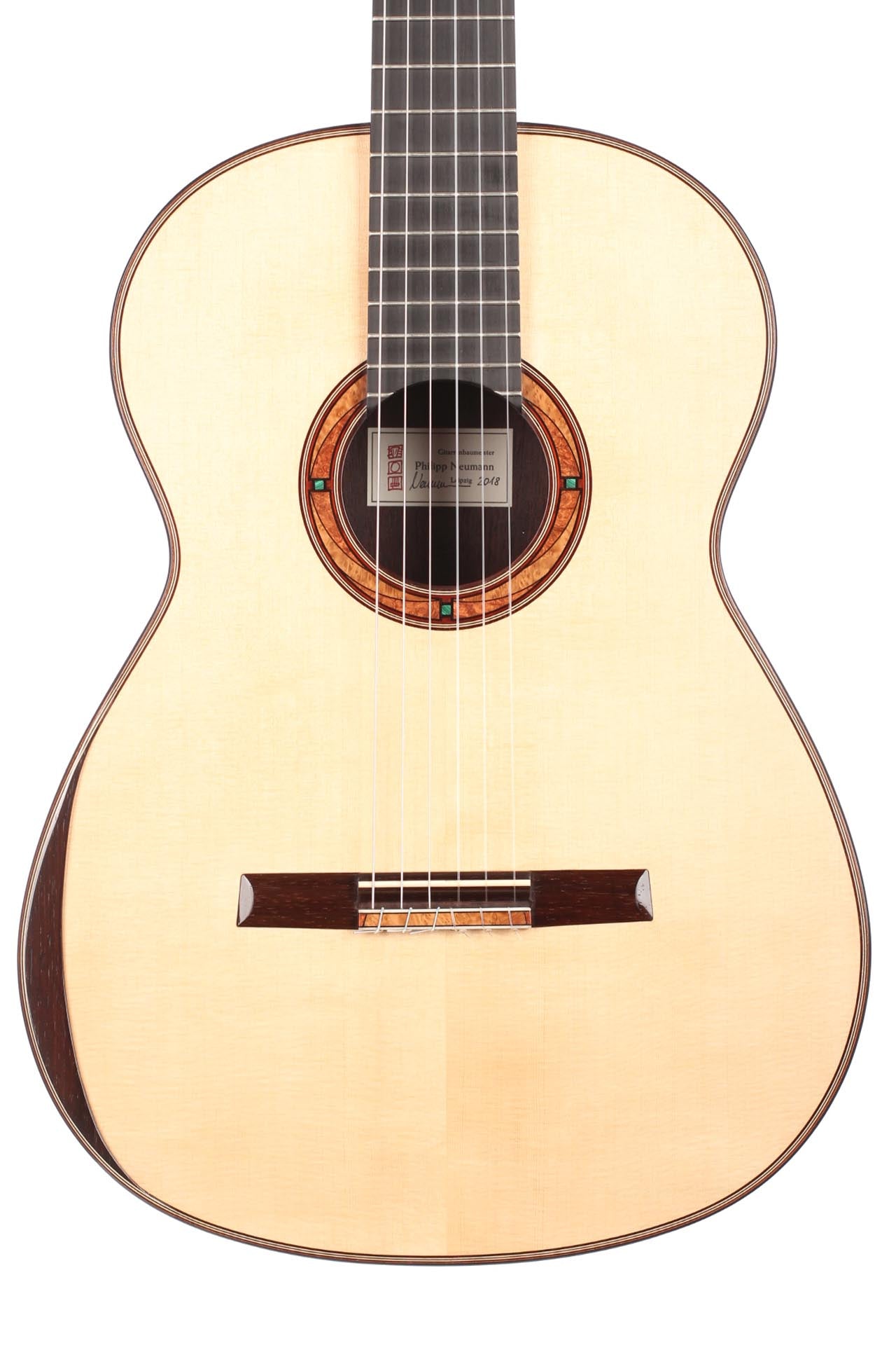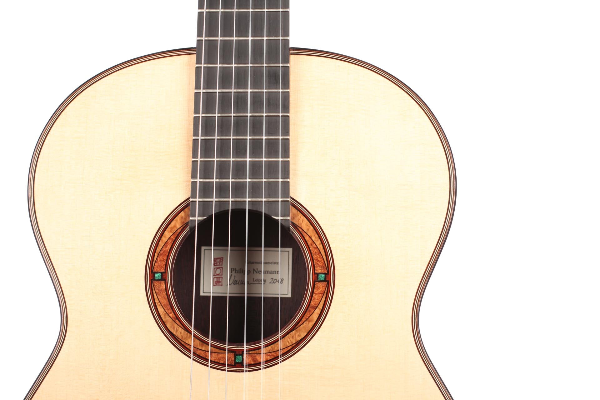 This new 2018 Philipp Neumann guitar already has an incredible openness. Its sound is enveloping the guitarist to give an immediate playing satisfaction and projecting clearly giving to this guitar all the attributes of a great concert instrument. The very fine wooden and precious stones inlays on the rosette and head-plate enhances the attractiveness of the instrument and highlight the delicate spruce top and Indian rosewood back and sides. It is great concert guitar combining a striking craftmanship and an admirable playability and tone quality. The tuners are made by Sloane. Delivered with a Artonus case.