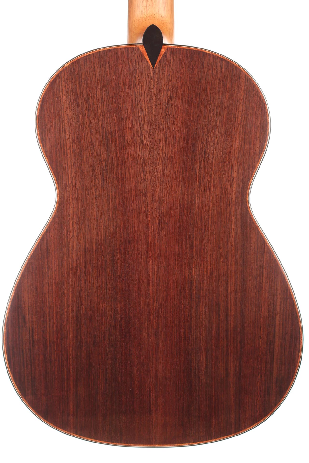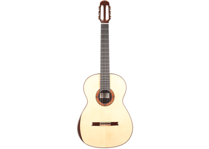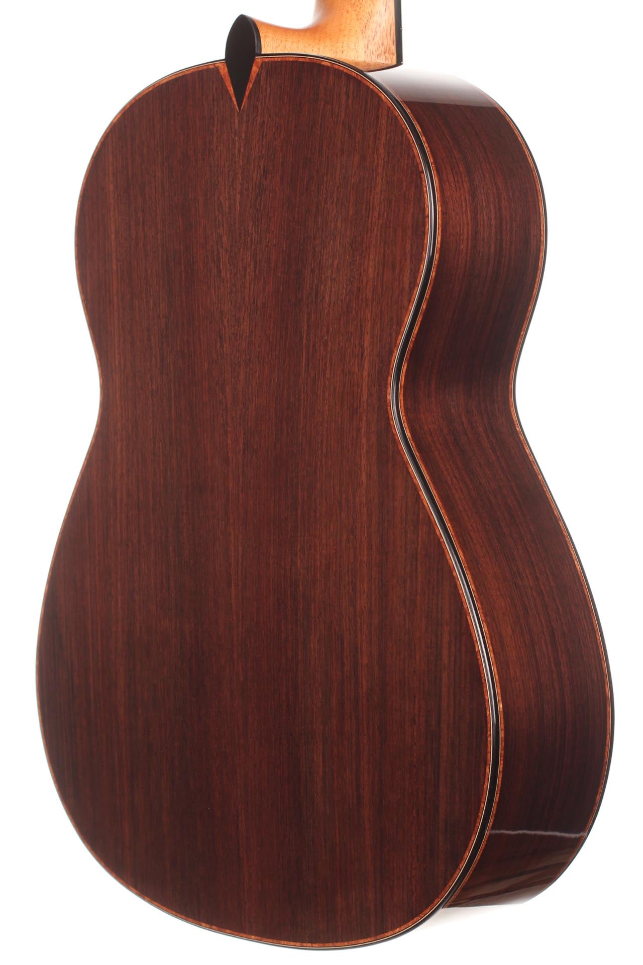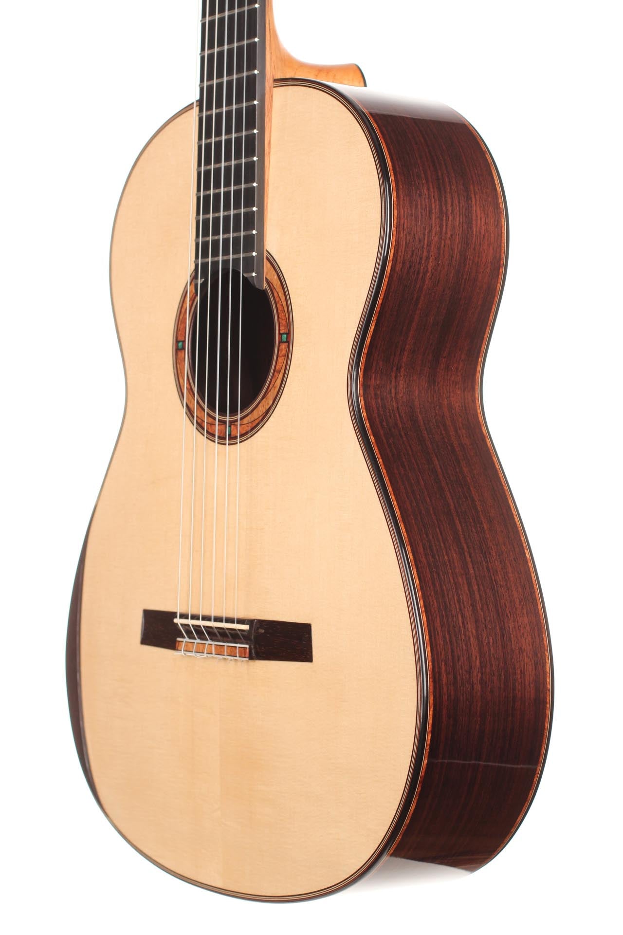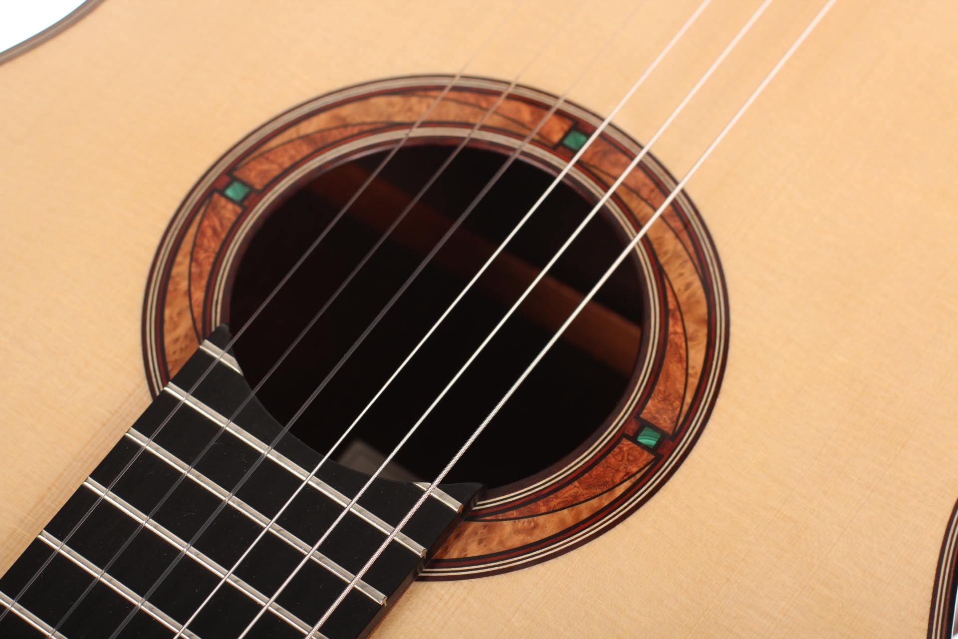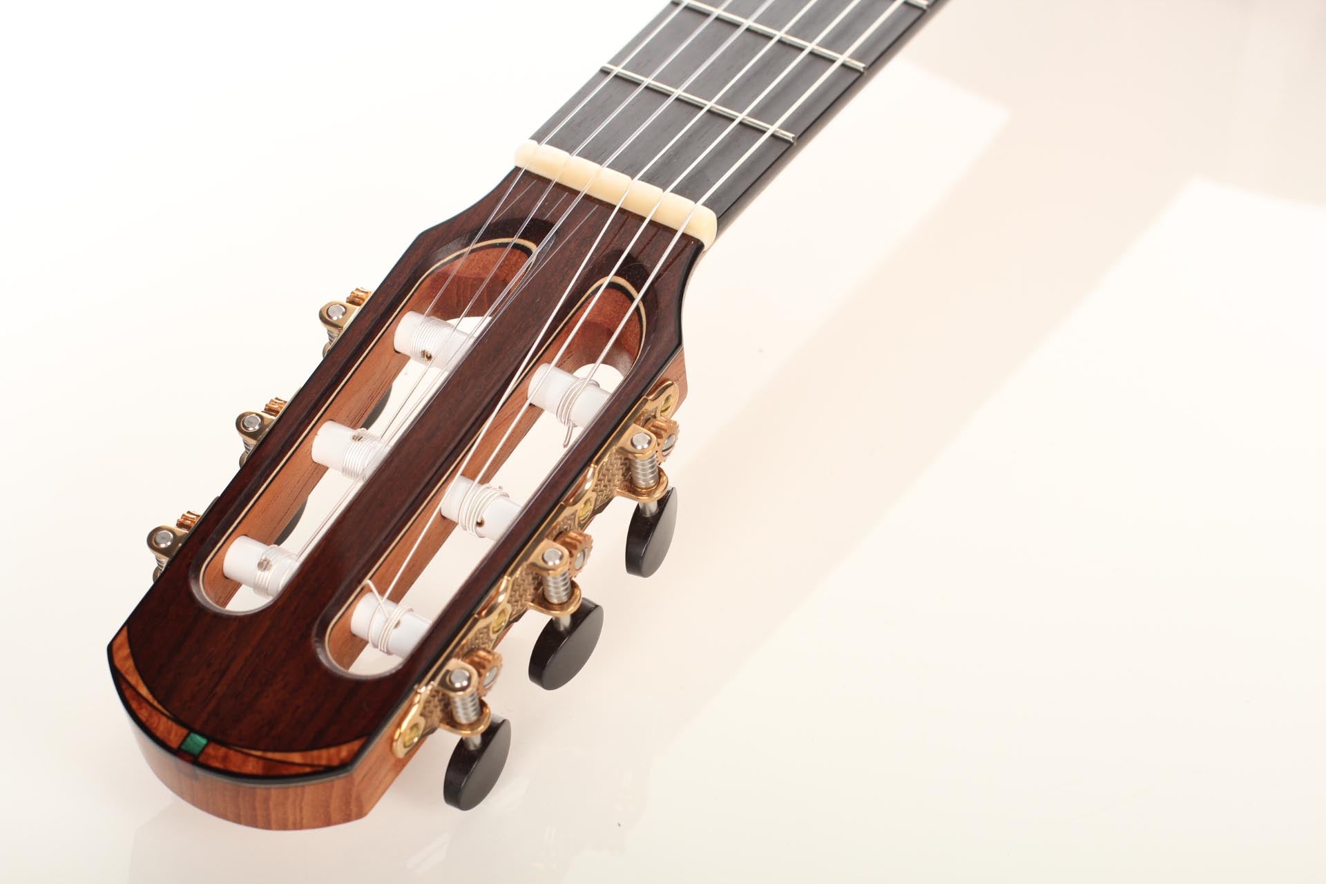 This new 2018 Philipp Neumann guitar already has an incredible openness. Its sound is enveloping the guitarist to give an immediate playing satisfaction and projecting clearly giving to this guitar all the attributes of a great concert instrument. The very fine wooden and precious stones inlays on the rosette and head-plate enhances the attractiveness of the instrument and highlight the delicate spruce top and Indian rosewood back and sides. It is great concert guitar combining a striking craftmanship and an admirable playability and tone quality. The tuners are made by Sloane. Delivered with a Artonus case.