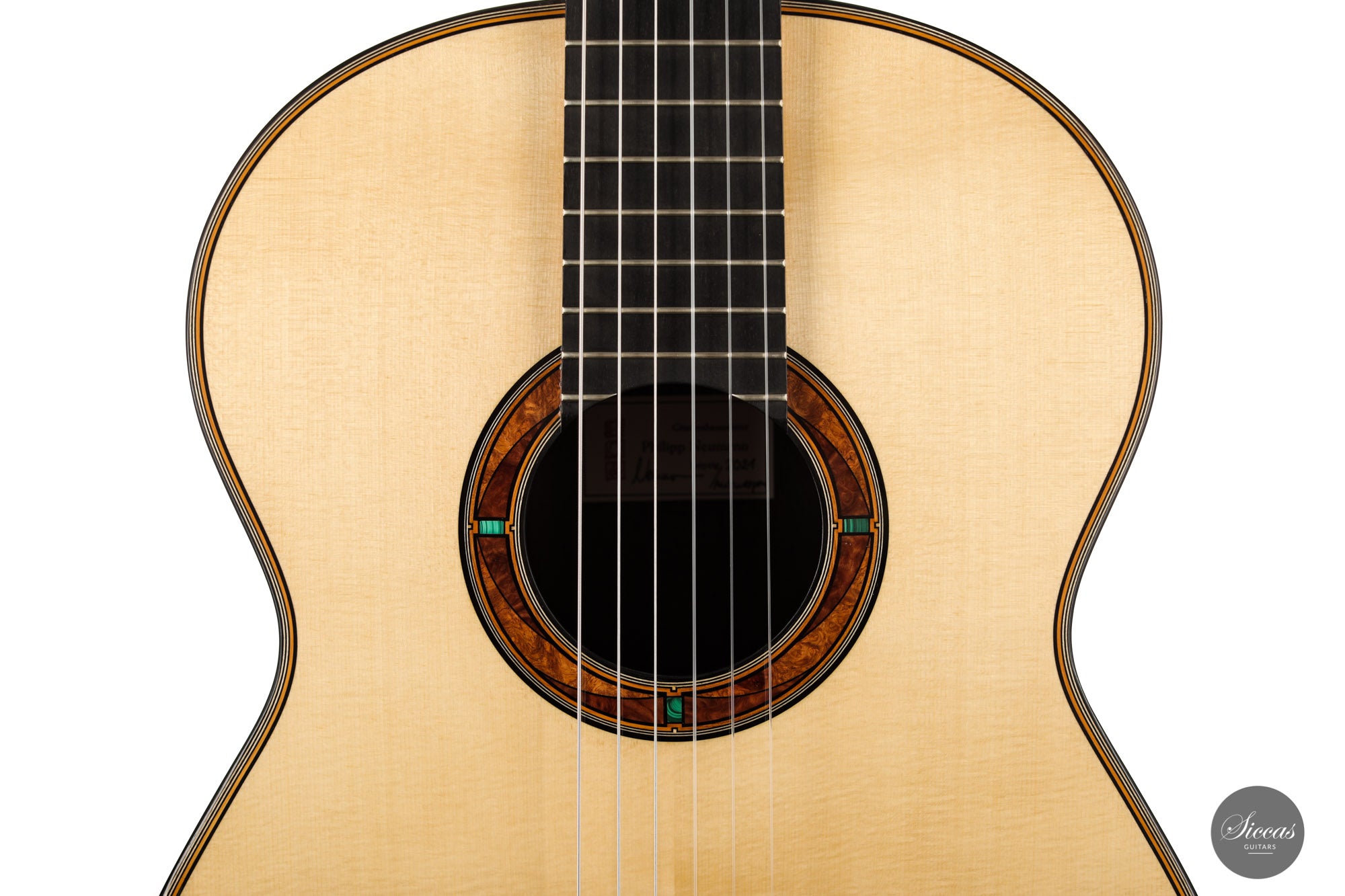 This wonderful guitar has a unique design that allures the guitarist to take an extra look before starting to play. Fine details surrounds the entire build with intricate inlay patterns and exquisite rosette details. The sound is big and bold, dense robust trebles paired with deep basses with plenty of sustain. Because it is a 64 cm scale guitar it is very comfortable to play on, that one centimeter makes long stretches a fair amount easier. Philipp is a talented luthier that incorporates different approaches to make a work of art that also is a true concert guitar.