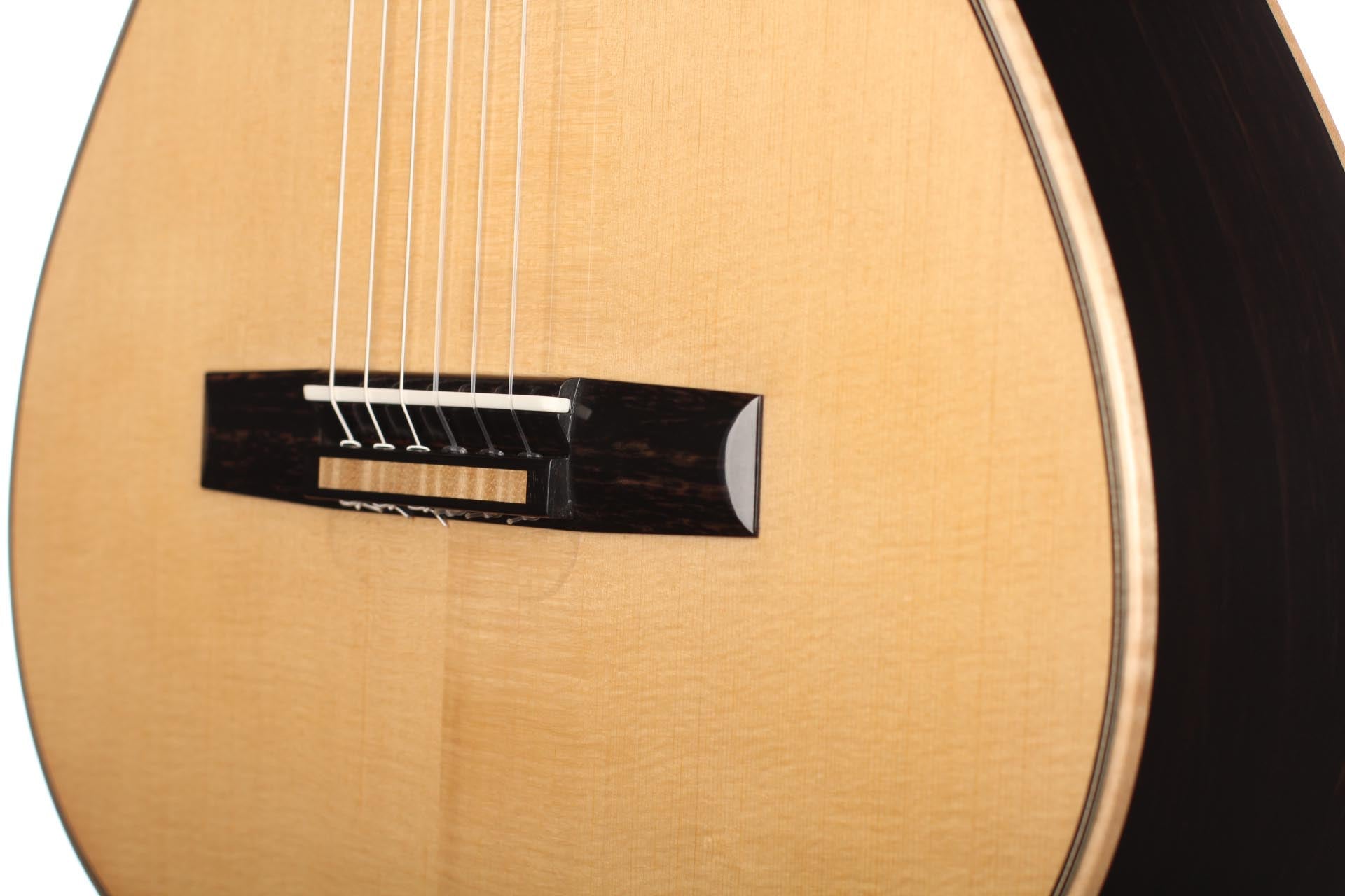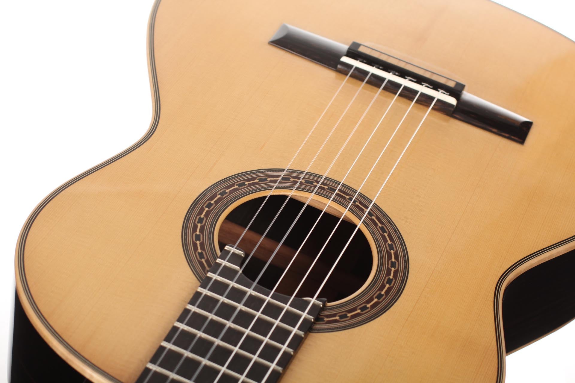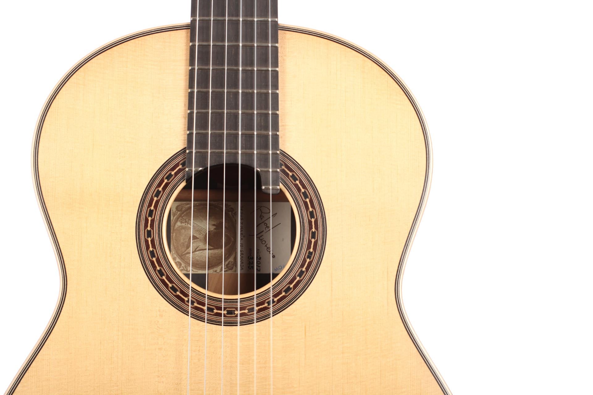 This instrument has a warm and full sound, allowing tragic dynamics and incredibly rich pianos. The guitar is very well balanced and the quality on the tone is constant all along the neck. From bass to treble, it is a generous guitar with plentiful of possibilities and a strong personality. All French-polished. A softcase case is included. This guitar is Cites free (CF).