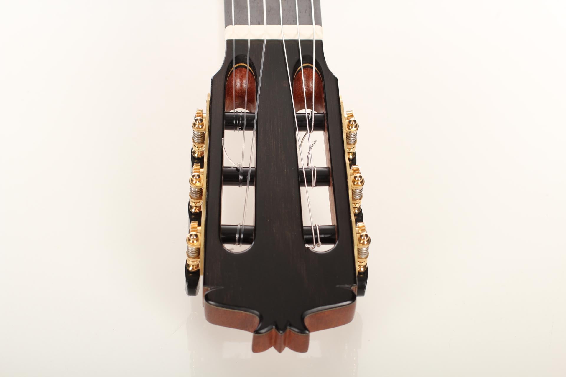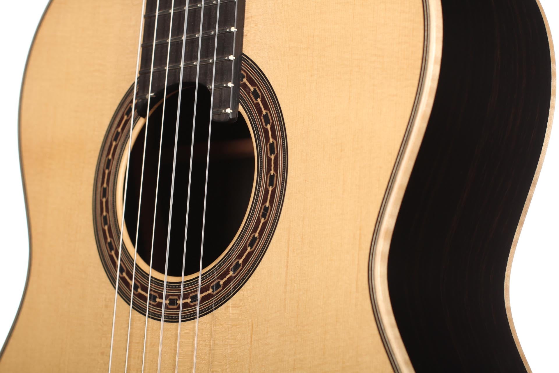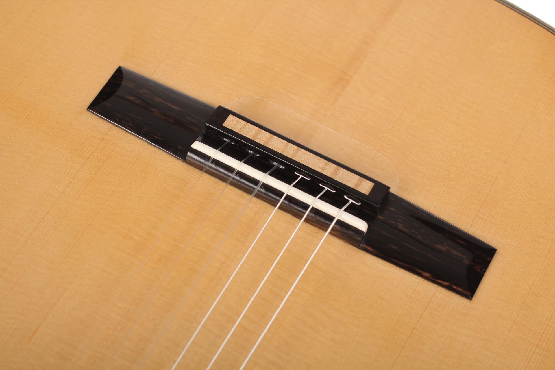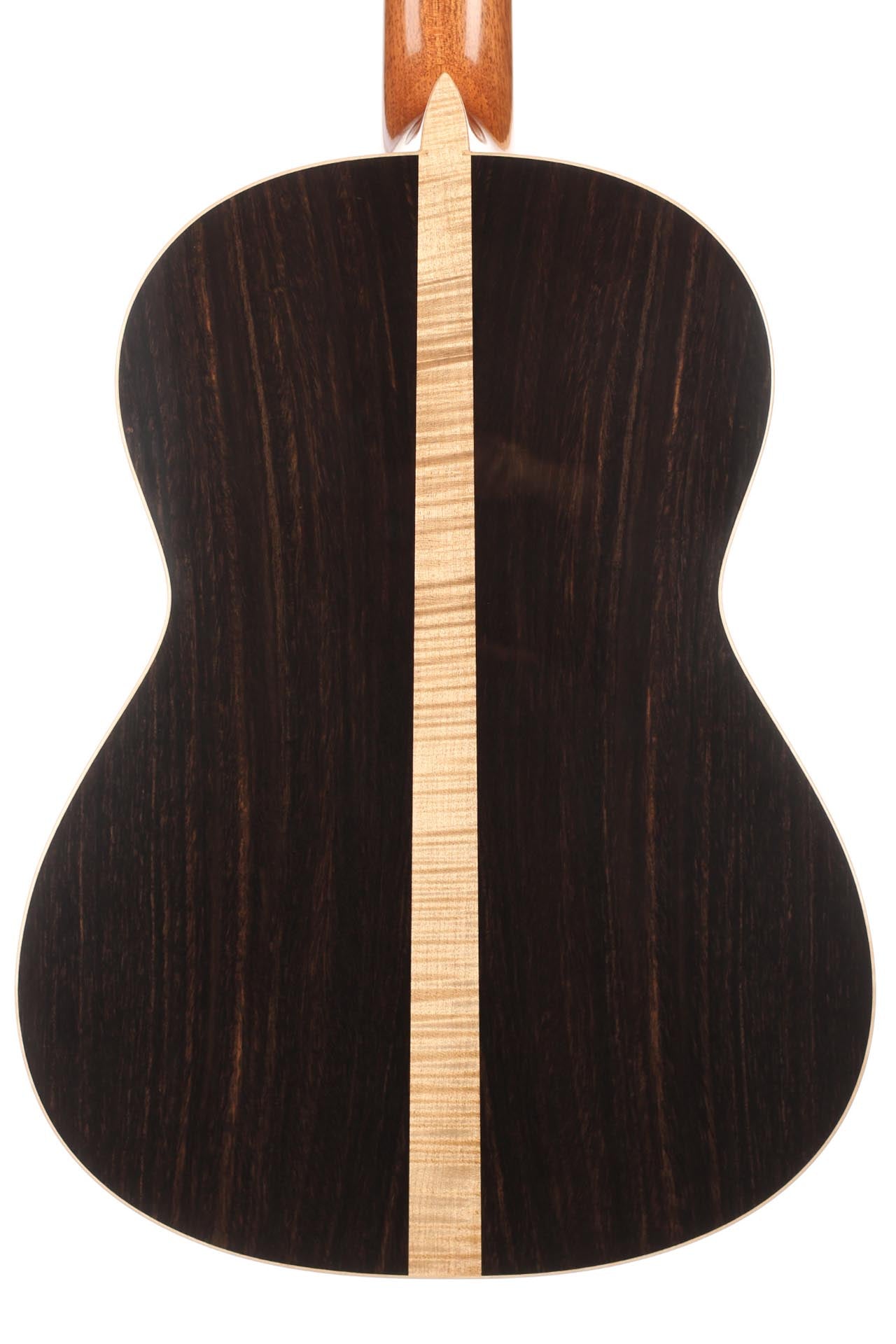 This instrument has a warm and full sound, allowing tragic dynamics and incredibly rich pianos. The guitar is very well balanced and the quality on the tone is constant all along the neck. From bass to treble, it is a generous guitar with plentiful of possibilities and a strong personality. All French-polished. A softcase case is included. This guitar is Cites free (CF).
