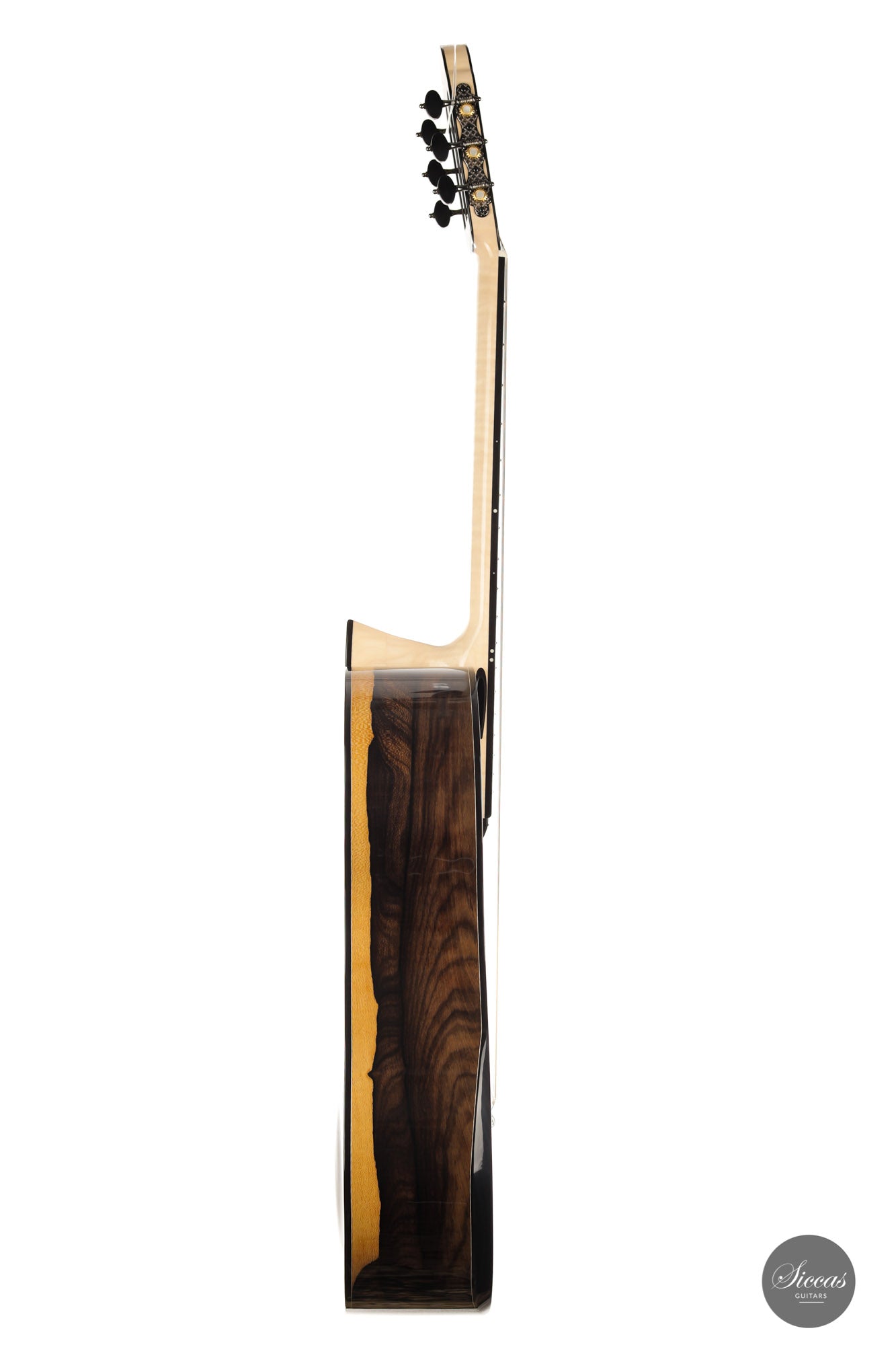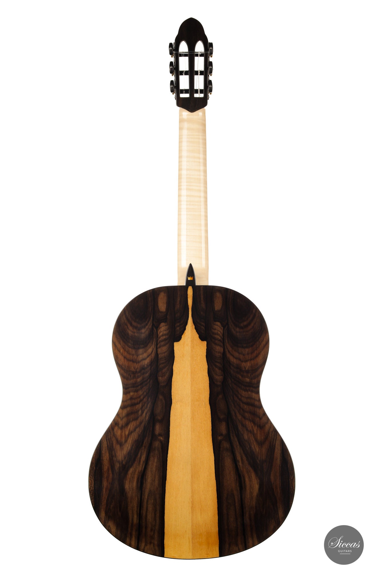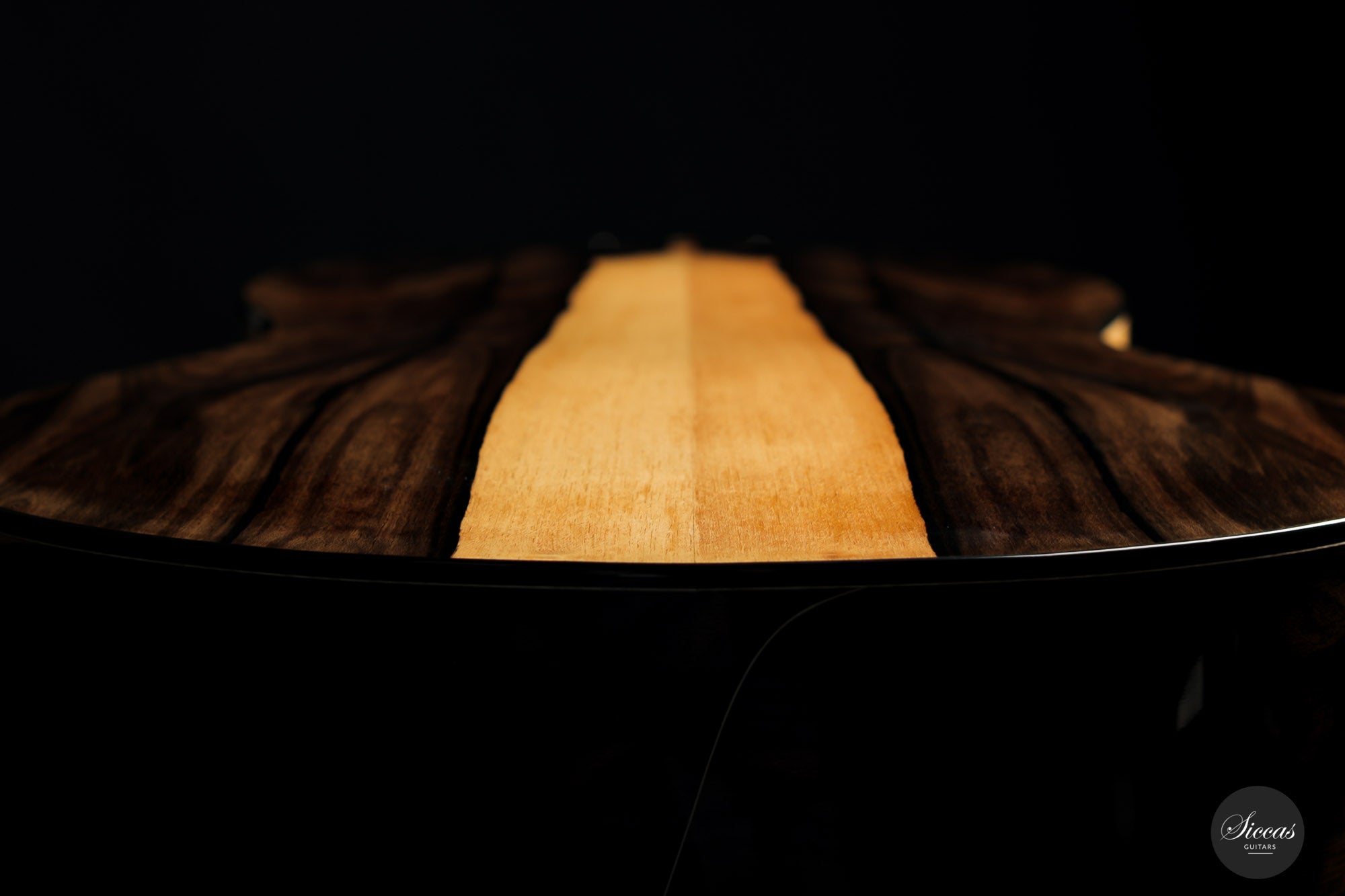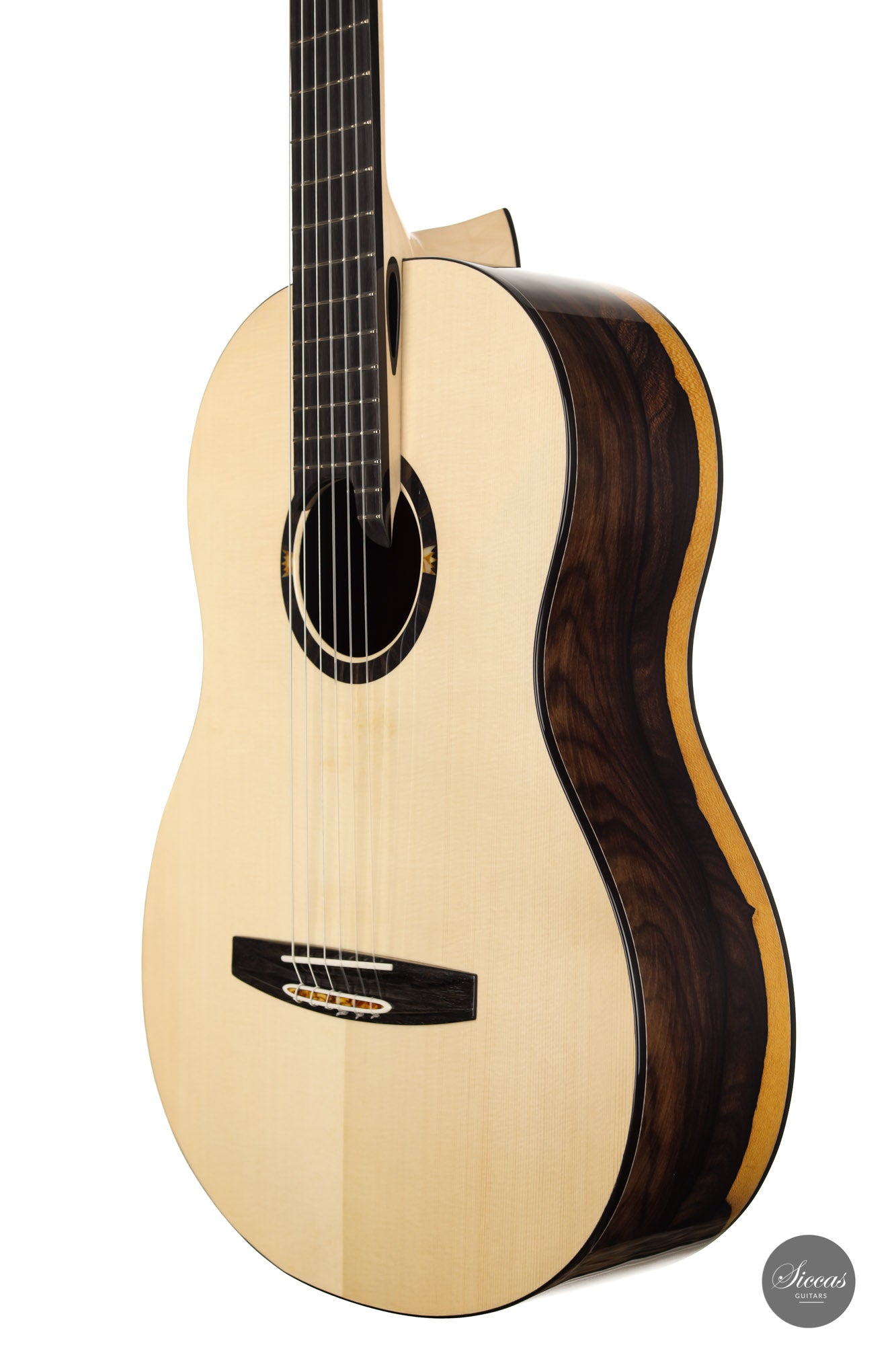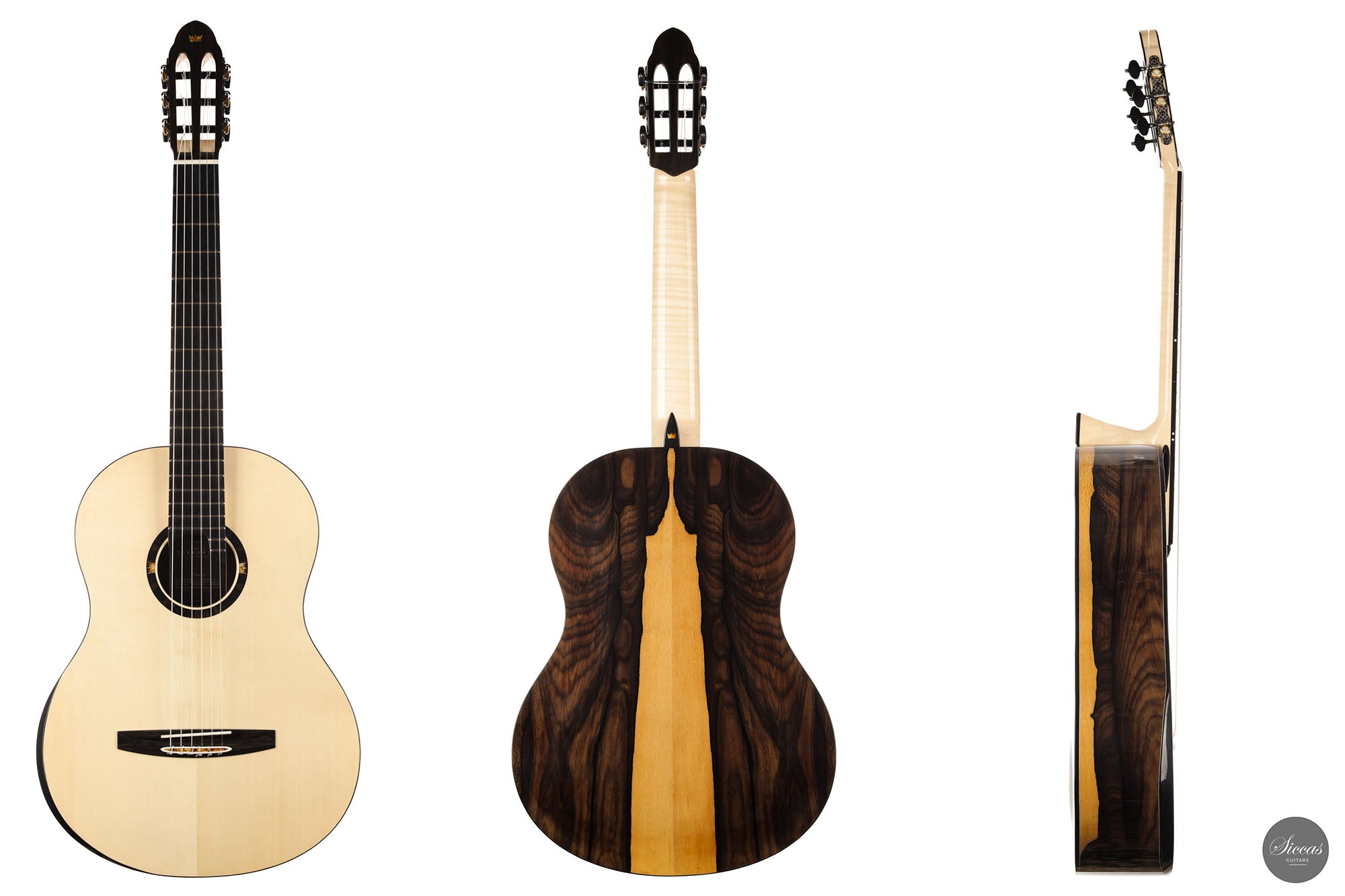 This wonderful instrument is really one of a kind. With a mesmerizing arched back made of Ziricote, giving center stage a wide light sapwood part in the middle, it really has a unique look. The spruce top has an outermost light lattice bracing reinforced with carbon fibre to give great responsiveness and lightness. Of course, this instrument features the famous “Acoustic tube” inside the neck, to give the latter a greater role in the overall resonance of the guitar.