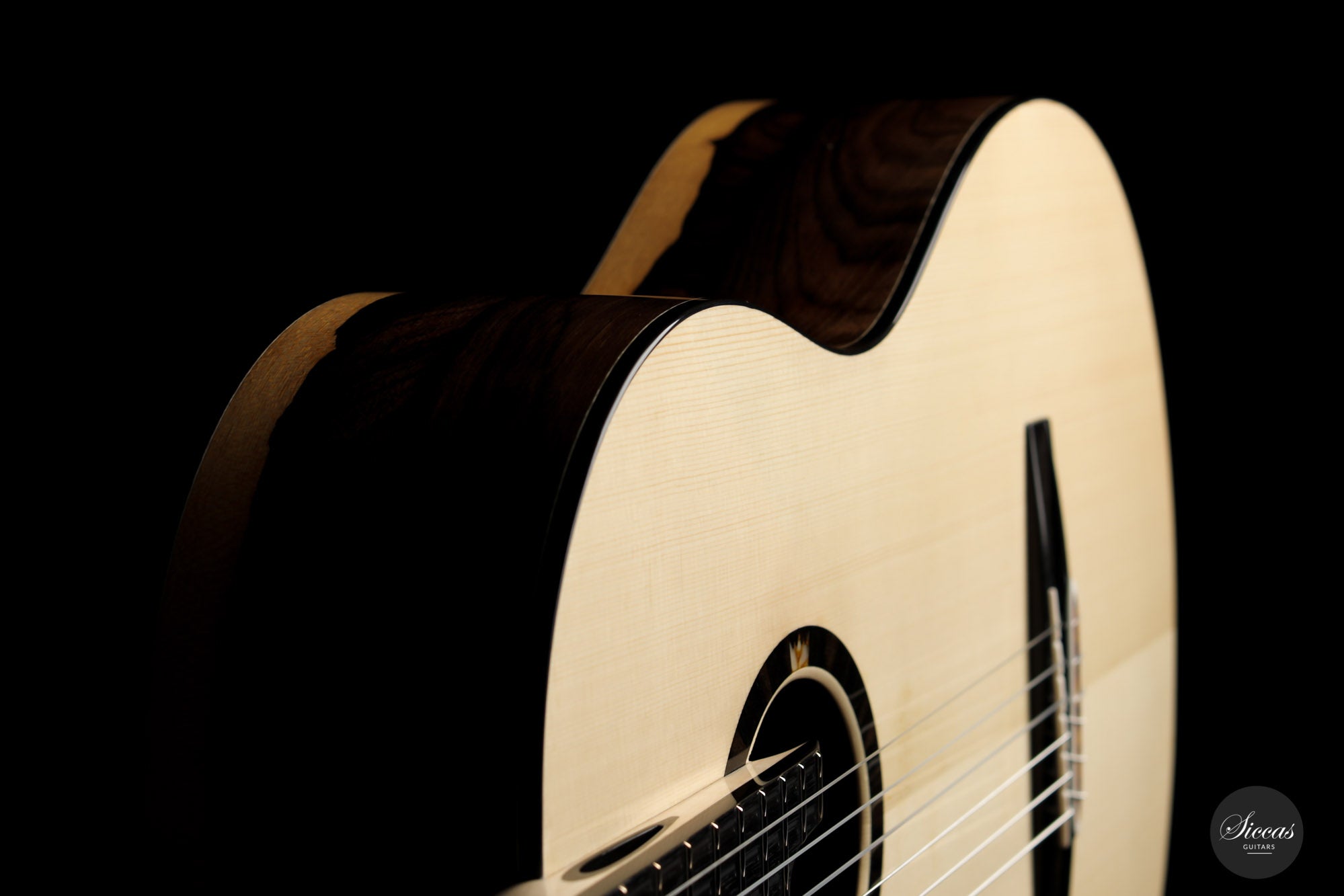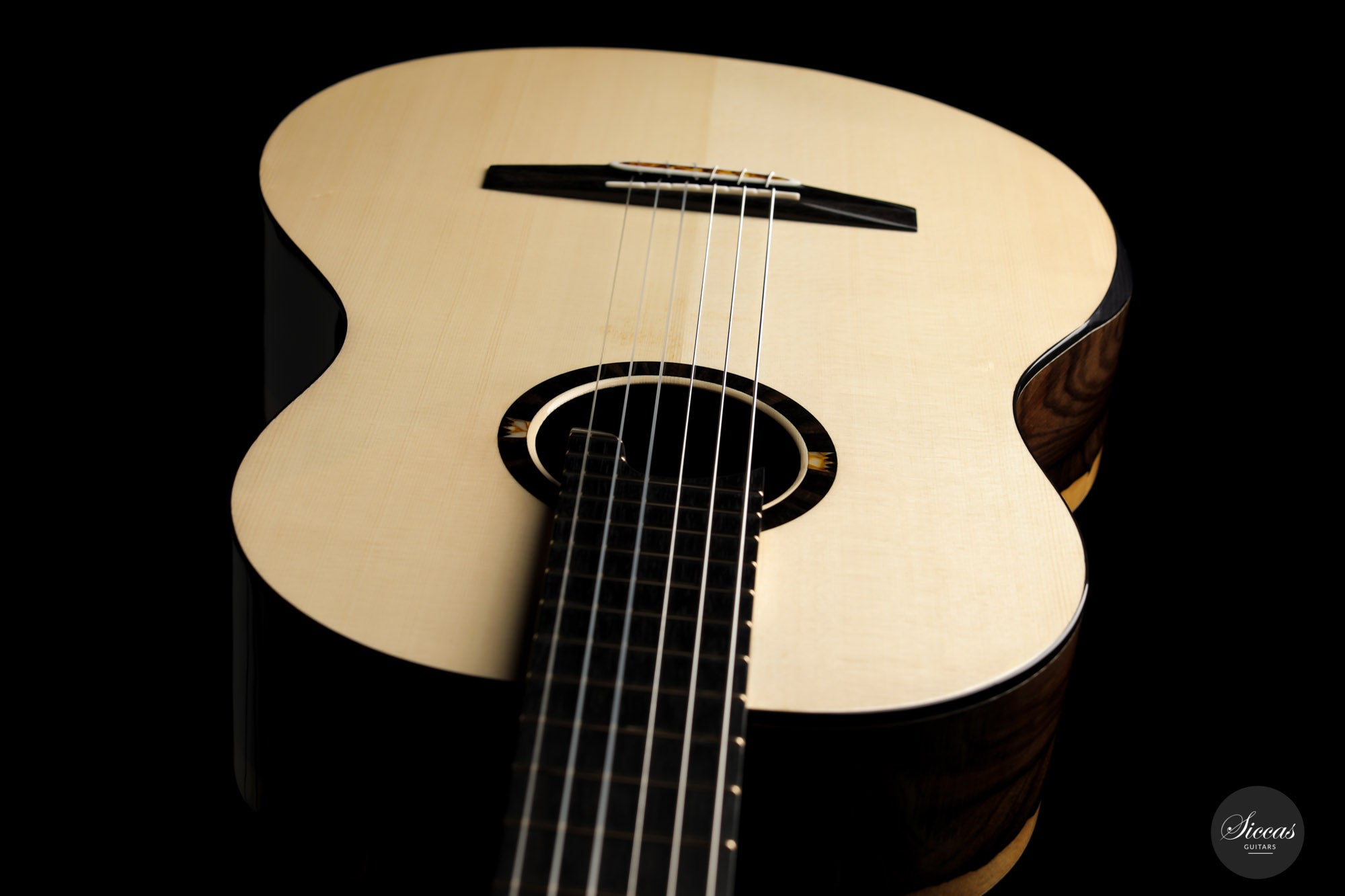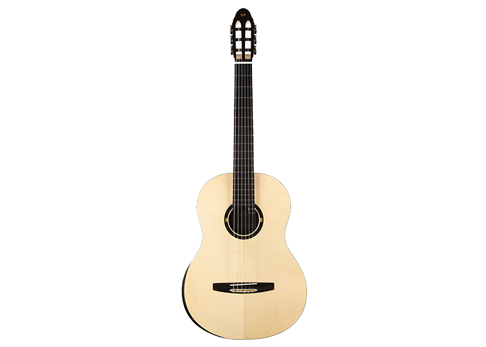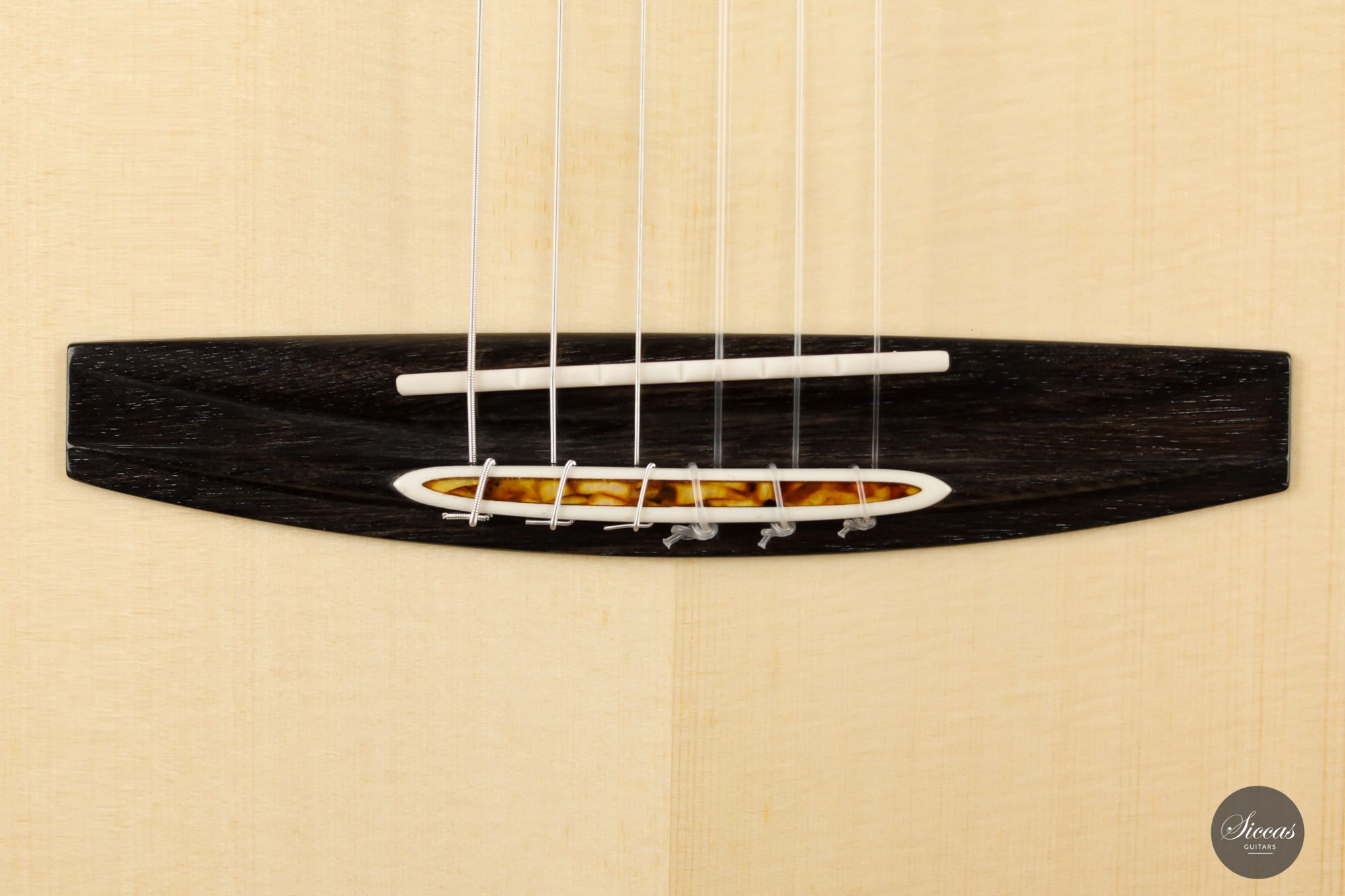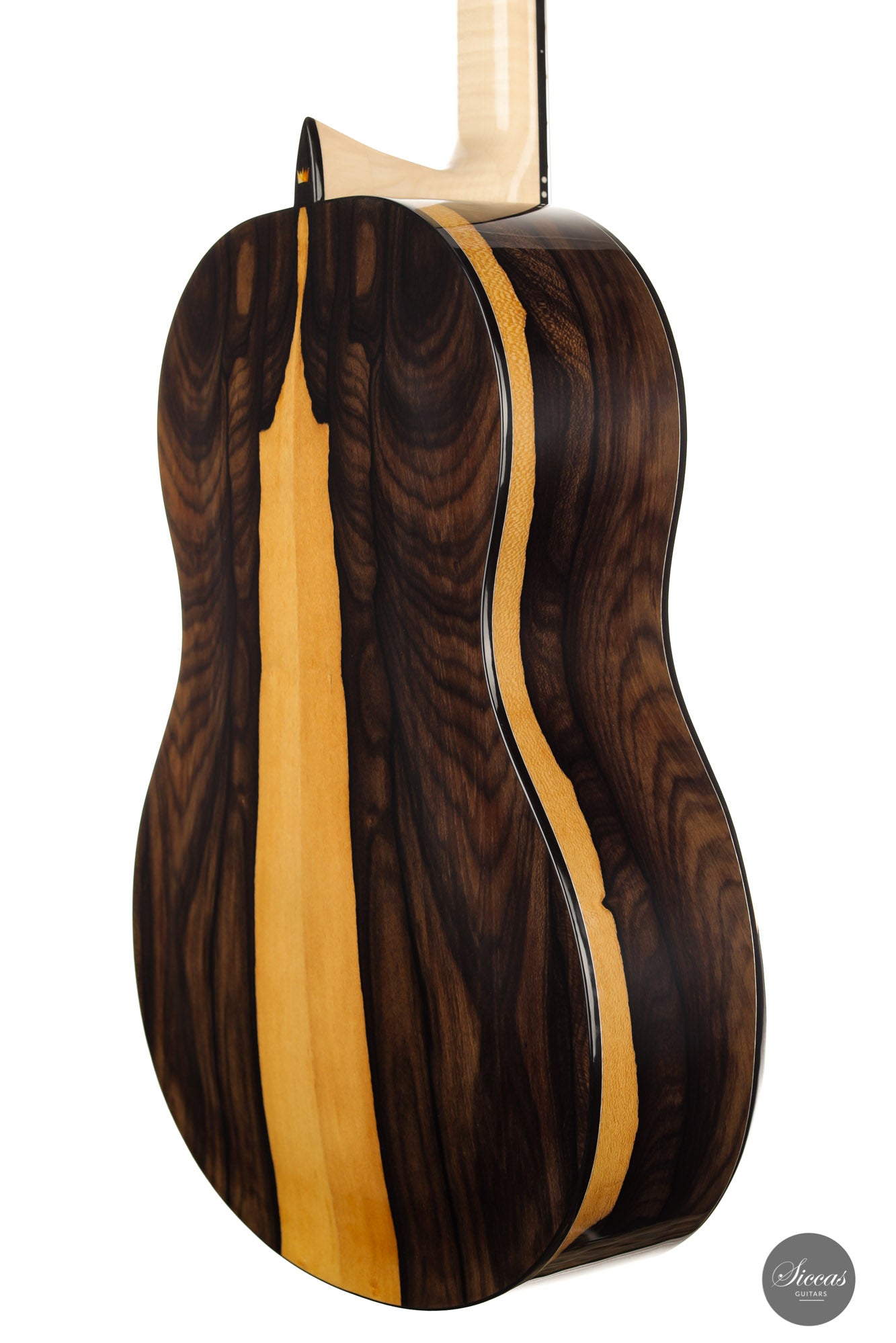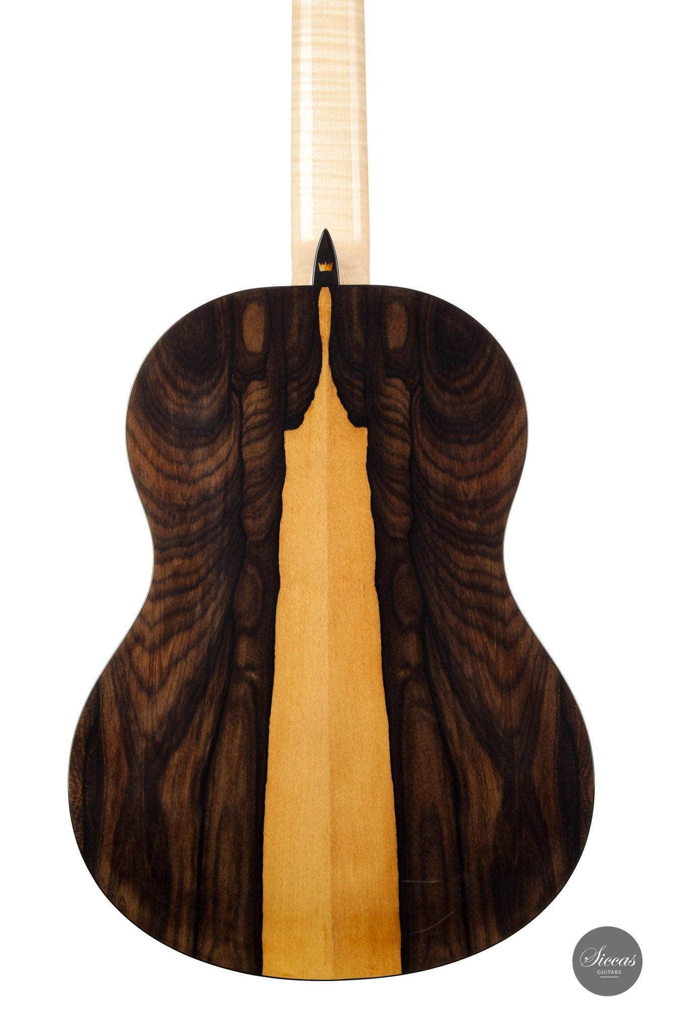 This wonderful instrument is really one of a kind. With a mesmerizing arched back made of Ziricote, giving center stage a wide light sapwood part in the middle, it really has a unique look. The spruce top has an outermost light lattice bracing reinforced with carbon fibre to give great responsiveness and lightness. Of course, this instrument features the famous “Acoustic tube” inside the neck, to give the latter a greater role in the overall resonance of the guitar.