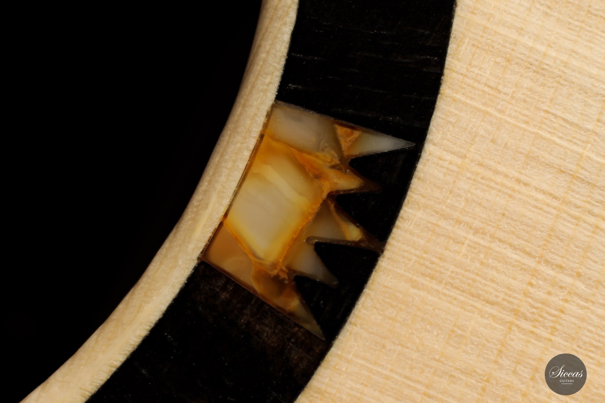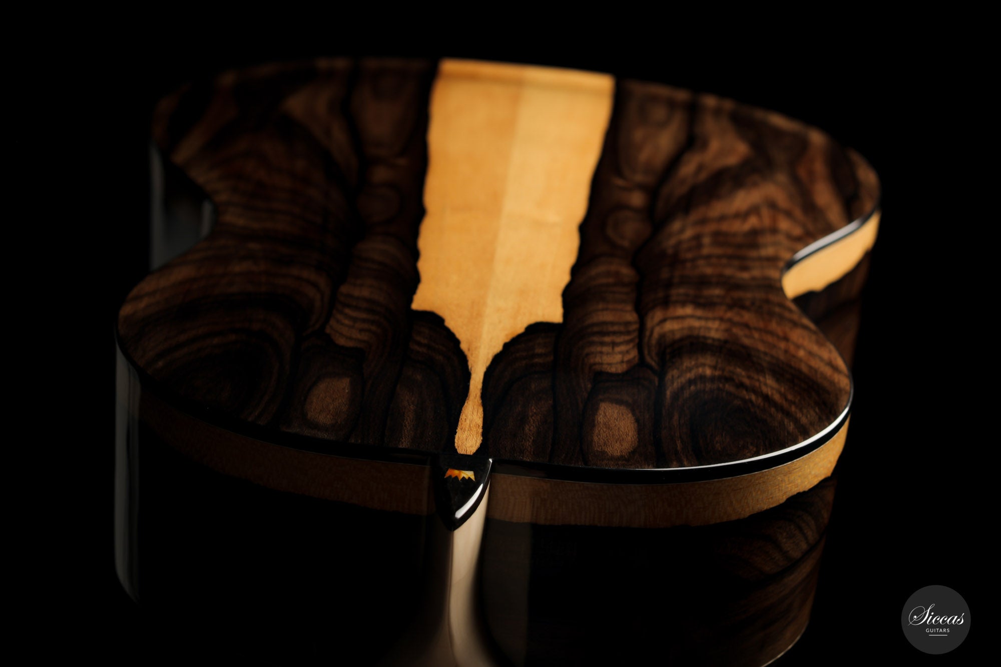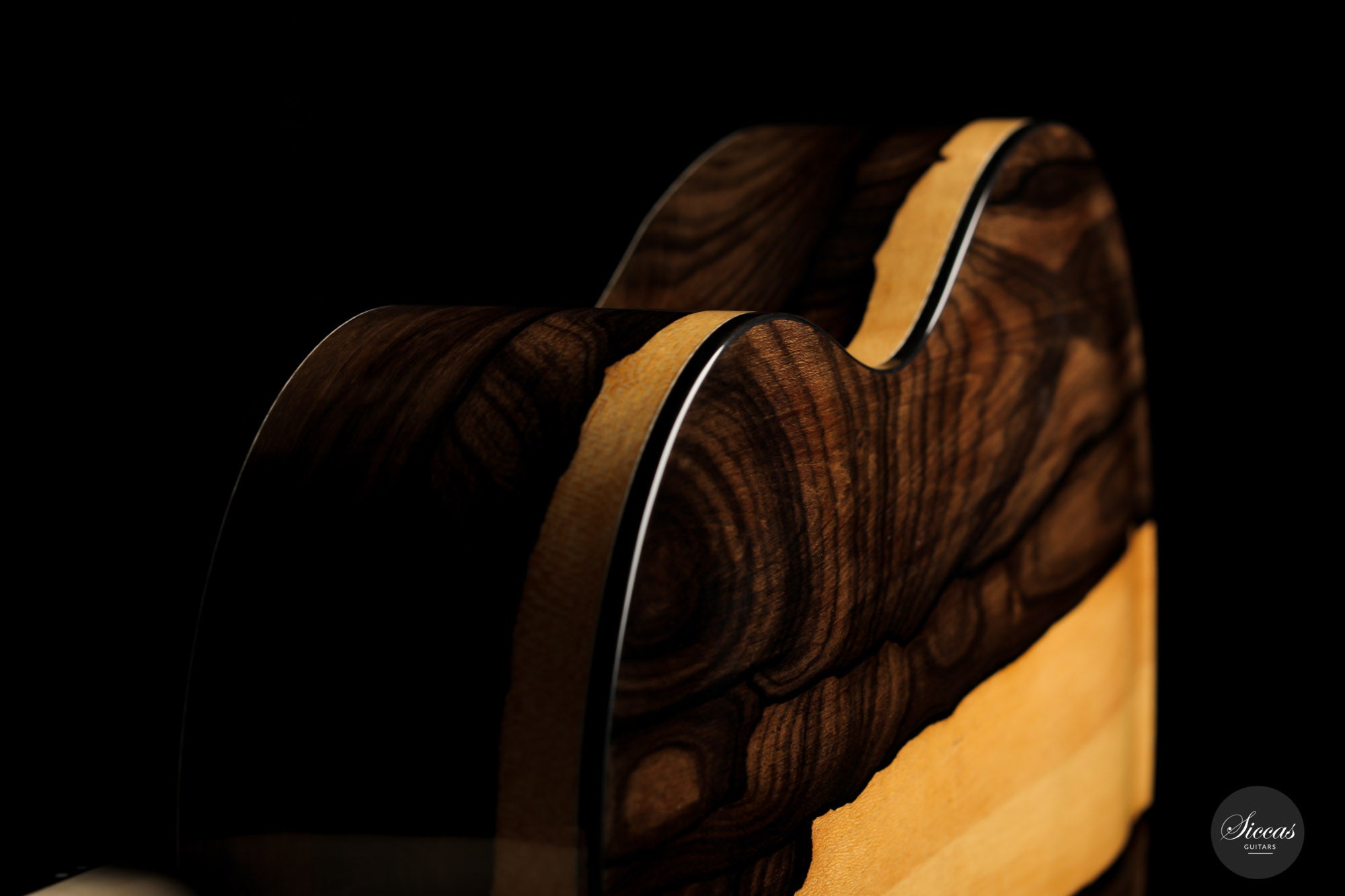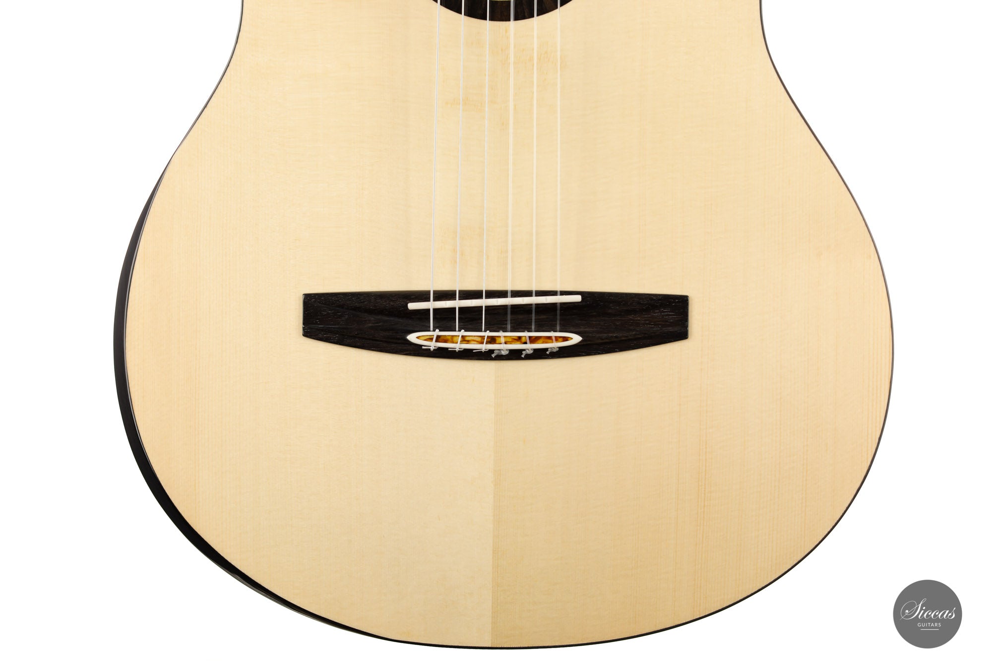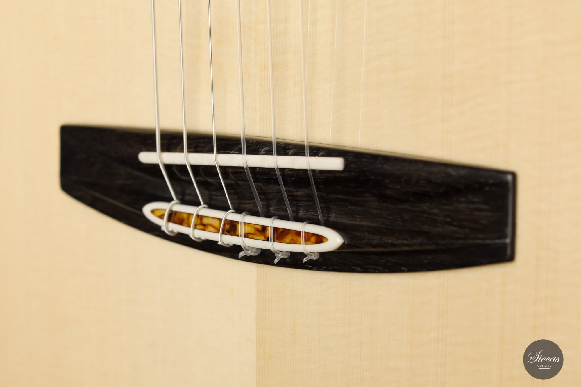 This wonderful instrument is really one of a kind. With a mesmerizing arched back made of Ziricote, giving center stage a wide light sapwood part in the middle, it really has a unique look. The spruce top has an outermost light lattice bracing reinforced with carbon fibre to give great responsiveness and lightness. Of course, this instrument features the famous “Acoustic tube” inside the neck, to give the latter a greater role in the overall resonance of the guitar.