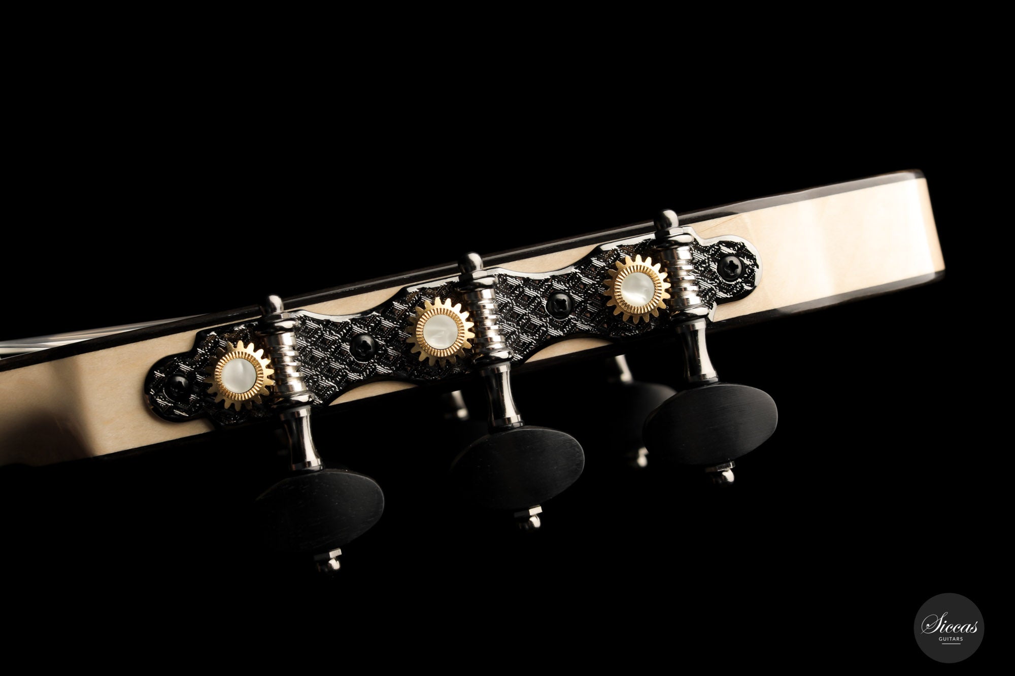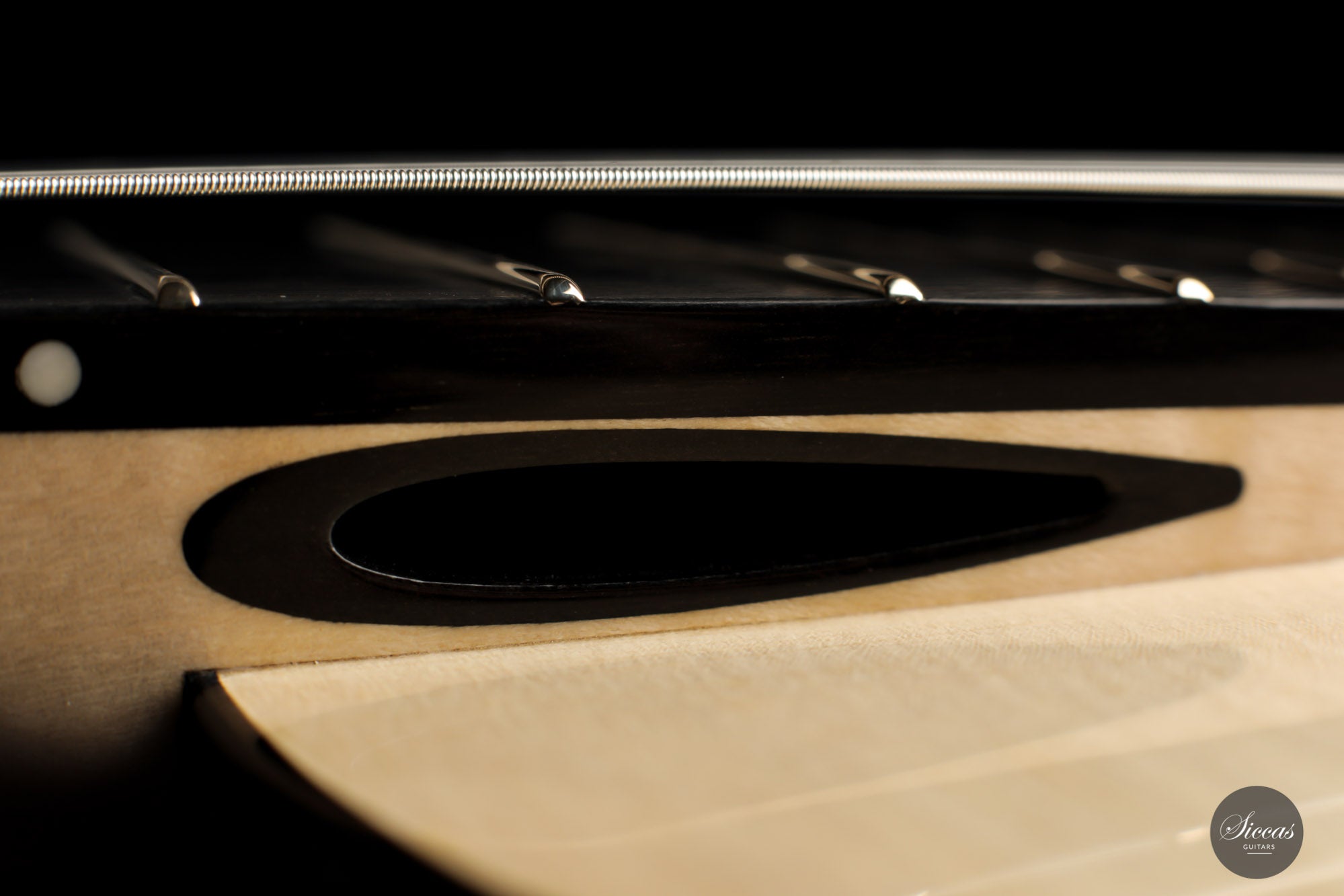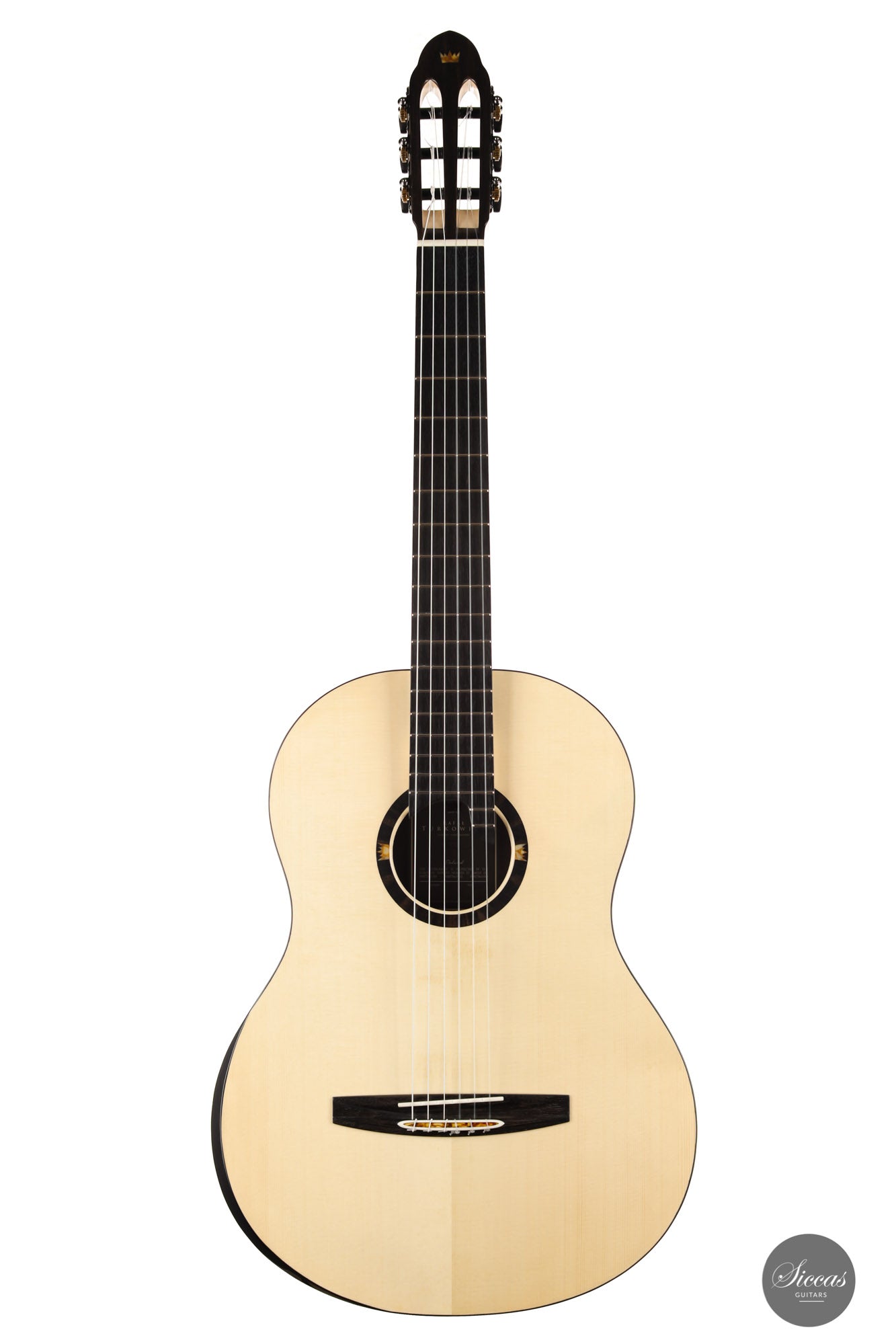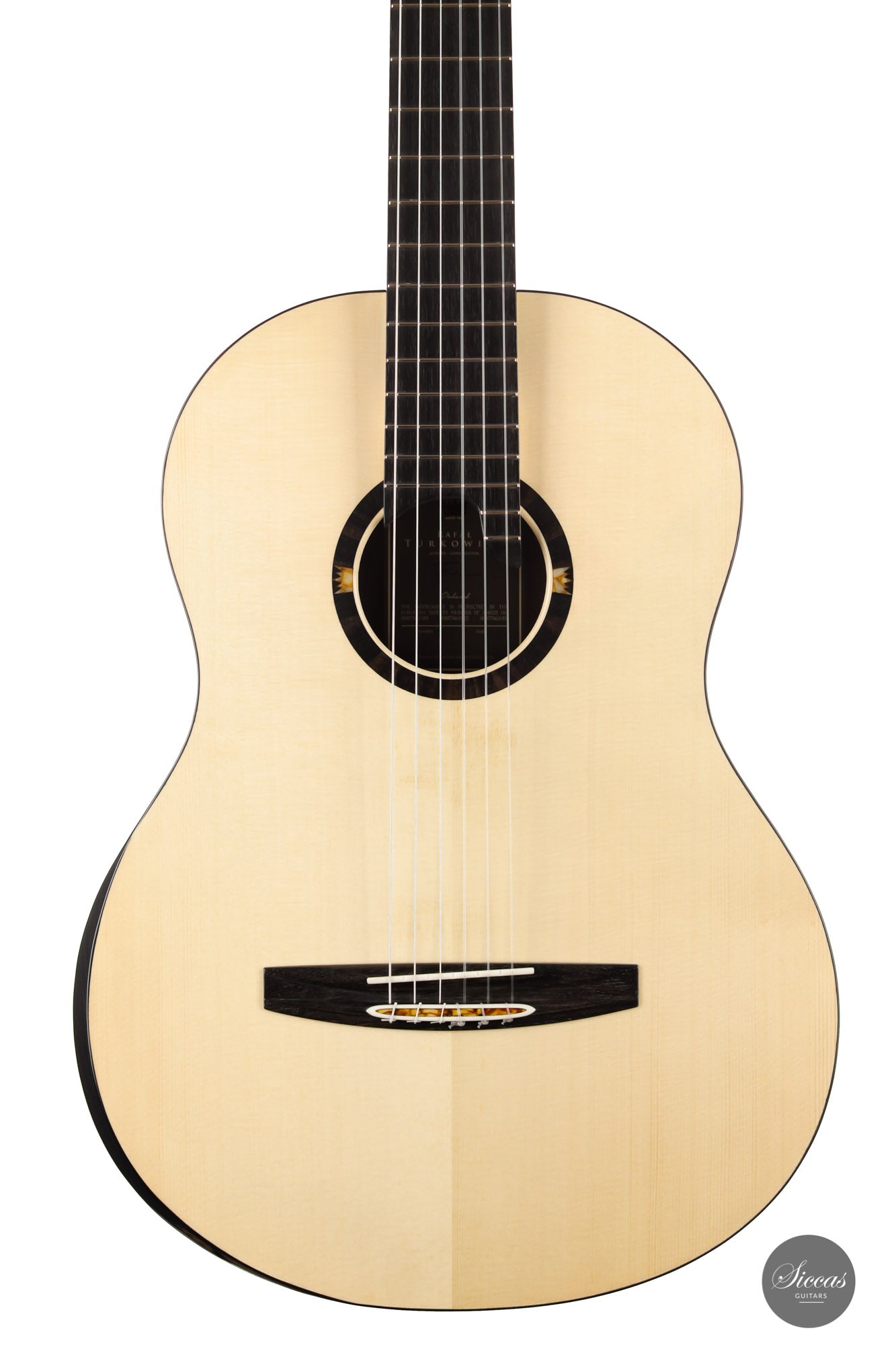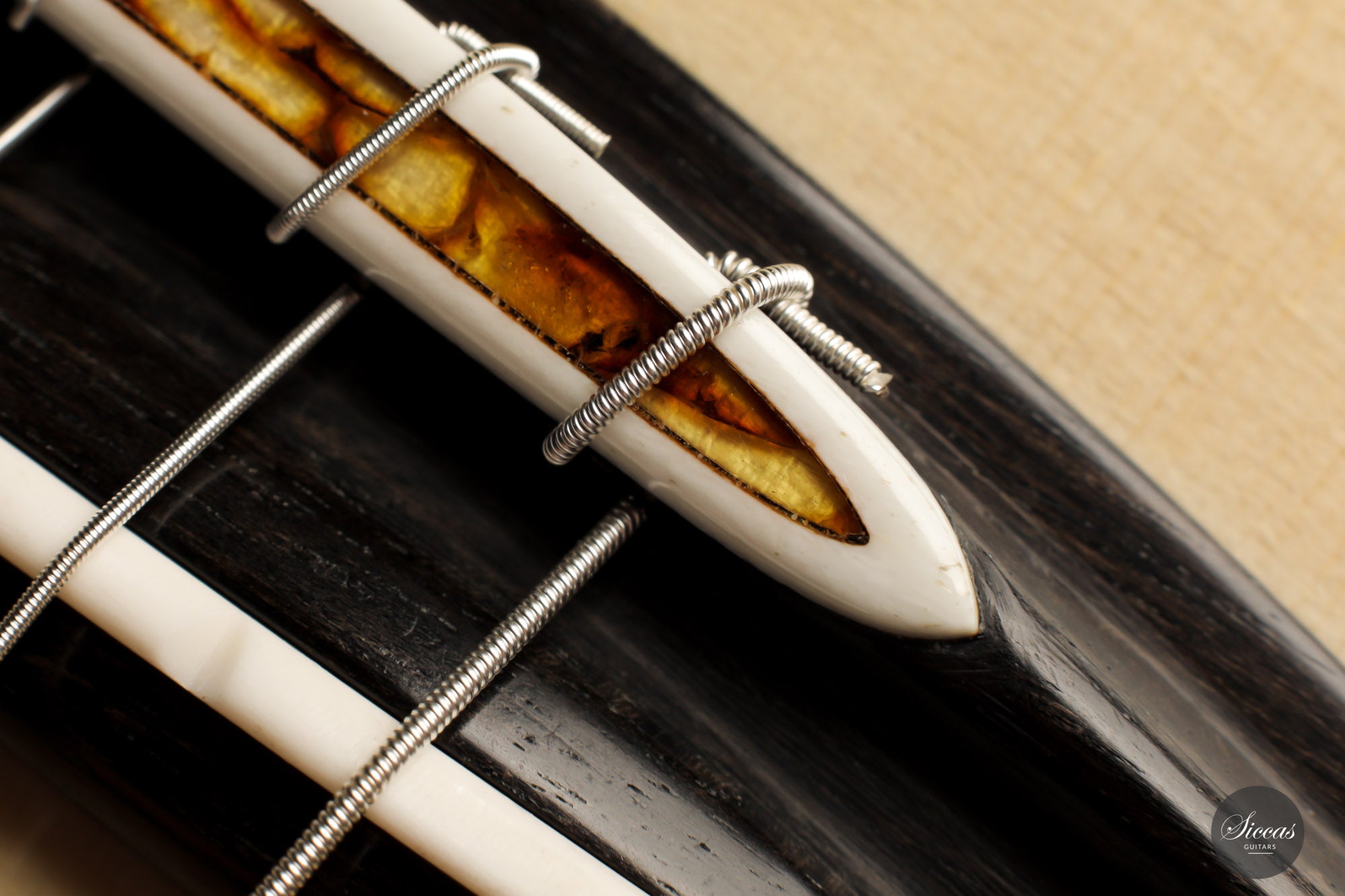 This wonderful instrument is really one of a kind. With a mesmerizing arched back made of Ziricote, giving center stage a wide light sapwood part in the middle, it really has a unique look. The spruce top has an outermost light lattice bracing reinforced with carbon fibre to give great responsiveness and lightness. Of course, this instrument features the famous “Acoustic tube” inside the neck, to give the latter a greater role in the overall resonance of the guitar.