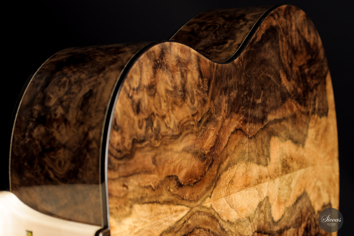 This wonderful instrument is a model "Queen of Guitars - black diamond" and is numbered 420. This exclusive guitar has a bewitching arched back made of highly figured California Walnut Burl, giving the center stage a light sapwood part in the middle. The cedar top has an outermost light lattice bracing reinforced with carbon fiber to provide excellent responsiveness and lightness. Of course, this instrument features the famous "Acoustic tube" inside the neck, to give the latter a more significant role in the overall resonance of the guitar.