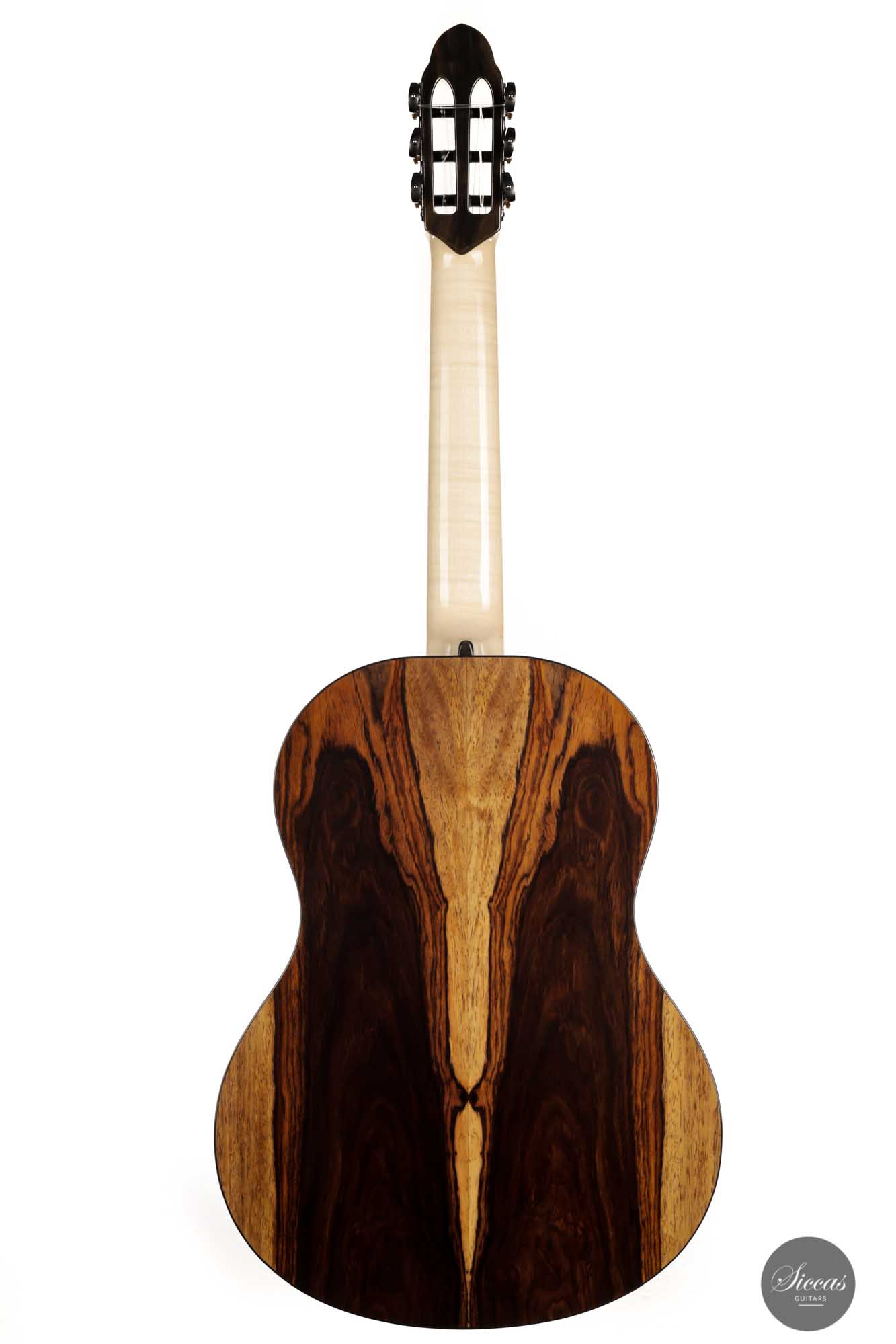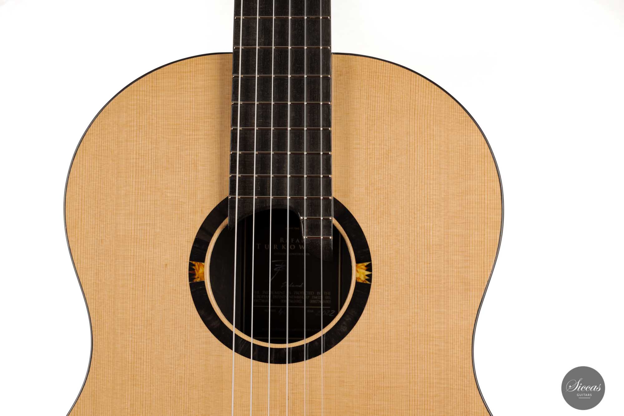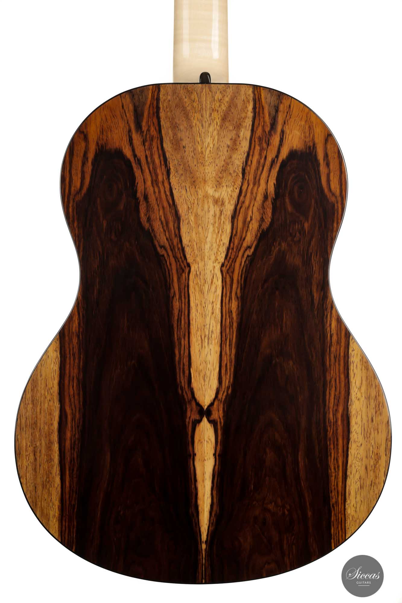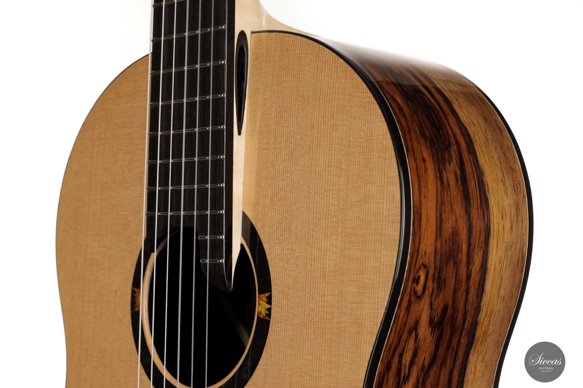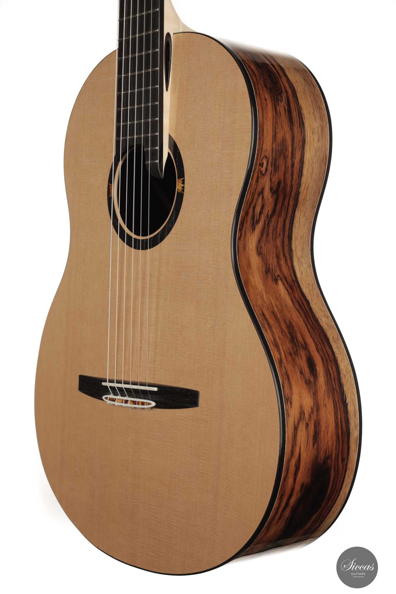 Nicht zuletzt durch den gewölbten Boden aus faszinierend gemasertem Cocobolo, der die umfangreiche Farbpalette dieses außergewöhnlichen Tonholzes zeigt, hat diese Gitarre ein einzigartiges Äußeres. Die Fichtendecke hat eine äußere leichte Gitterverstrebung, die mit Kohlefaser verstärkt ist und für eine großartige Ansprache und Leichtigkeit sorgt. Natürlich verfügt dieses Instrument über die berühmte „Accoustic Tube“ im Inneren des Halses, um dem Hals eine größere Rolle in der Gesamtresonanz der Gitarre zu geben.