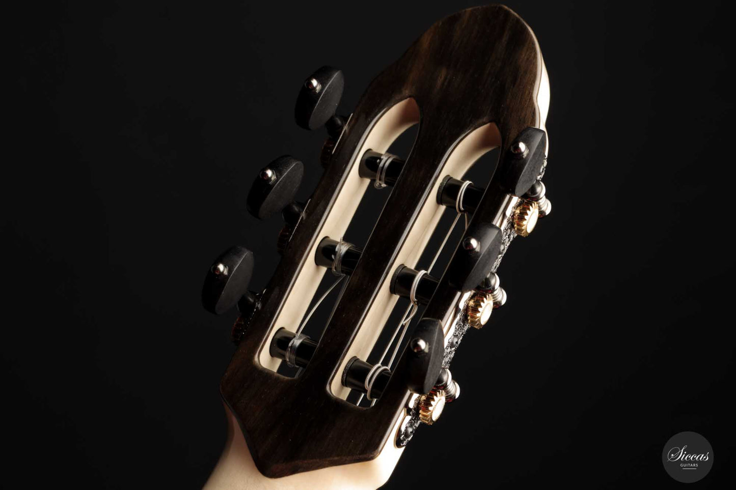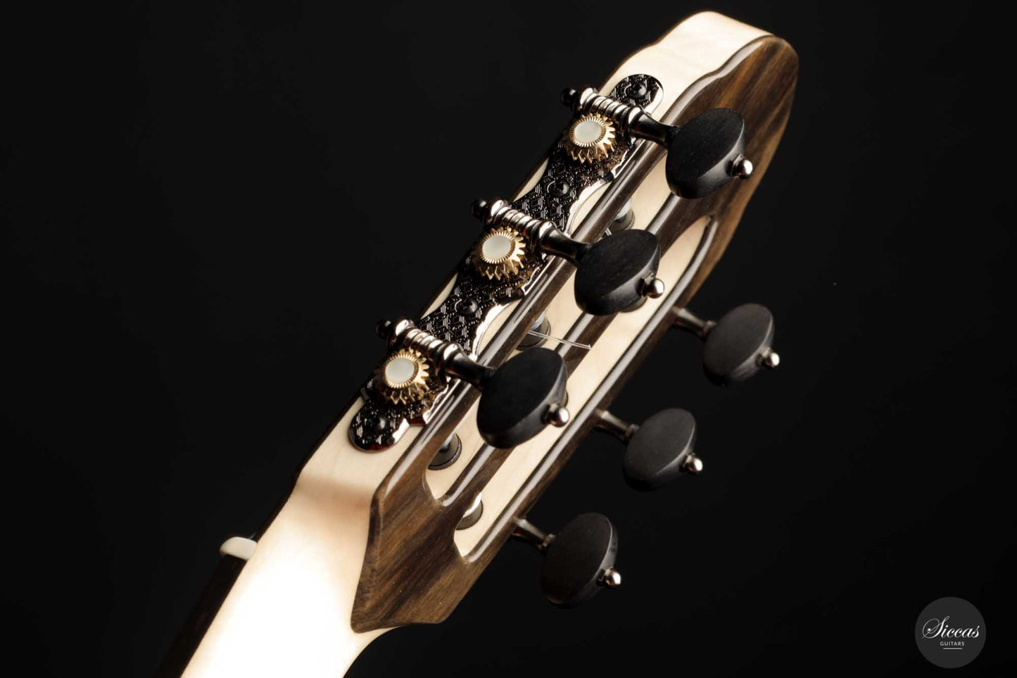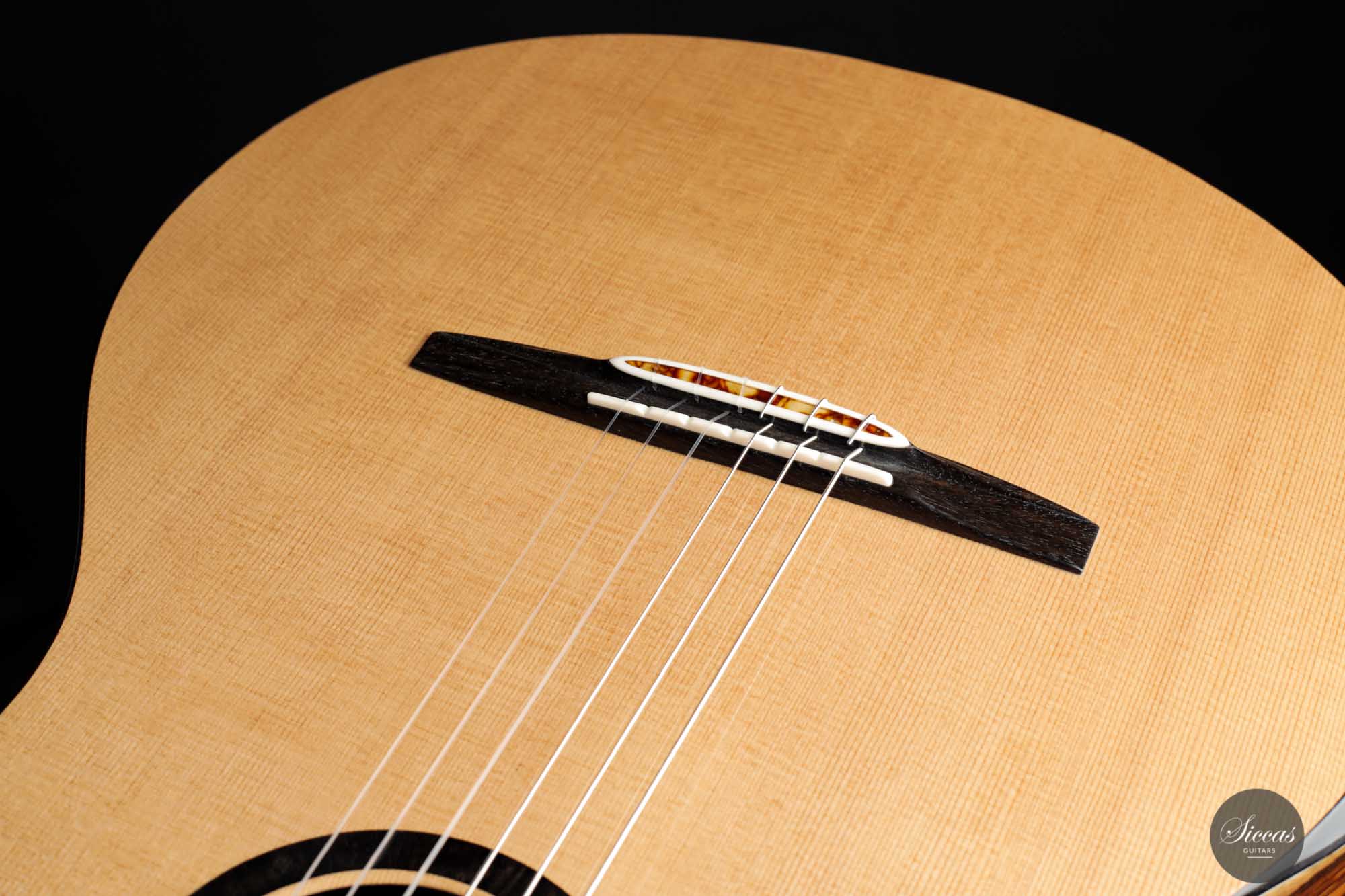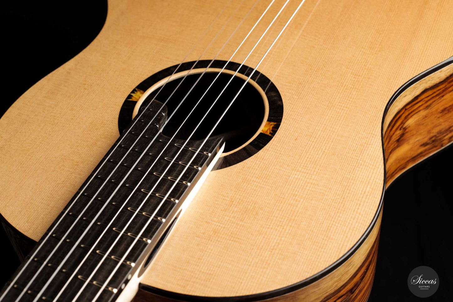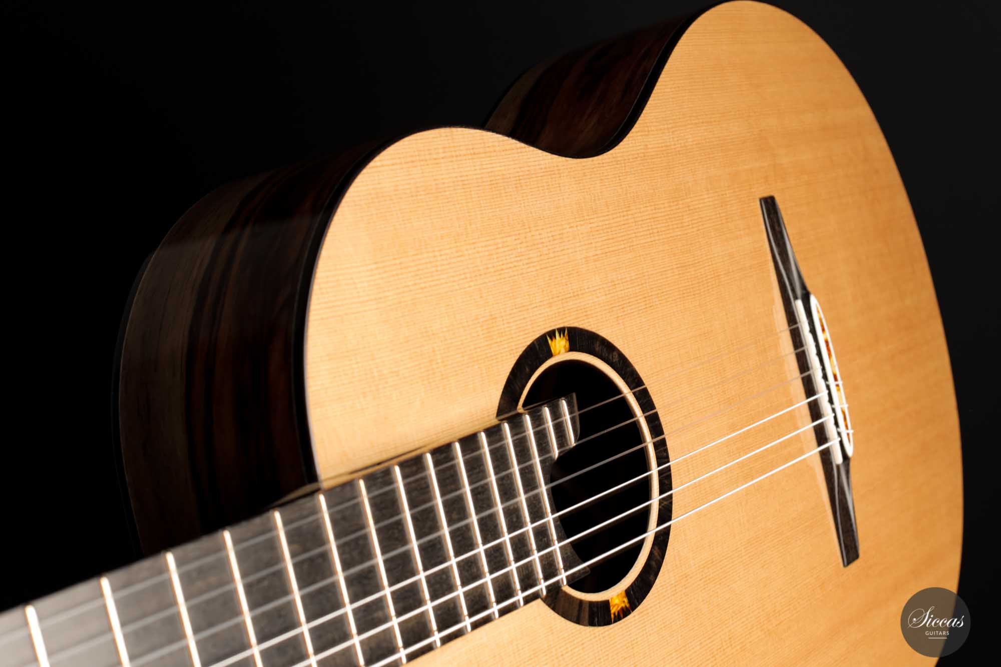 With its 64cm scale, thin and ergonomic neck shape, elevated fingerboard, and extremely responsive top, this guitar is remarkably easy to play. It is ideal for guitarists looking for a modern guitar offering premium playability and bold, powerful sound. Not only is its tone rich and steady, but it also develops abundant yet controlled overtones. Moreover, the first e-string offers a consistent sustain up to the highest notes. This feeling of consistency and evenness is to be found all around the registers of this guitar.