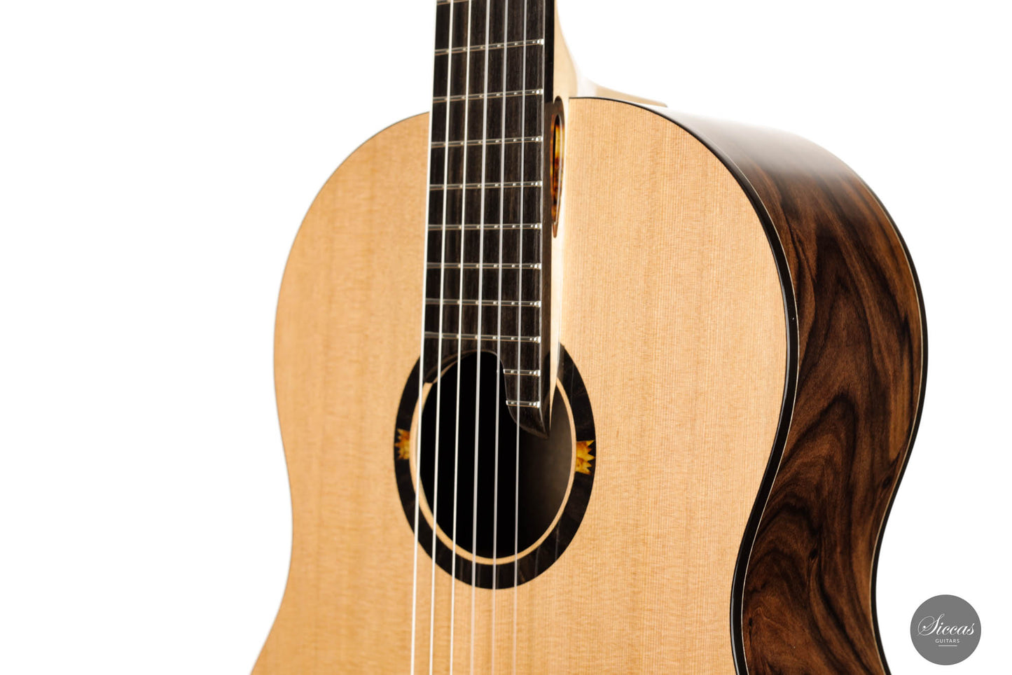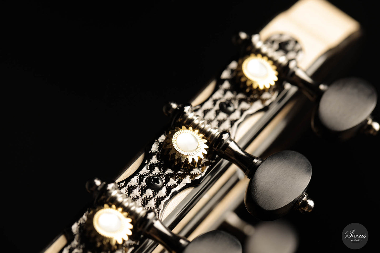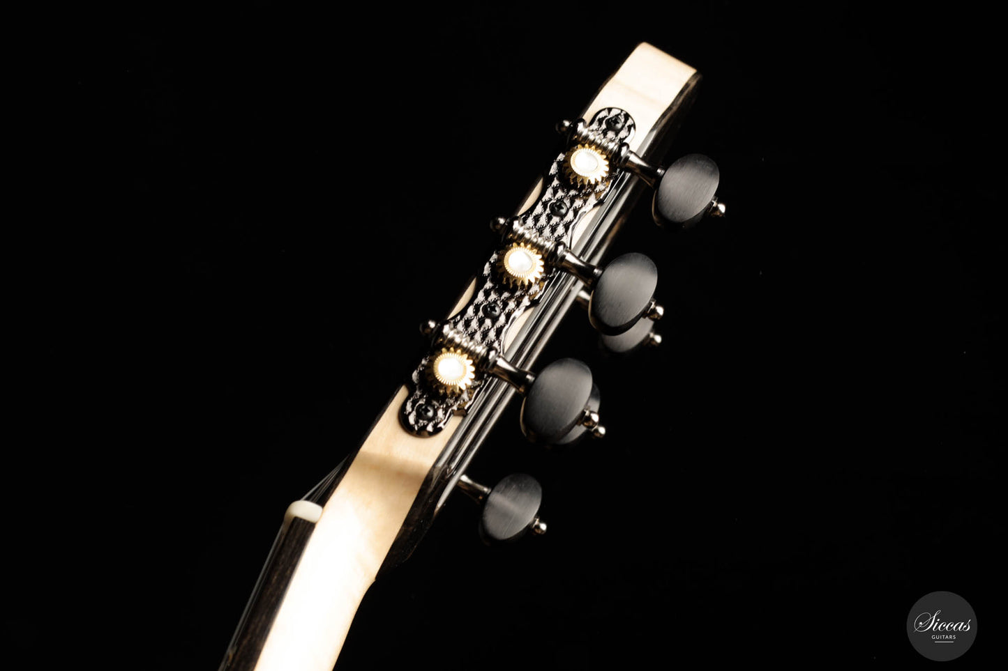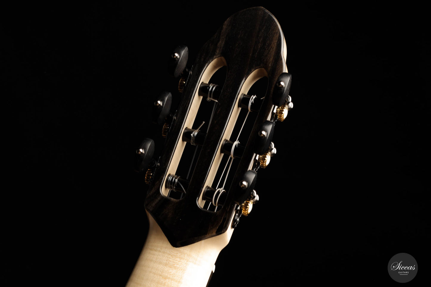 This "Queen of Guitars - Black Diamond" No. 551 is an incredible instrument by the Rafal Turkowiak, a defining model of 2023, that elevates the art of guitar crafting. This exclusive 65 cm guitar showcases an eye-catching arched back made from exceptional Bolivian rosewood. The meticulously crafted cedar top, reinforced with carbon fiber in a light lattice bracing pattern, ensures remarkable responsiveness and feather-light weight.