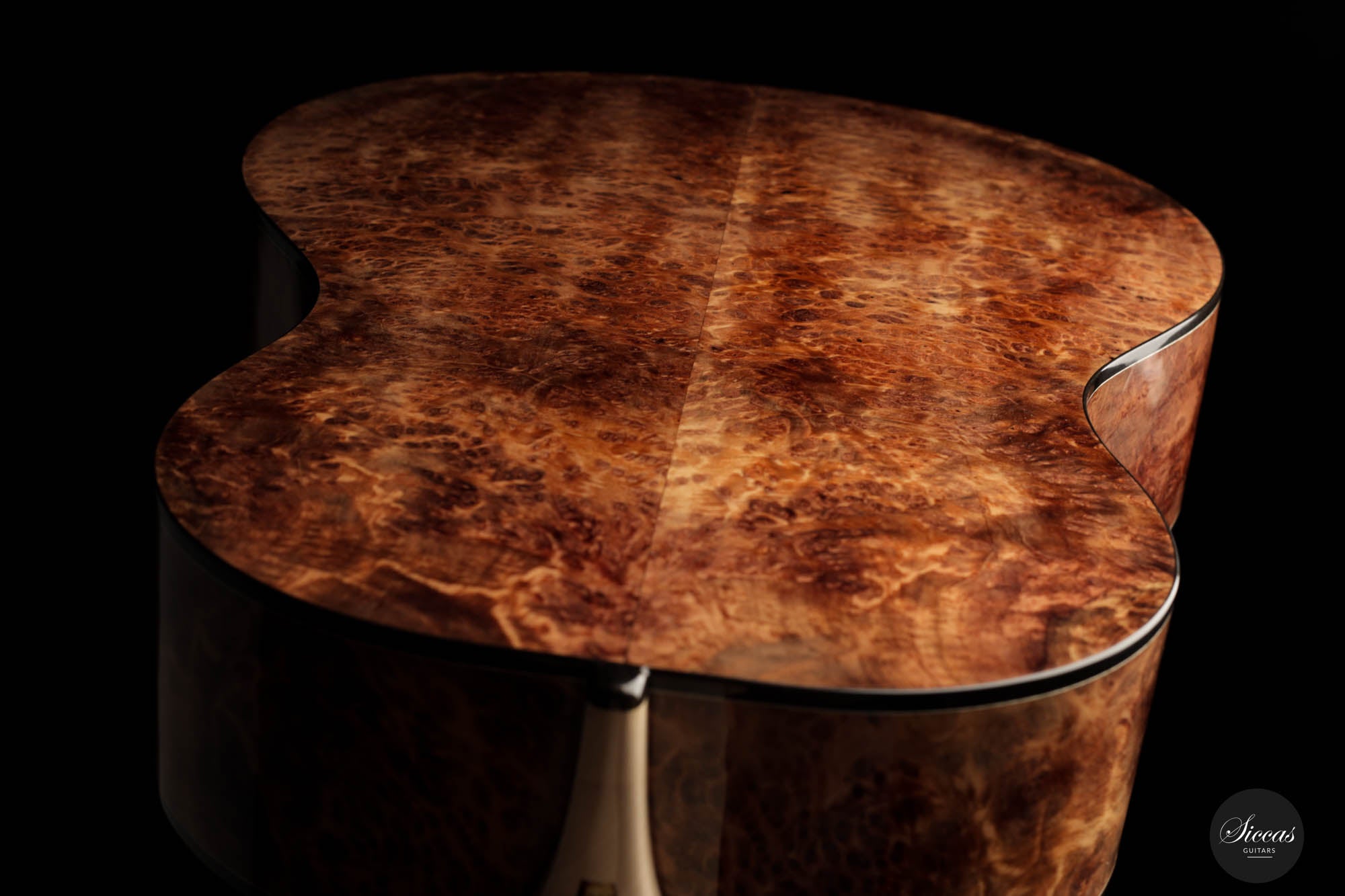 The Rafal Turkowiak Guitar No. 520, also known as the "Queen of Guitars - Black Diamond," is a piece of art that is sure to captivate any guitar enthusiast. The guitar is a 2023 model and is crafted with exceptional attention to detail, making it a truly remarkable instrument. One of the standout features of this guitar is its arched back, made from the exquisite Amboyna Burl. The center of the back has a light sapwood section that draws the eye and adds to the guitar's overall elegance. The spruce double-top of the guitar is reinforced with five fan bracing that makes it incredibly responsive and lightweight. The guitar's unique feature is the famous "Acoustic tube" inside the neck that enhances its overall resonance. The result is a sound that is effortless and fills the room, enveloping the player in its rich and warm tones. The guitar has a 63cm scale, making it an ideal choice for guitarists with smaller hands. The trebles are crisp and clear, and the separation of the voices is immaculate, creating a balanced and inspiring instrument that brings joy and satisfaction to the player. Overall, the Rafal Turkowiak Guitar No. 520 is an instrument that is sure to impress any musician who appreciates quality and attention to detail.