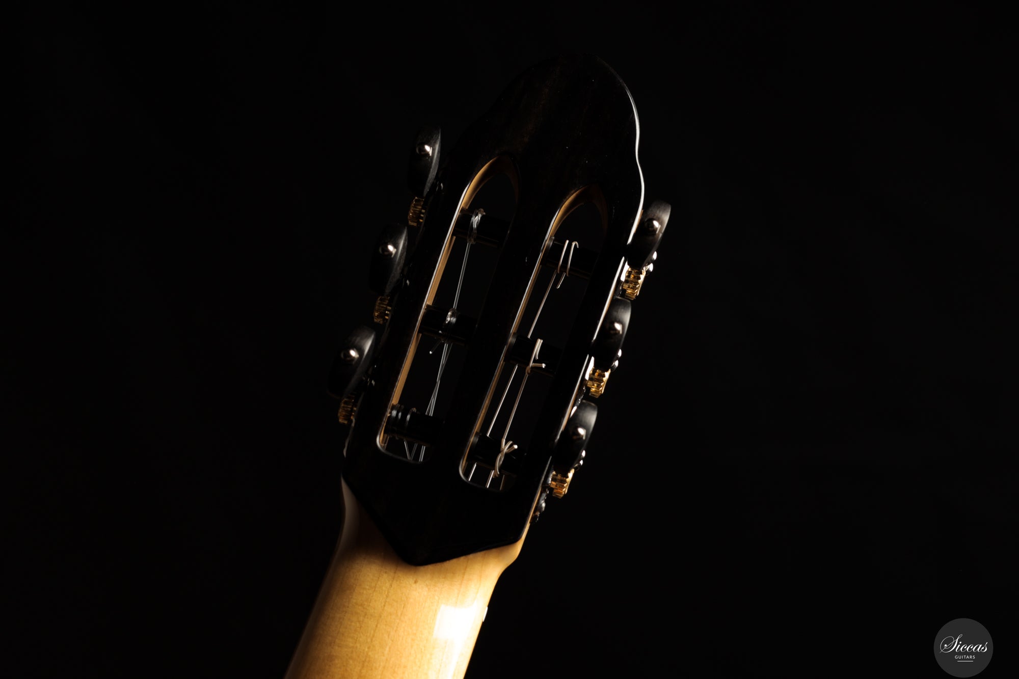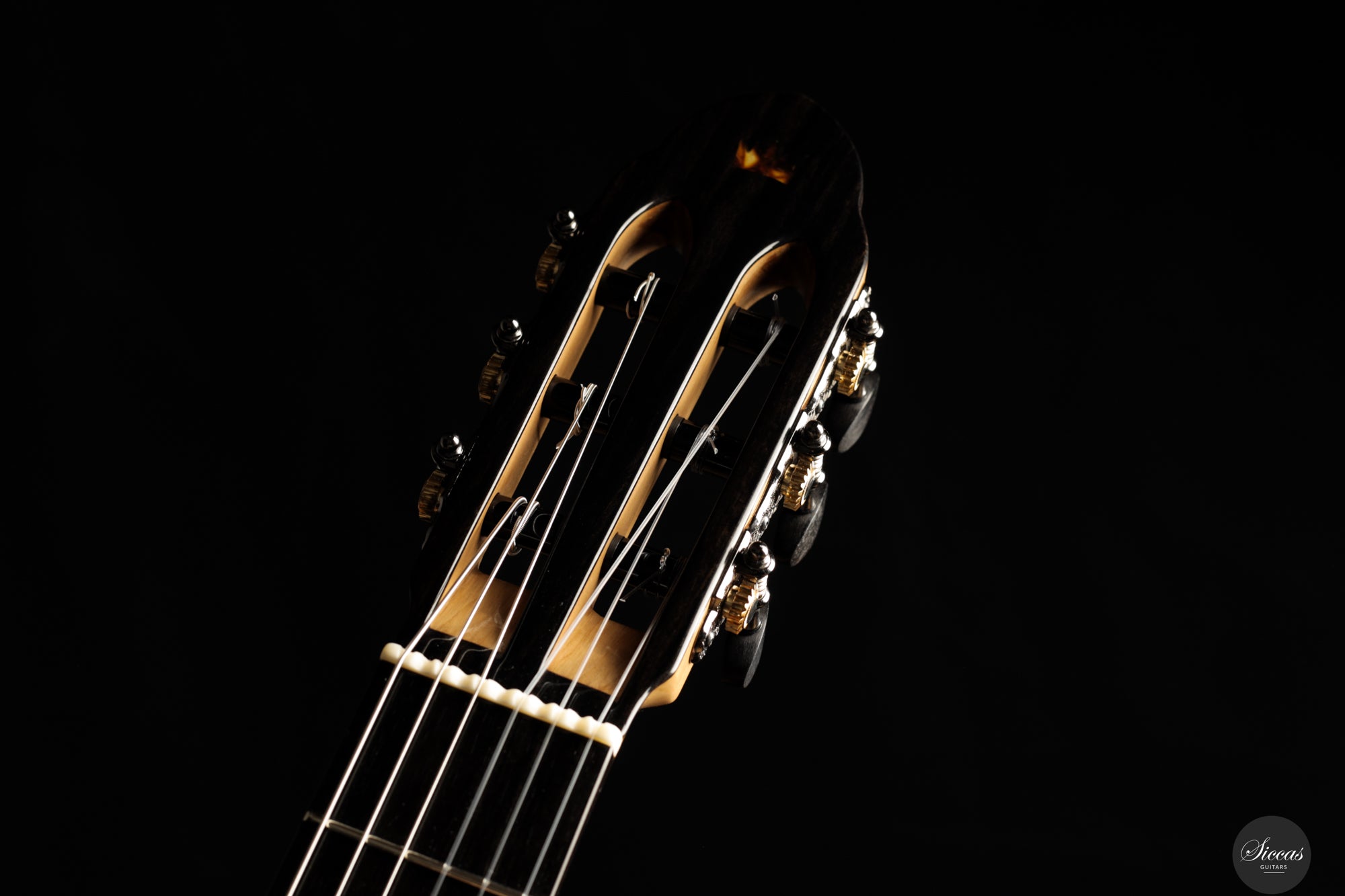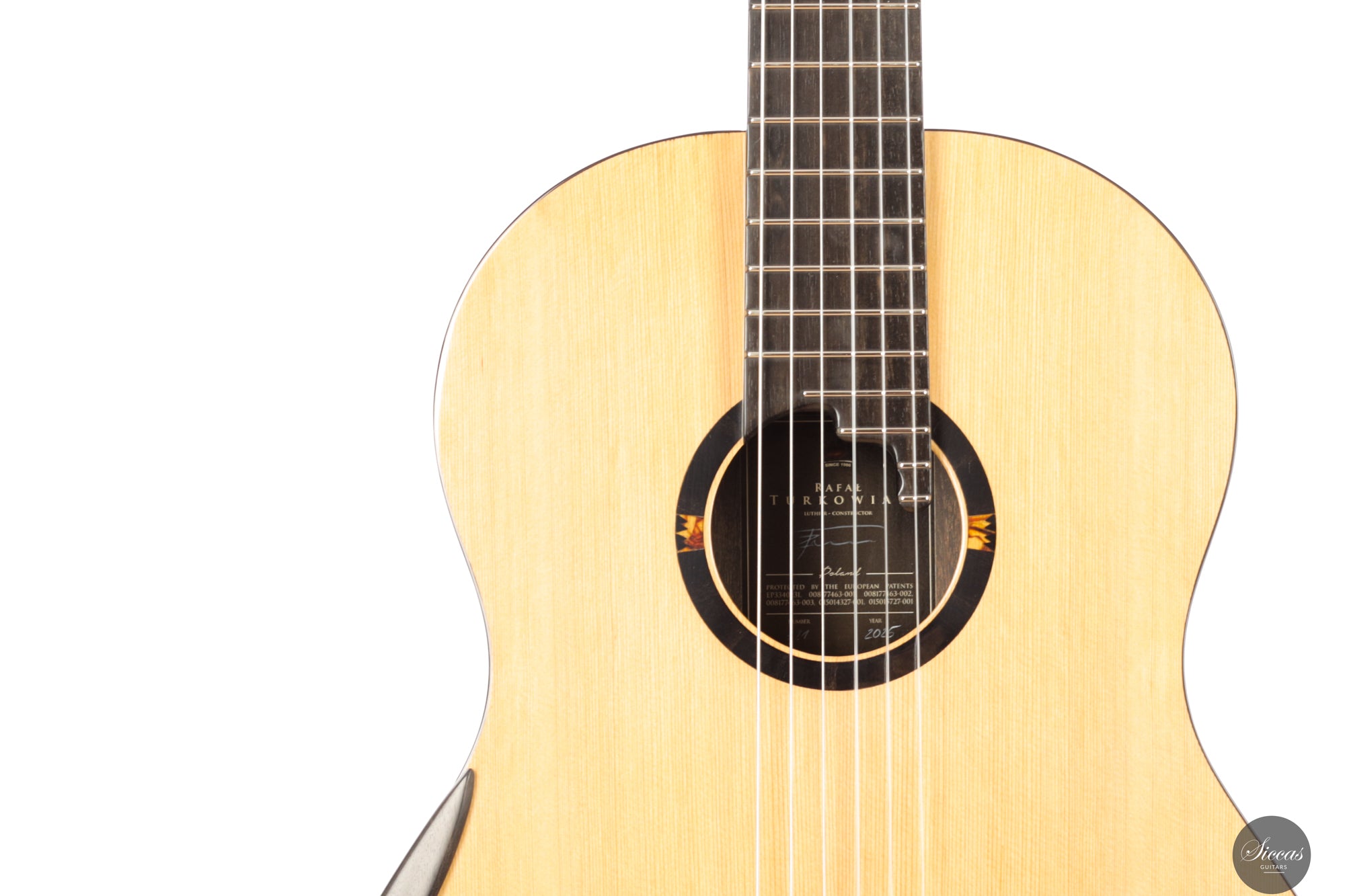 The Opus Prime No. 721 from 2025 represents a continuation of Turkowiak’s forward-looking vision. Following on from his renowned “Queen of Guitars” and earlier Opus Prime models, this instrument demonstrates his ongoing commitment to blending traditional craftsmanship with advanced acoustic engineering. The spruce soundboard works in combination with Bolivian rosewood back and sides to produce a voice that is both powerful and refined. A defining feature of this model is Turkowiak’s “Acoustic Tube” integrated into the neck, which enriches the resonance and supports a full, enveloping sound. The trebles are sweet and lyrical, while the bass registers benefit greatly from the exceptionally low air resonance of D sharp to E. This results in impressive depth and sustain across the lower range and a strong fundamental presence throughout the registers. With a weight of only 1520 grams, the guitar remains highly responsive and dynamic. Visually and ergonomically, the Opus Prime No. 721 embraces a modern aesthetic. Its sleek lacquer finish, carefully profiled neck, and comfortable dimensions reflect Turkowiak’s focus on player-oriented design. This guitar offers a remarkable blend of warmth and playability, making it a strong choice for demanding concert use.