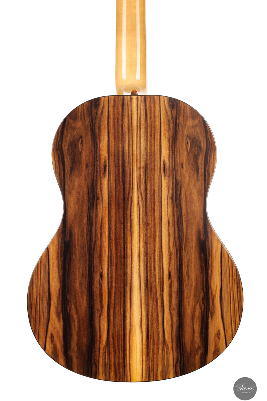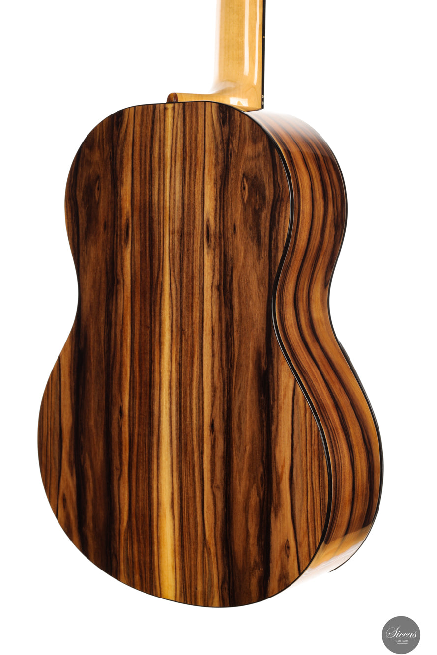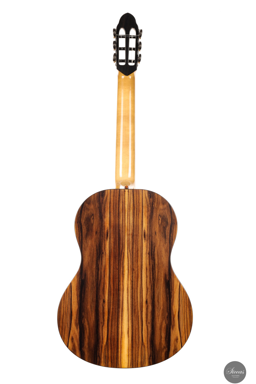 The Opus Prime No. 721 from 2025 represents a continuation of Turkowiak’s forward-looking vision. Following on from his renowned “Queen of Guitars” and earlier Opus Prime models, this instrument demonstrates his ongoing commitment to blending traditional craftsmanship with advanced acoustic engineering. The spruce soundboard works in combination with Bolivian rosewood back and sides to produce a voice that is both powerful and refined. A defining feature of this model is Turkowiak’s “Acoustic Tube” integrated into the neck, which enriches the resonance and supports a full, enveloping sound. The trebles are sweet and lyrical, while the bass registers benefit greatly from the exceptionally low air resonance of D sharp to E. This results in impressive depth and sustain across the lower range and a strong fundamental presence throughout the registers. With a weight of only 1520 grams, the guitar remains highly responsive and dynamic. Visually and ergonomically, the Opus Prime No. 721 embraces a modern aesthetic. Its sleek lacquer finish, carefully profiled neck, and comfortable dimensions reflect Turkowiak’s focus on player-oriented design. This guitar offers a remarkable blend of warmth and playability, making it a strong choice for demanding concert use.
