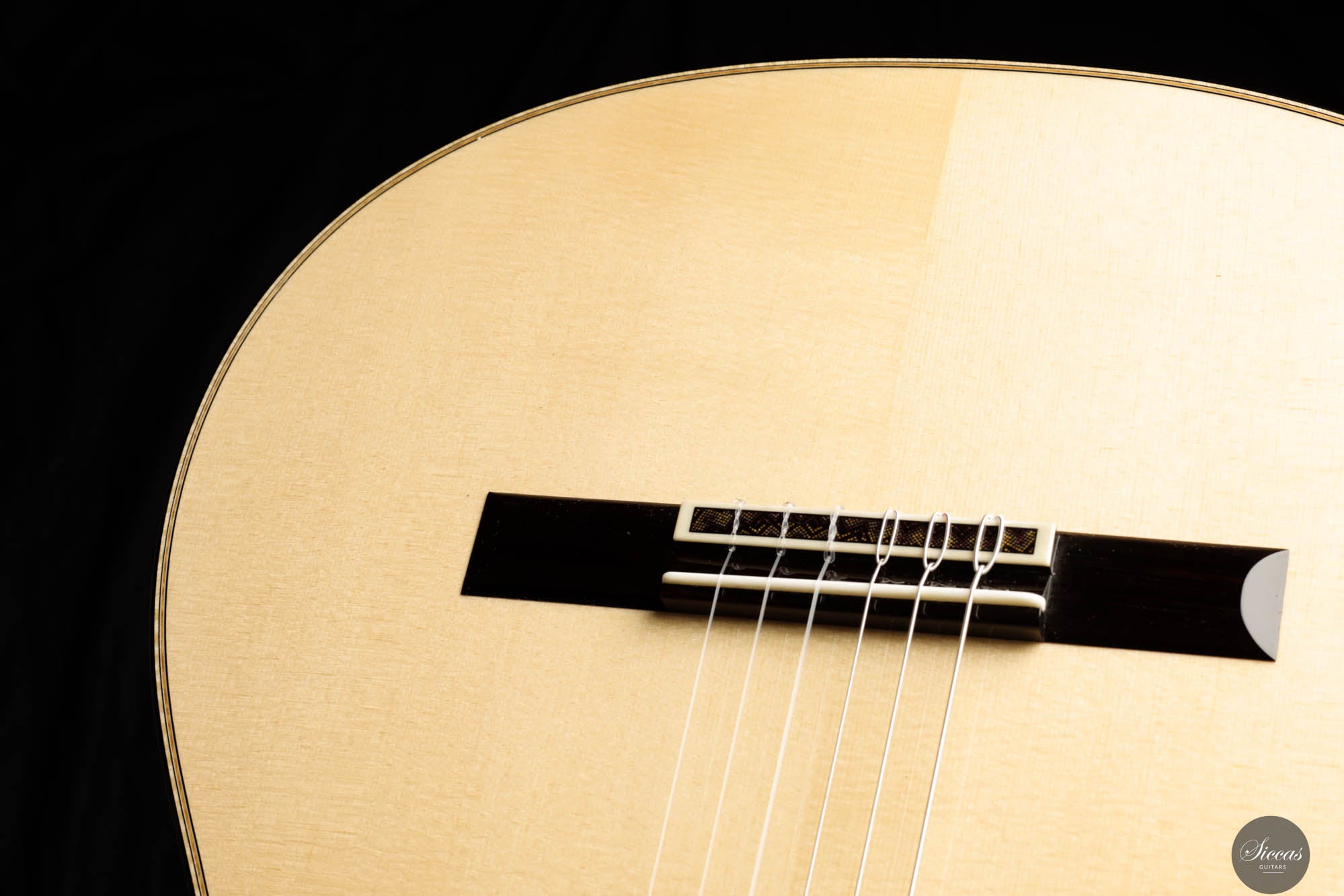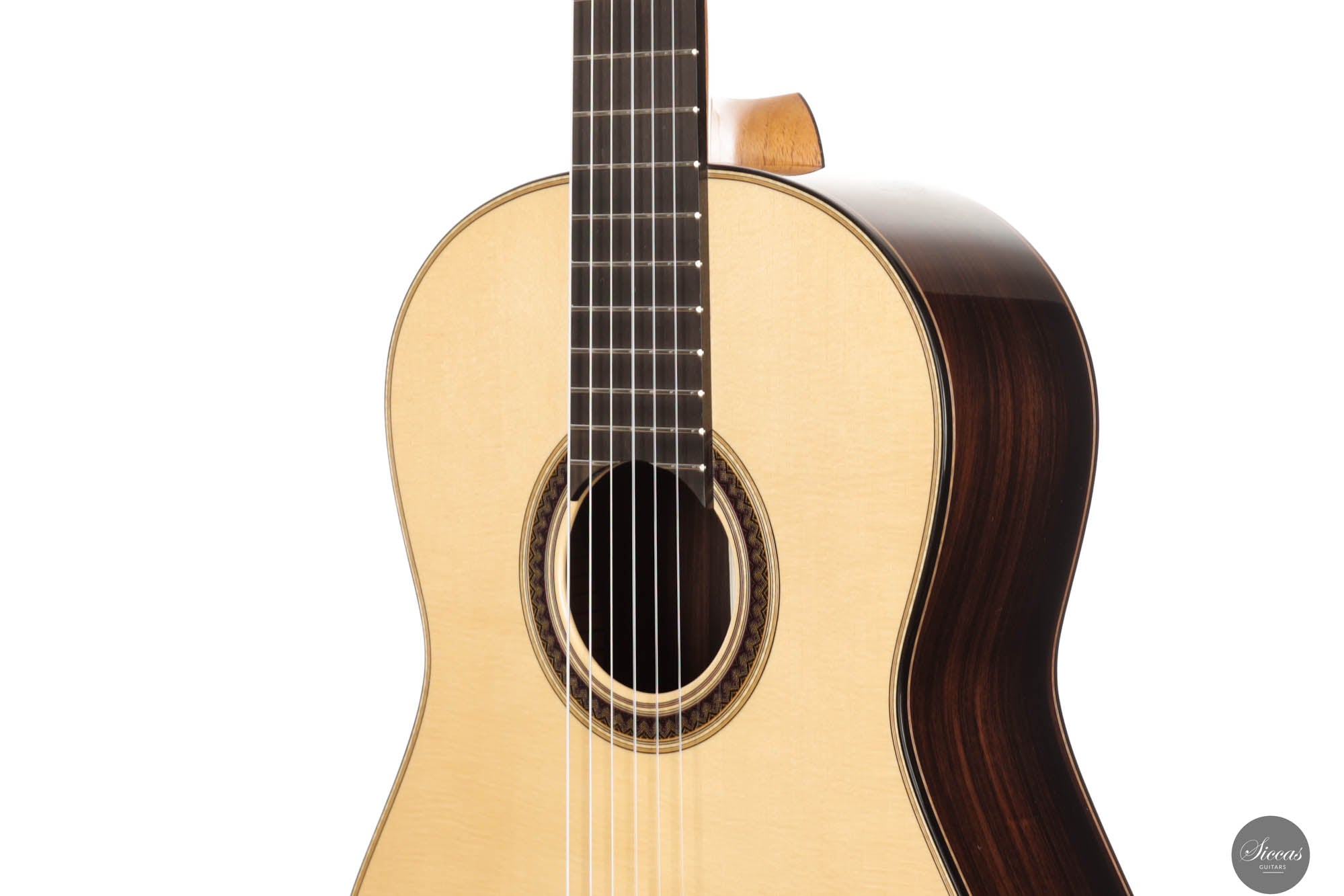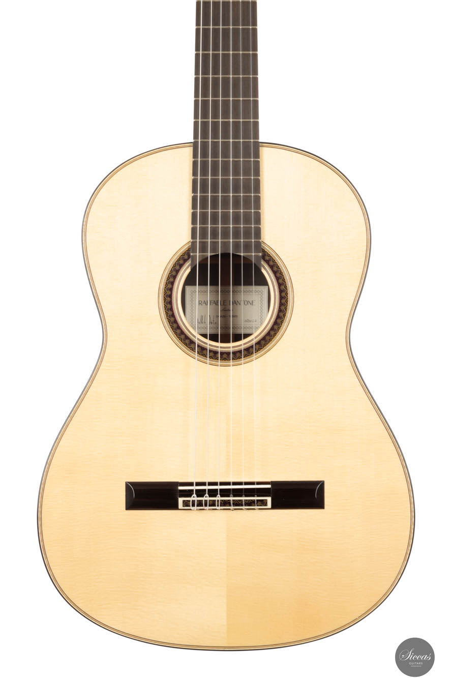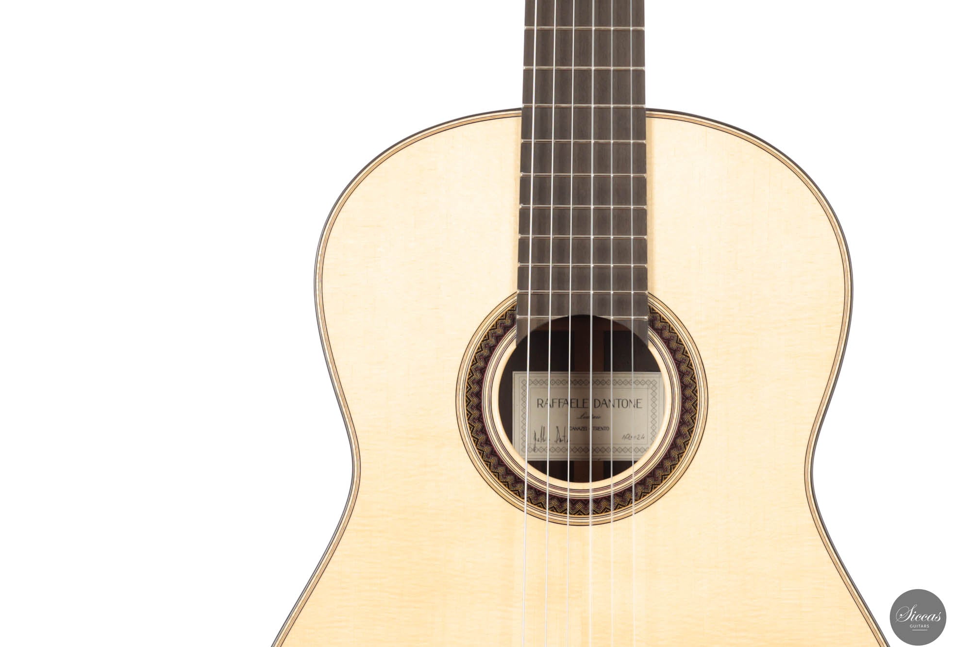 This brand-new guitar by Raffaele is a stunning example of exceptional craftsmanship, reflecting an impressive mastery achieved early in his career. Traditionally built with a spruce soundboard and Indian rosewood back and sides, the guitar is meticulously tuned to an F resonance, producing deep, charismatic basses that enhance its rich tonal quality. The trebles are brilliant and resonant, effortlessly projecting throughout any concert hall. A highlight of this instrument is its versatile color palette, allowing musicians to explore endless nuances and dynamic ranges in their performances. This guitar truly embodies beauty and sophistication in both sound and craftsmanship.
