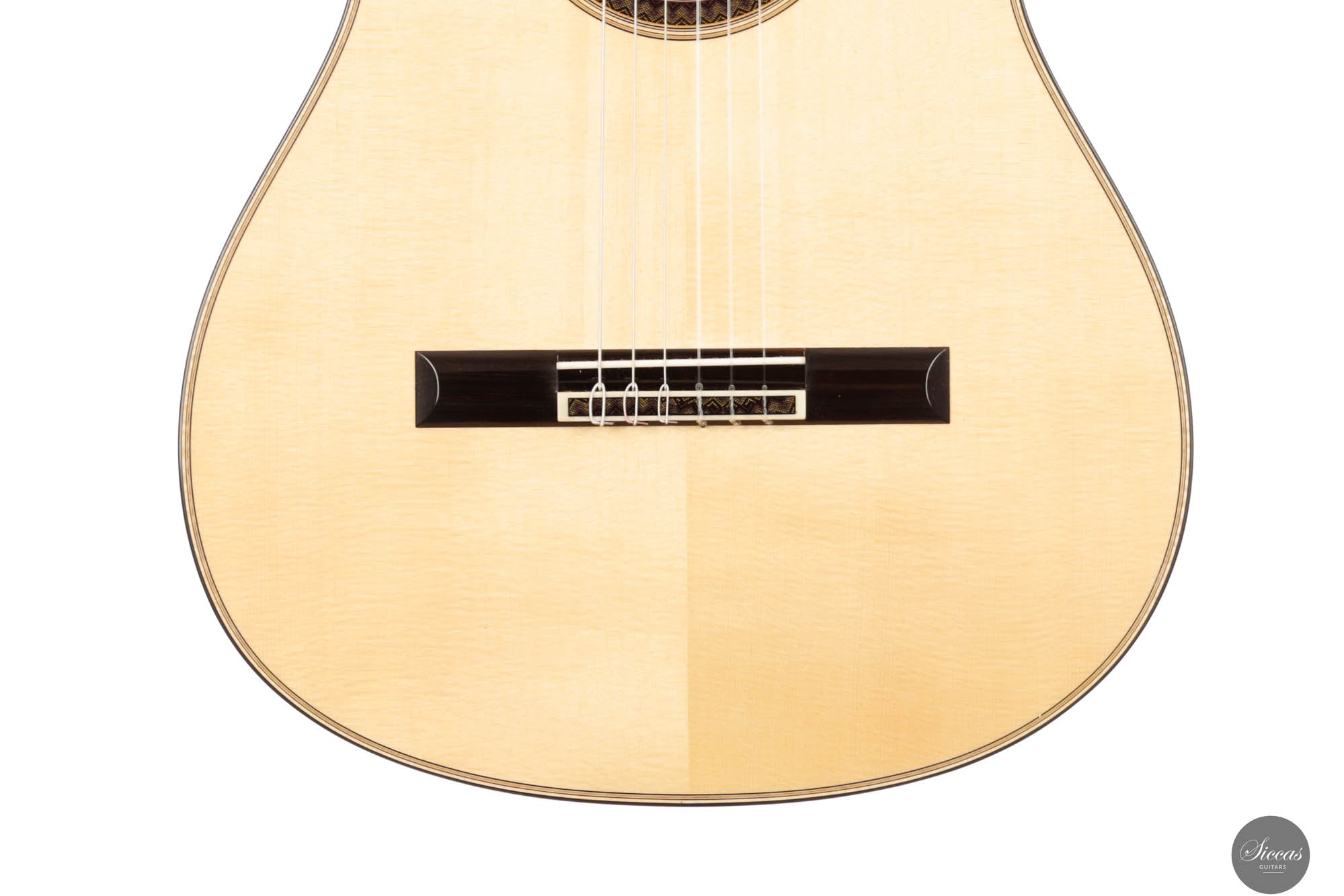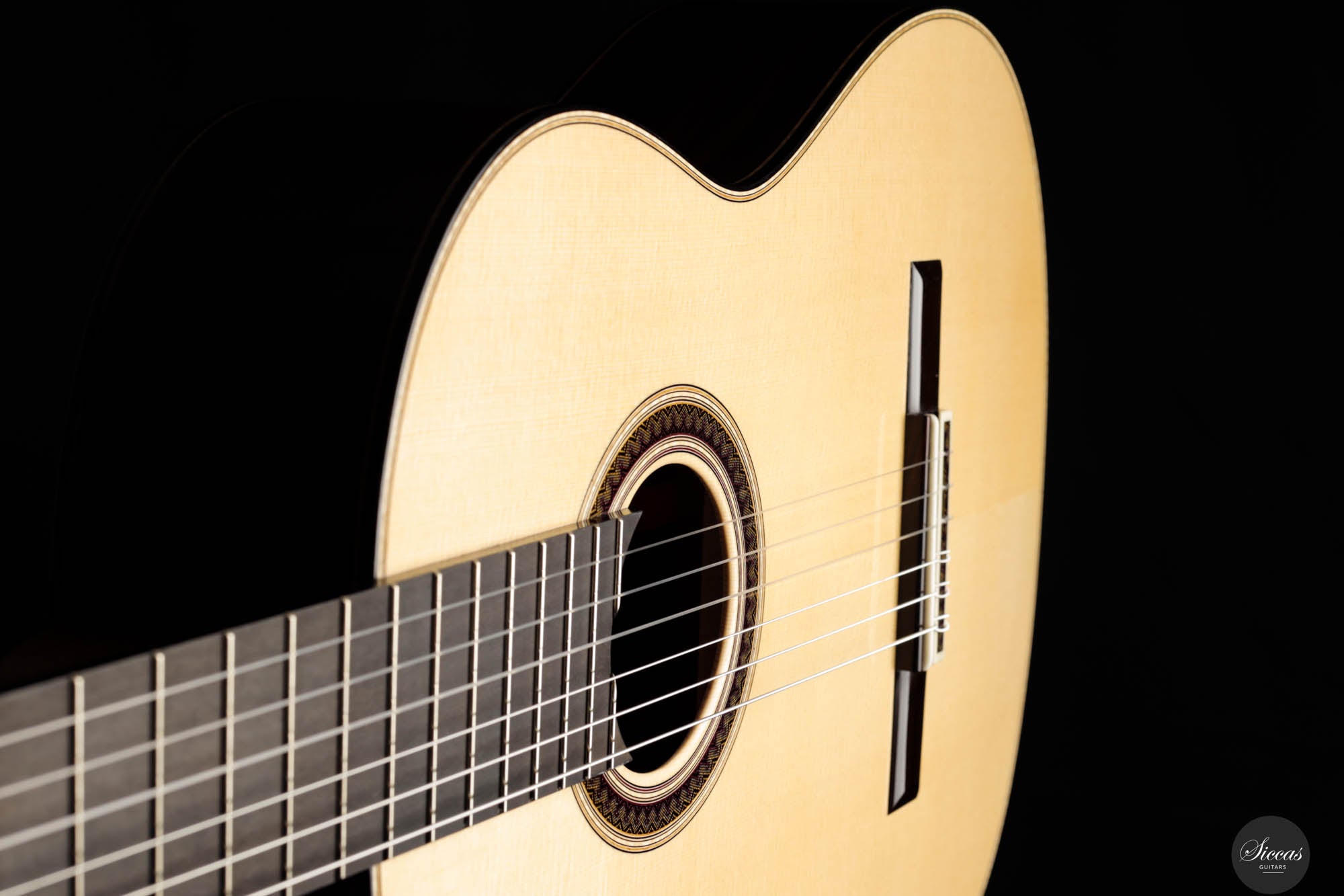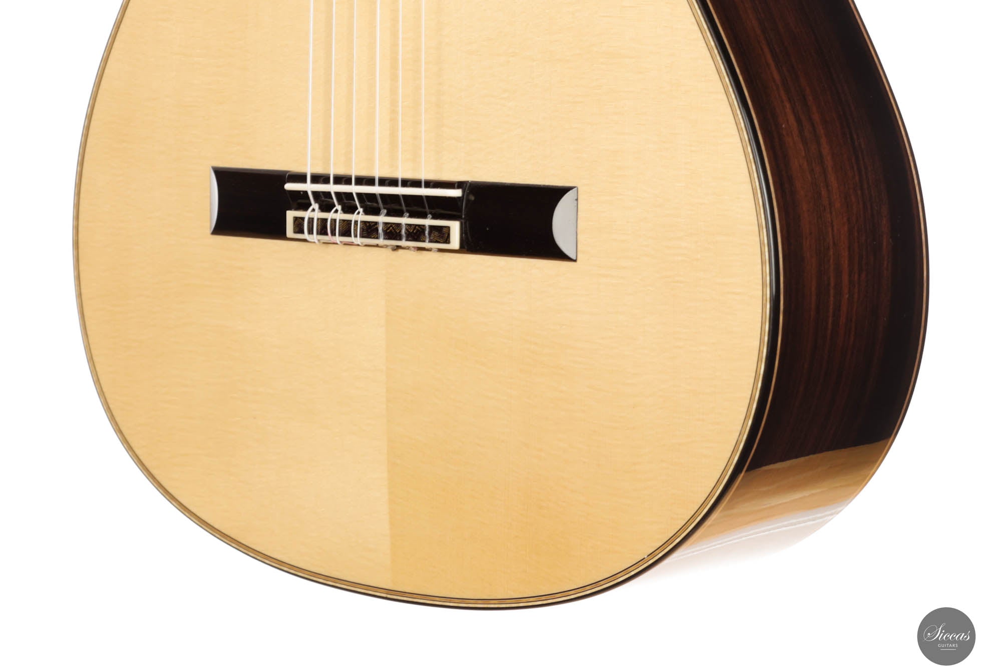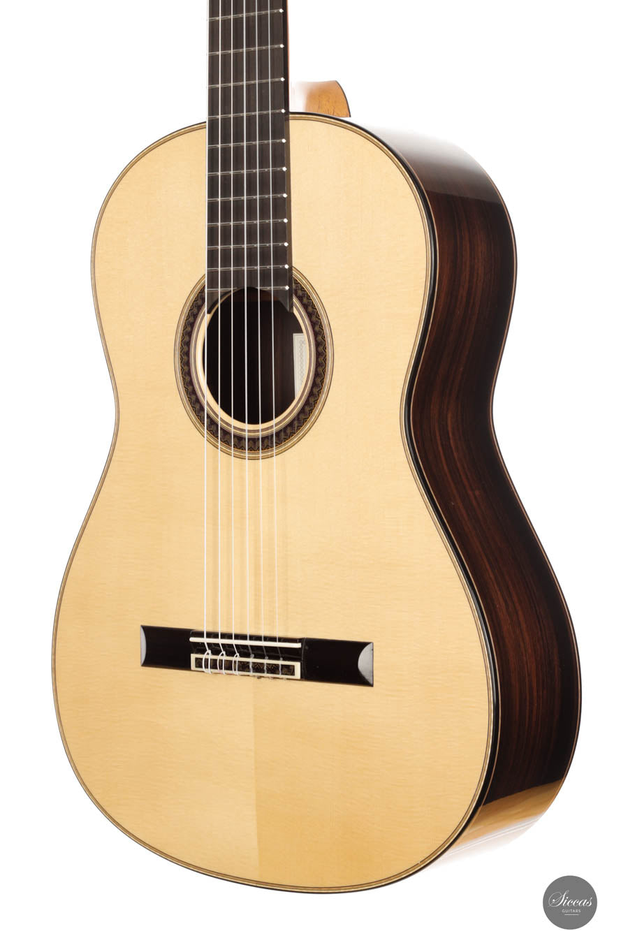 This brand-new guitar by Raffaele is a stunning example of exceptional craftsmanship, reflecting an impressive mastery achieved early in his career. Traditionally built with a spruce soundboard and Indian rosewood back and sides, the guitar is meticulously tuned to an F resonance, producing deep, charismatic basses that enhance its rich tonal quality. The trebles are brilliant and resonant, effortlessly projecting throughout any concert hall. A highlight of this instrument is its versatile color palette, allowing musicians to explore endless nuances and dynamic ranges in their performances. This guitar truly embodies beauty and sophistication in both sound and craftsmanship.