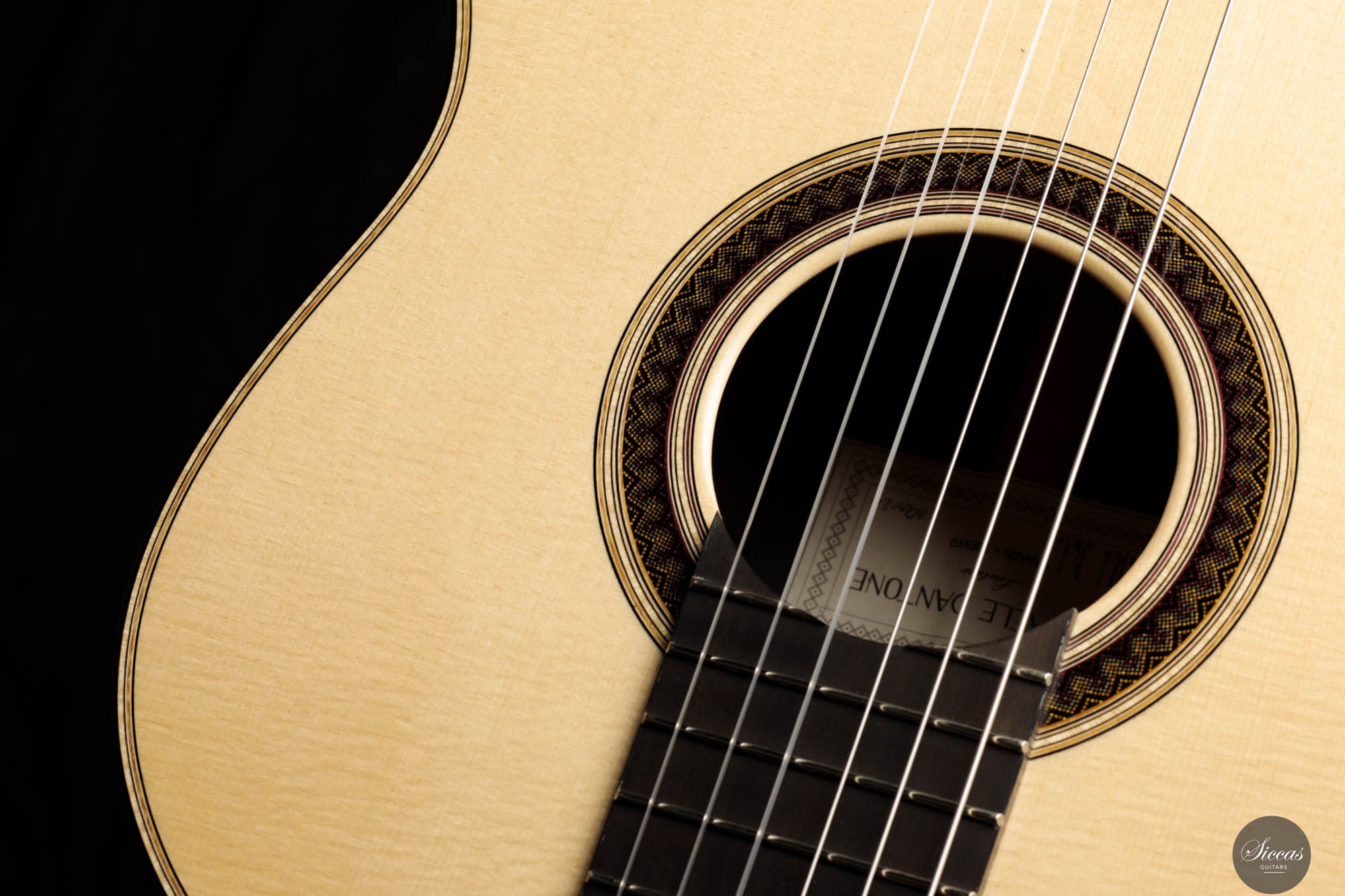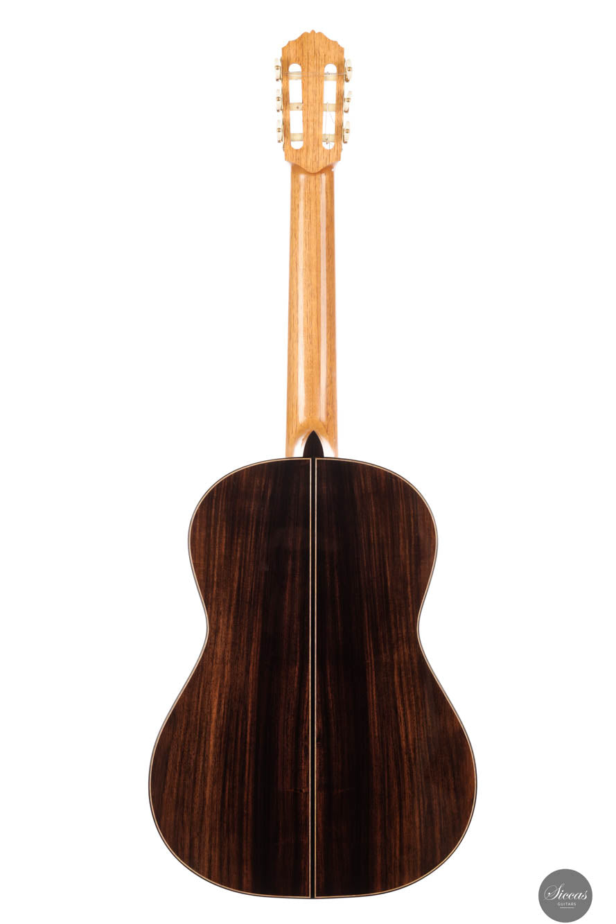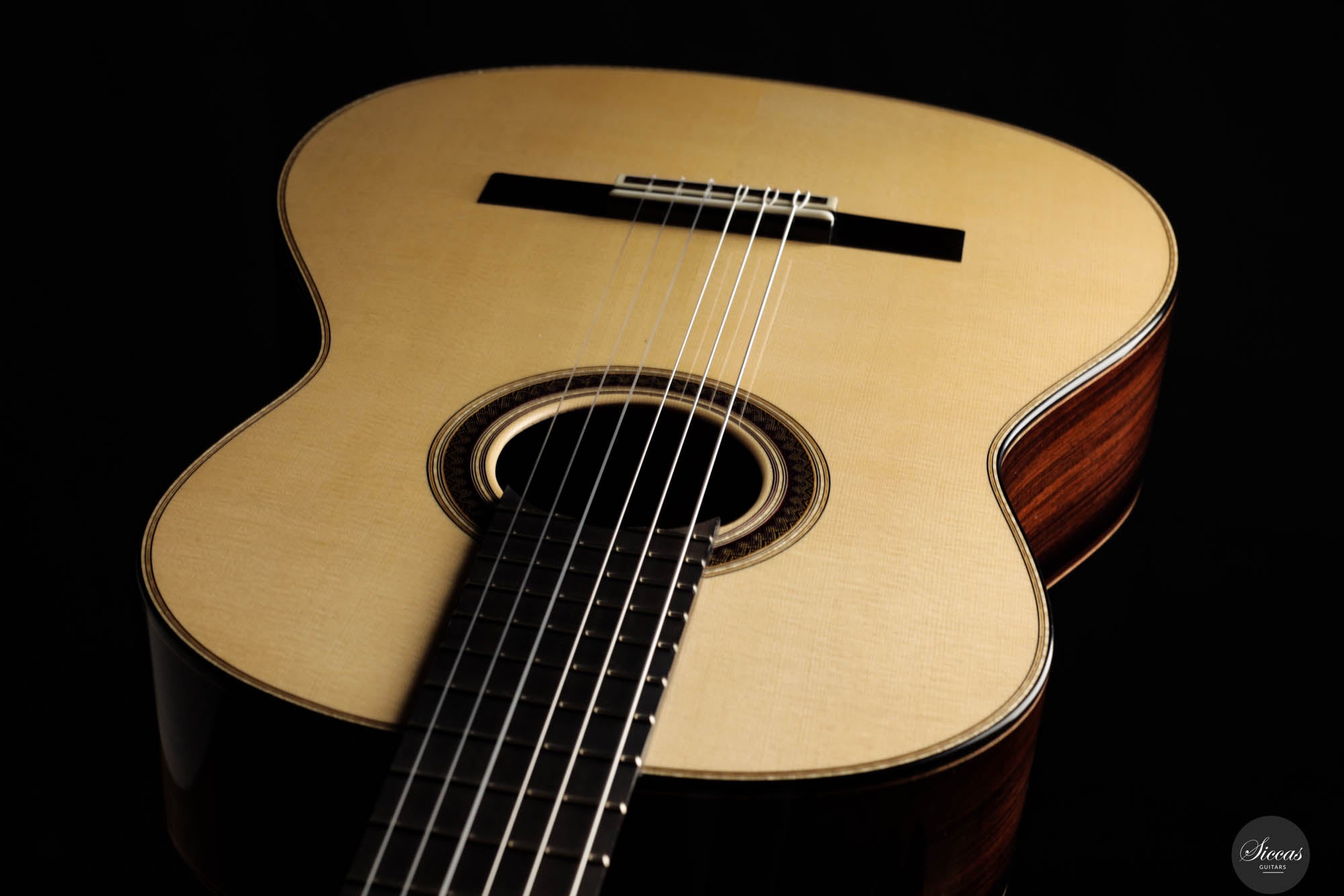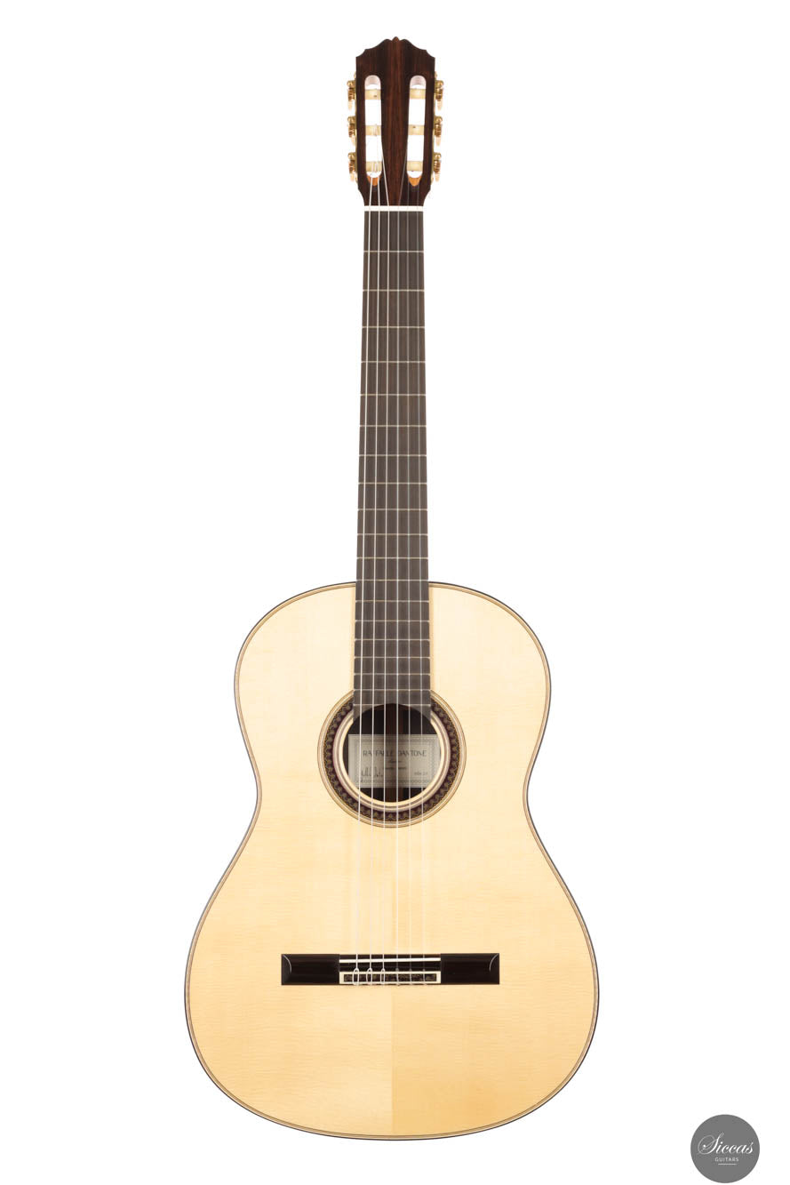 This brand-new guitar by Raffaele is a stunning example of exceptional craftsmanship, reflecting an impressive mastery achieved early in his career. Traditionally built with a spruce soundboard and Indian rosewood back and sides, the guitar is meticulously tuned to an F resonance, producing deep, charismatic basses that enhance its rich tonal quality. The trebles are brilliant and resonant, effortlessly projecting throughout any concert hall. A highlight of this instrument is its versatile color palette, allowing musicians to explore endless nuances and dynamic ranges in their performances. This guitar truly embodies beauty and sophistication in both sound and craftsmanship.