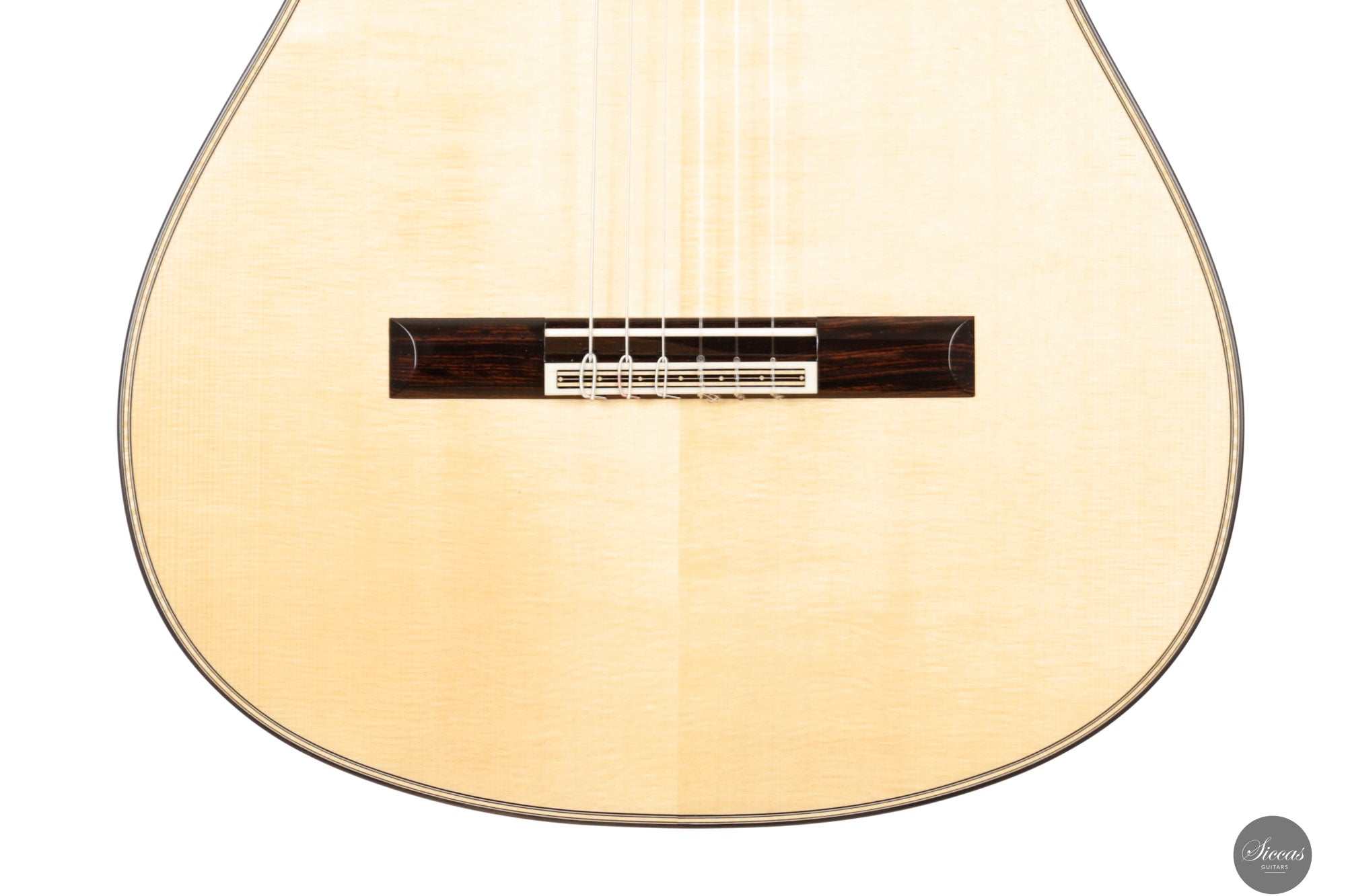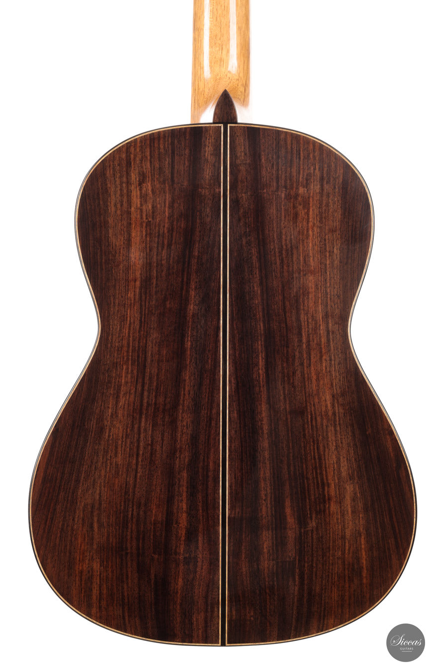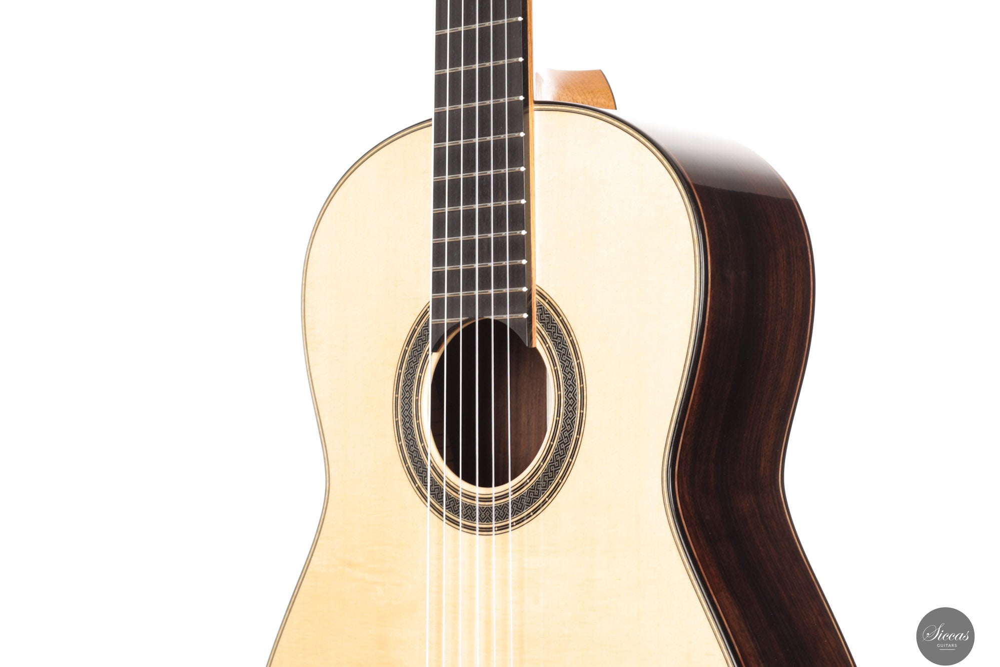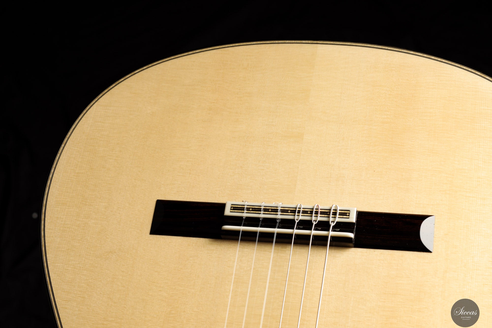 This 2025 concert guitar, numbered 14, marks a further step in Dantone’s evolution as a maker. It features a five-fan bracing system, a departure from the seven-fan layout he employed earlier, with the goal of achieving greater projection and tonal purity. Some of the braces are made of local spruce while others are of aged larch, complemented by an under-bridge sound bar. With its spruce top and Indian rosewood back and sides, the instrument has an air body resonance around G, offering a powerful yet elegant voice. The rosette design has been simplified to emphasize the natural beauty of the wood, and the slightly elevated fingerboard, with increased ebony thickness, allows both improved comfort in the higher positions and future adjustability while preserving a traditional appearance. The result is a guitar with a brilliant, full sound, remarkable clarity between voices, and a very wide dynamic range. It offers both immediate response and ample headroom, making it suitable for intimate playing as well as concert projection. This instrument demonstrates how Dantone’s work, inspired by Torres and Bouchet, has matured into a personal style of great distinction.