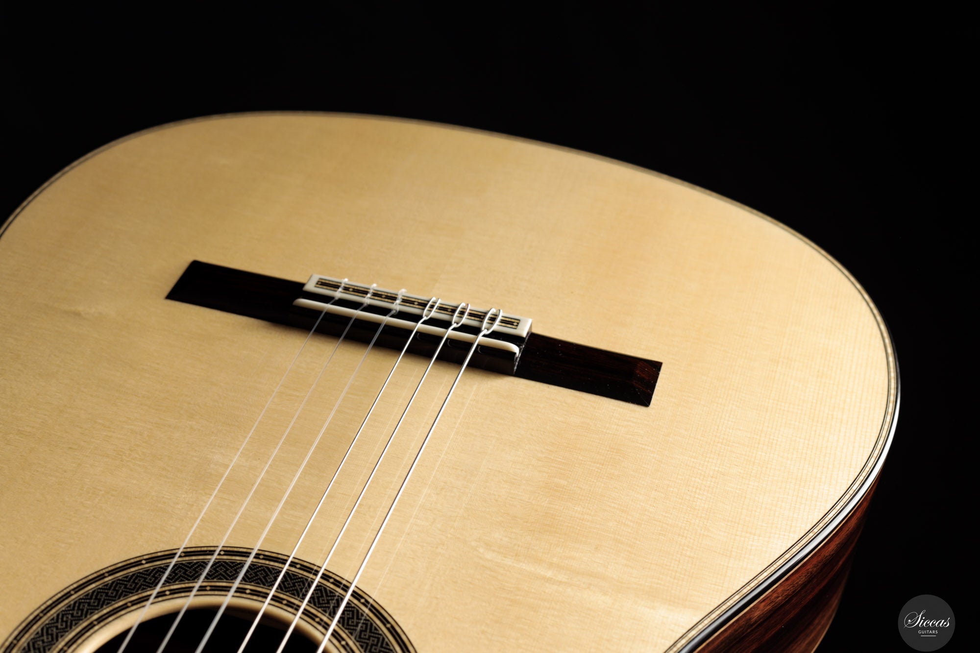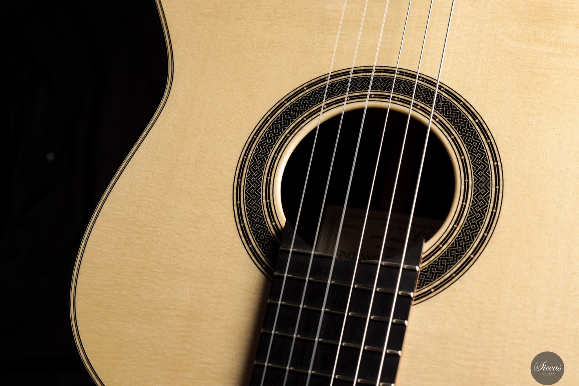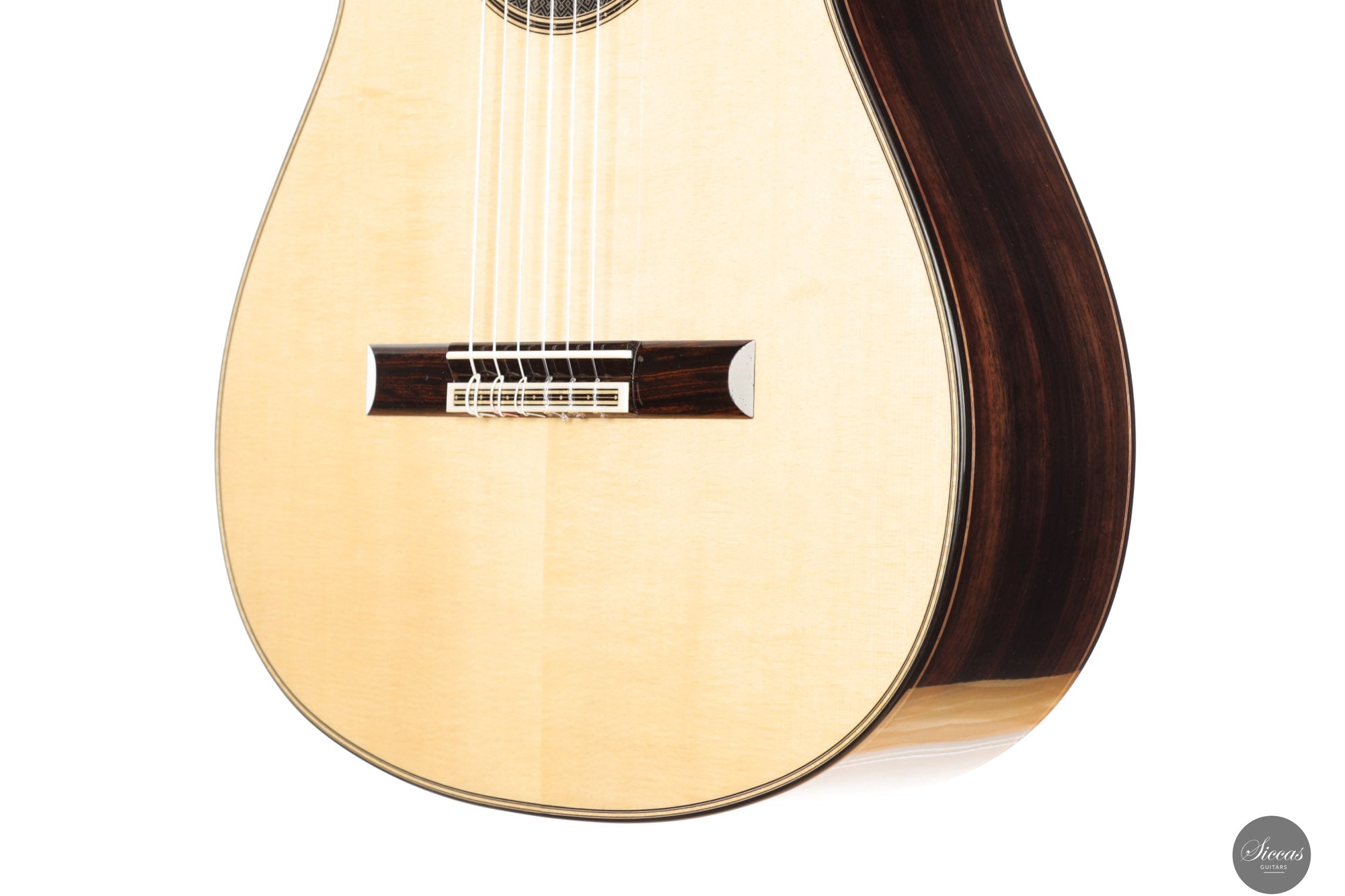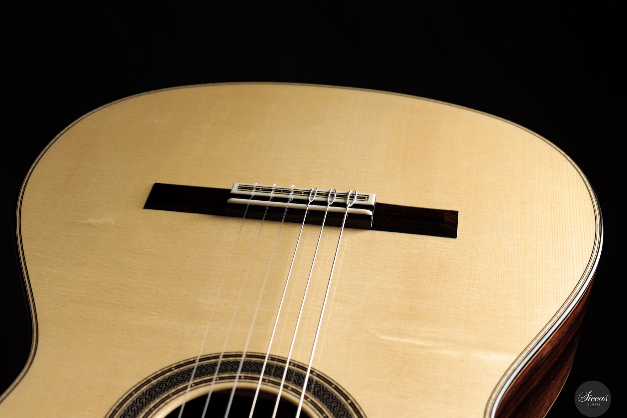 This 2025 concert guitar, numbered 14, marks a further step in Dantone’s evolution as a maker. It features a five-fan bracing system, a departure from the seven-fan layout he employed earlier, with the goal of achieving greater projection and tonal purity. Some of the braces are made of local spruce while others are of aged larch, complemented by an under-bridge sound bar. With its spruce top and Indian rosewood back and sides, the instrument has an air body resonance around G, offering a powerful yet elegant voice. The rosette design has been simplified to emphasize the natural beauty of the wood, and the slightly elevated fingerboard, with increased ebony thickness, allows both improved comfort in the higher positions and future adjustability while preserving a traditional appearance. The result is a guitar with a brilliant, full sound, remarkable clarity between voices, and a very wide dynamic range. It offers both immediate response and ample headroom, making it suitable for intimate playing as well as concert projection. This instrument demonstrates how Dantone’s work, inspired by Torres and Bouchet, has matured into a personal style of great distinction.