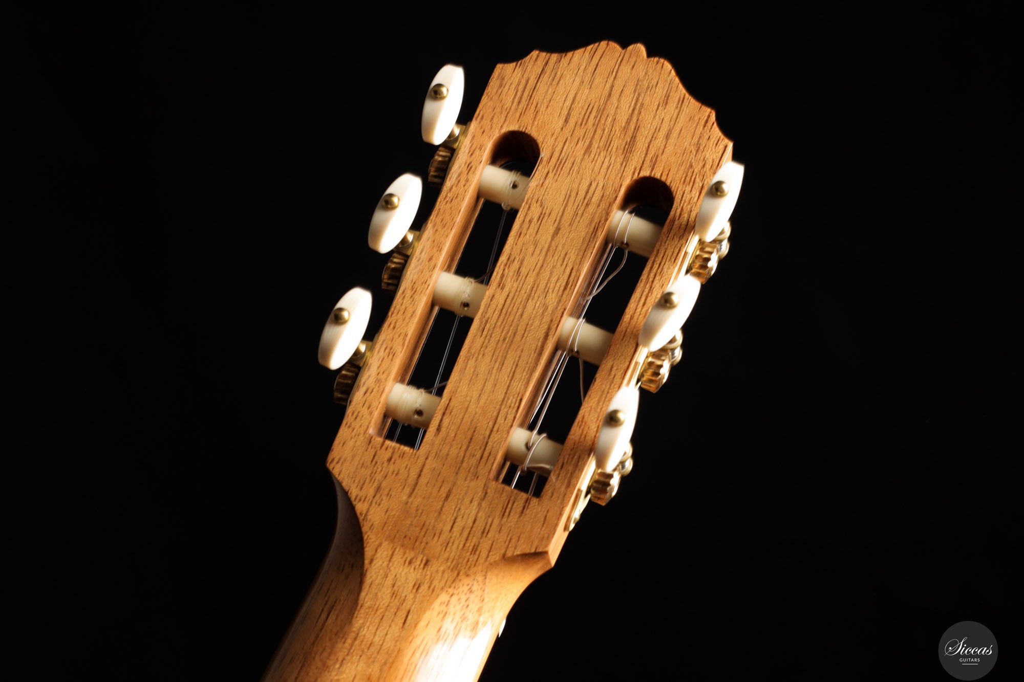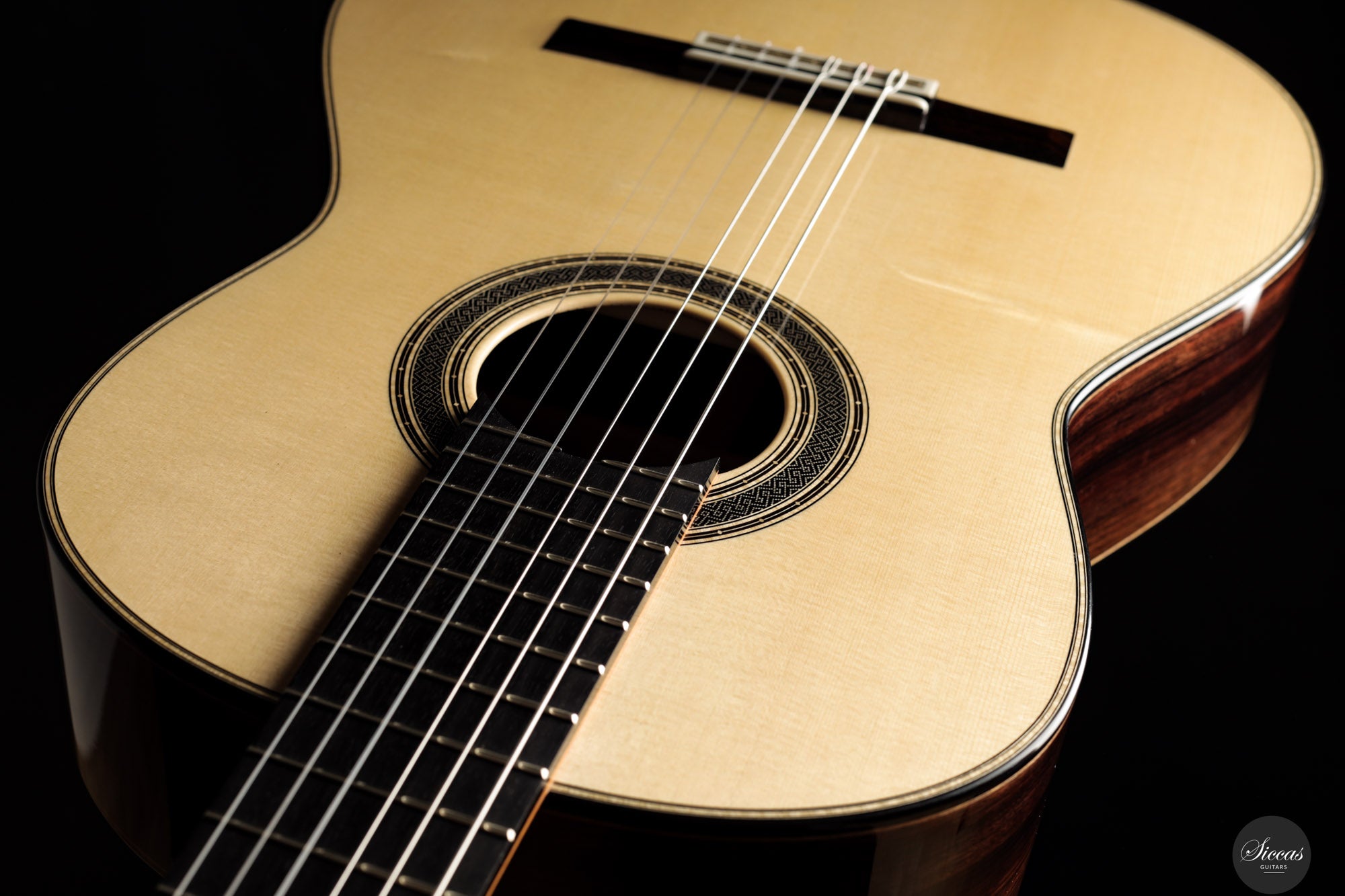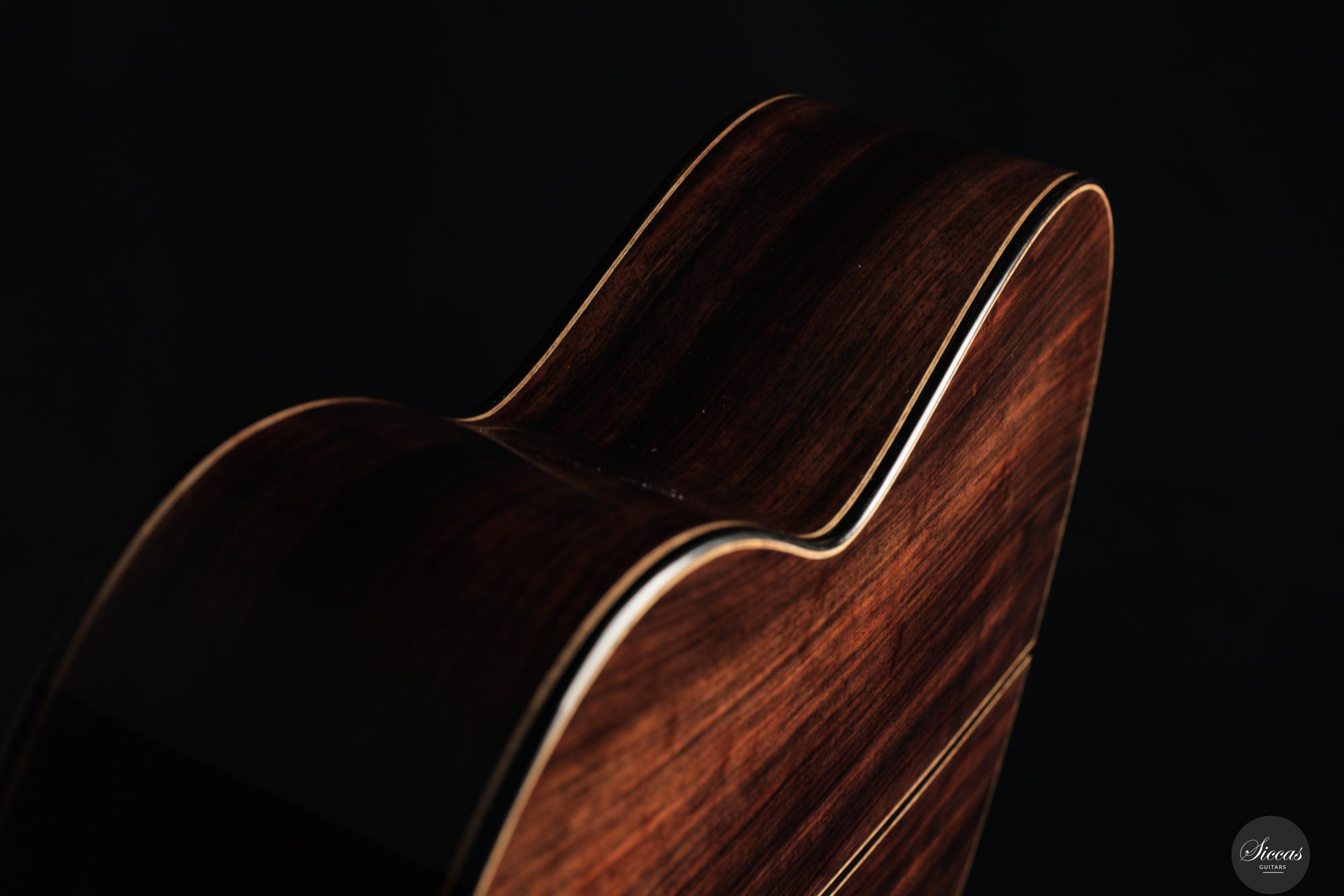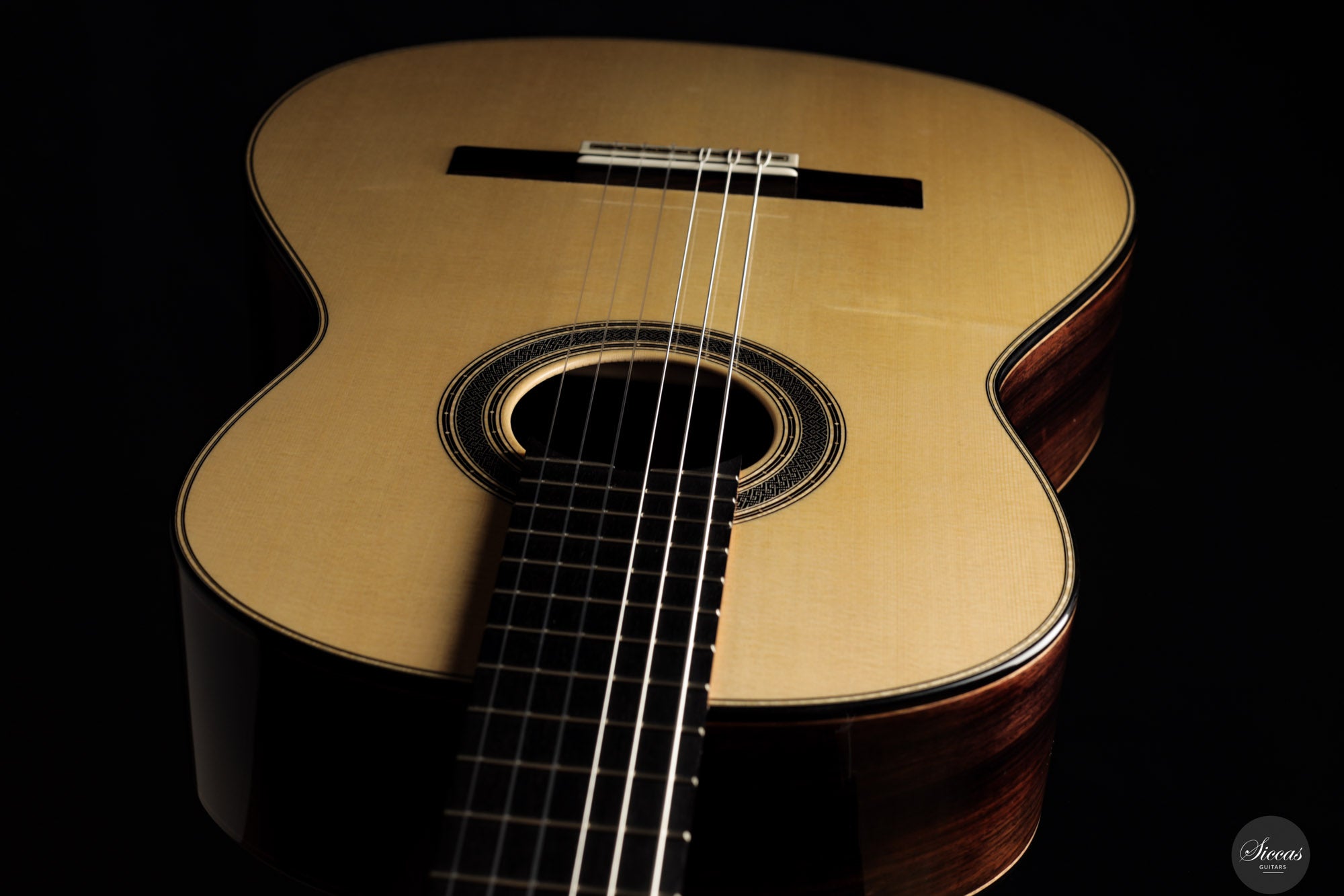 This 2025 concert guitar, numbered 14, marks a further step in Dantone’s evolution as a maker. It features a five-fan bracing system, a departure from the seven-fan layout he employed earlier, with the goal of achieving greater projection and tonal purity. Some of the braces are made of local spruce while others are of aged larch, complemented by an under-bridge sound bar. With its spruce top and Indian rosewood back and sides, the instrument has an air body resonance around G, offering a powerful yet elegant voice. The rosette design has been simplified to emphasize the natural beauty of the wood, and the slightly elevated fingerboard, with increased ebony thickness, allows both improved comfort in the higher positions and future adjustability while preserving a traditional appearance. The result is a guitar with a brilliant, full sound, remarkable clarity between voices, and a very wide dynamic range. It offers both immediate response and ample headroom, making it suitable for intimate playing as well as concert projection. This instrument demonstrates how Dantone’s work, inspired by Torres and Bouchet, has matured into a personal style of great distinction.